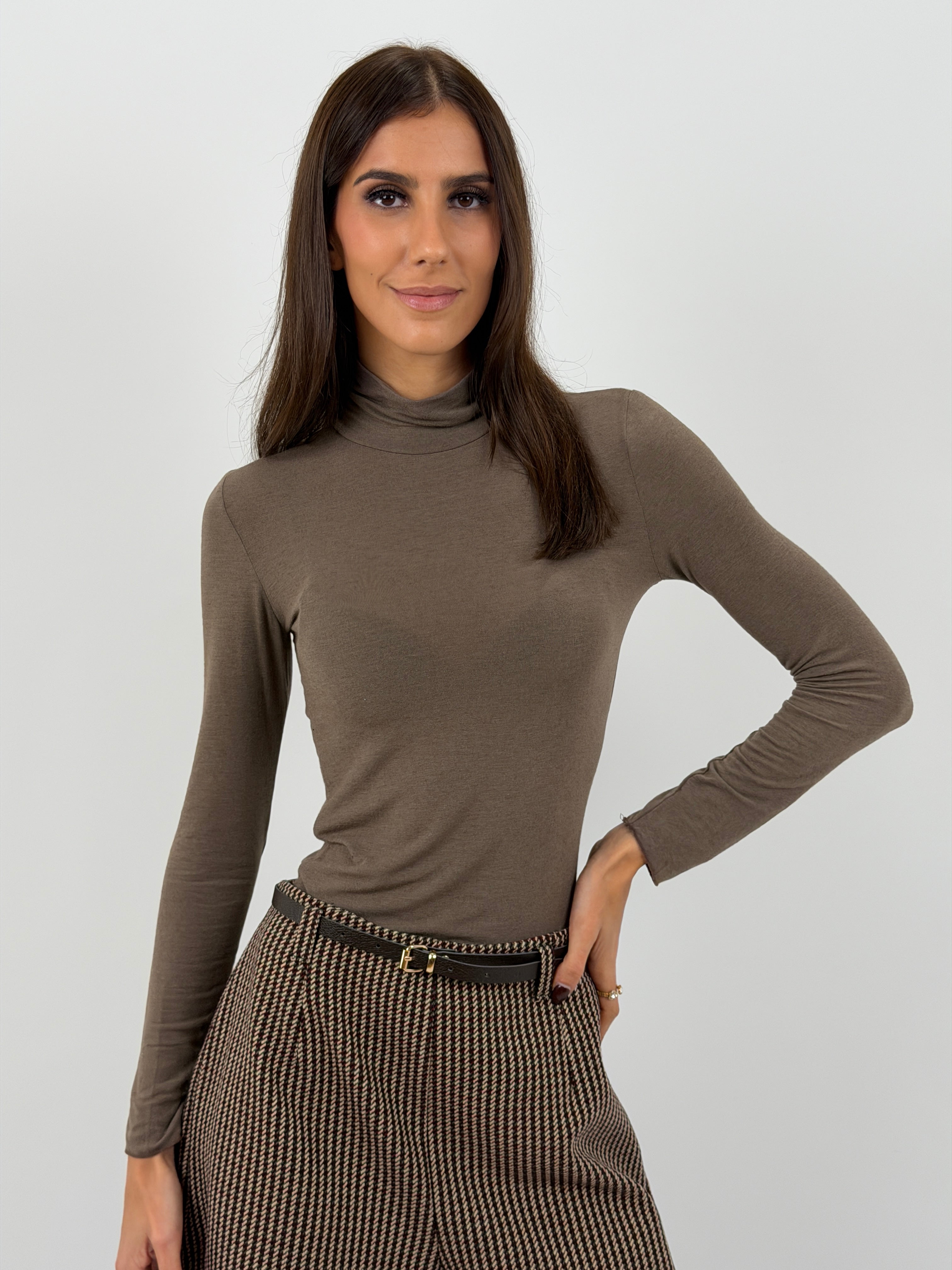 Maglia dolcevita mocha mousse con collo alto in tessuto morbido e sottile misto cashmere.