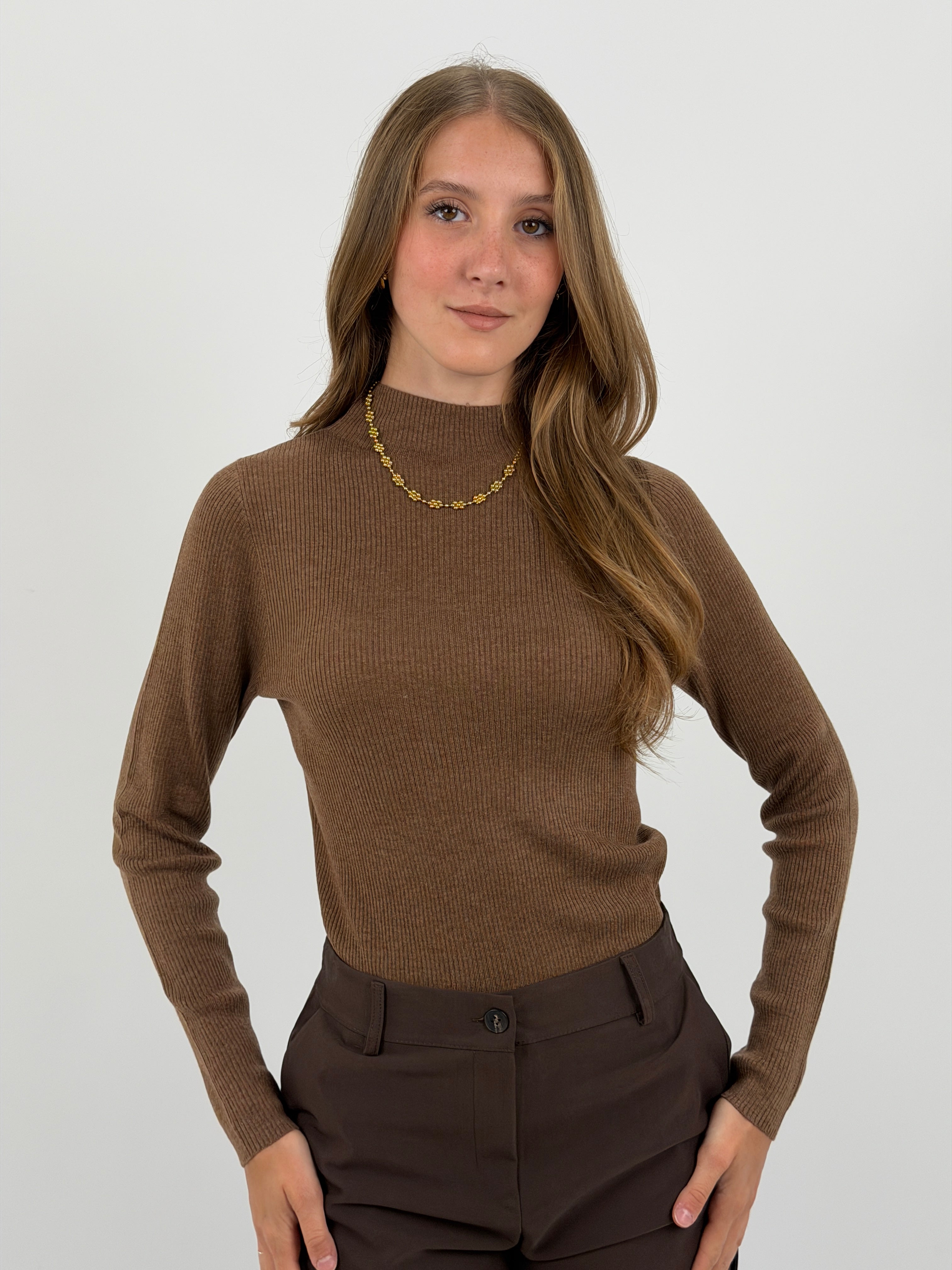 Maglia mocha mousse a maniche lunghe in tessuto a costine, con collo a lupetto e fit aderente. Un capo basico e versatile, ideale da abbinare a look casual o più eleganti.