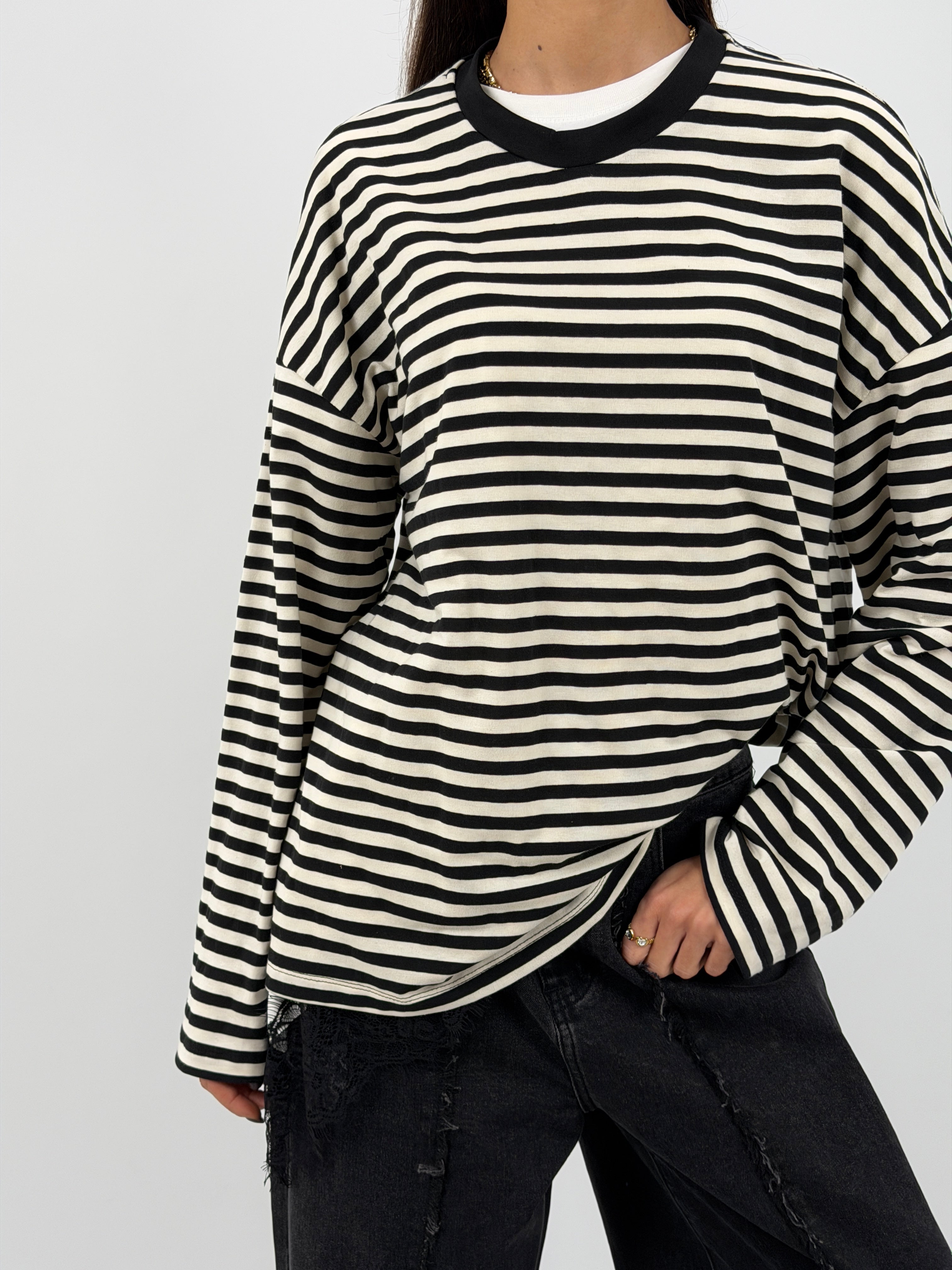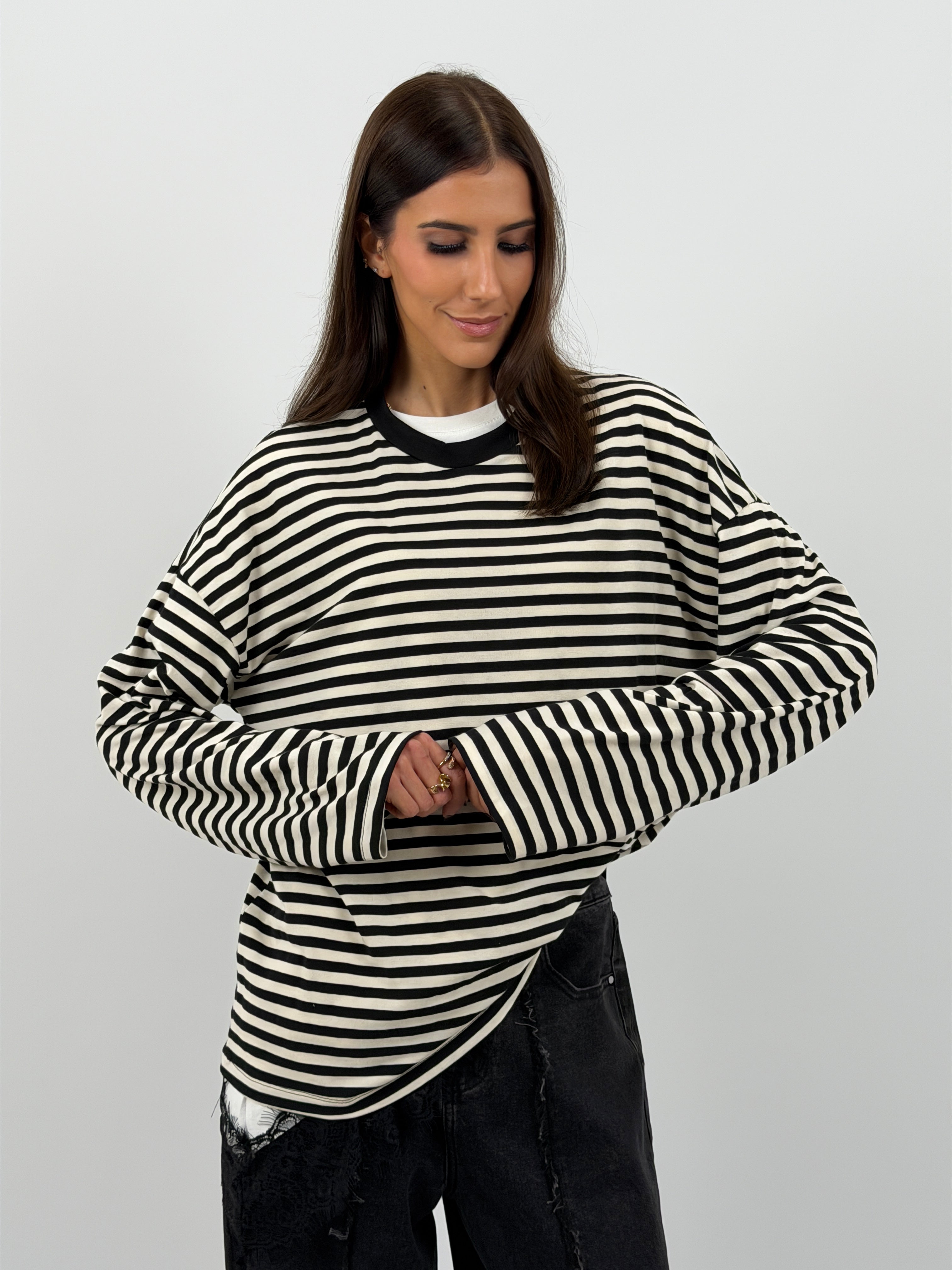 Maglia a girocollo in cotone con maniche lunghe ampie. Fantasia a righe bianche e nere a contrasto per un look casual e moderno.