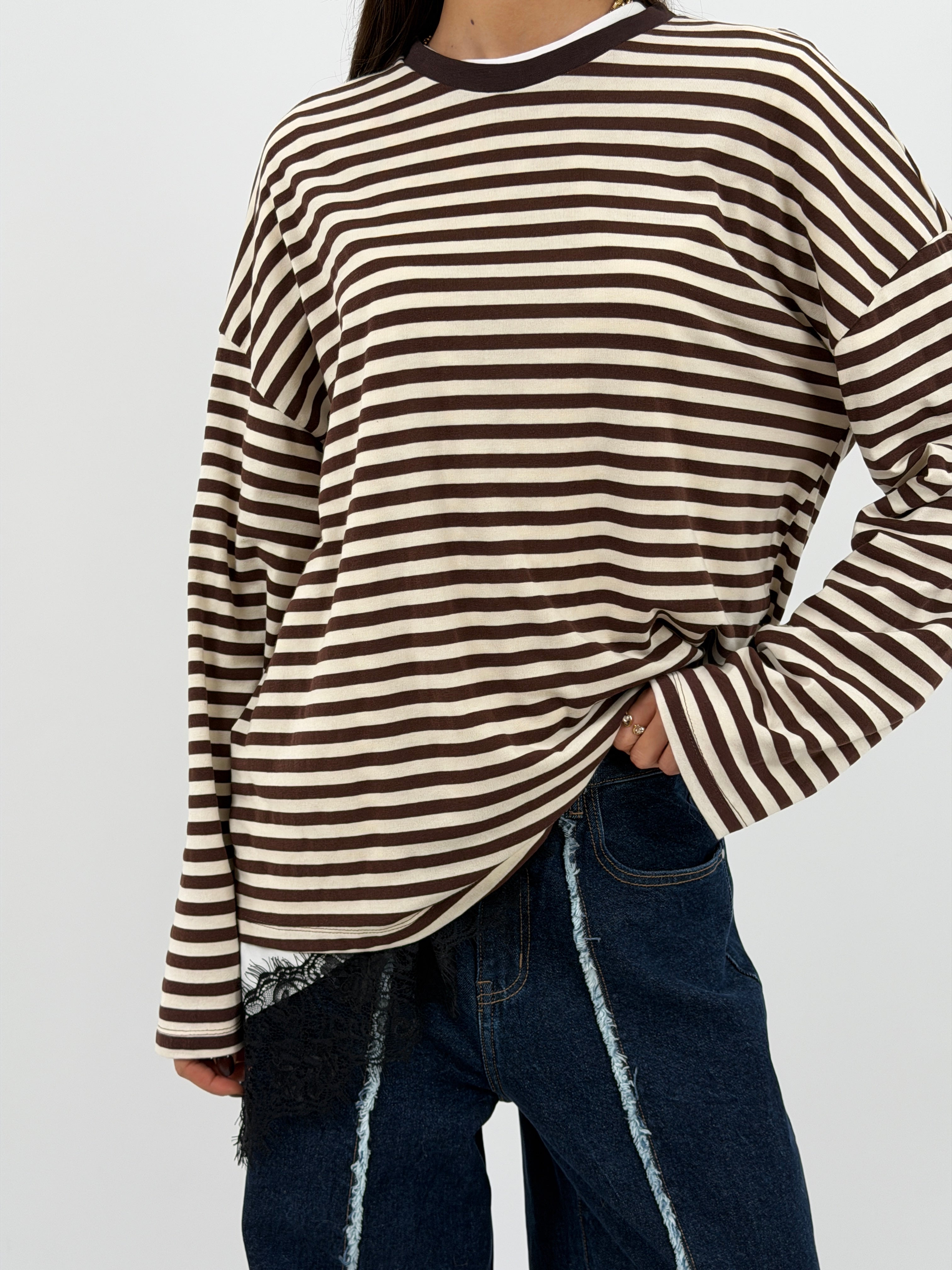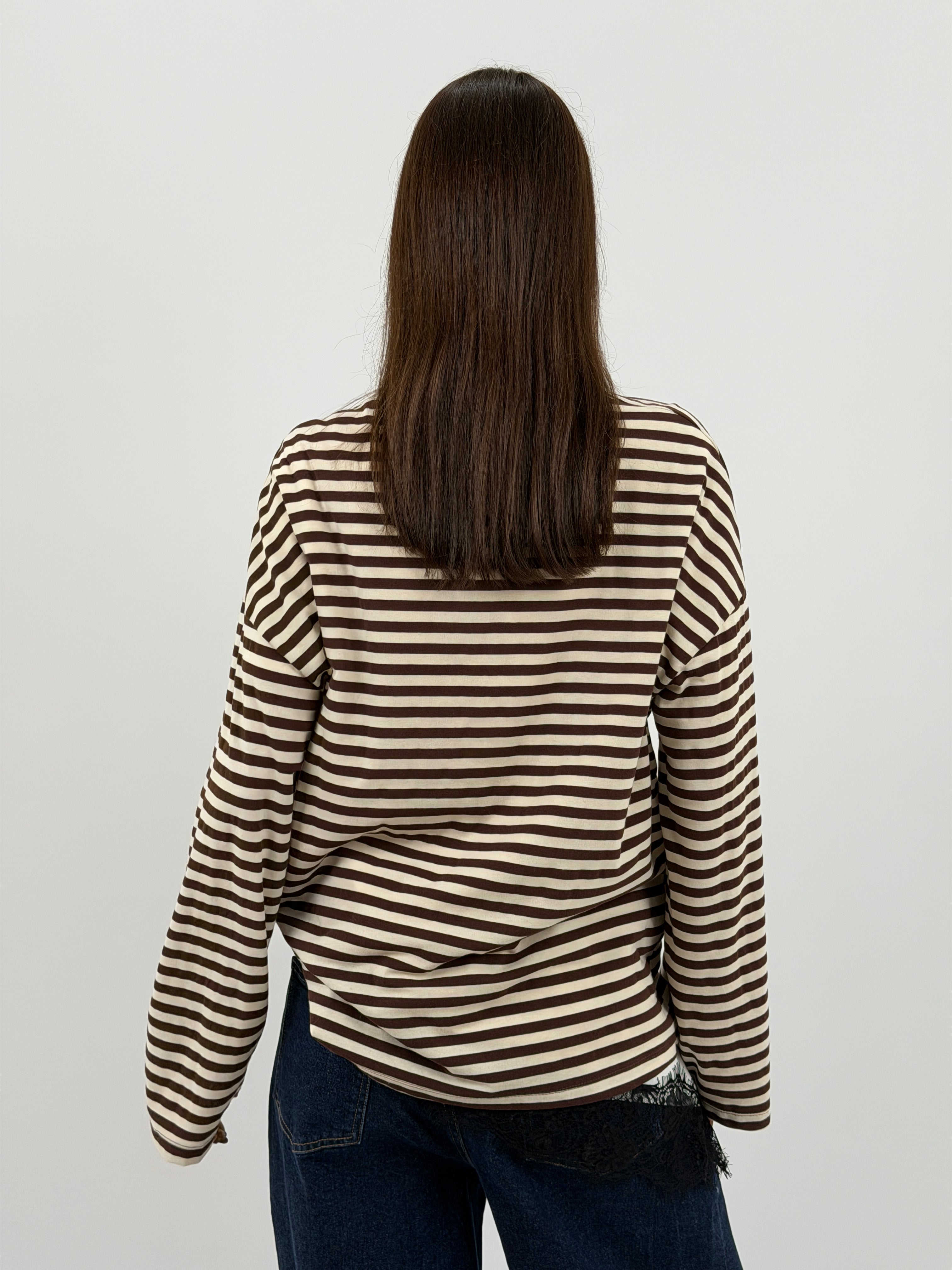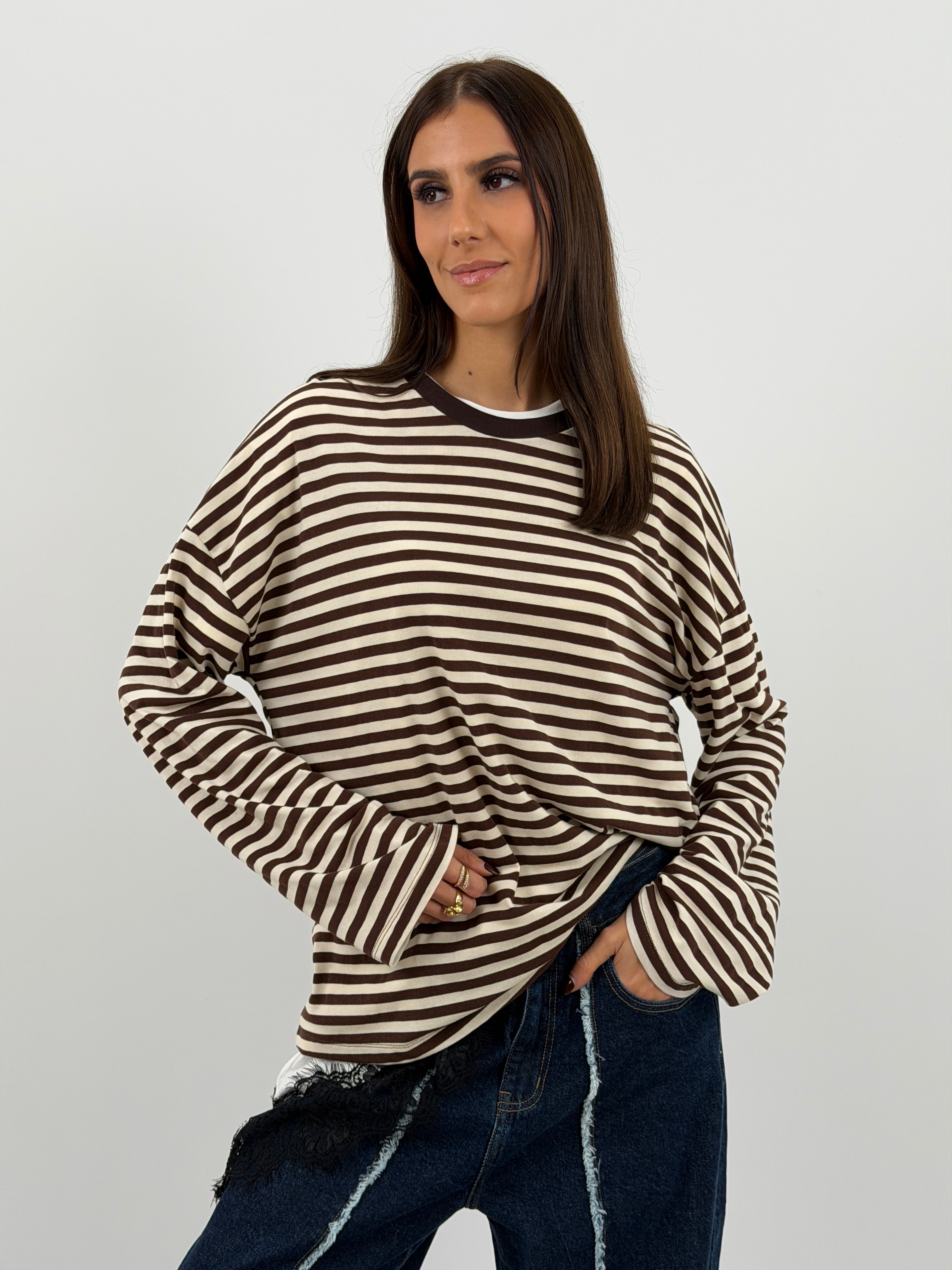 Maglia a girocollo in cotone con maniche lunghe ampie. Fantasia a righe marroni e bianche a contrasto per un look casual e moderno.