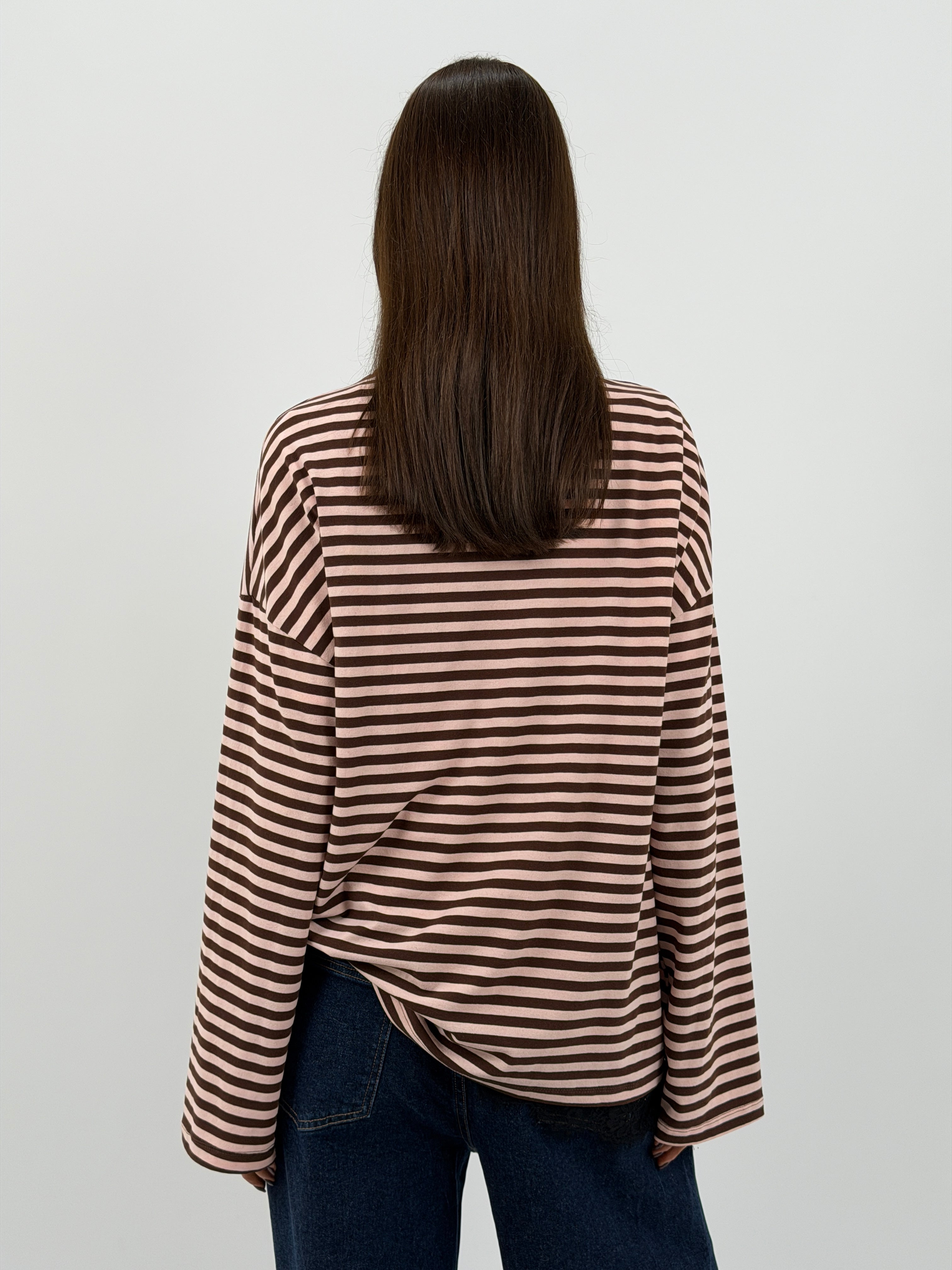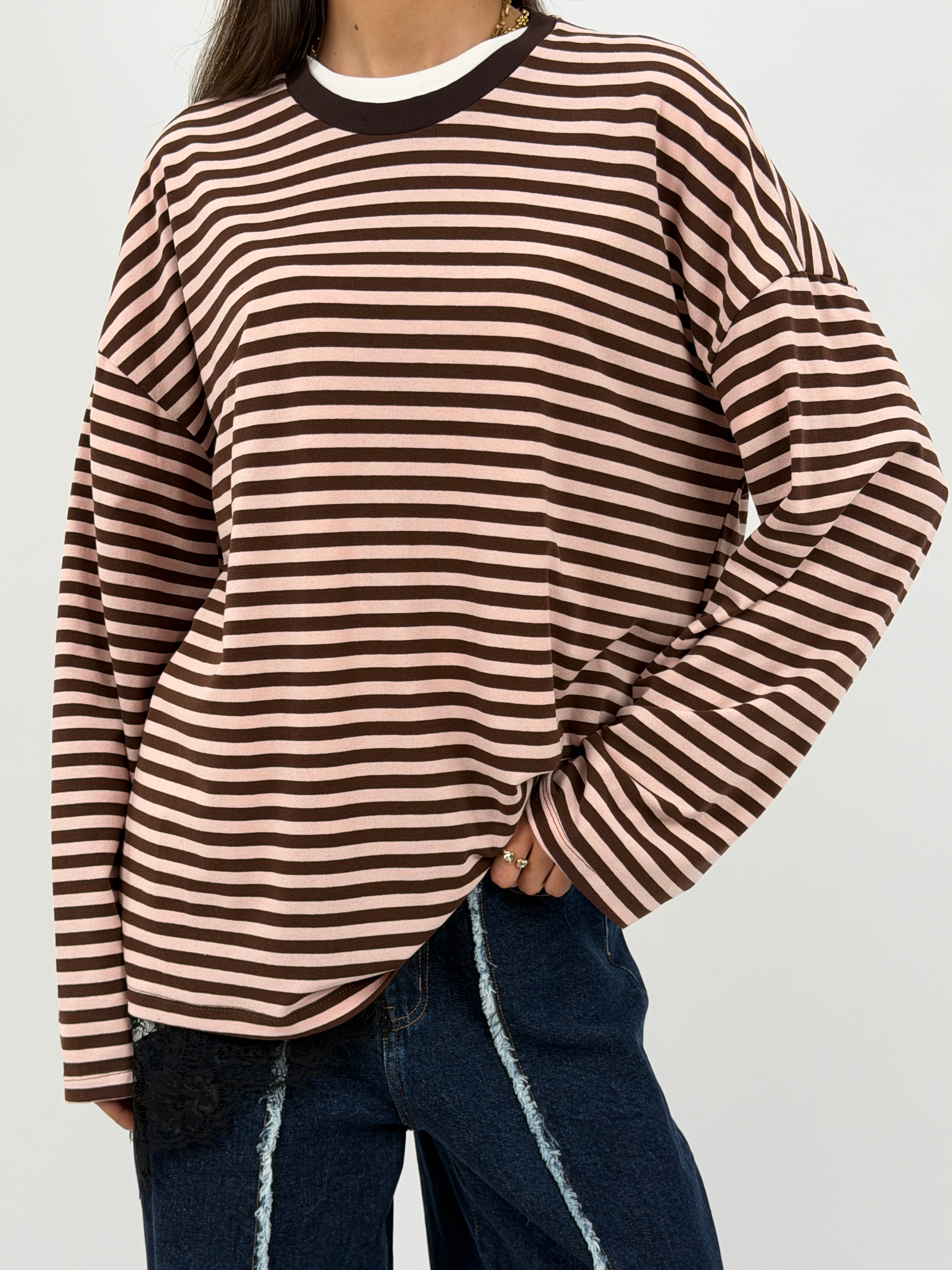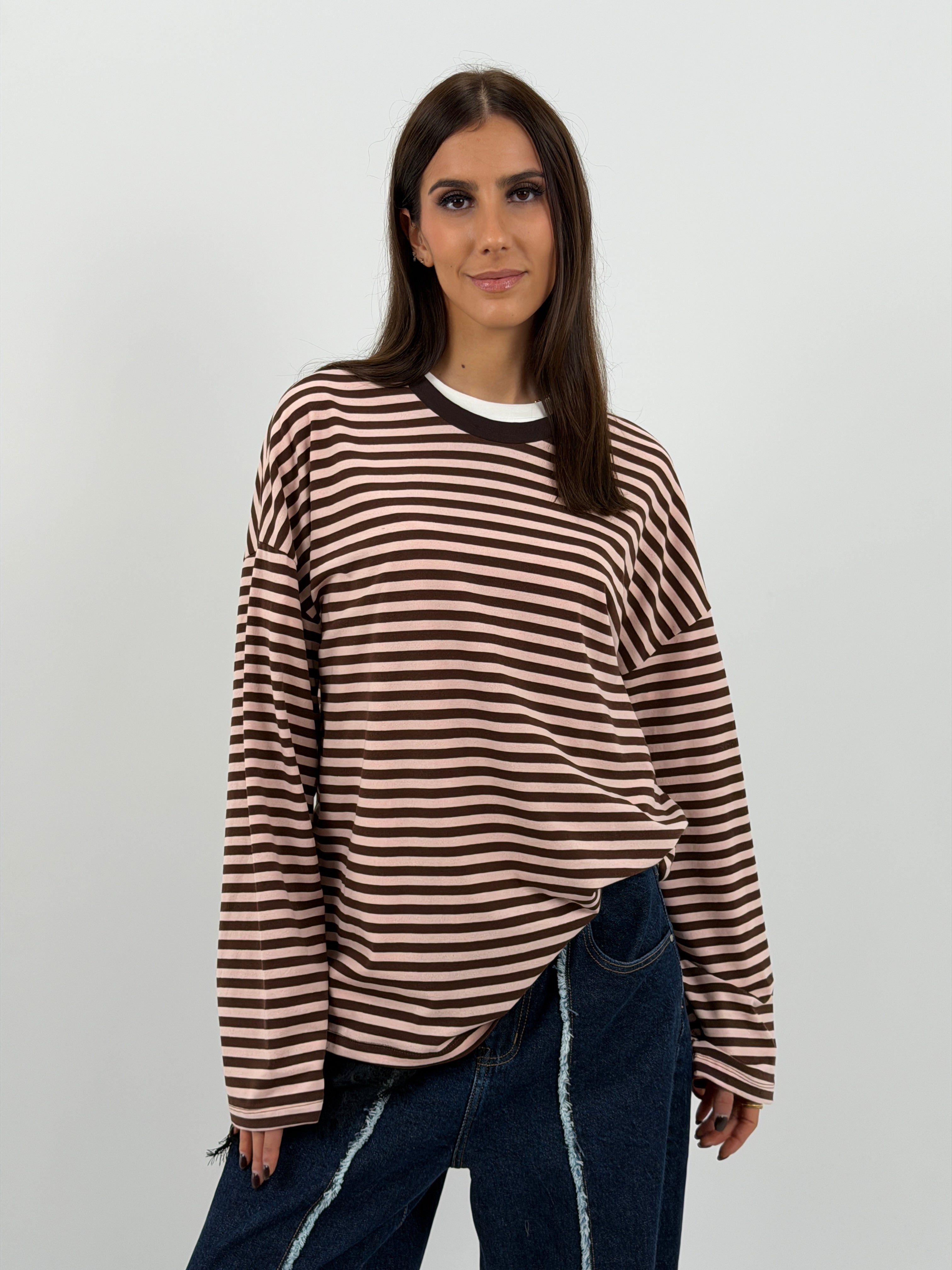 Maglia a girocollo in cotone con maniche lunghe ampie. Fantasia a righe marroni e rosa a contrasto per un look casual e moderno.