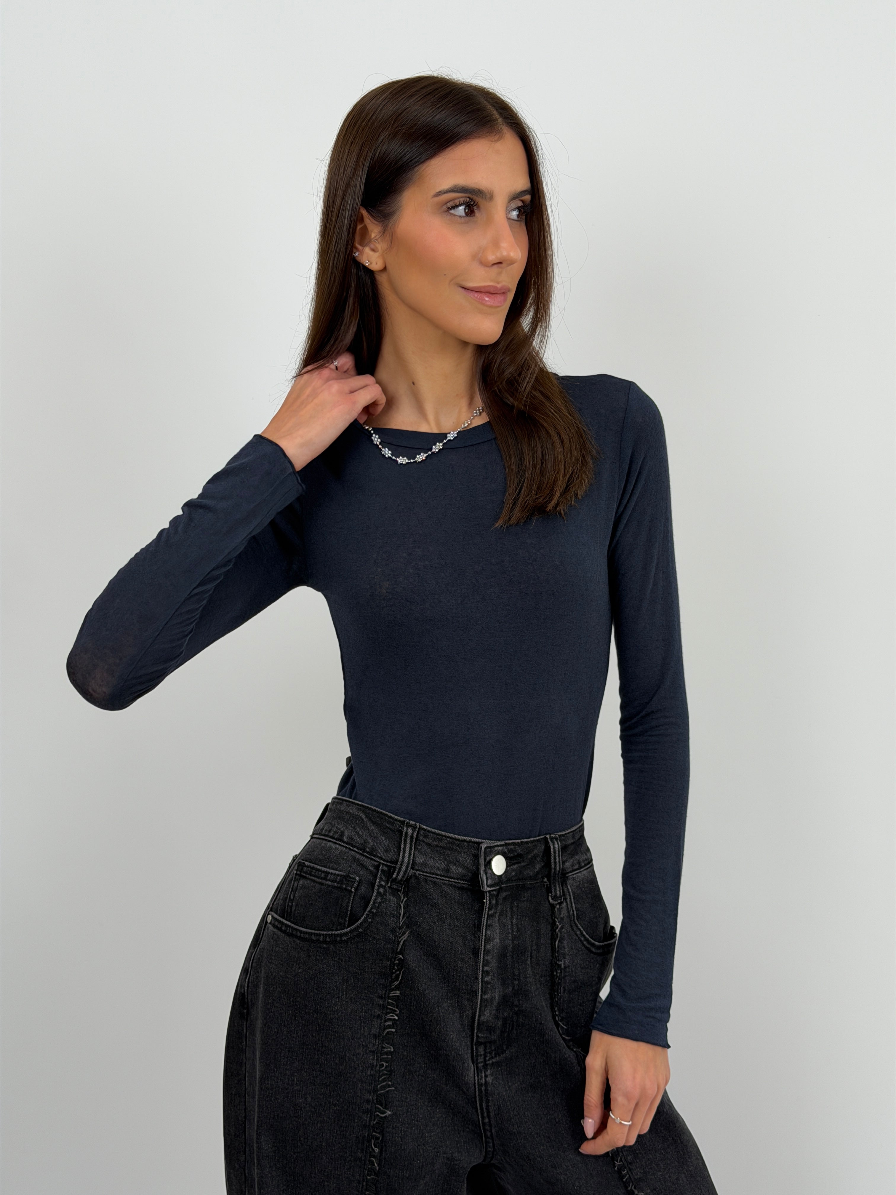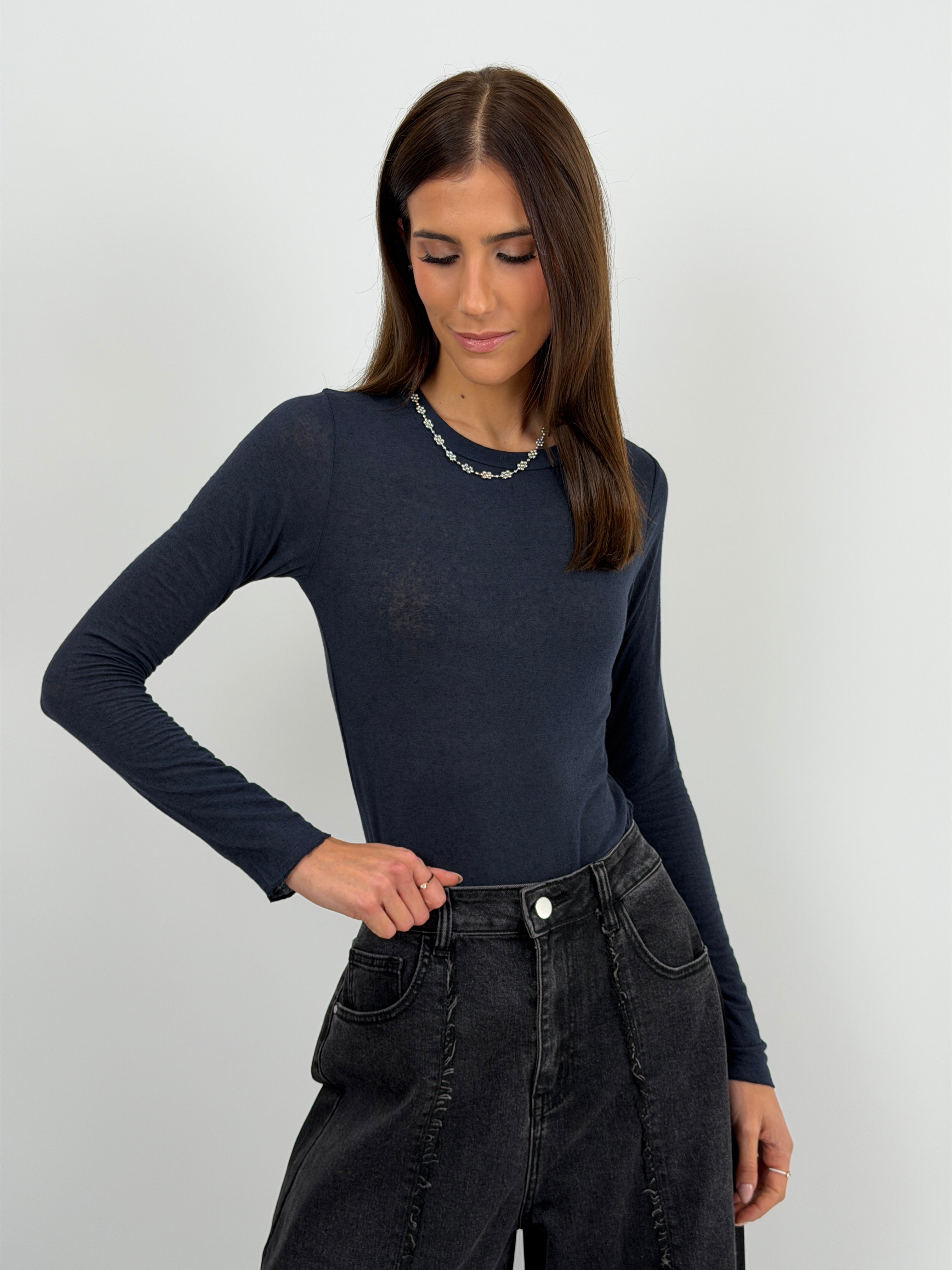 Maglia blu in tessuto morbido e sottile con cashmere, girocollo e maniche lunghe.