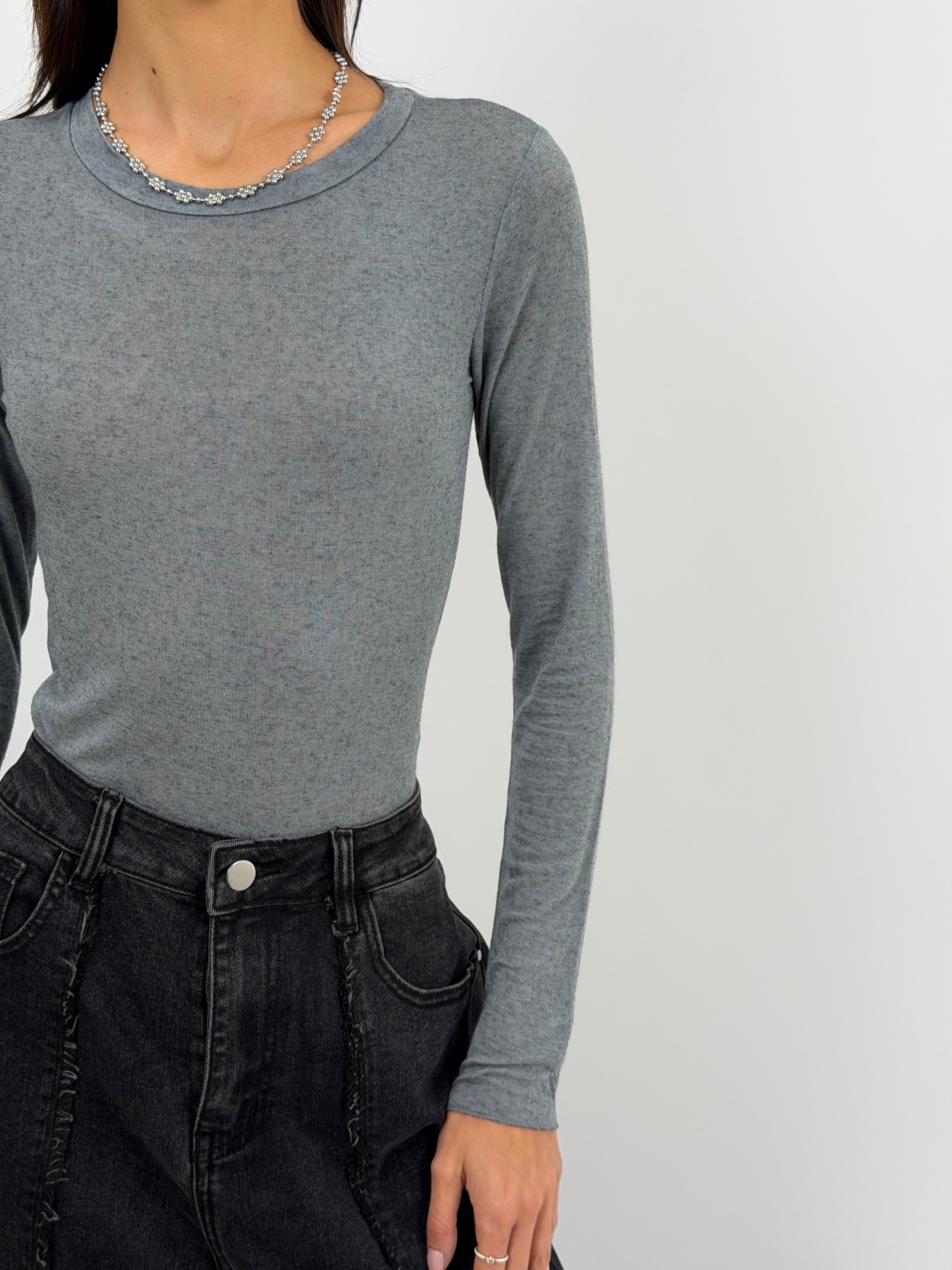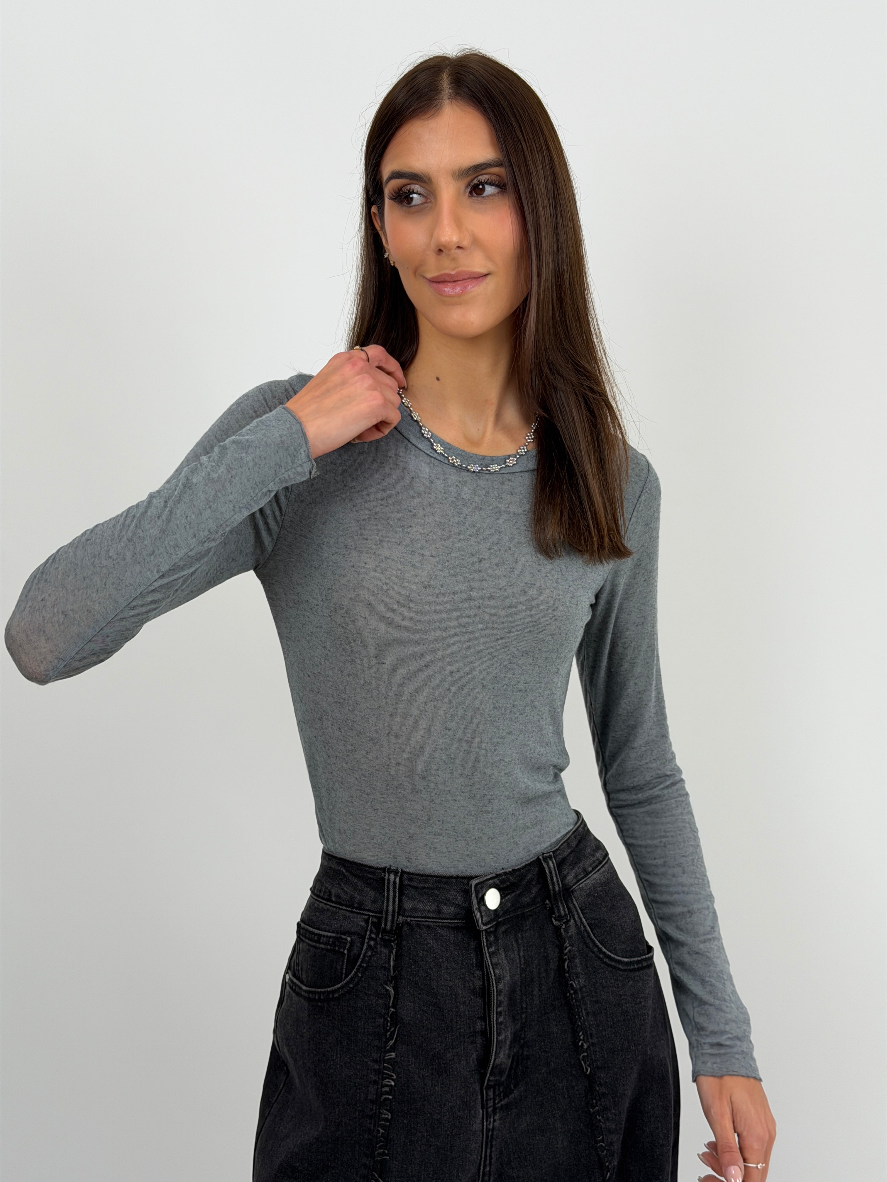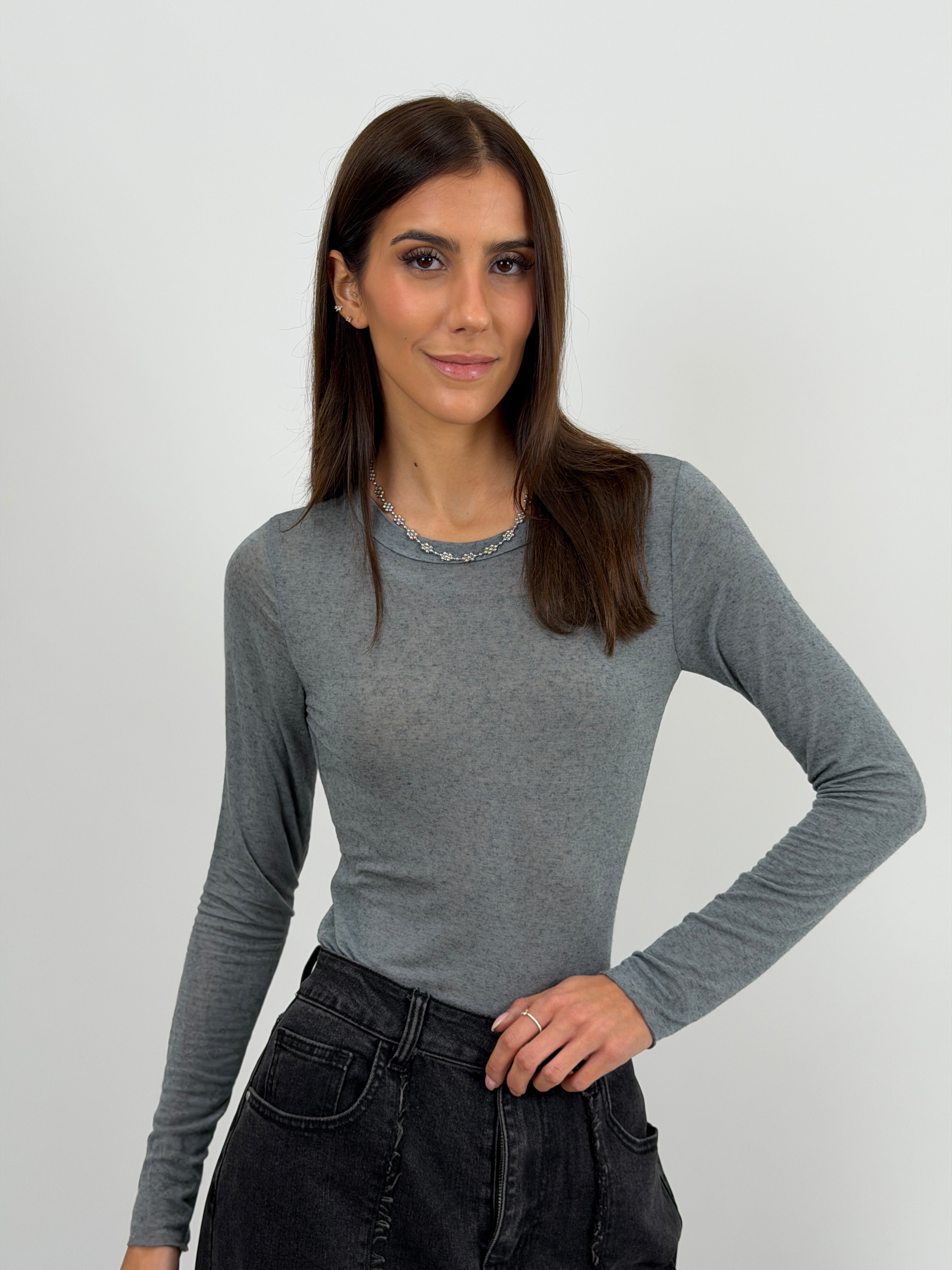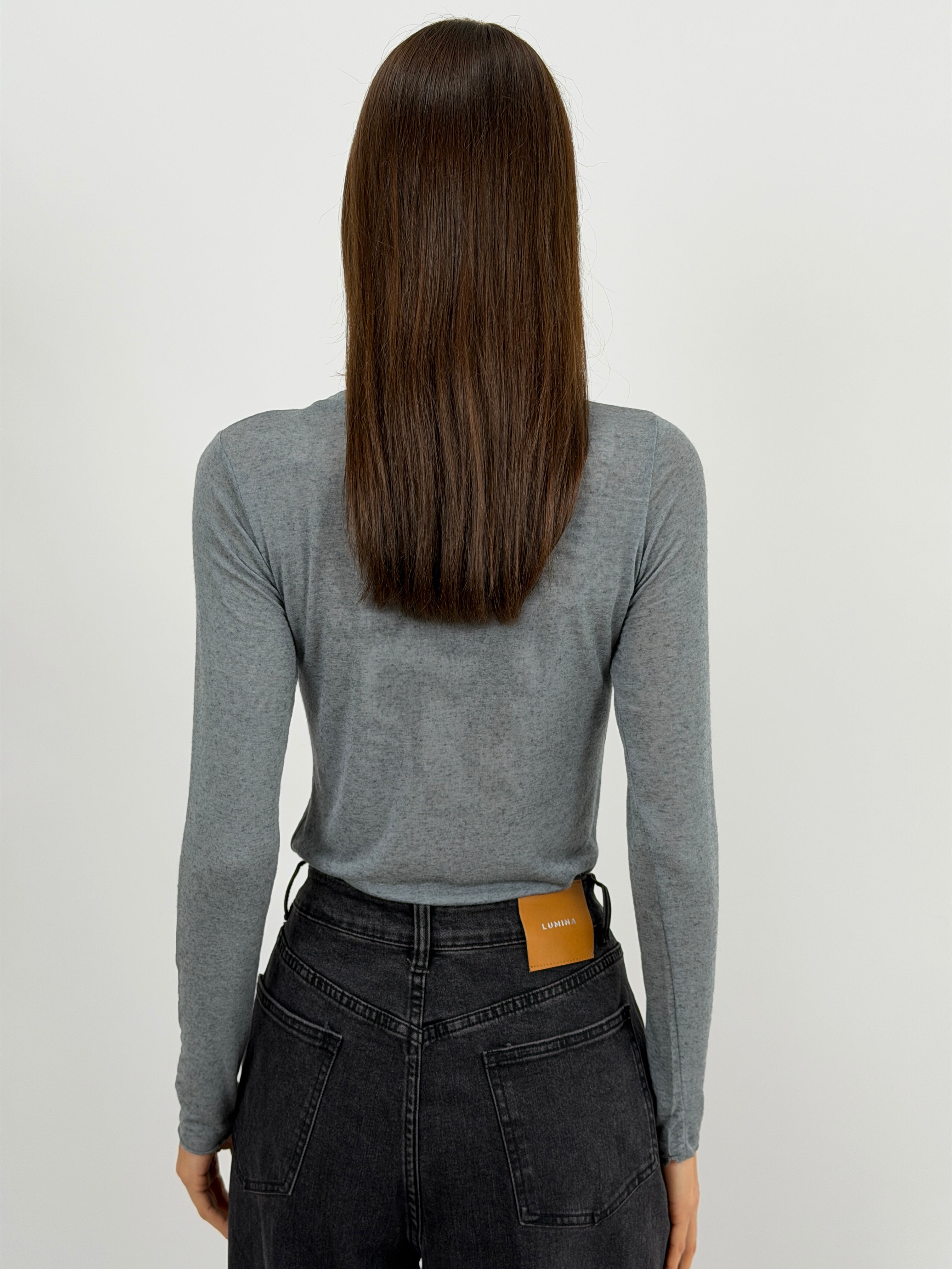 Maglia grigia in tessuto morbido e sottile con cashmere, girocollo e maniche lunghe.