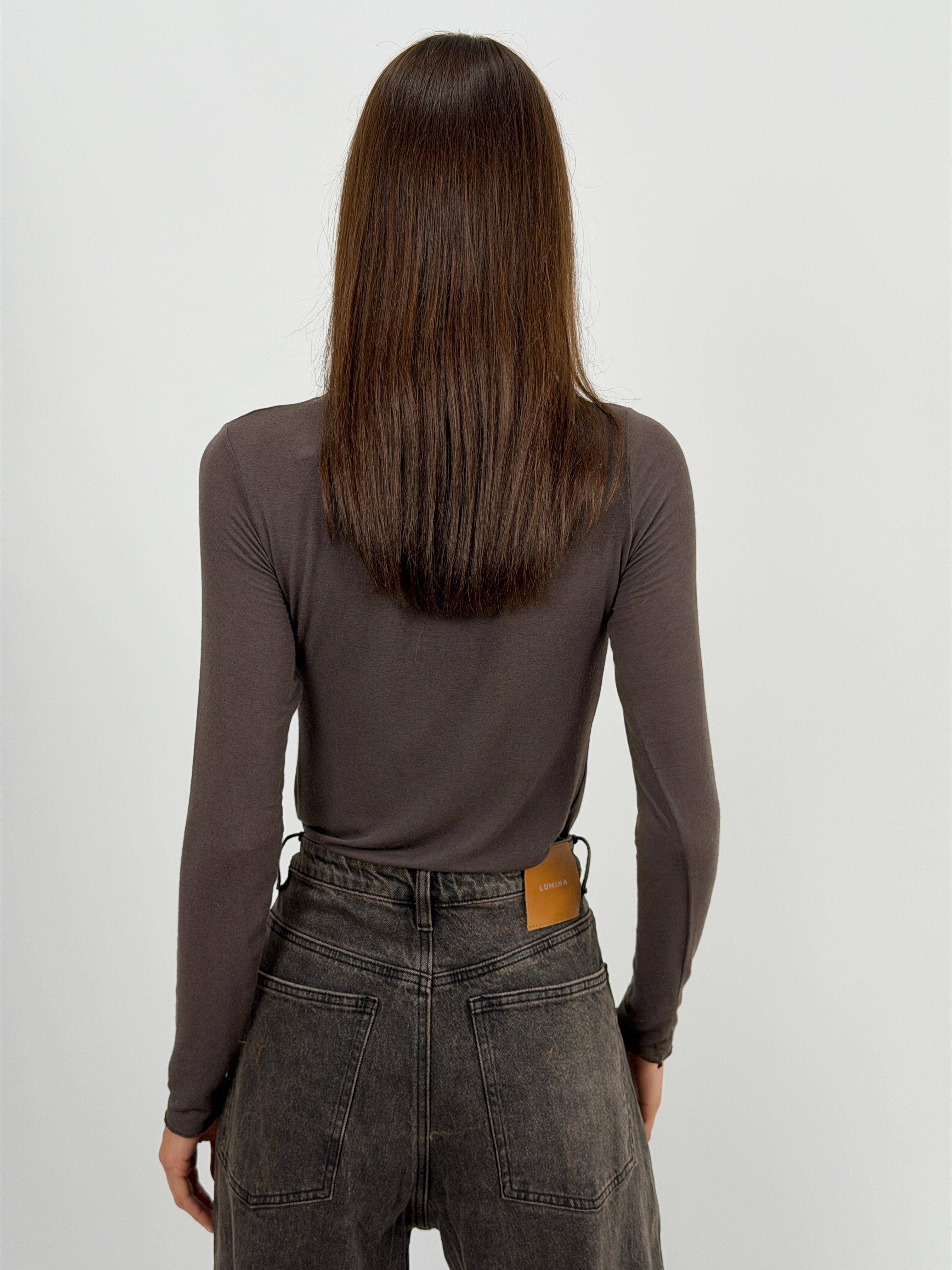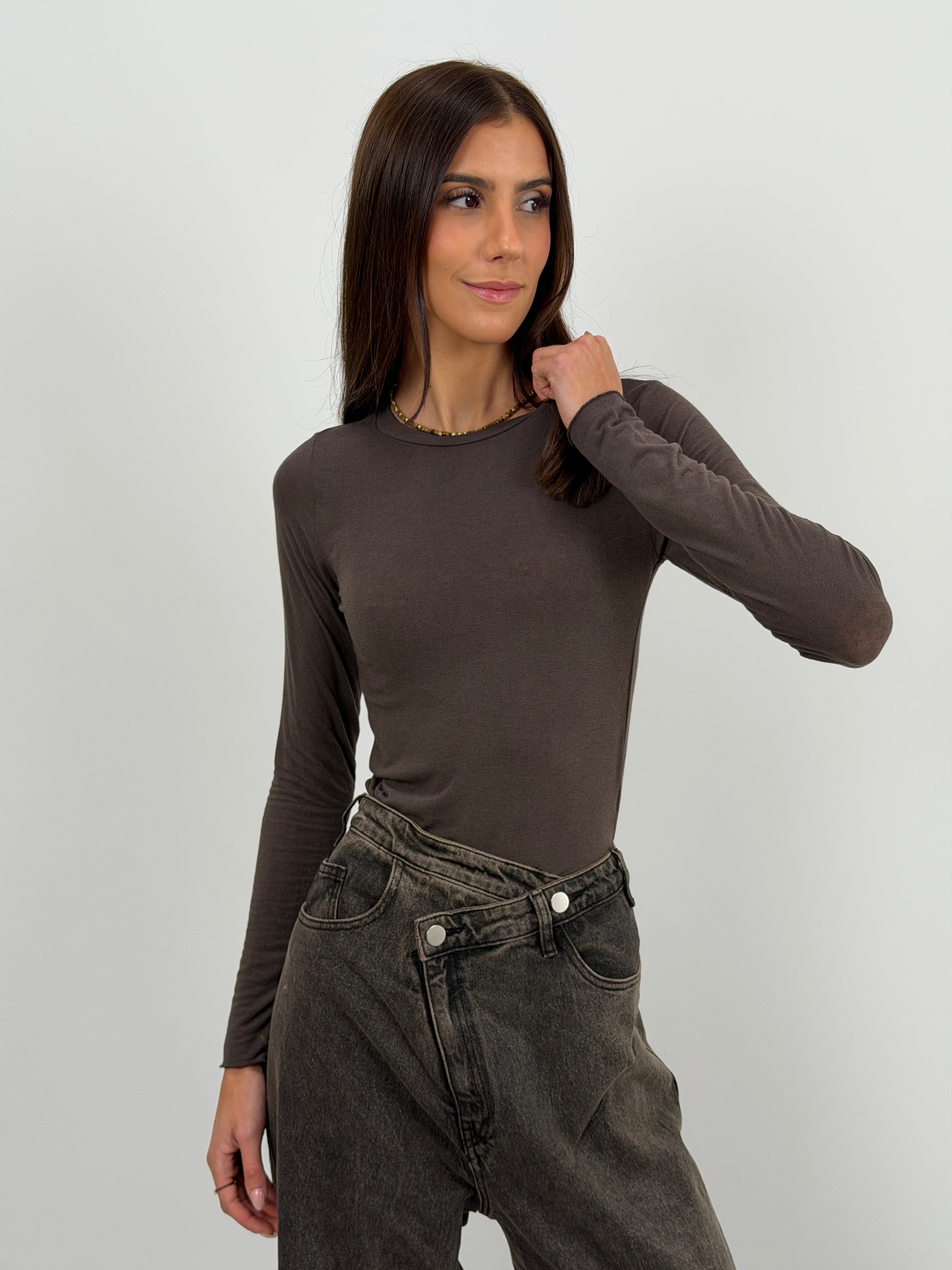 Maglia marrone in tessuto morbido e sottile con cashmere, girocollo e maniche lunghe.