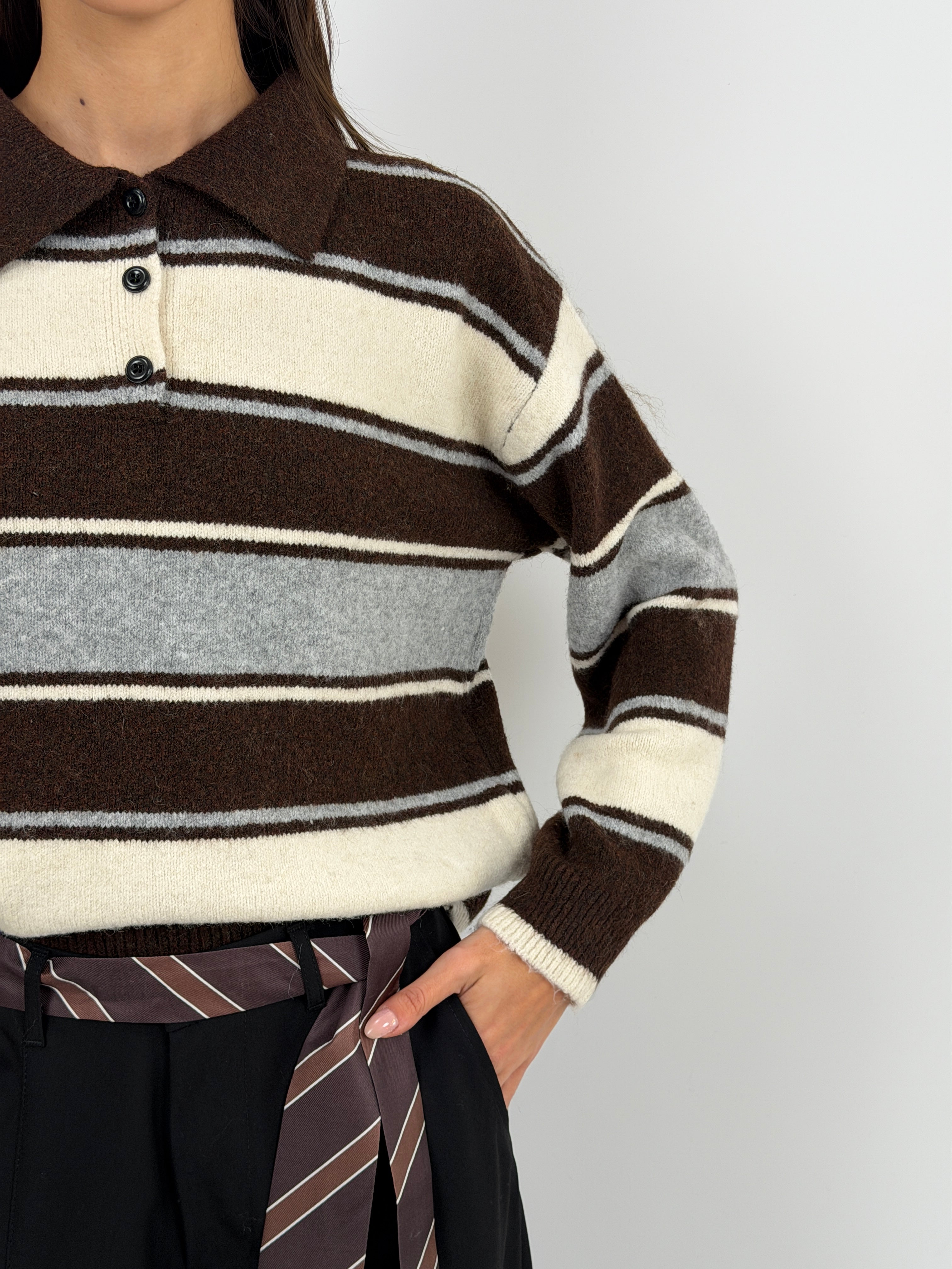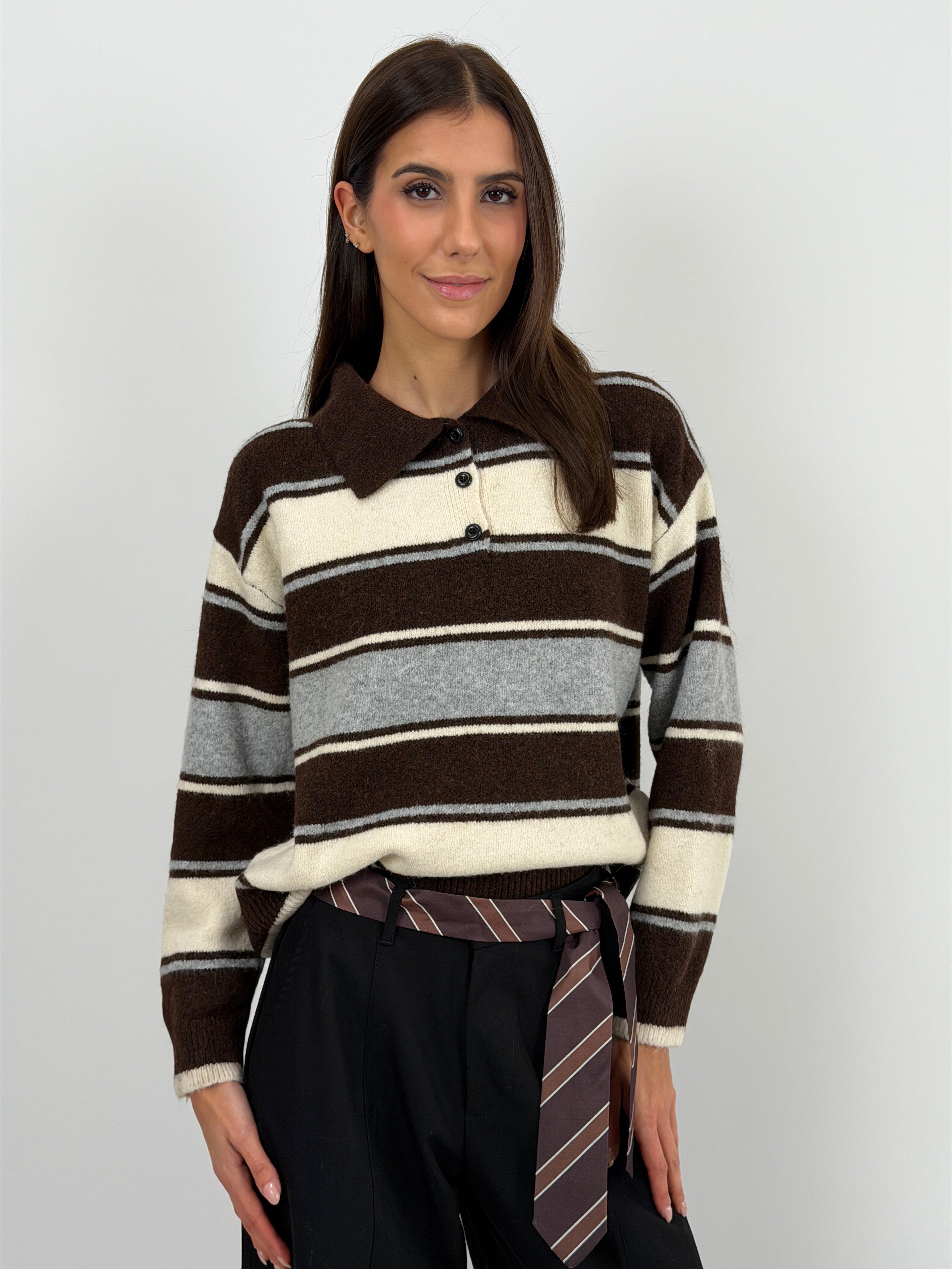 Polo in maglia a righe crema e marrone con maniche lunghe, colletto classico e bottoncini.