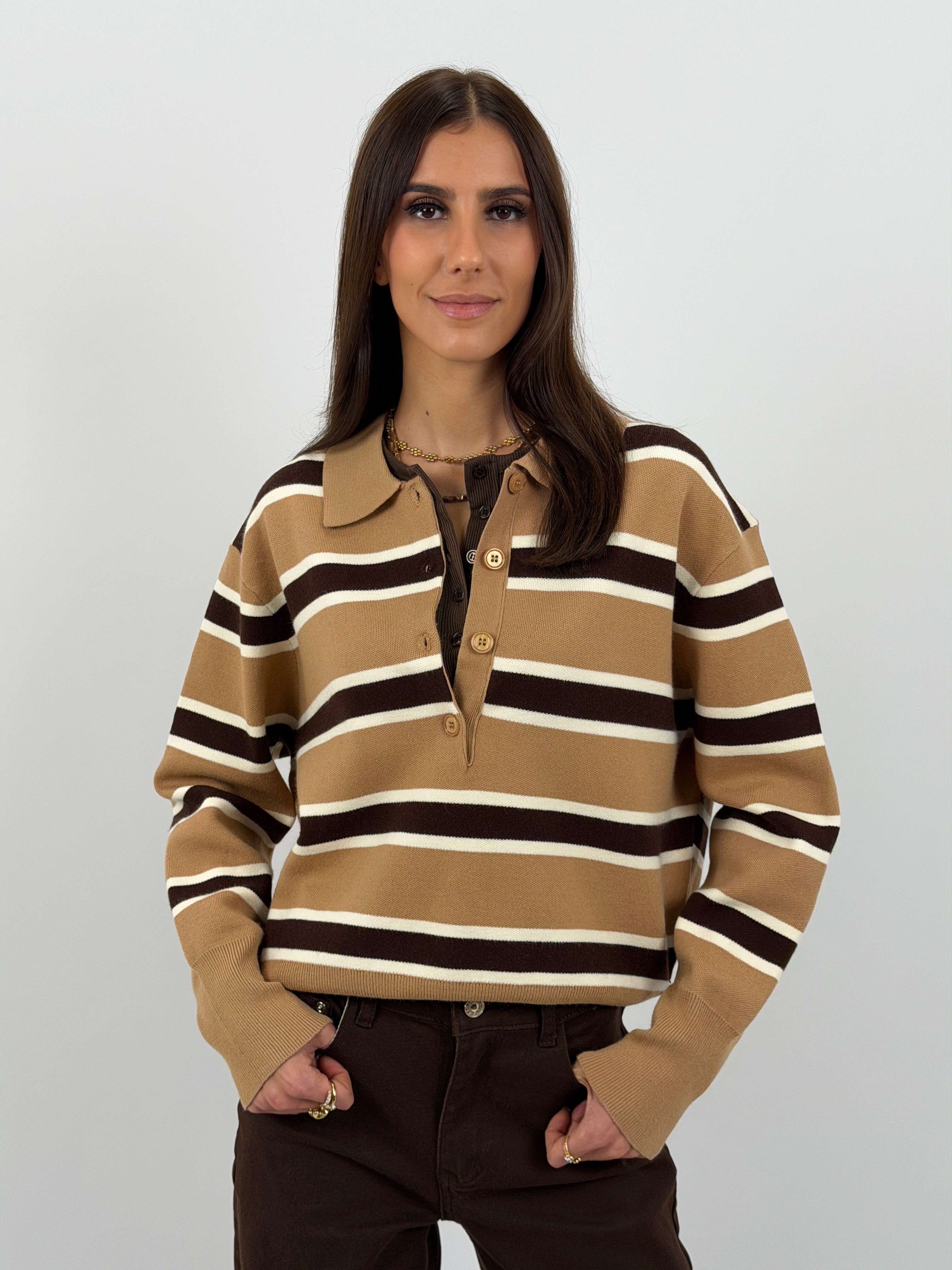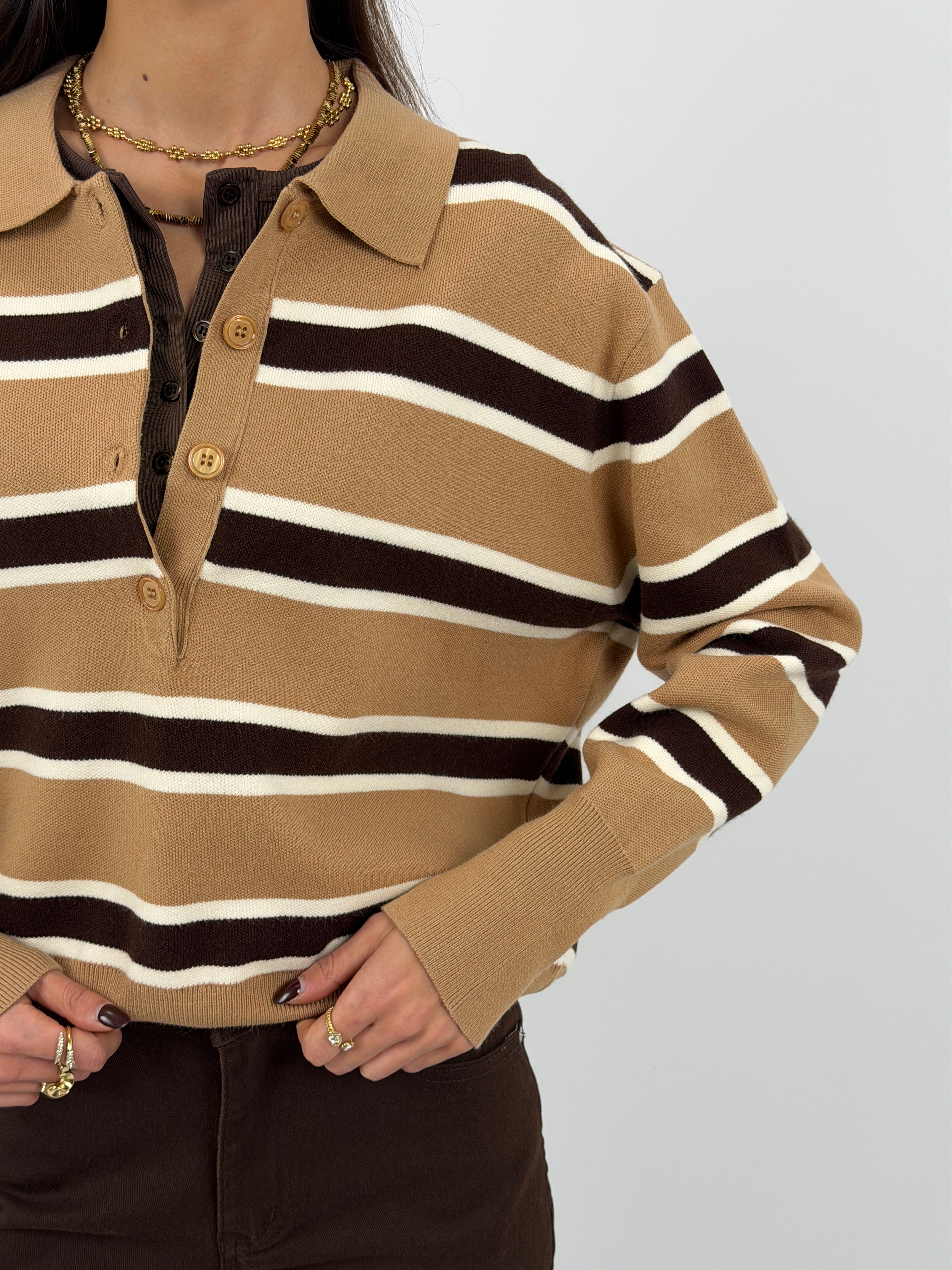 Maglia polo marrone a righe marroni e bianche, con colletto classico e chiusura frontale con bottoni. Tessuto a maglia morbido e linea casual.