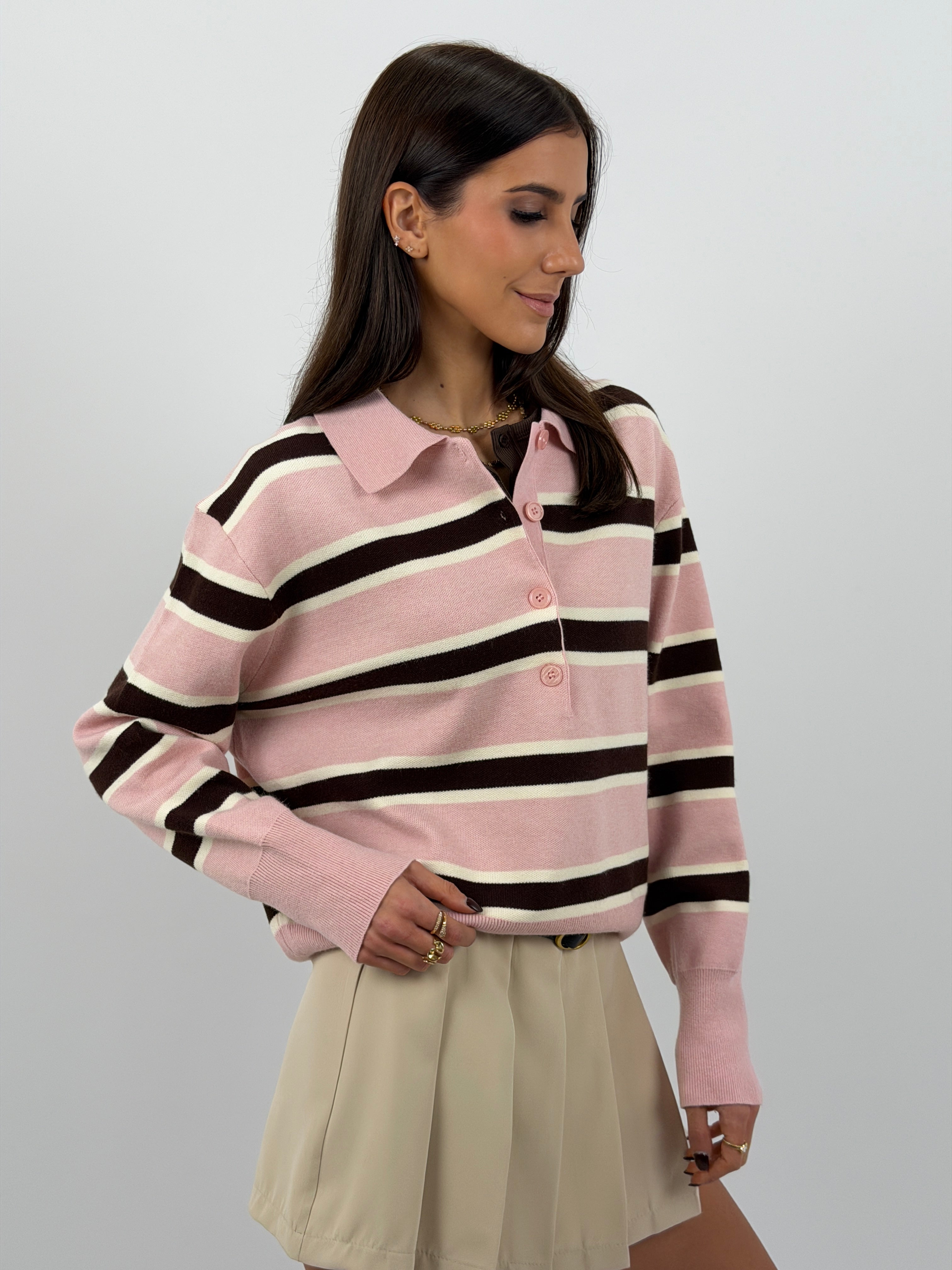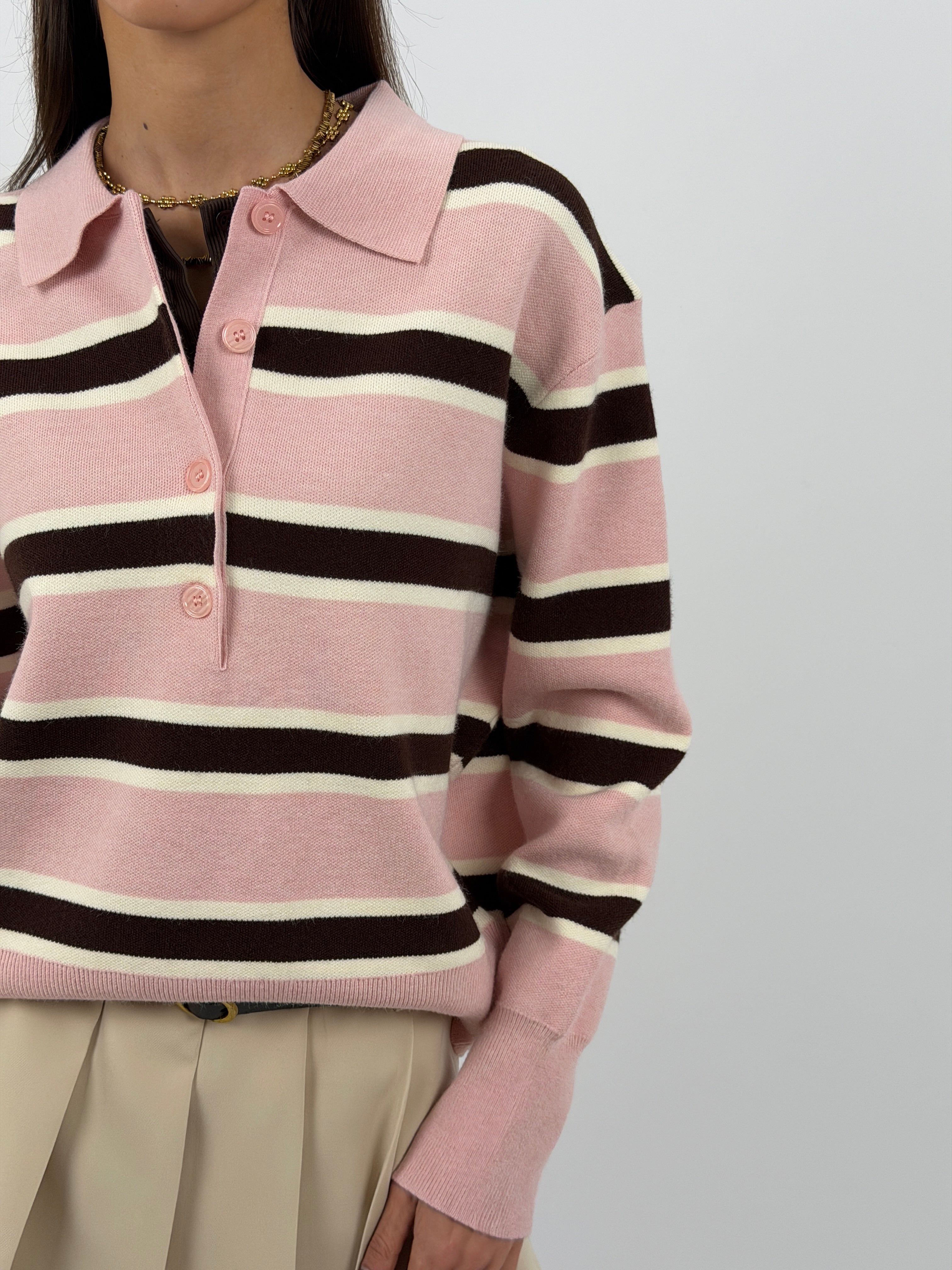 Maglia polo rosa a righe marroni e bianche, con colletto classico e chiusura frontale con bottoni. Tessuto a maglia morbido e linea casual.