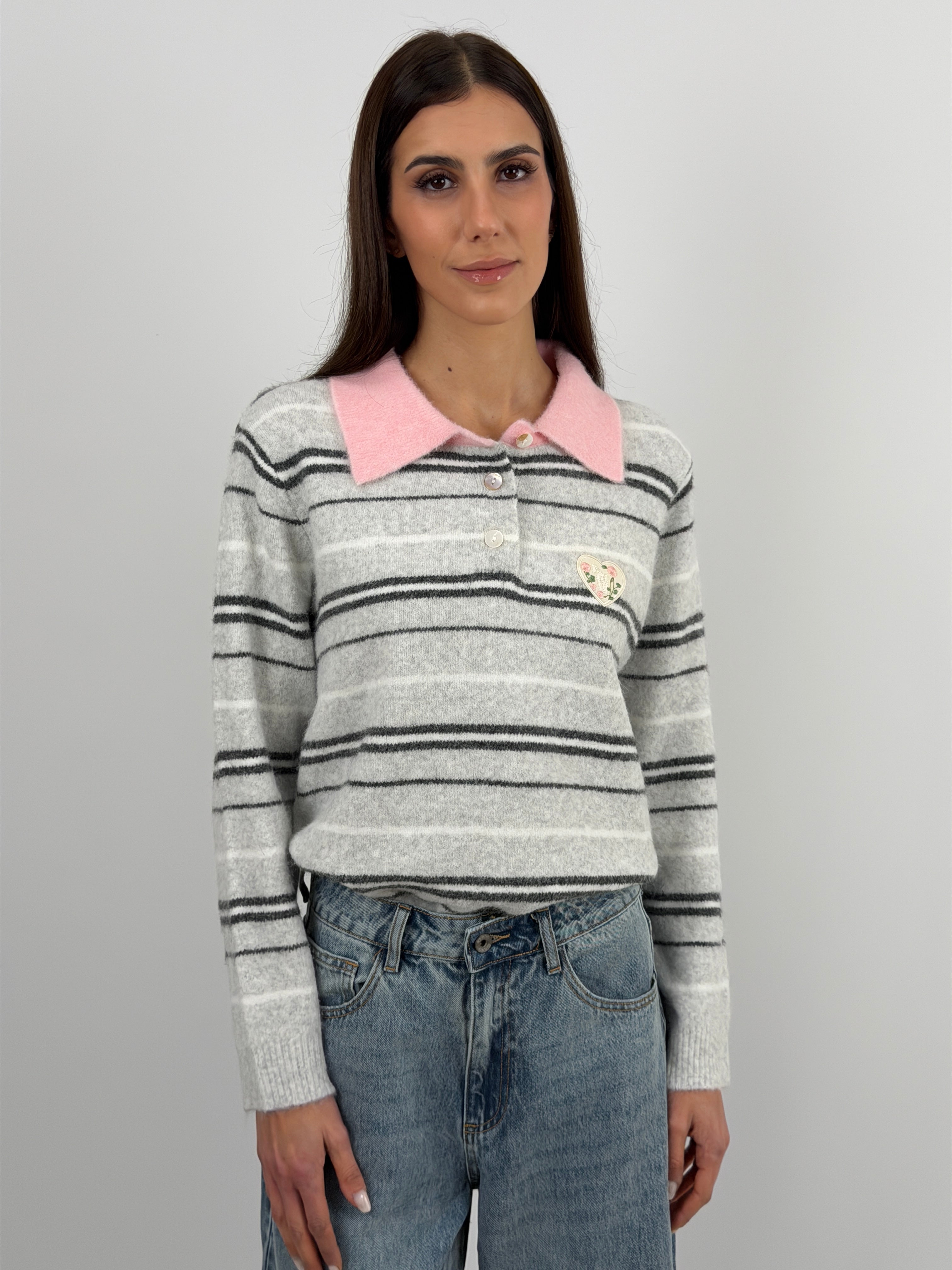 Pullover grigio con colletto e bottoncini a righe a contrasto, arricchito da patches applicate sul lato cuore