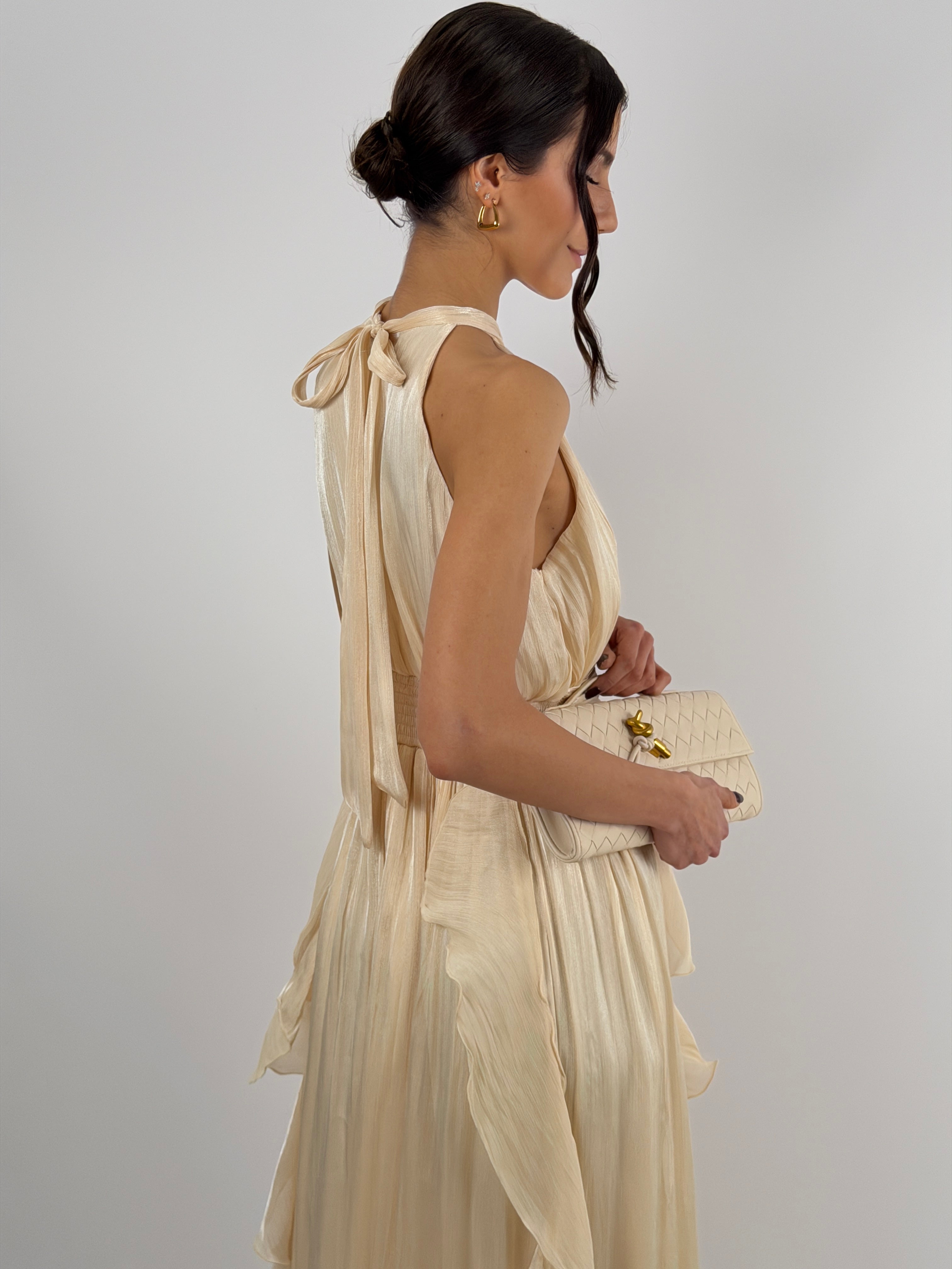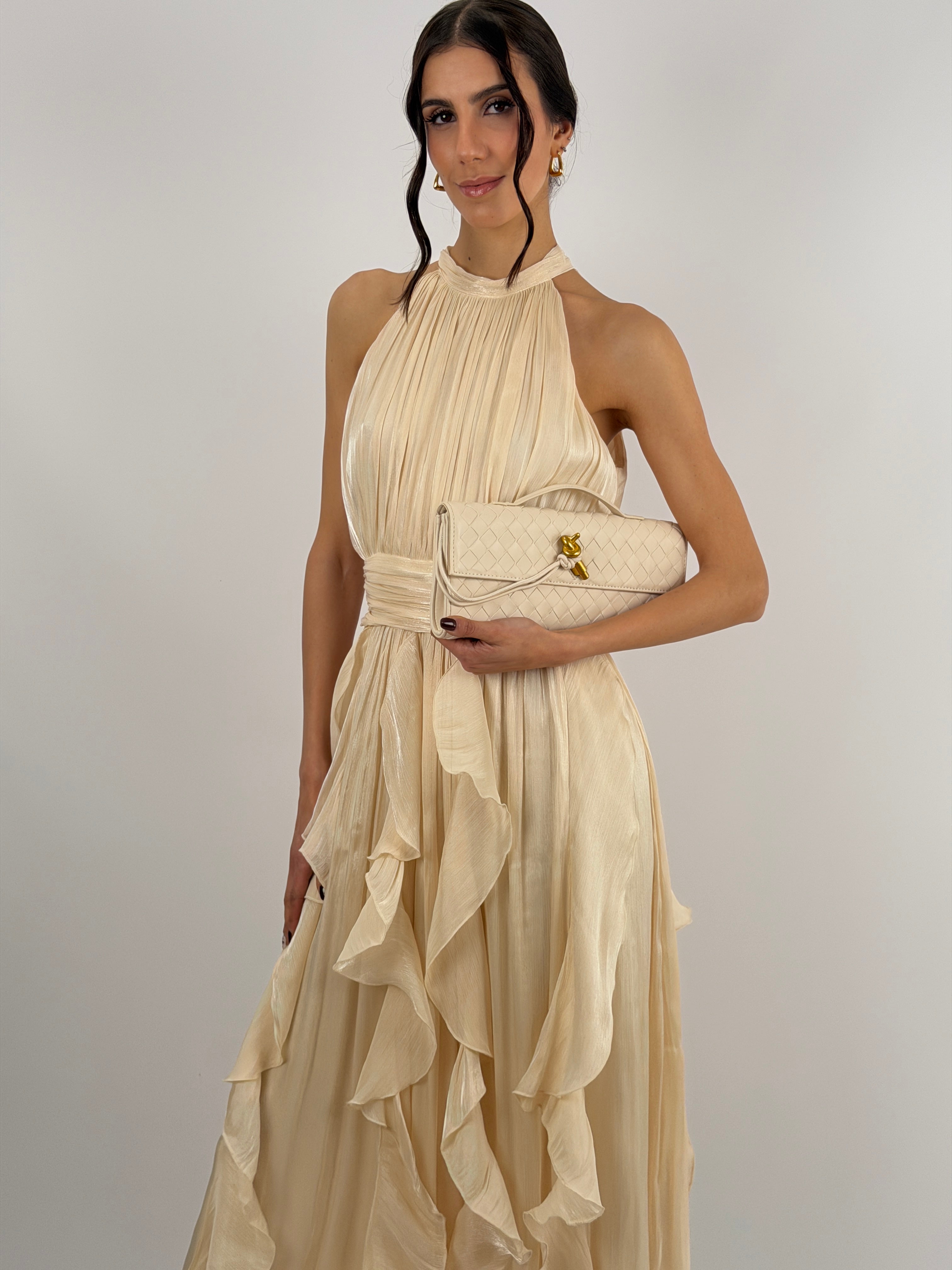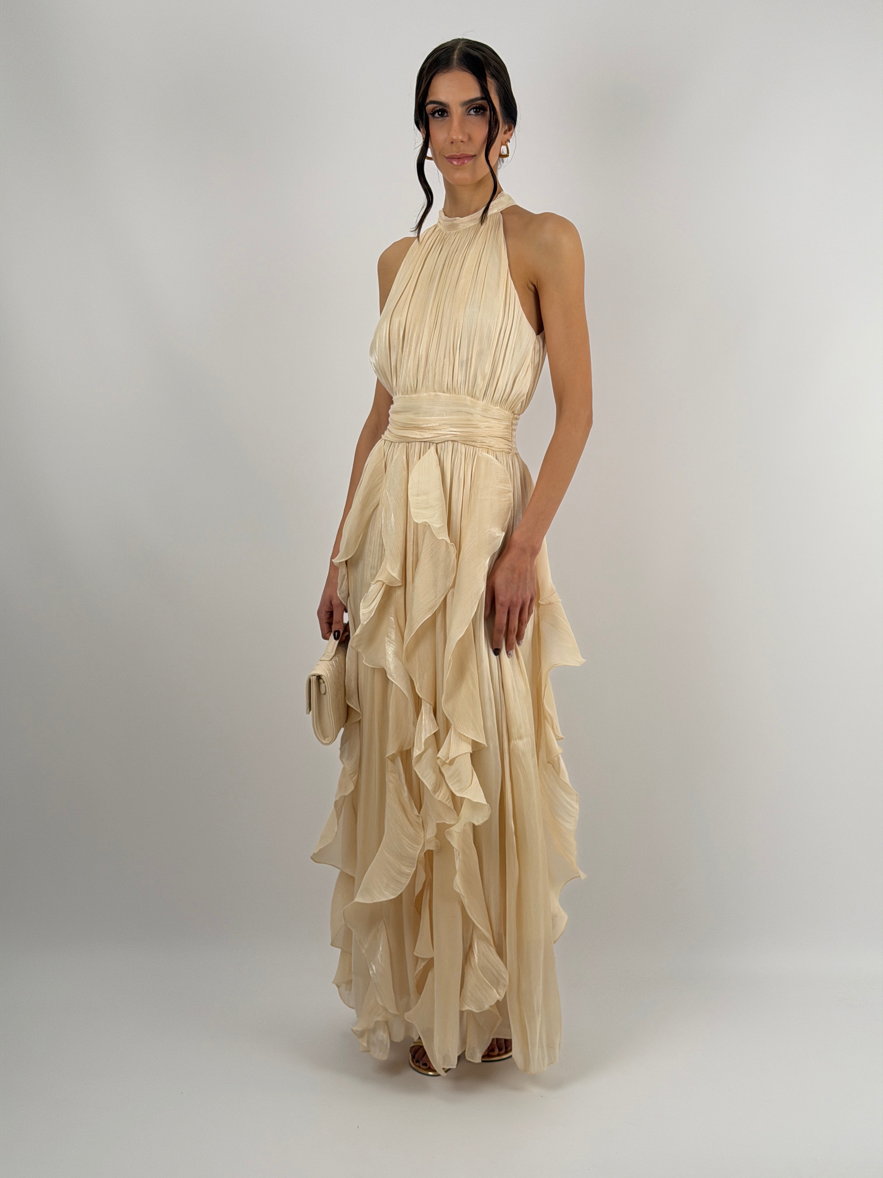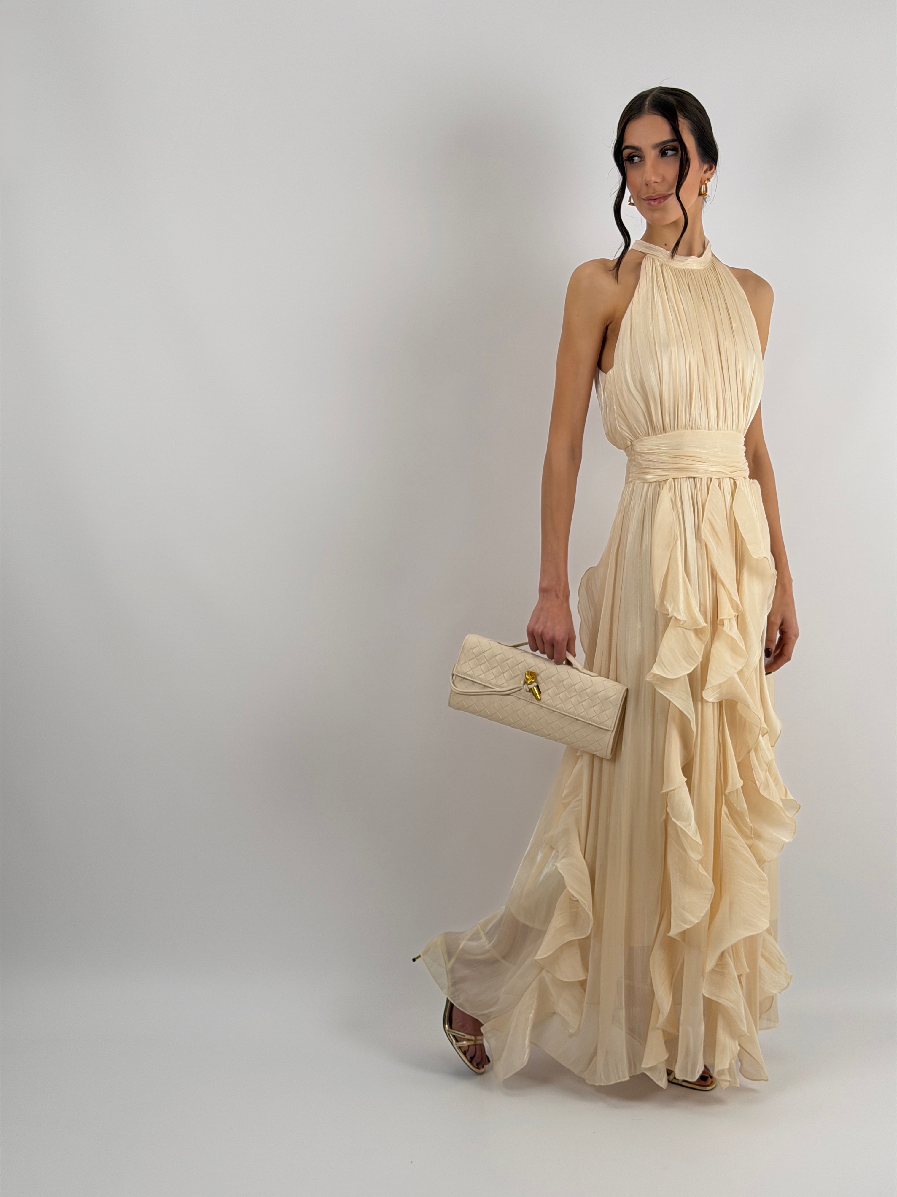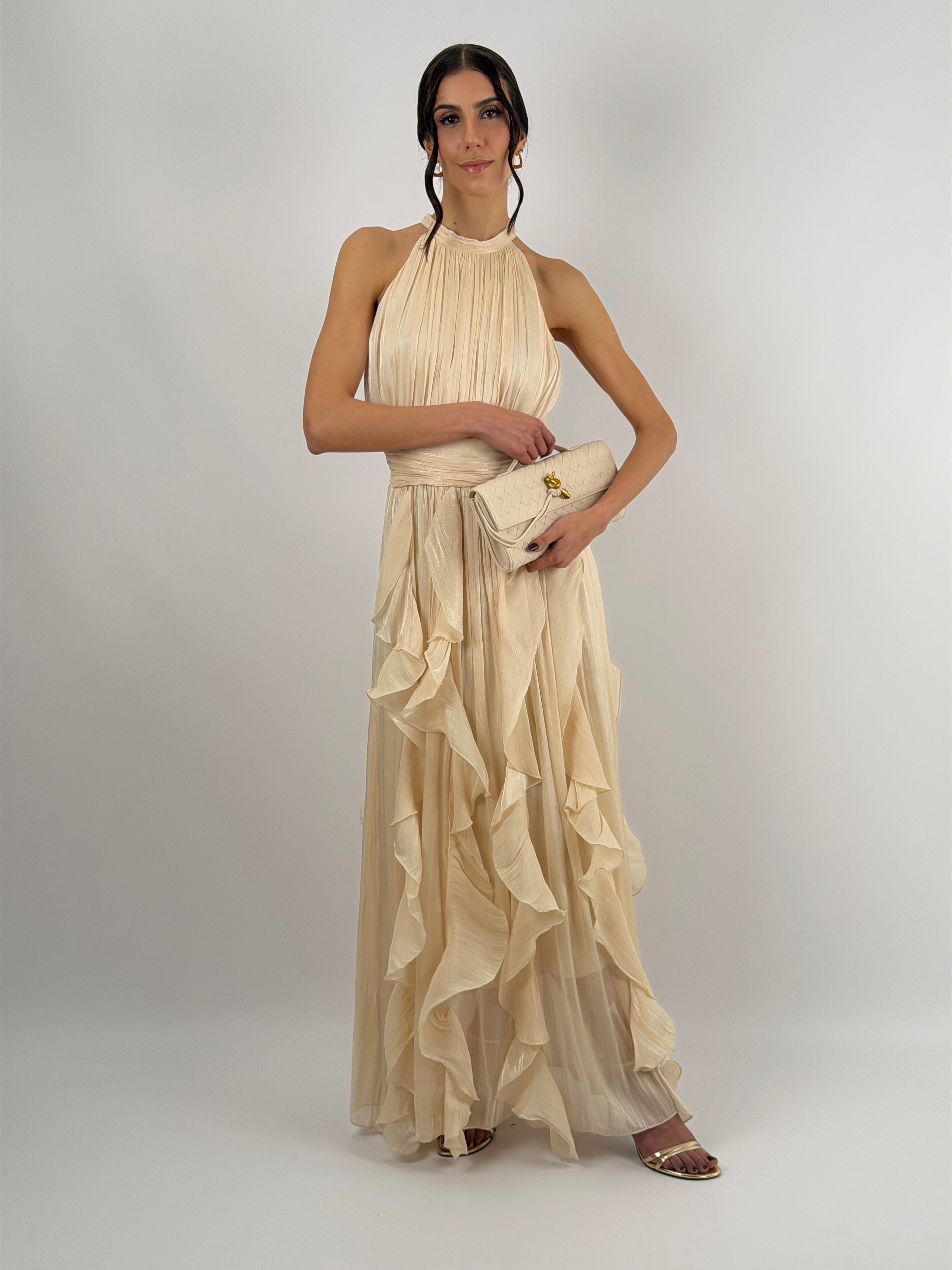 Abito lungo color avorio smanicato in chiffon con volant sulla gonna, chiusura al collo con lacci e elastico in vita