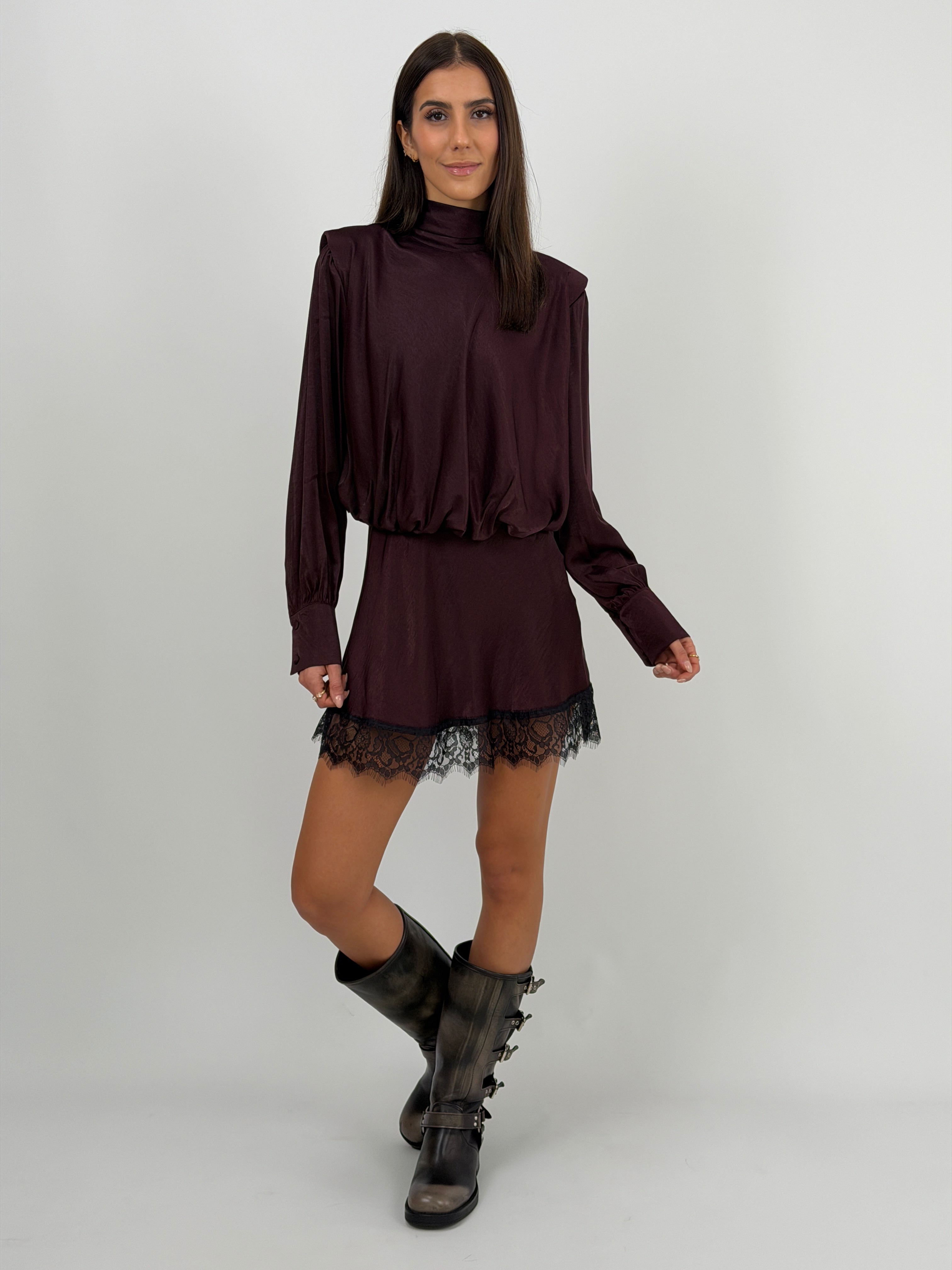 Abito Lumina corto in tessuto satinato bordeaux con spalline imbottite e bordo in pizzo. Elastico in vita e lacci a chiusura sul collo.