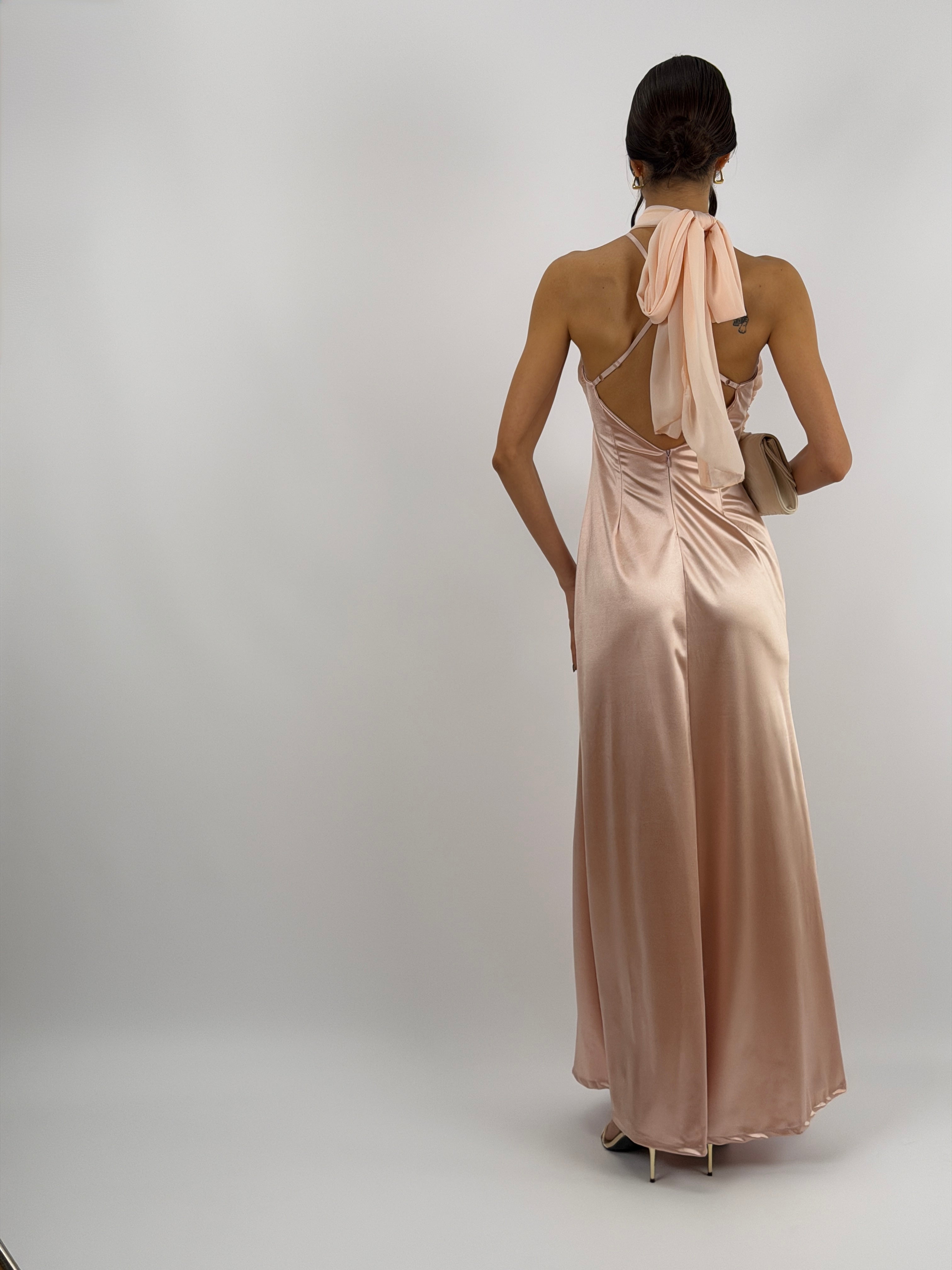 Abito lungo rosa da cerimonia con inserto in tulle tono su tono