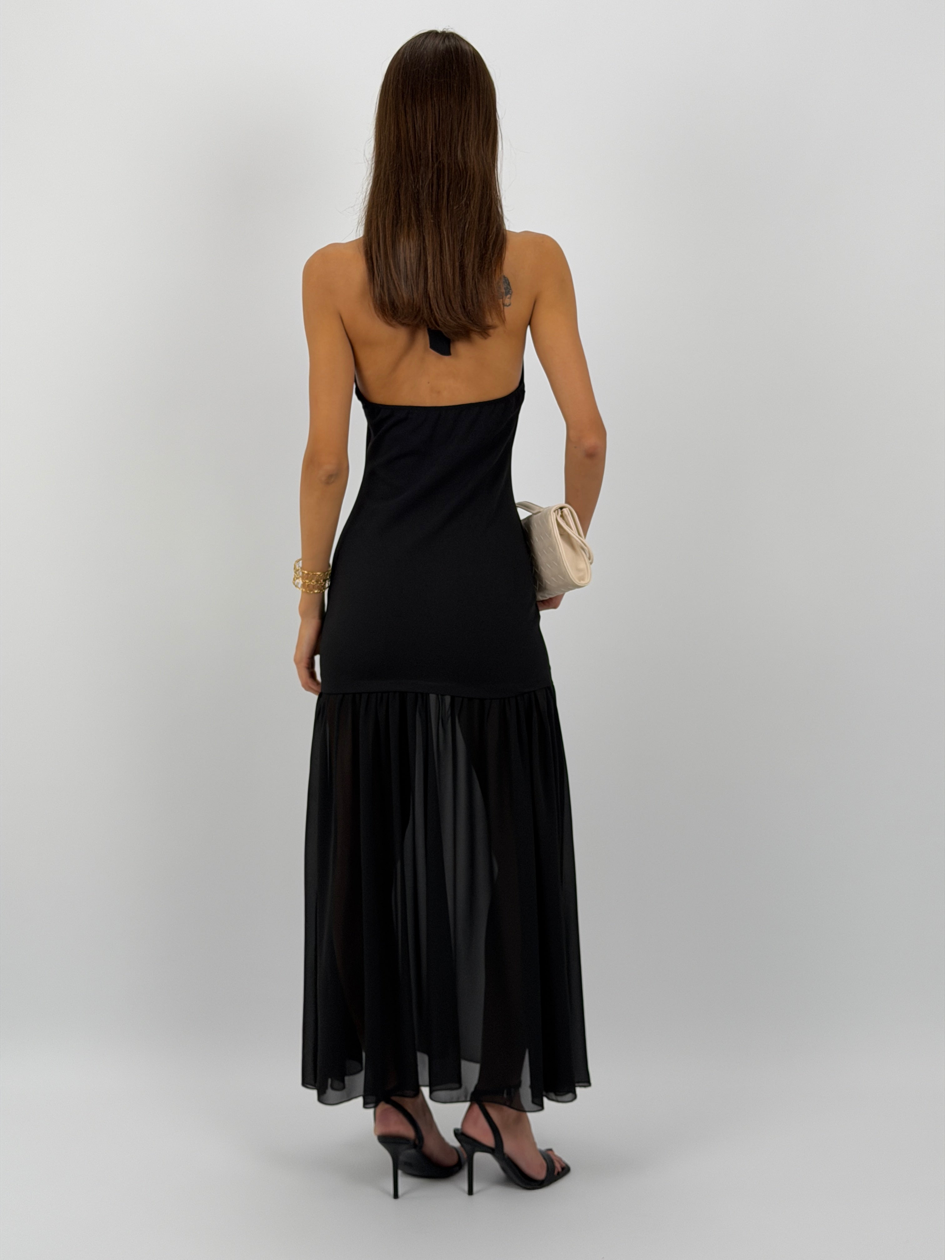 Abito lungo nero con collo halter e chiusura a bottoncini, con gonna in tessuto semitrasparente.