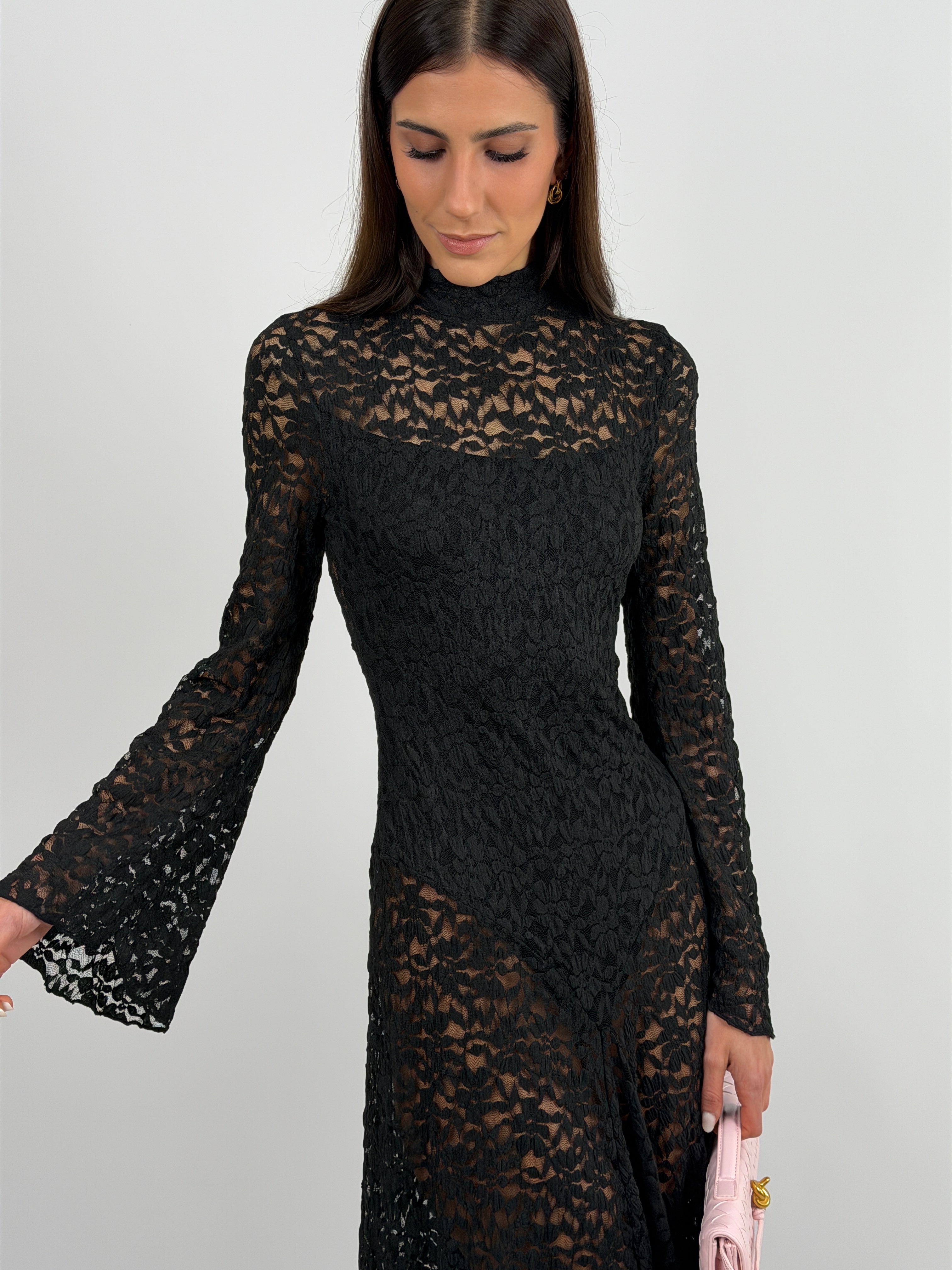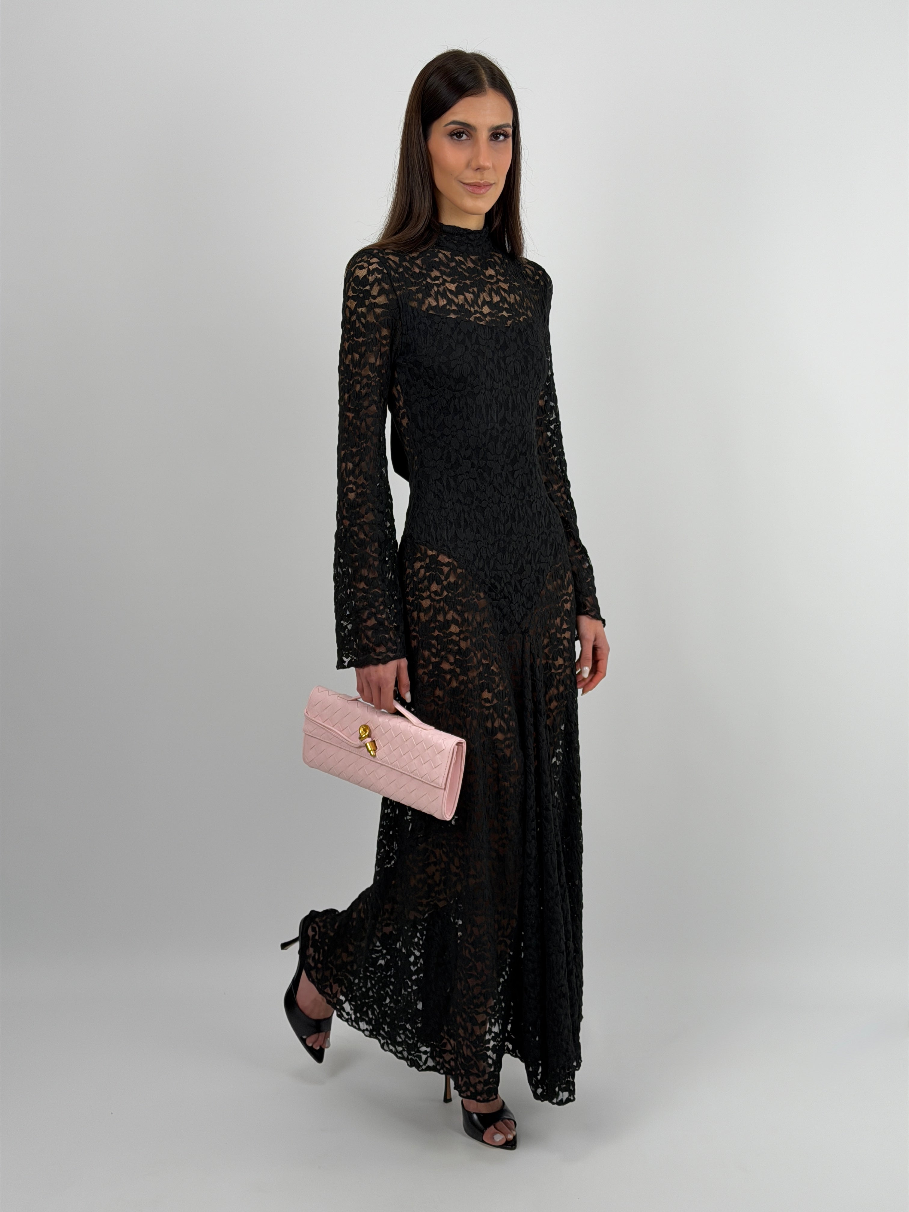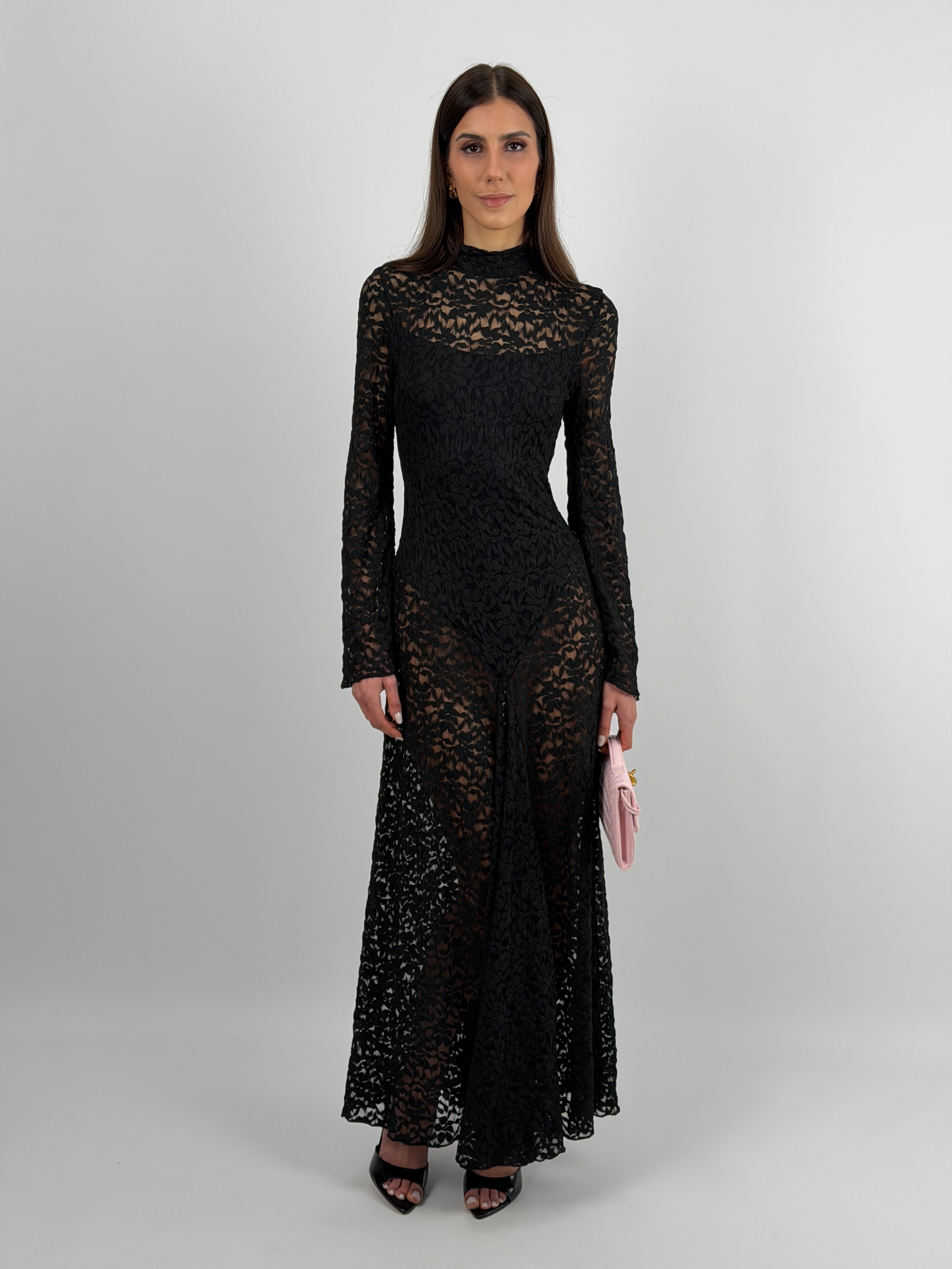Abito Lumina nero lungo in pizzo con body incorporato, maniche lunghe e collo alto, schiena scoperta e chiusura con fiocco in satin sul retro