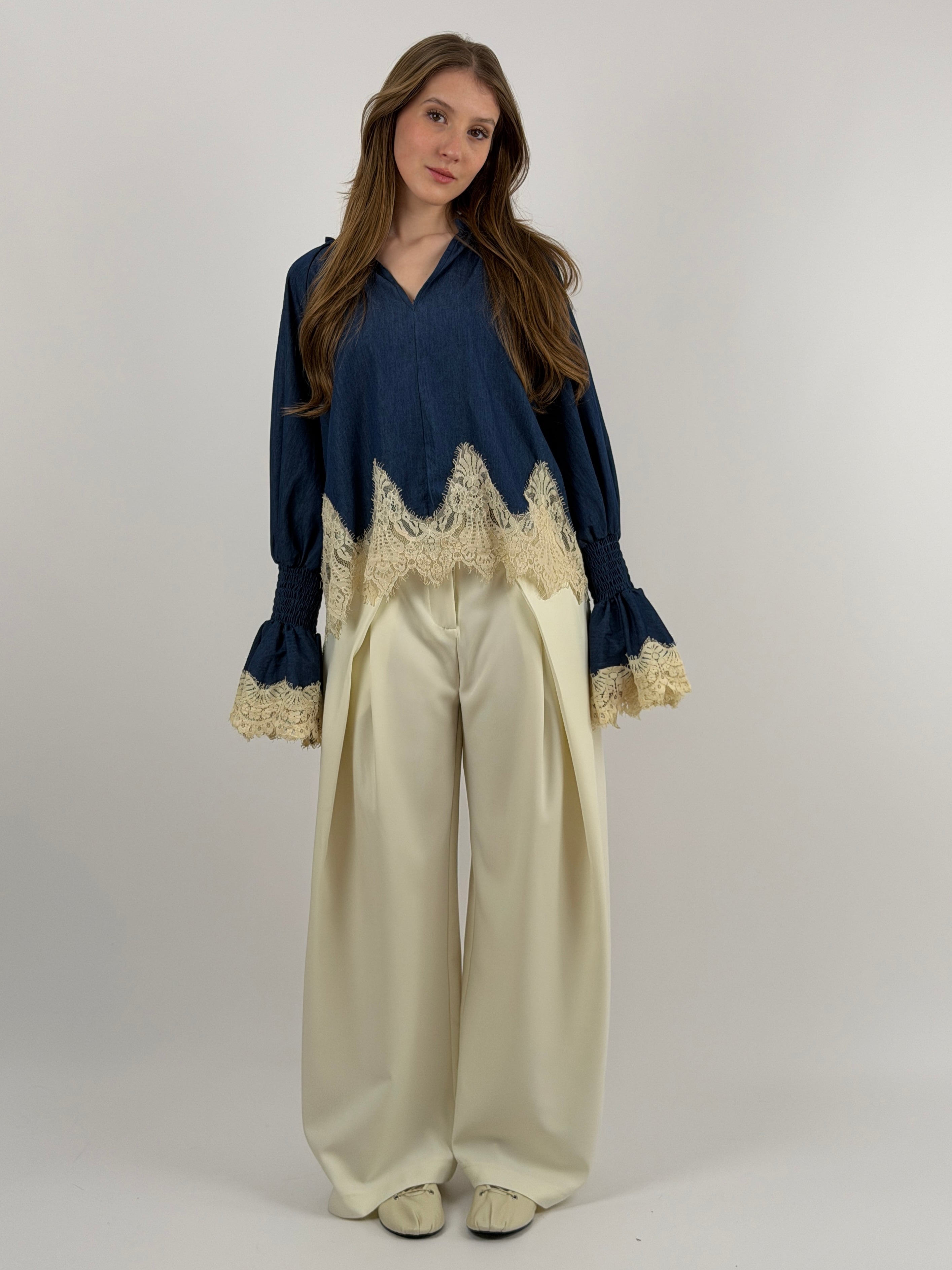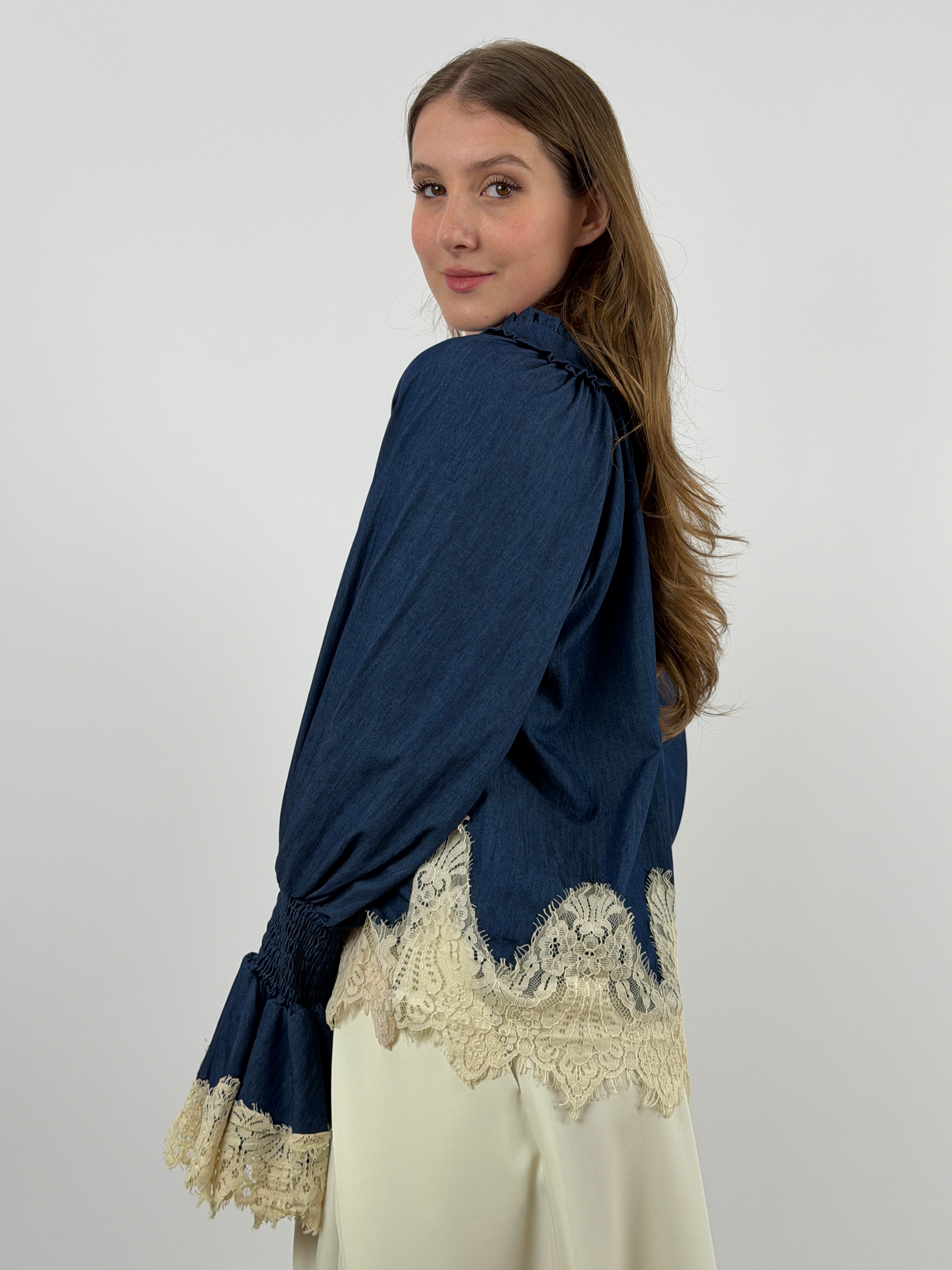 Blusa in denim con volant e applicazioni in pizzo a contrasto, scollo a V e maniche ampie sul fondo