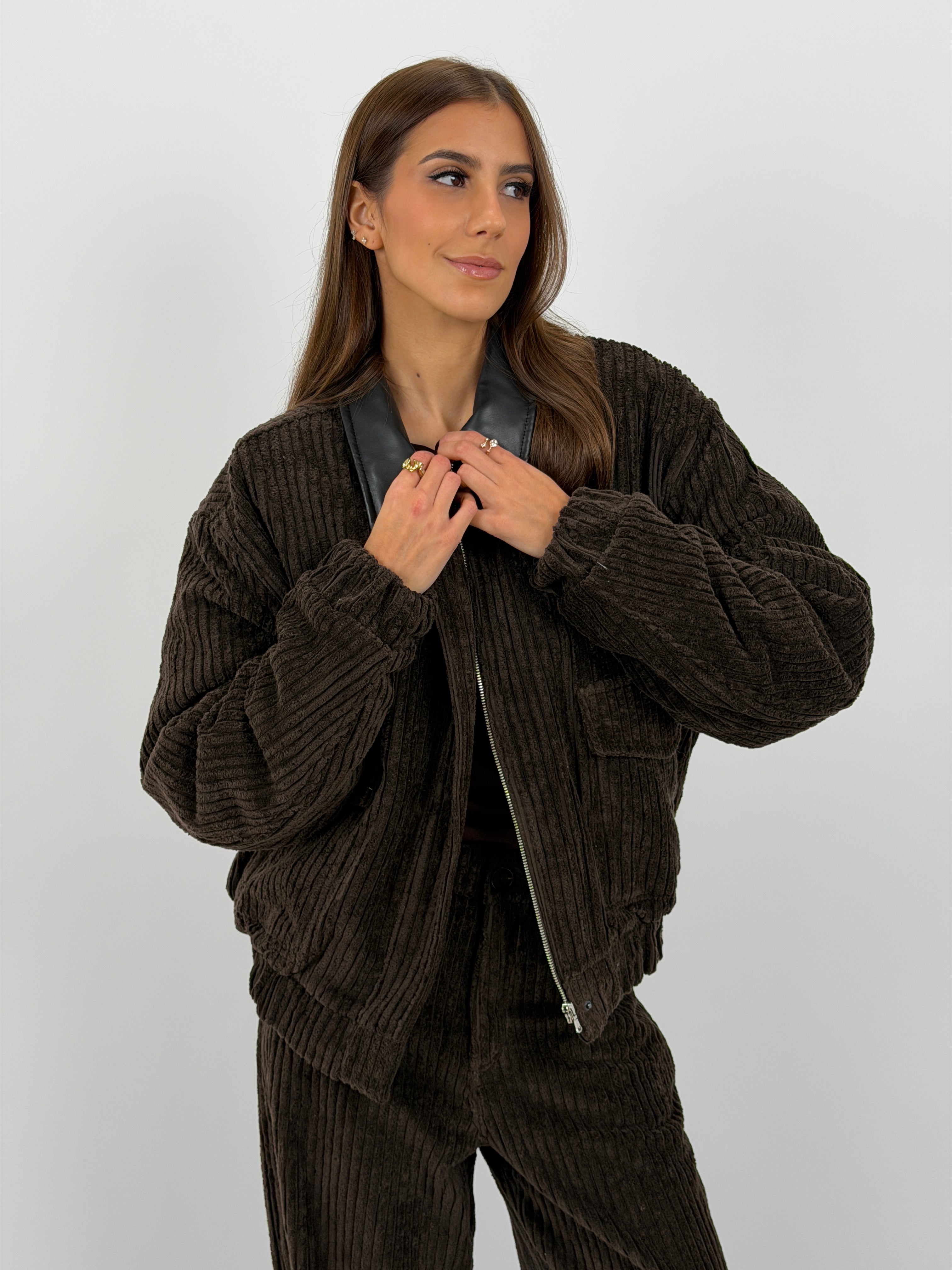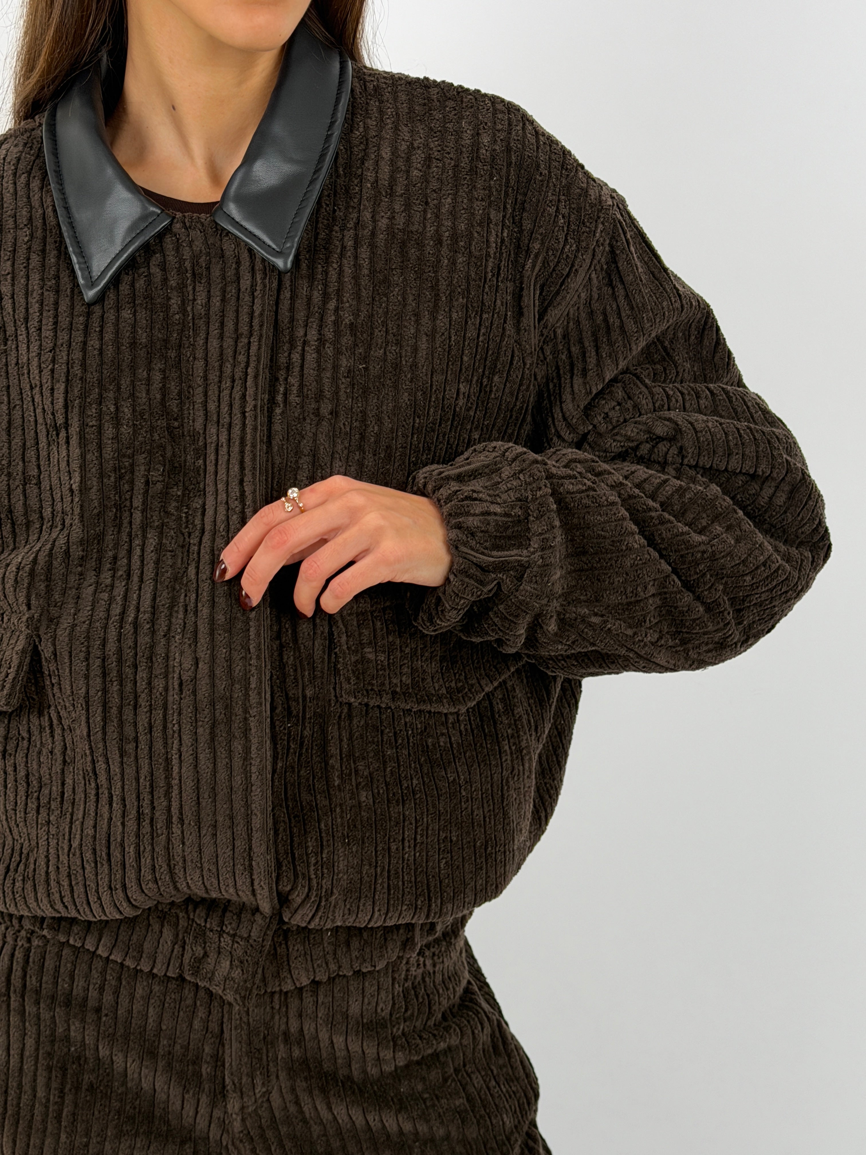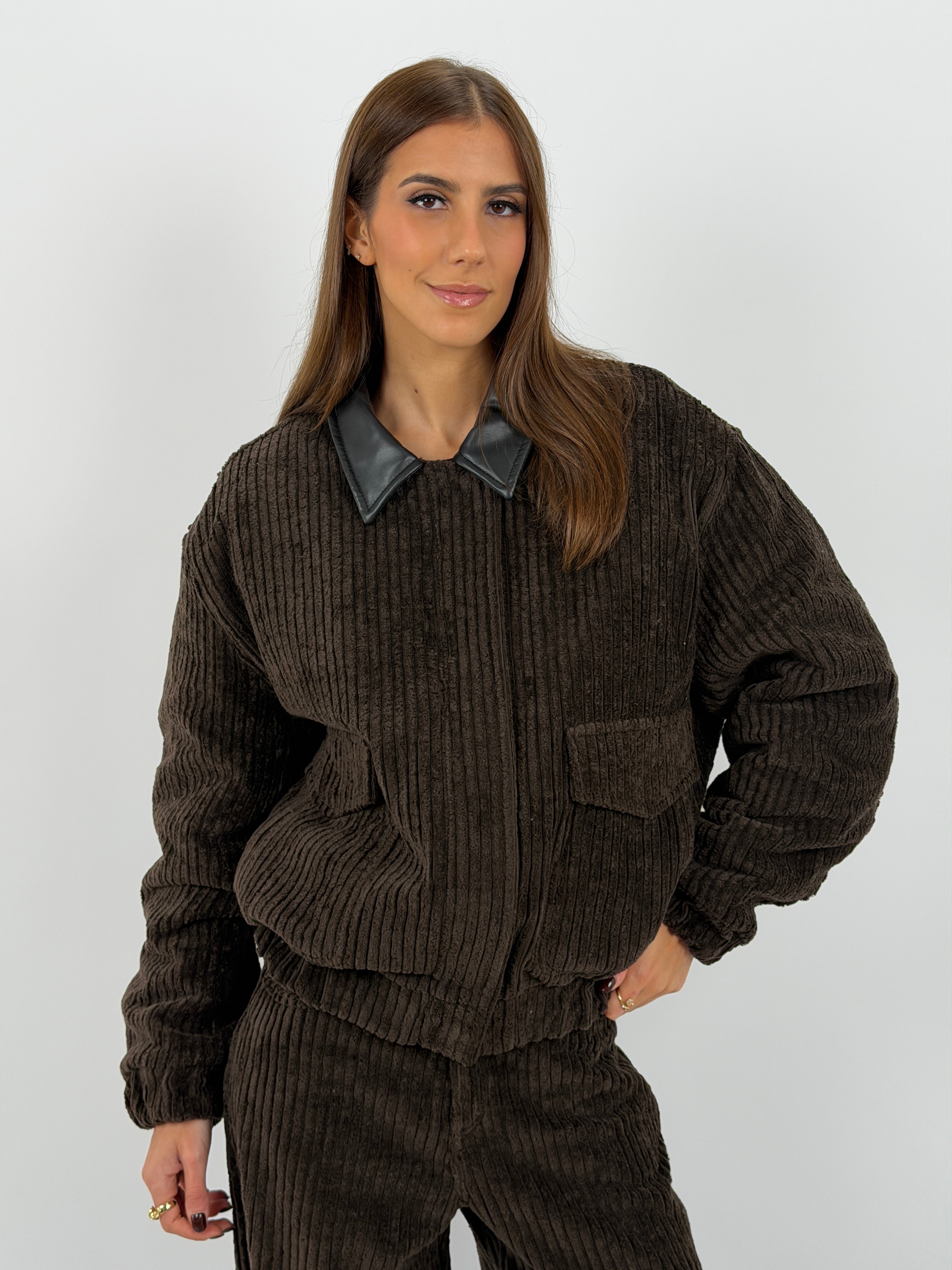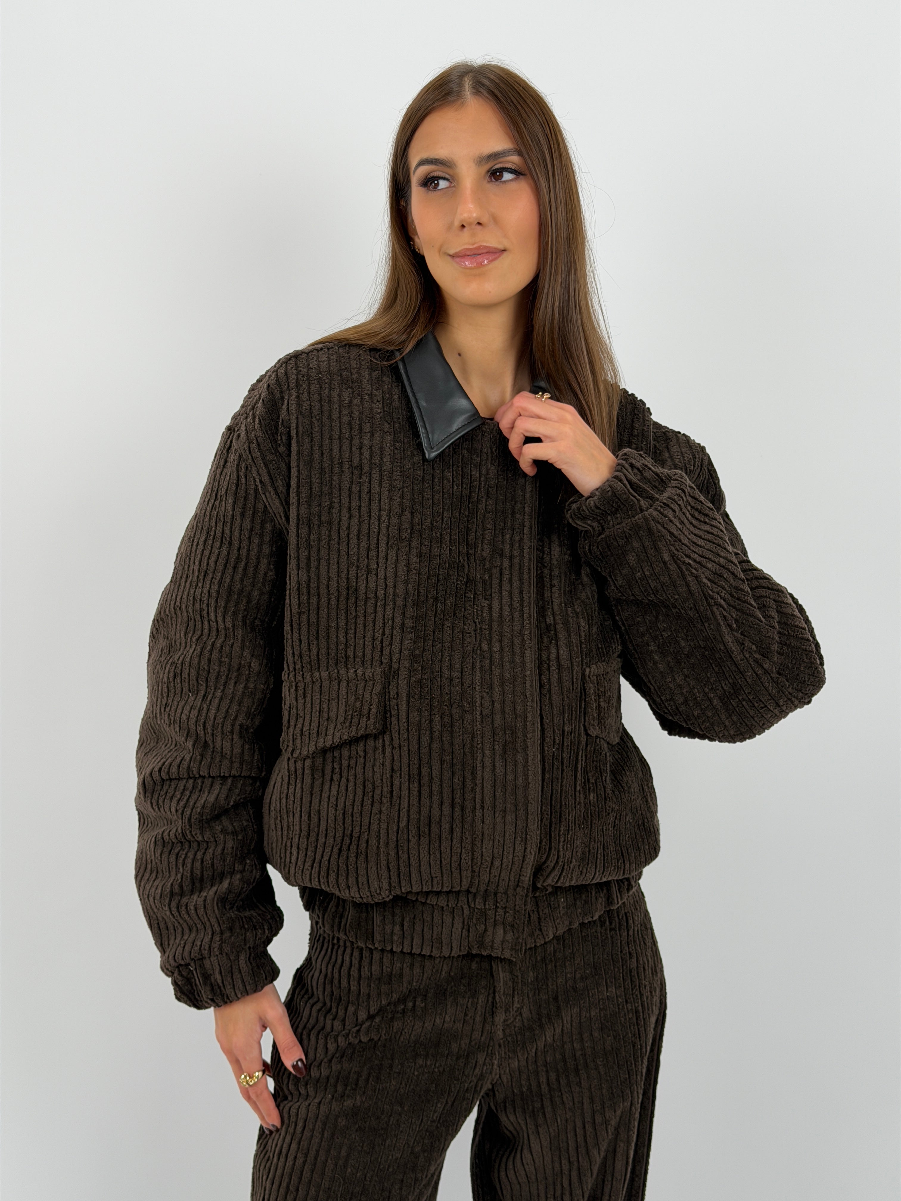 Giubbotto marrone Lumina modello bomber imbottito in velluto a coste con colletto in ecopelle, tasche laterali e finte tasche frontali con patta, fodera trapuntata.