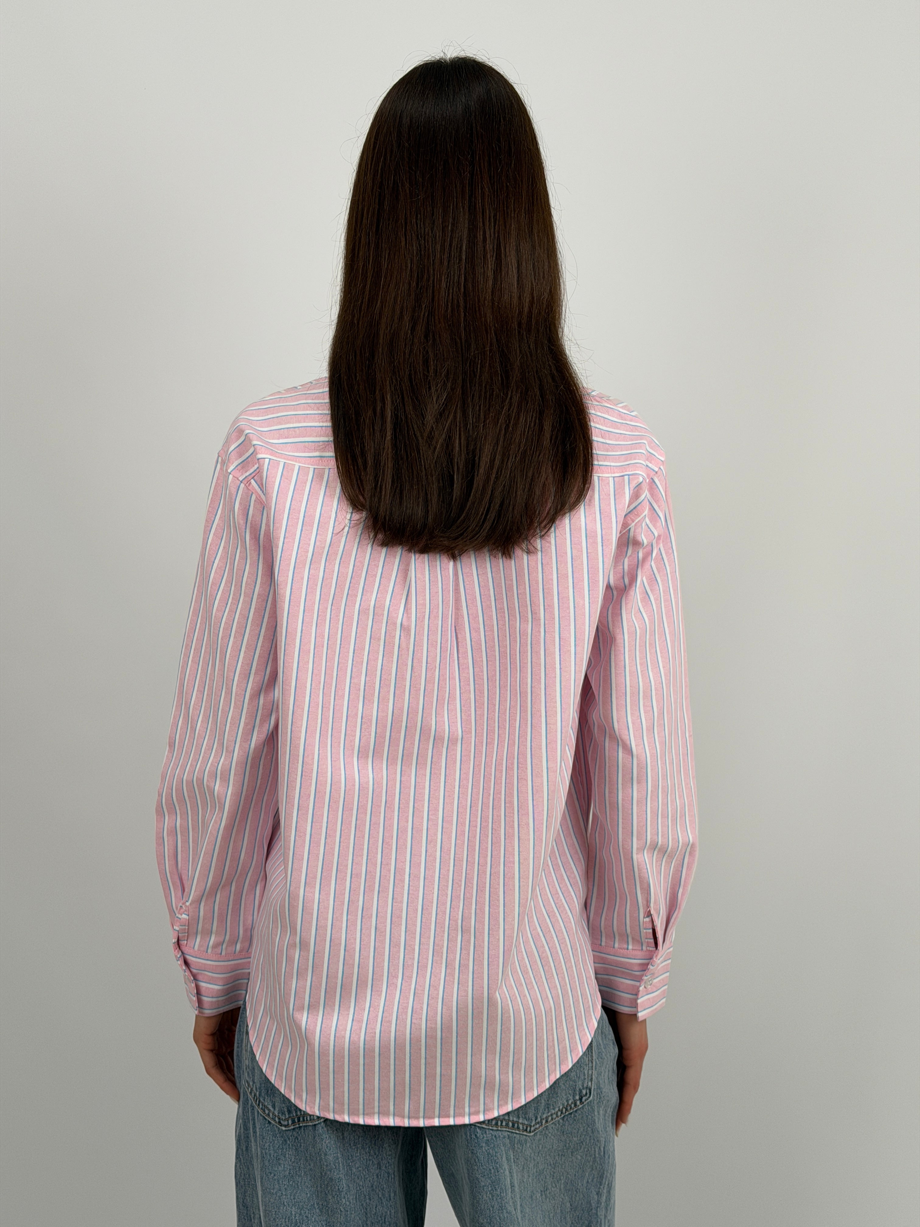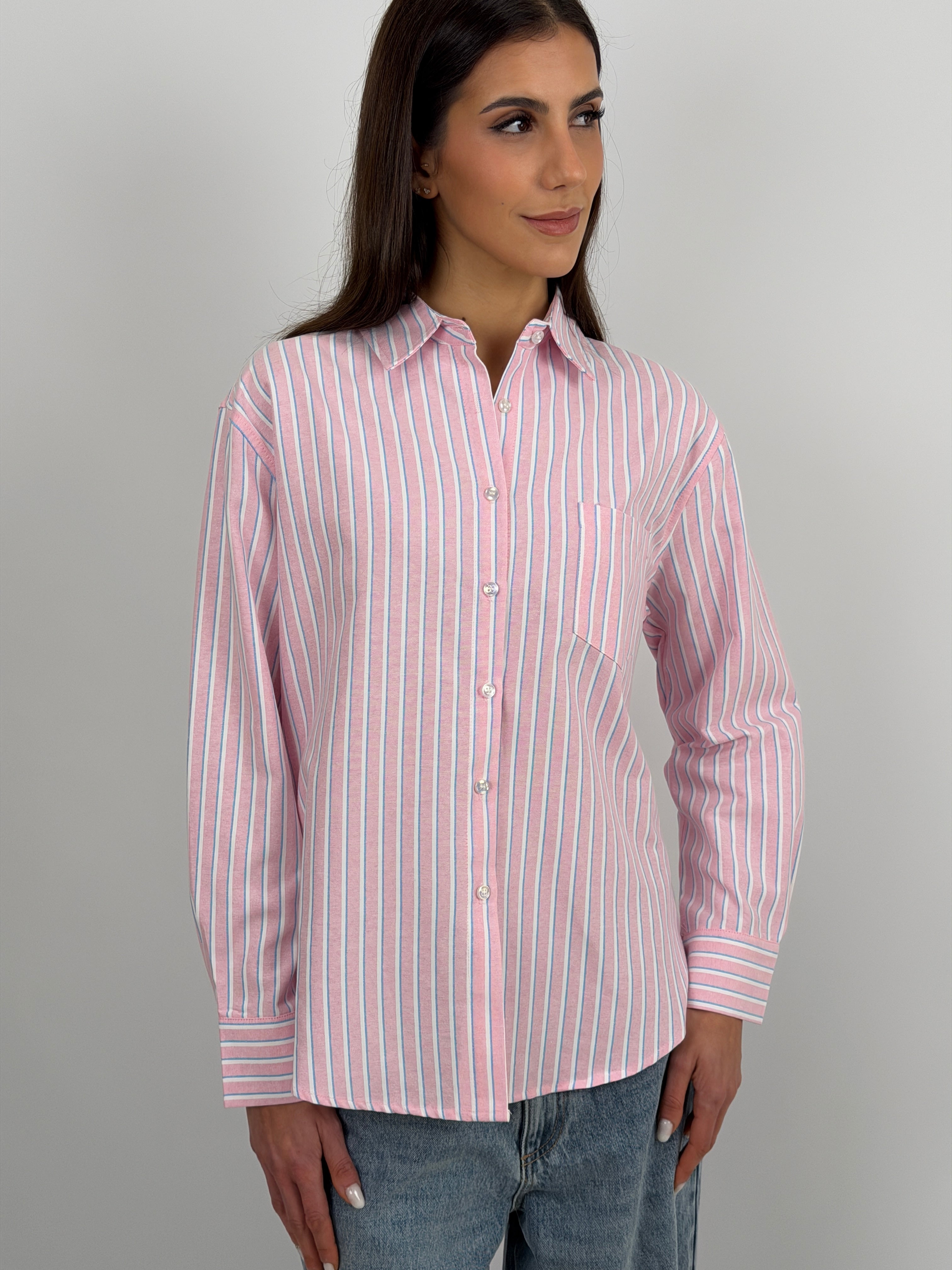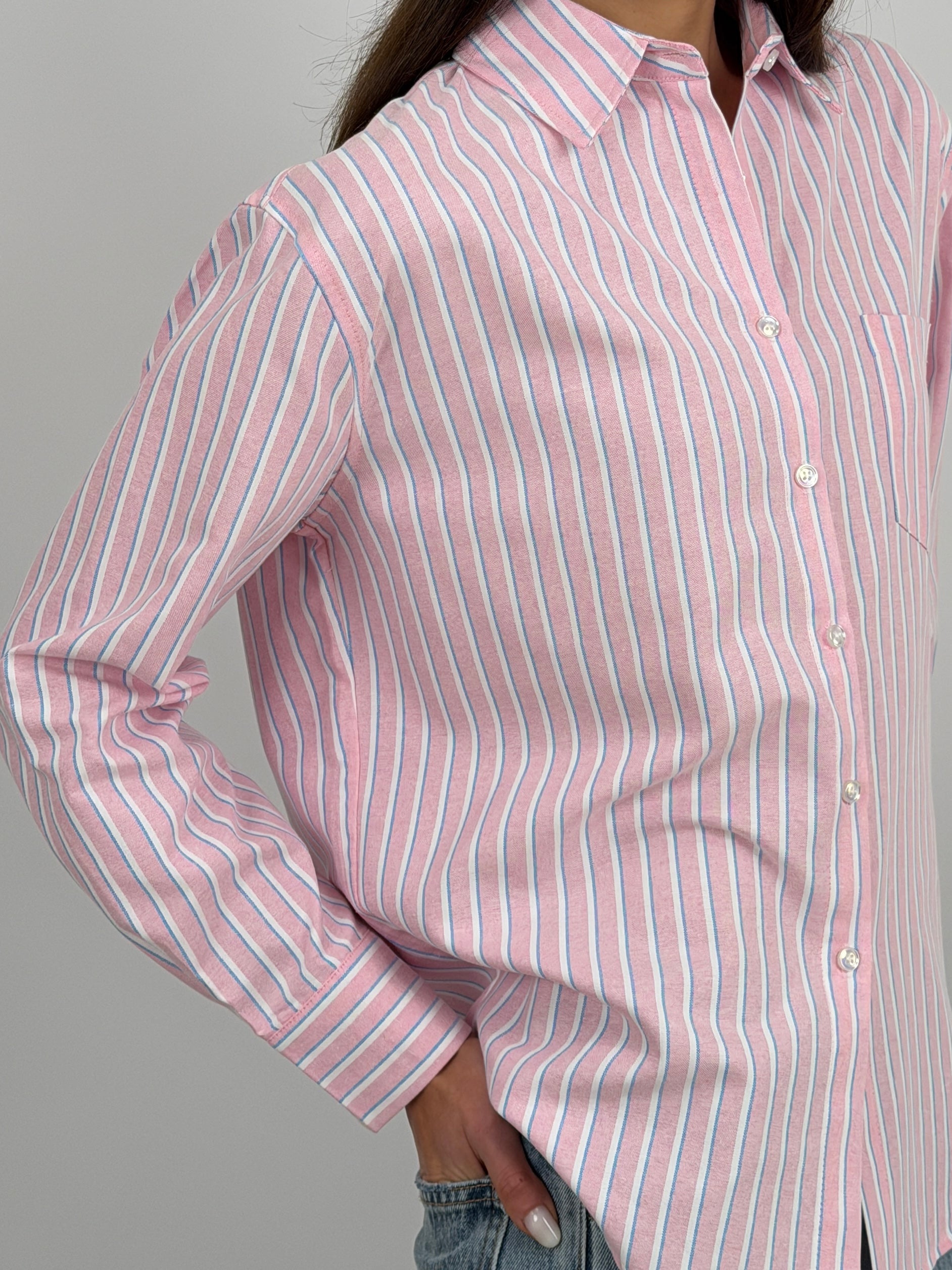 Camicia in cotone a righe rosa con colletto classico e bottoni sul davanti e sui polsi. Maniche lunghe e taschino frontale