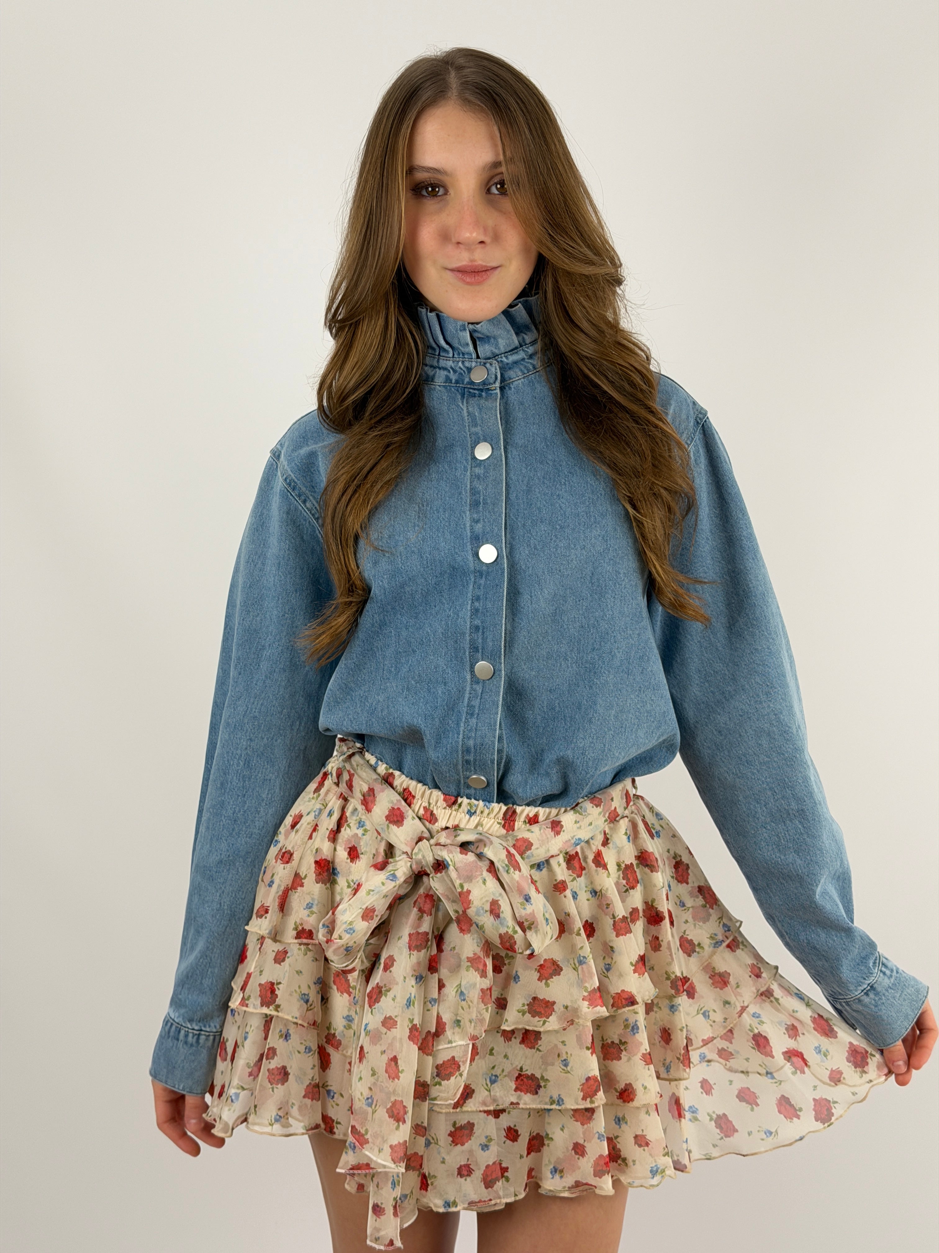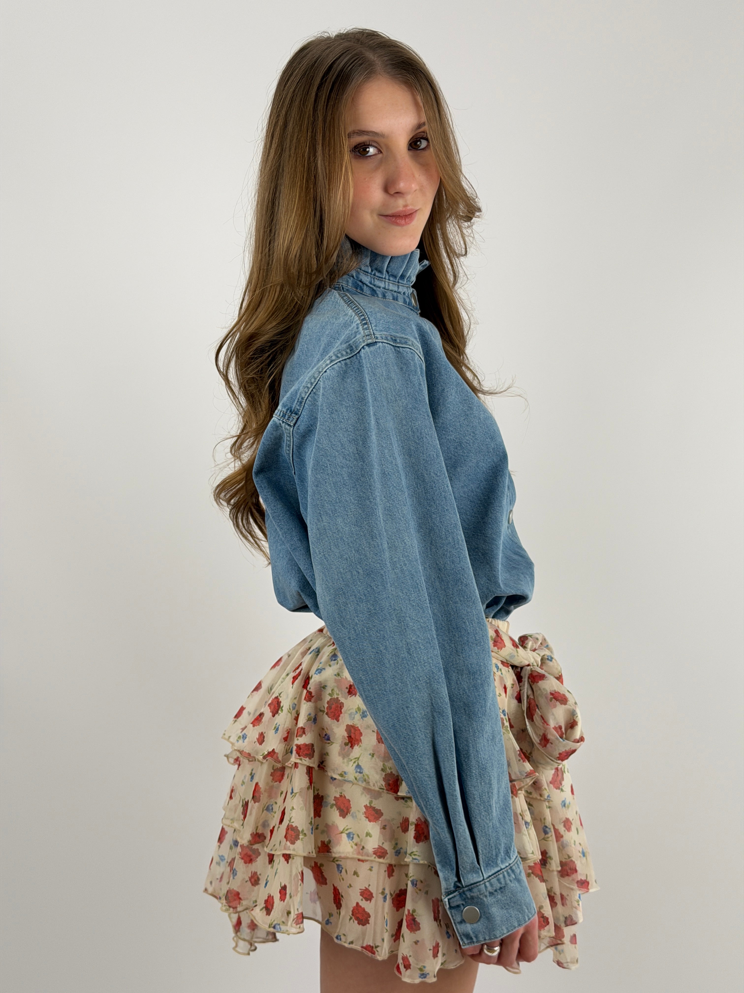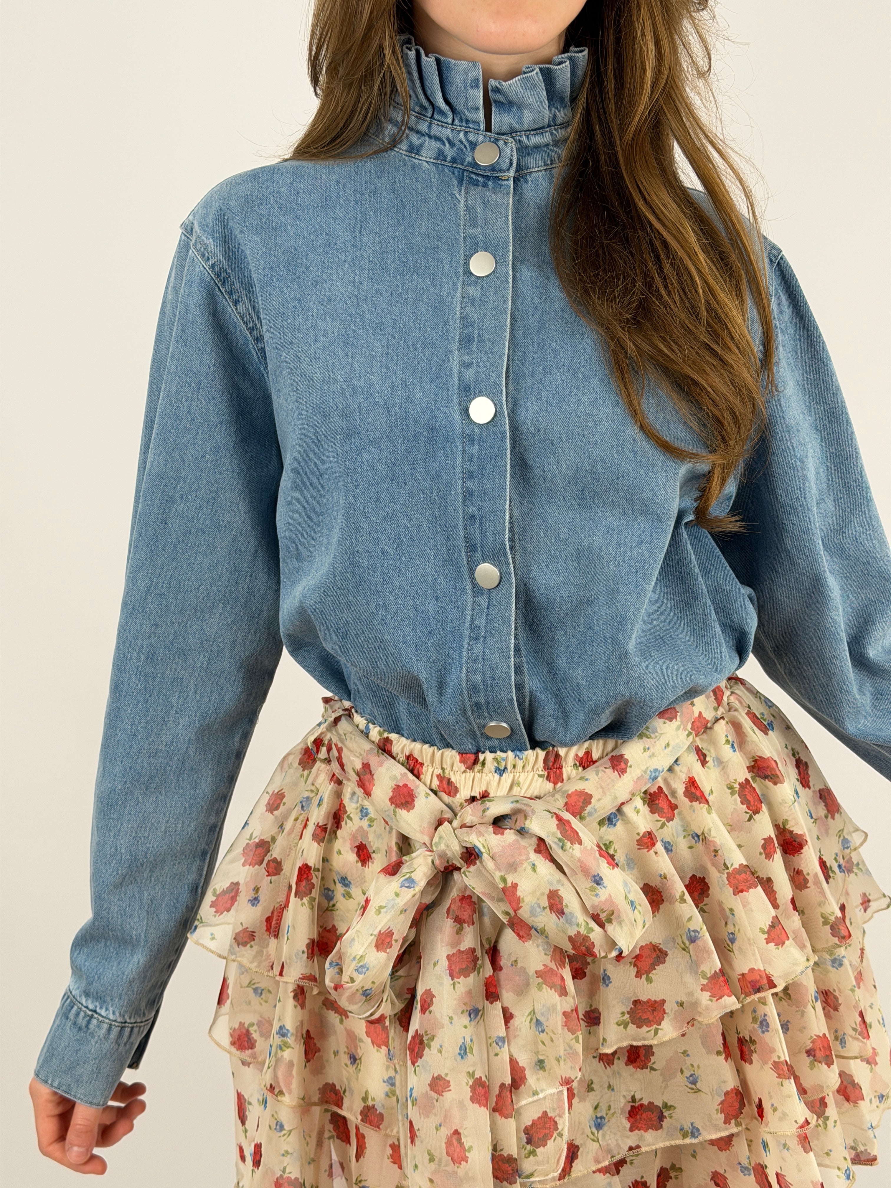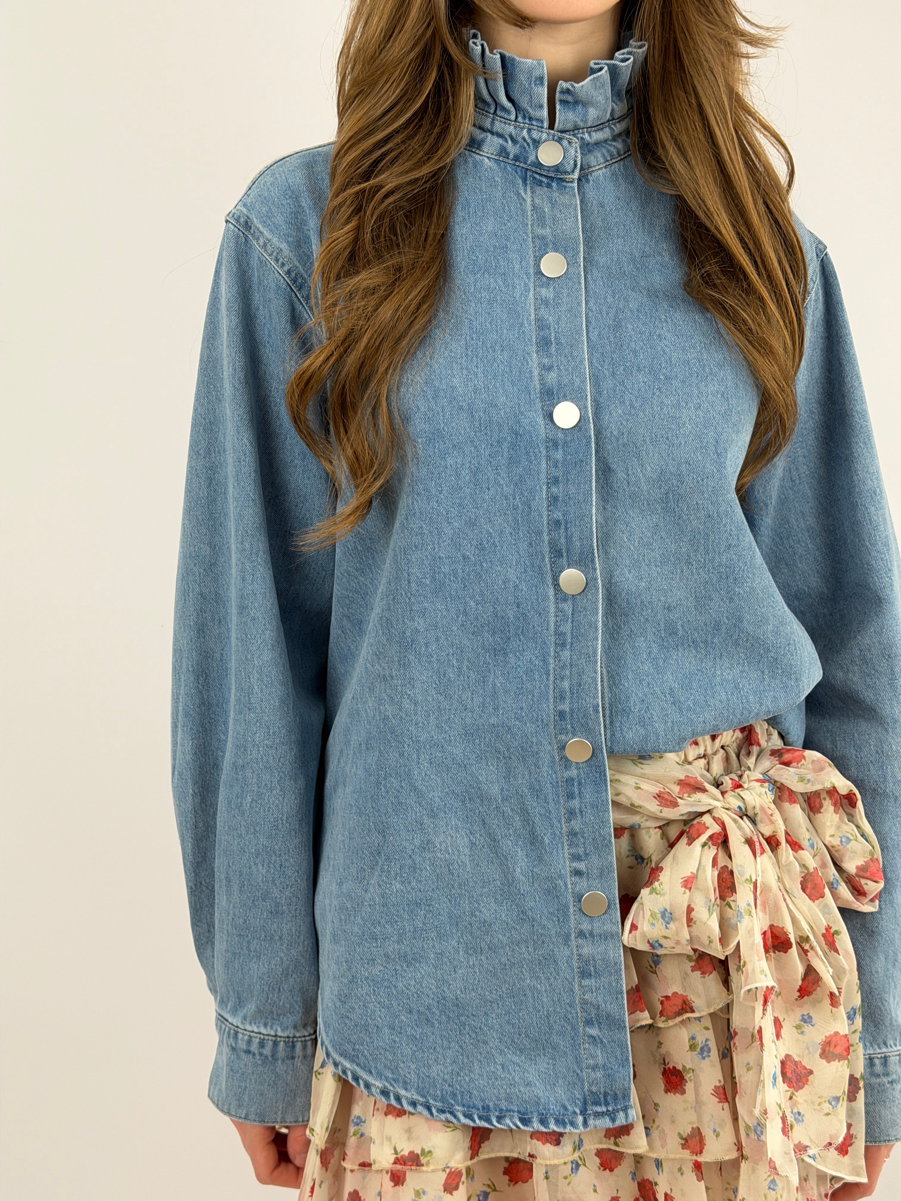 Camicia in denim lavaggio chiaro con colletto con volant e chiusura frontale con bottoni