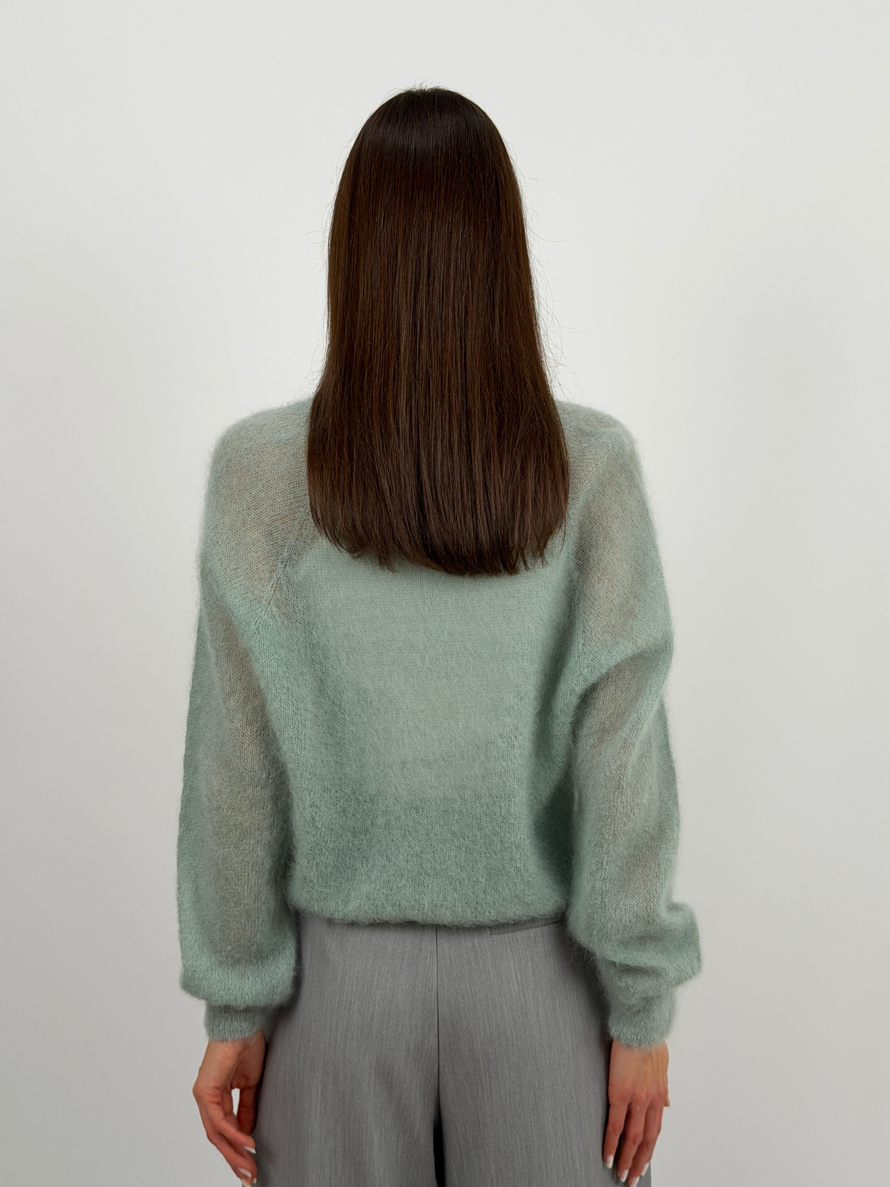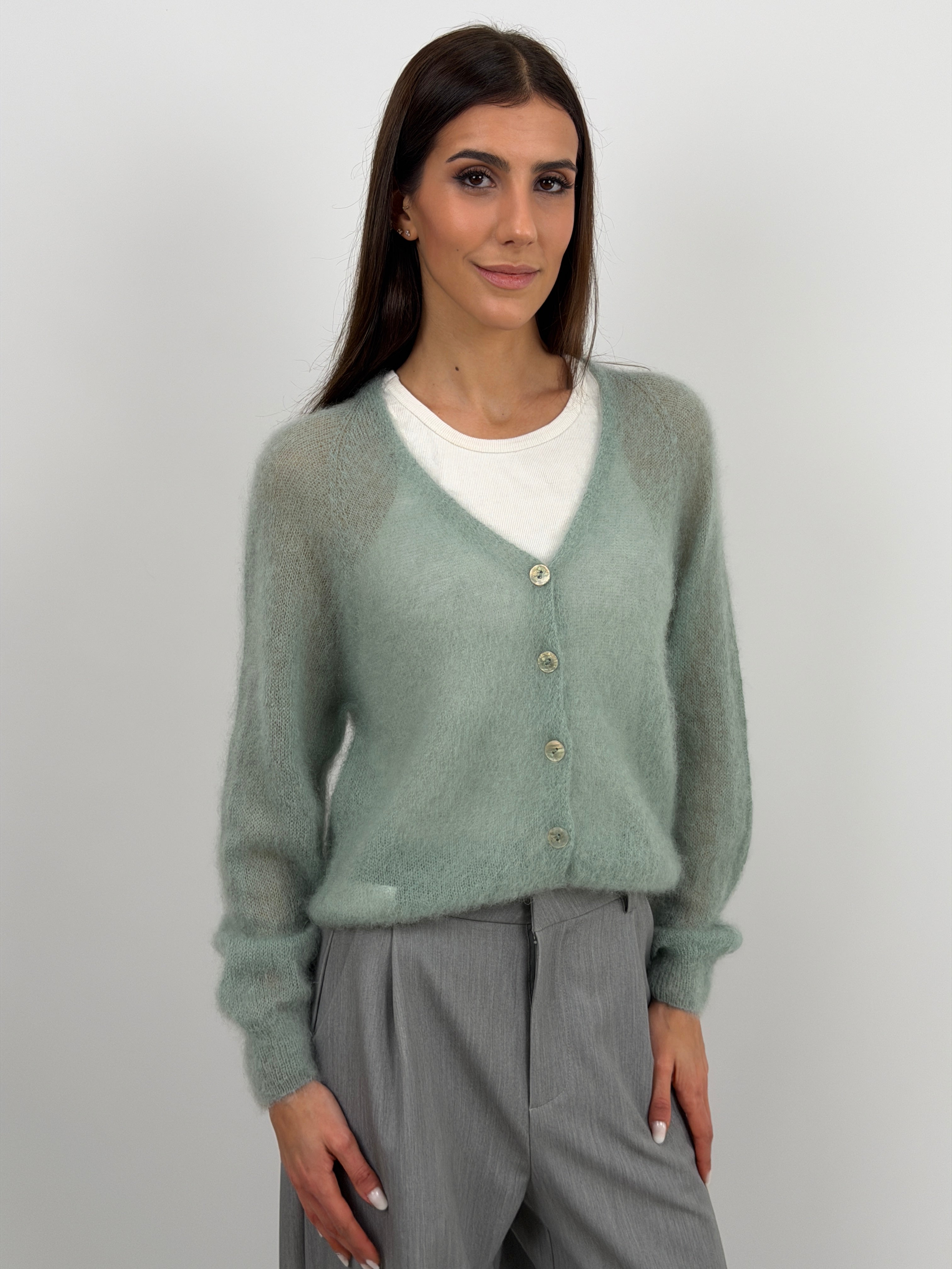 Cardigan verde salvia scollo a V con bottoni. In kid mohair ultra leggero e morbido, non punge sulla pelle