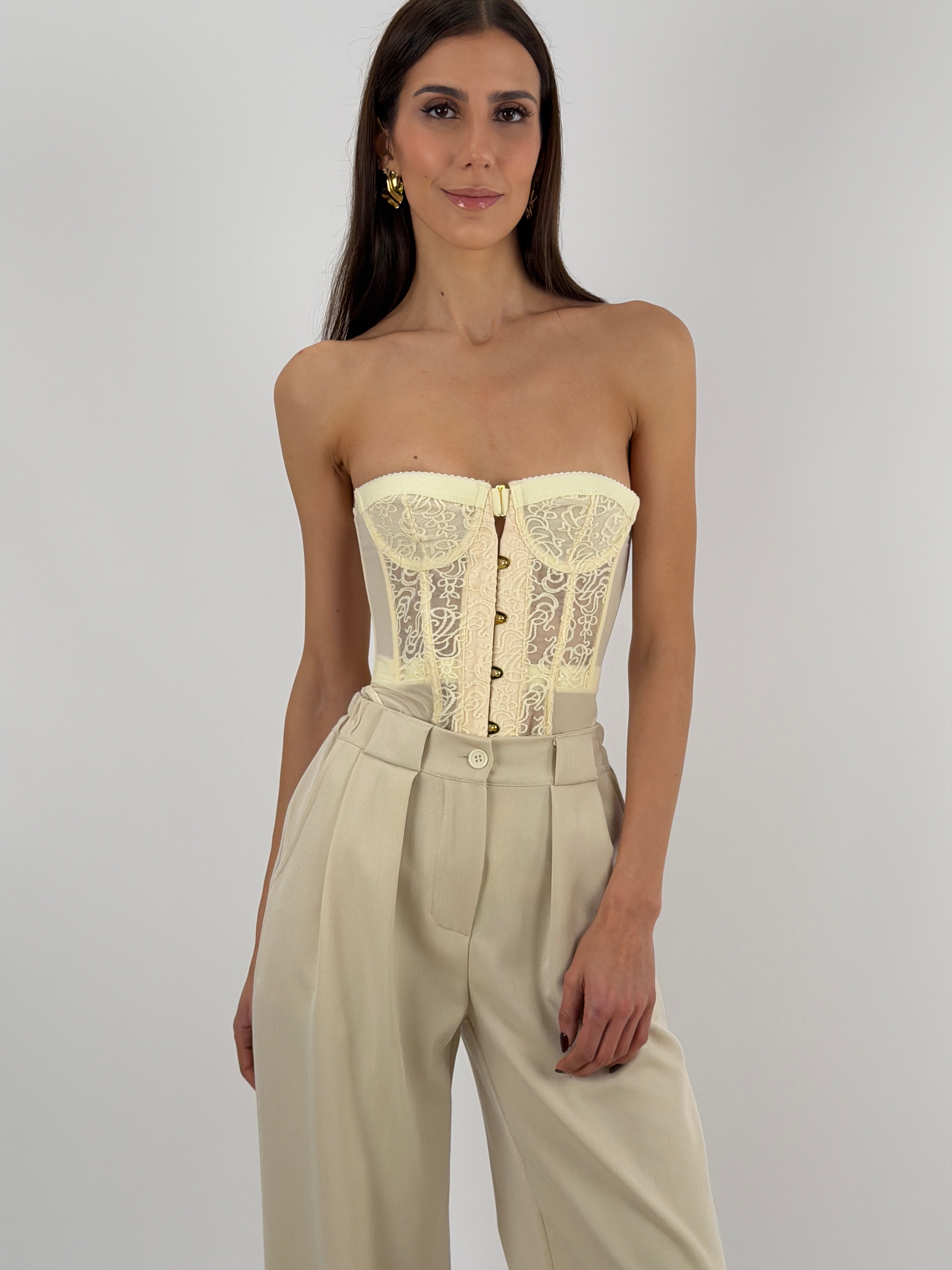 Corsetto crema senza spalline con pizzo e ricami, chiusura frontale con gancetti e lacci intrecciati sul retro