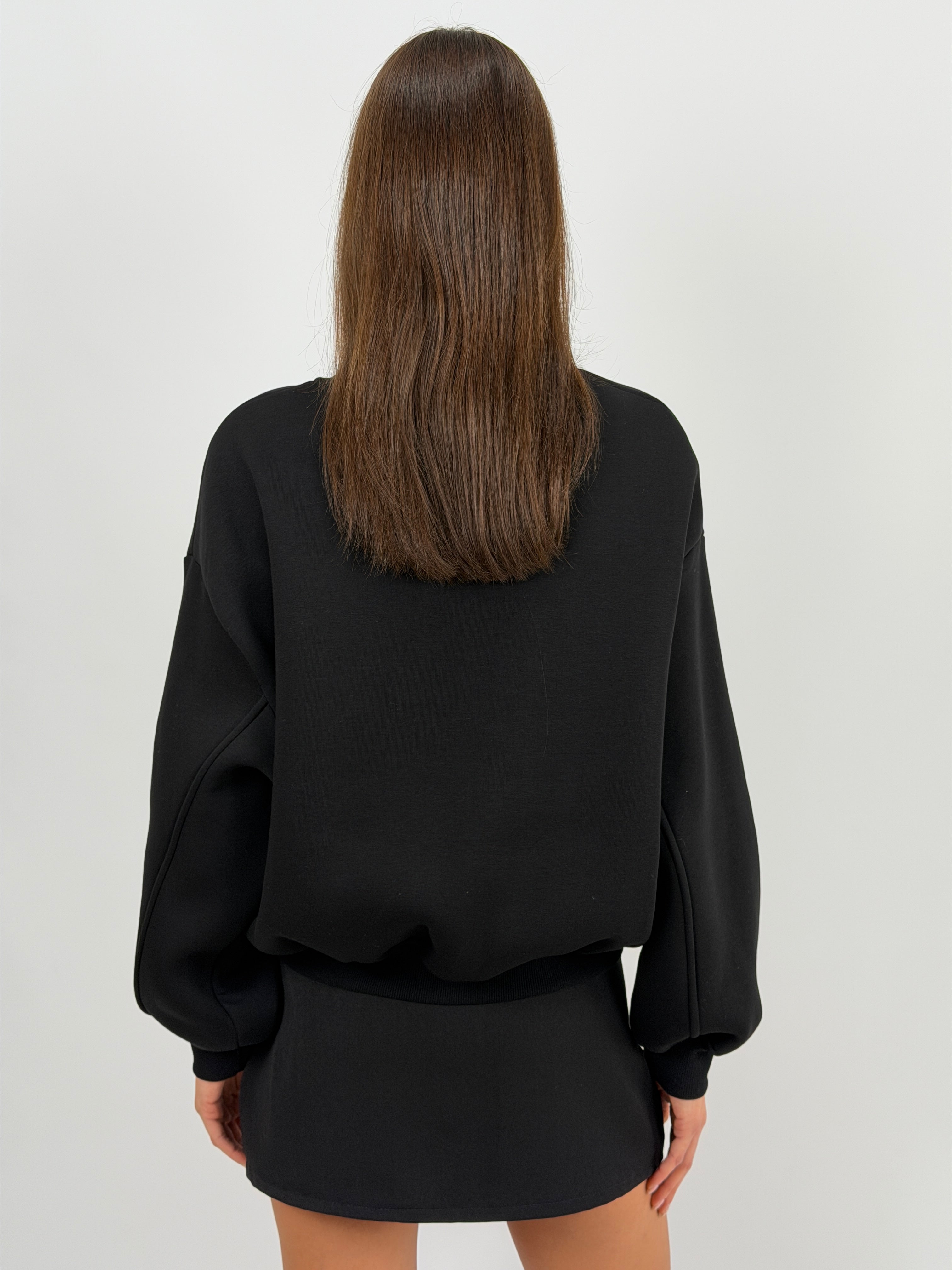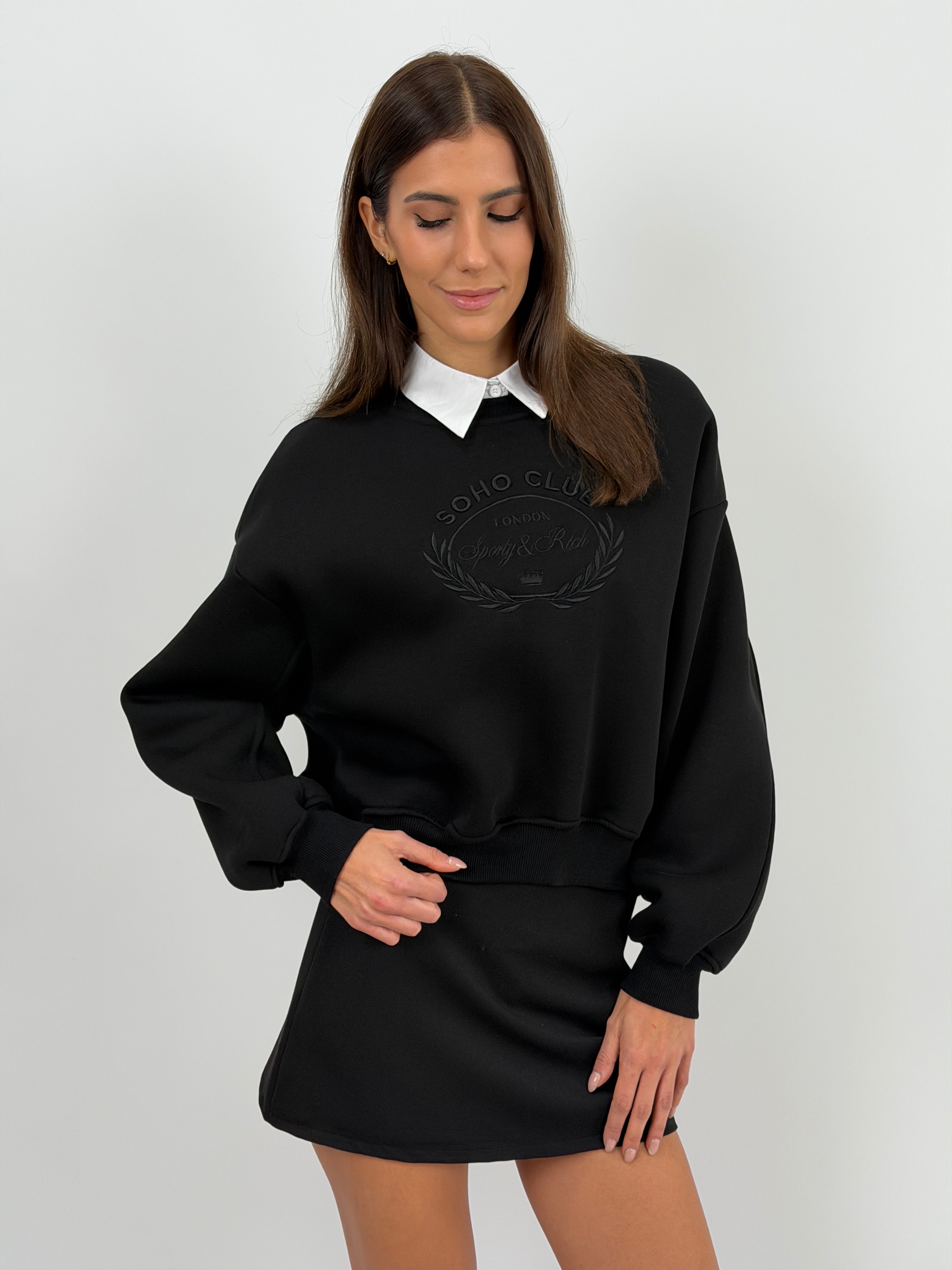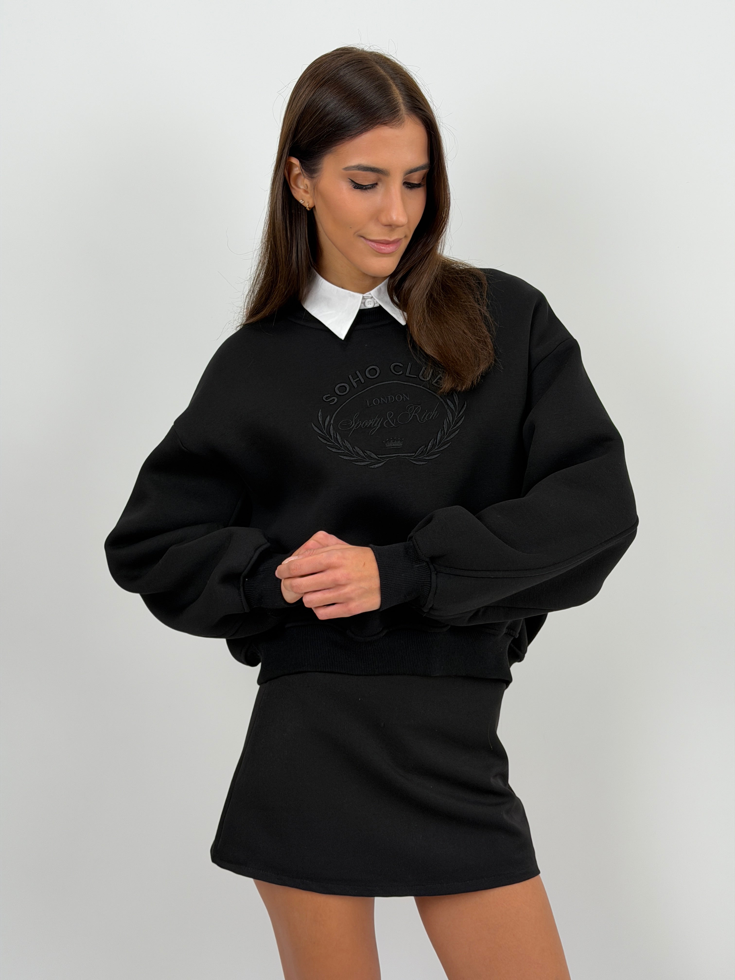 Felpa Lumina nera a girocollo con finiture a costine e ricamo frontale tono su tono