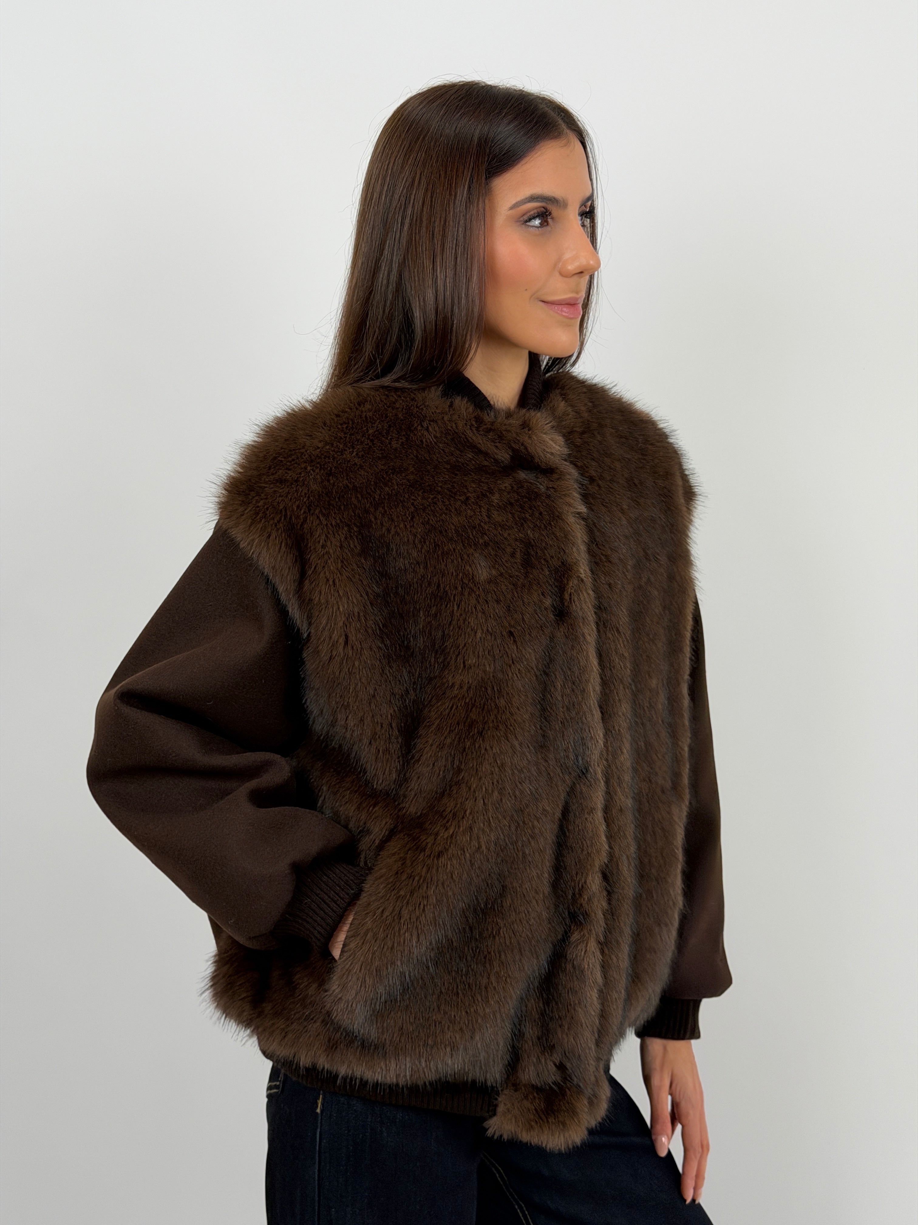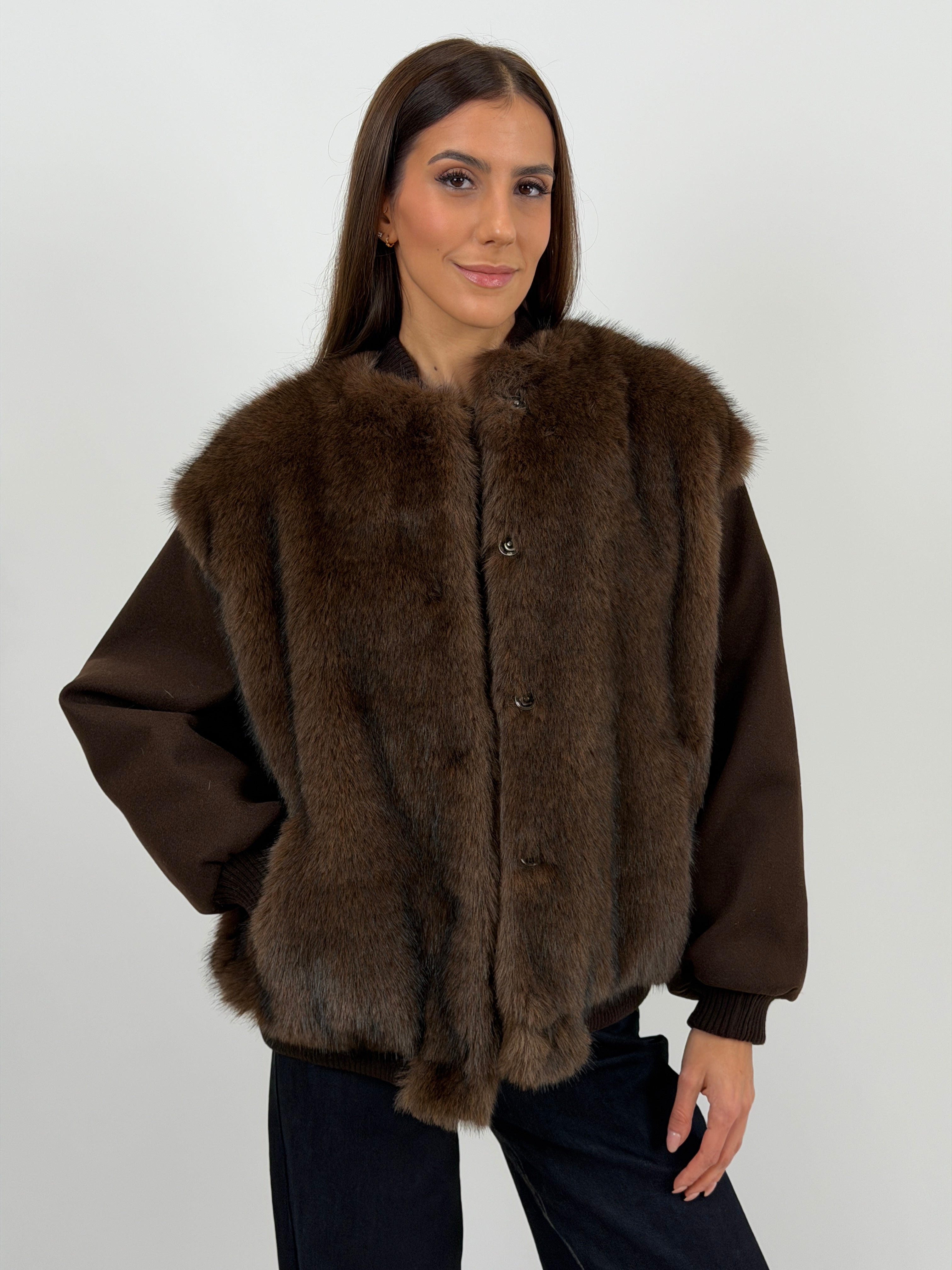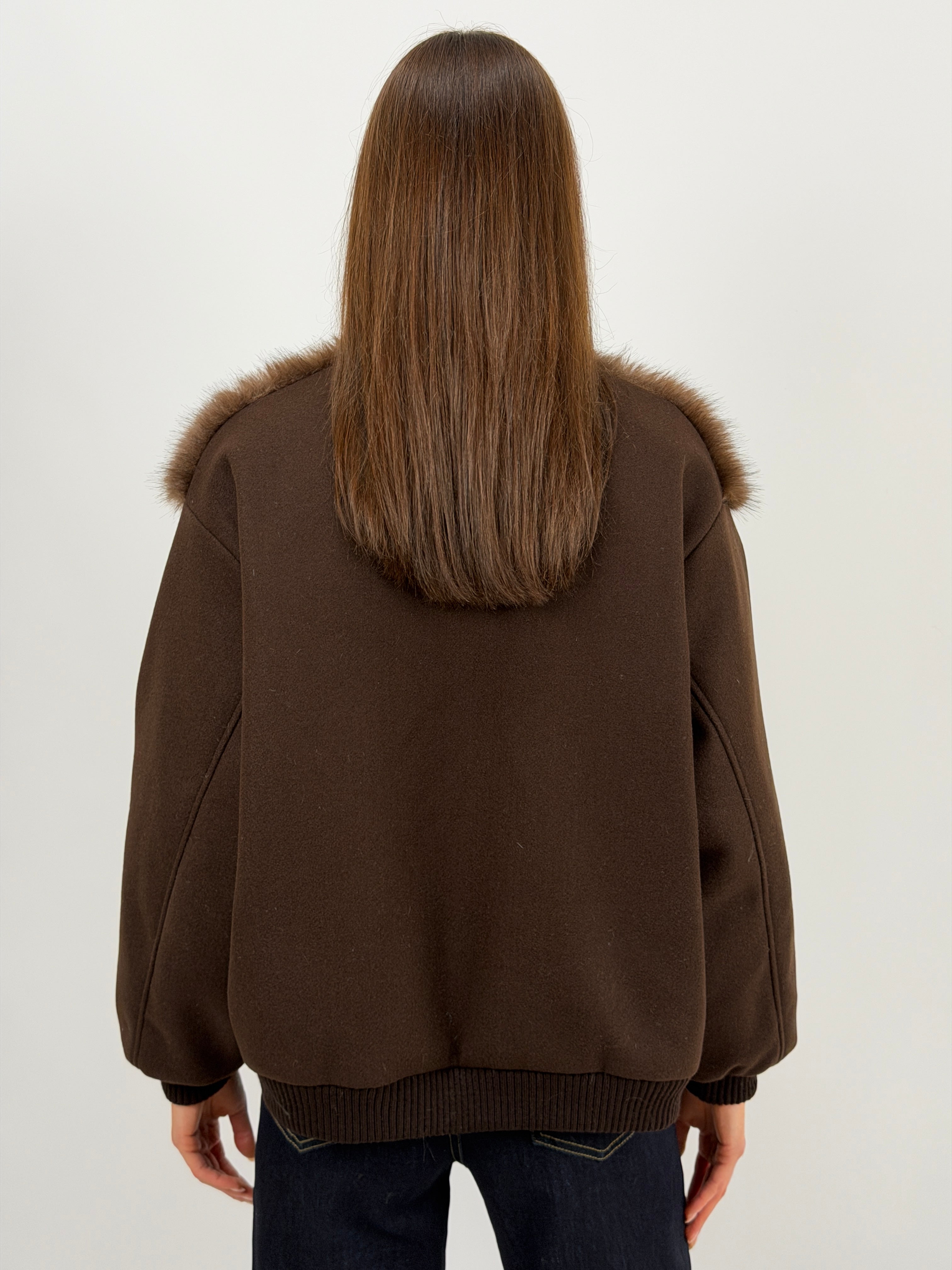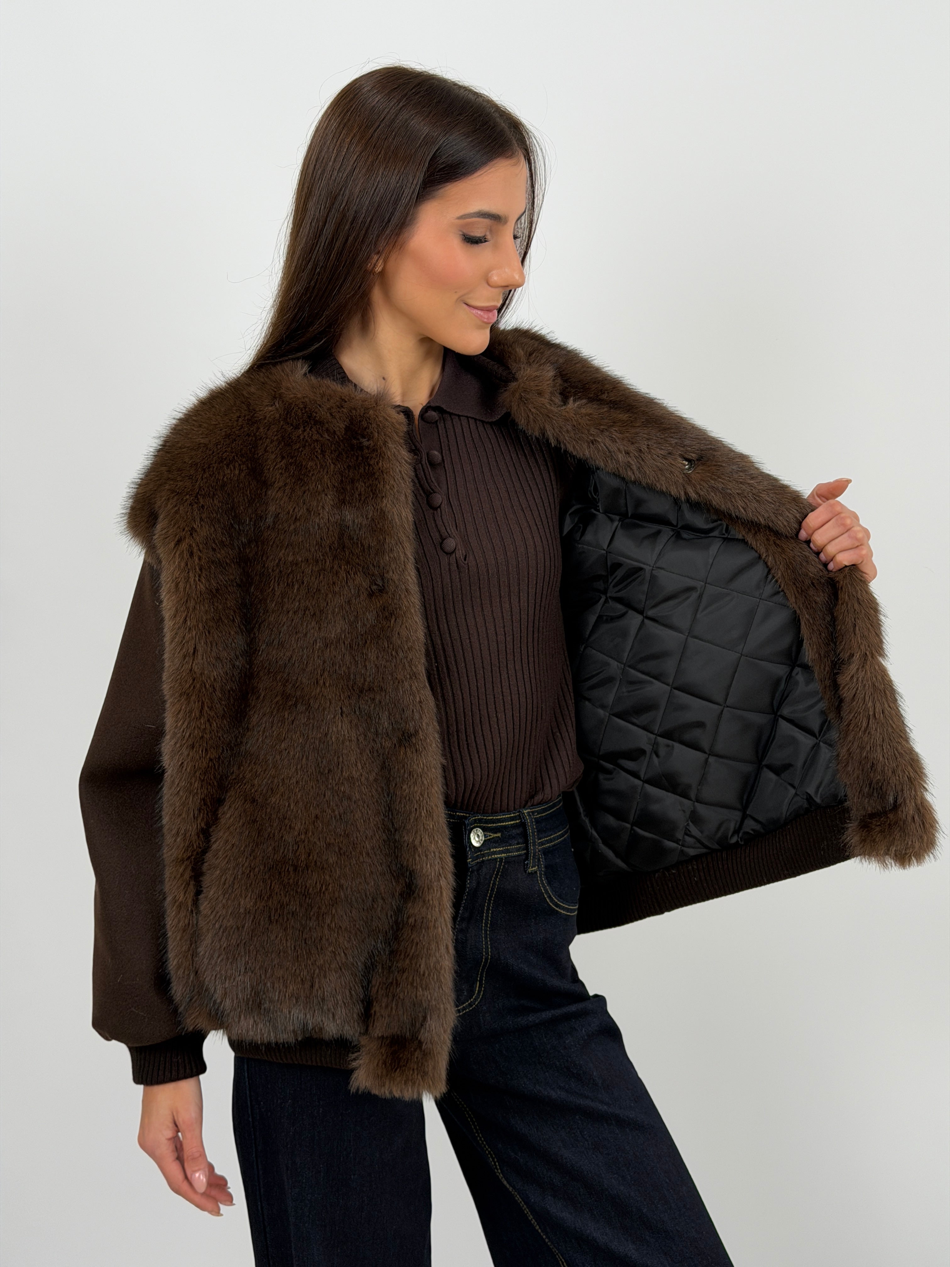 Giacca marrone in panno con finiture elasticizzate e pelliccia, rifinita con interno imbottito e trapuntato.