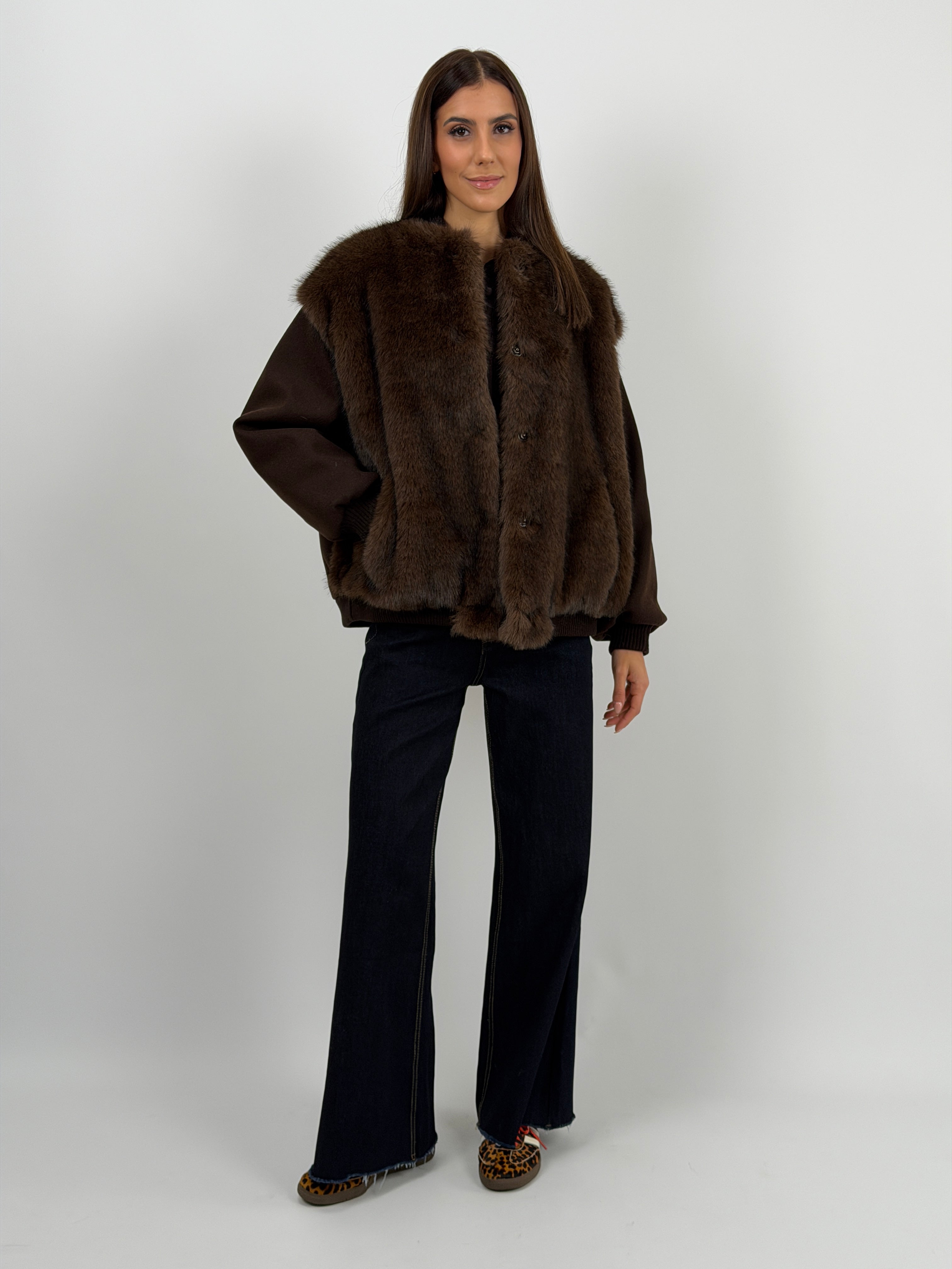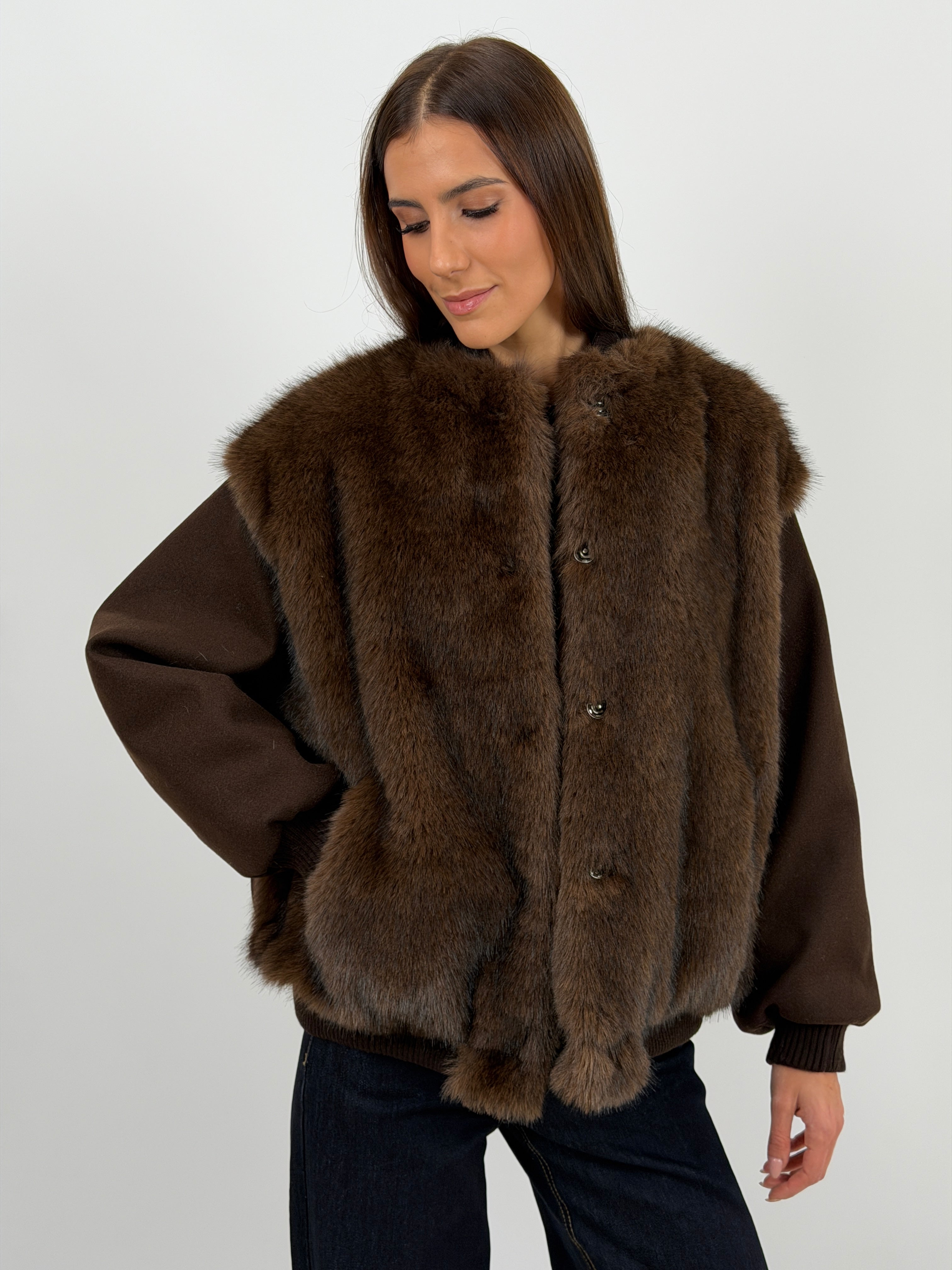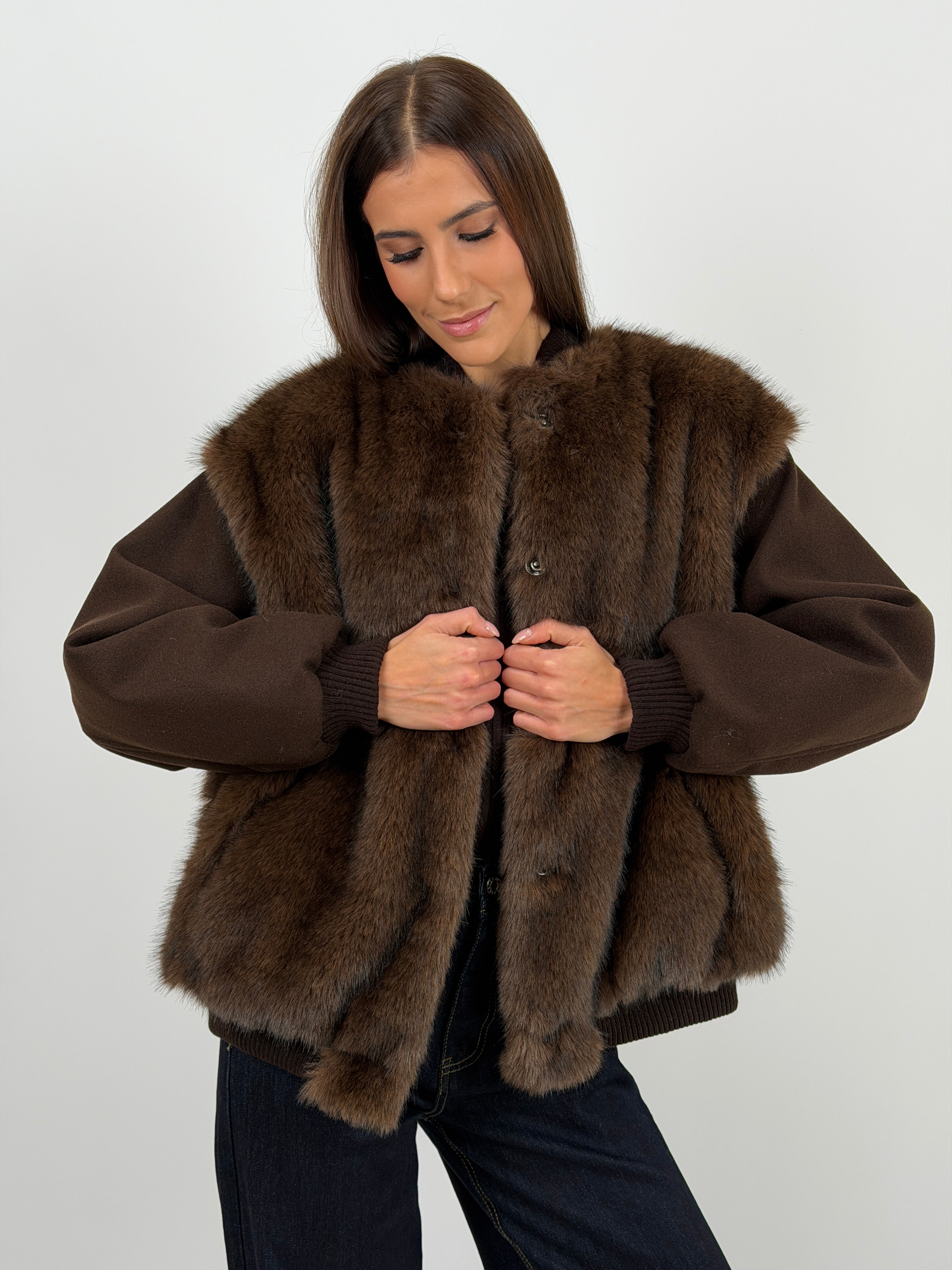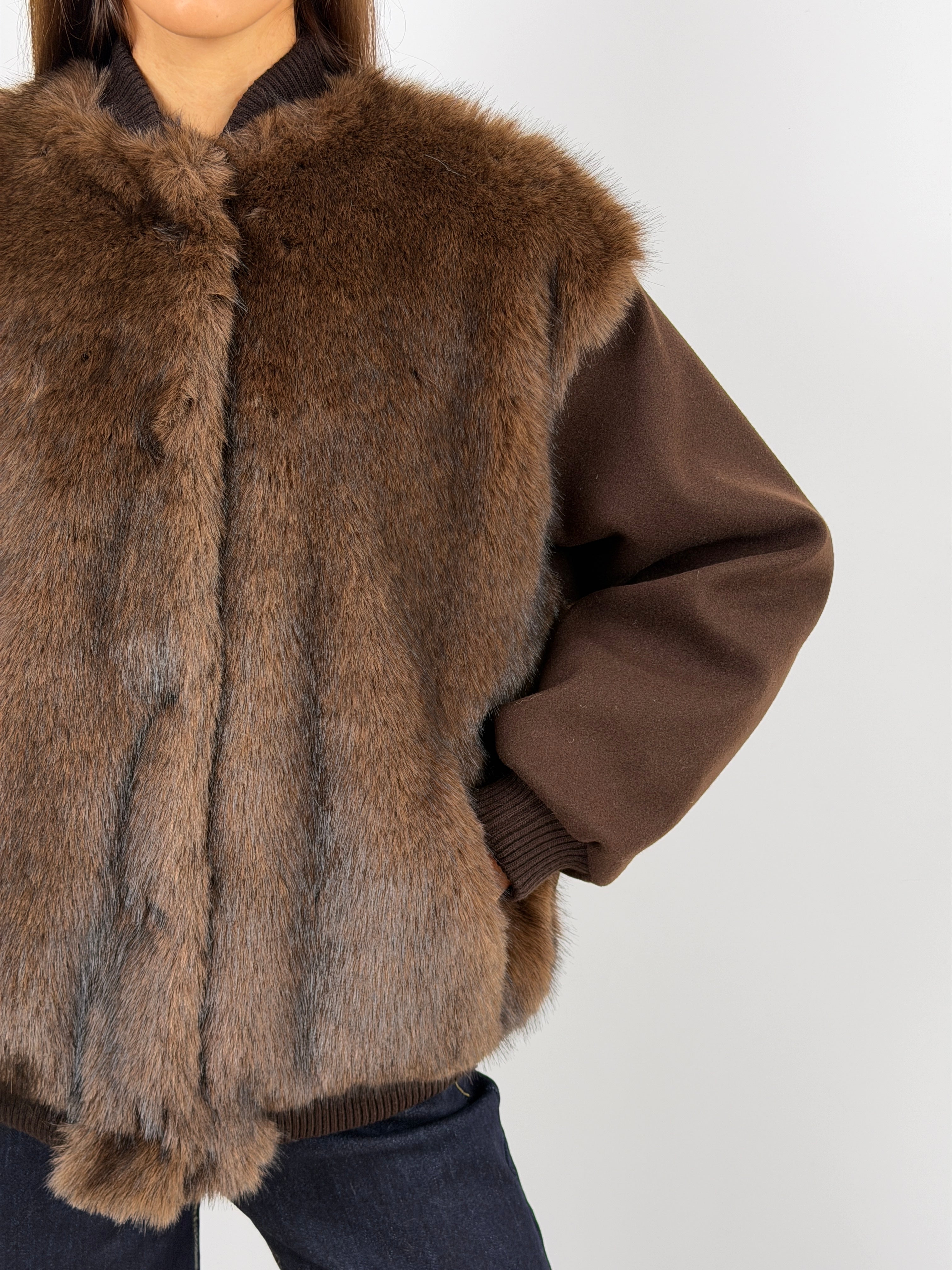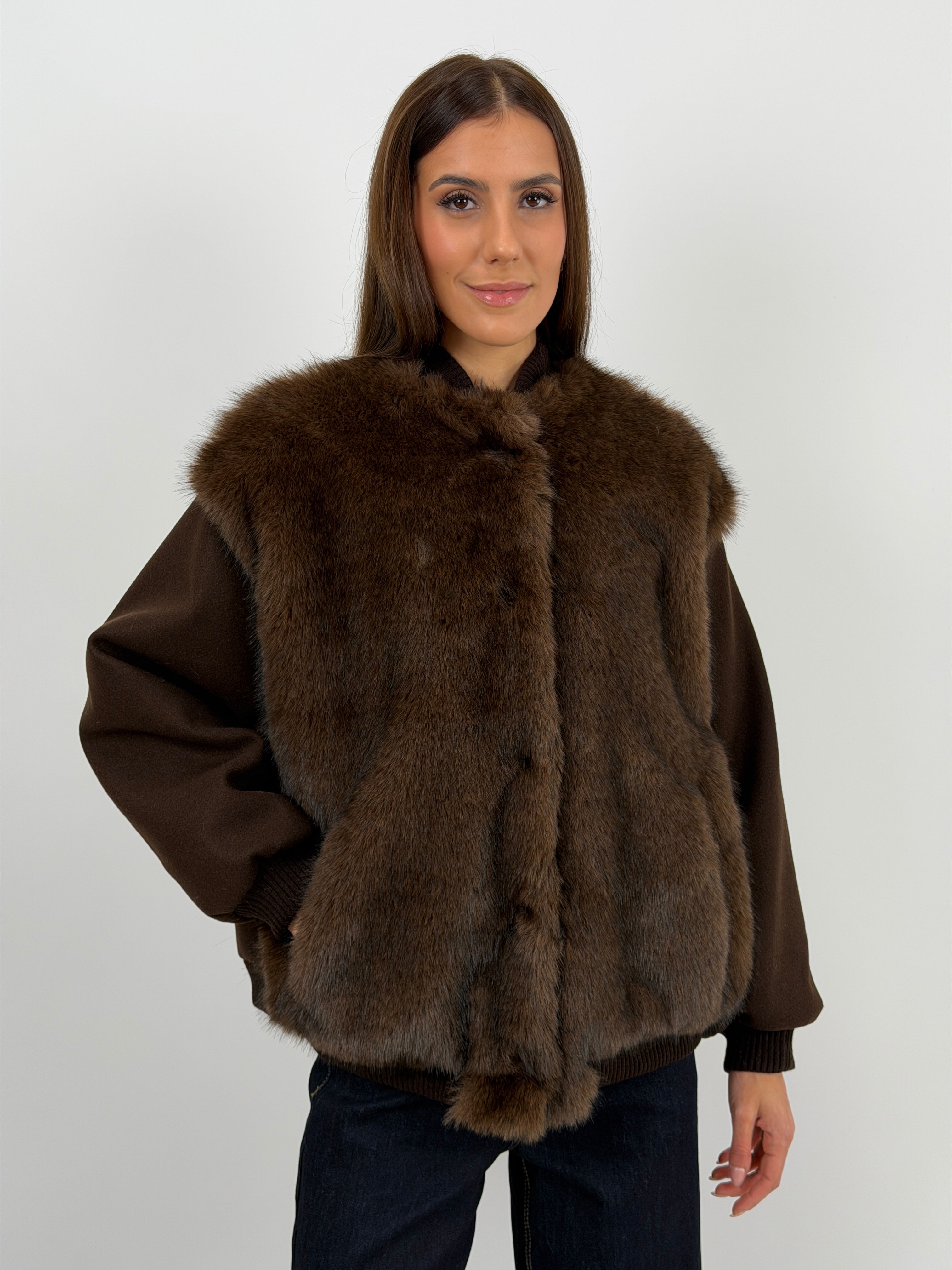 Giacca marrone in panno con finiture elasticizzate e pelliccia, rifinita con interno imbottito e trapuntato.