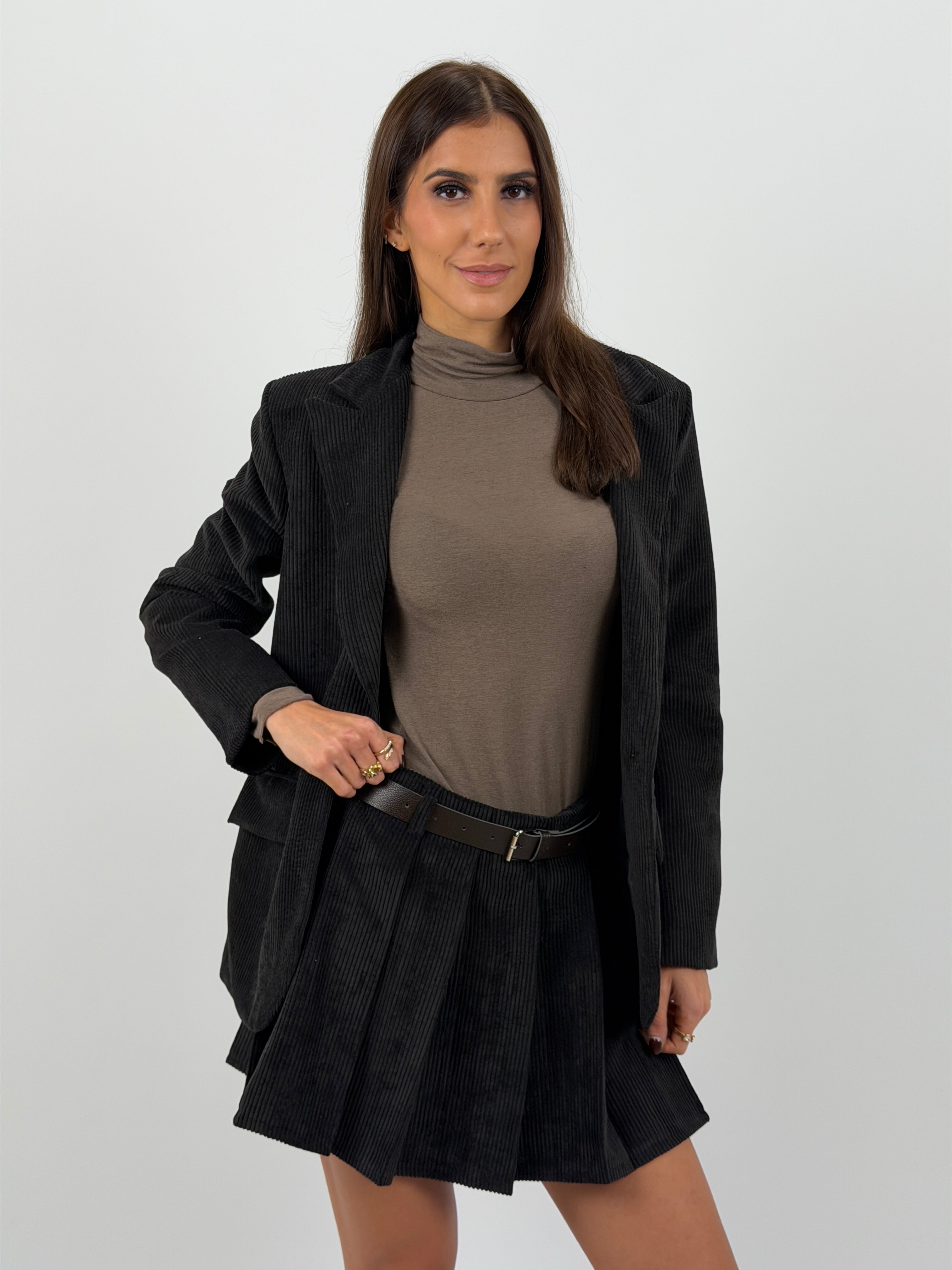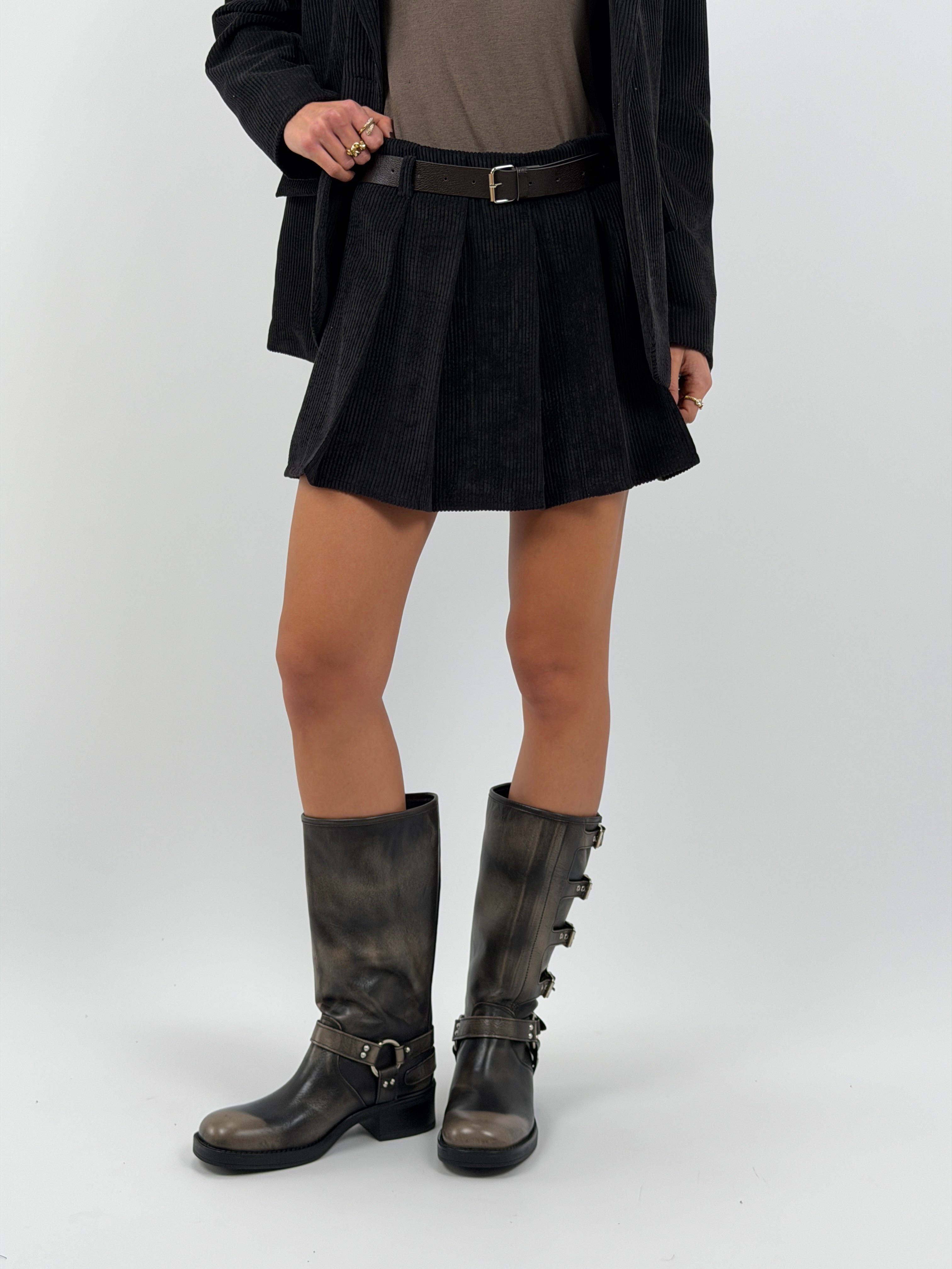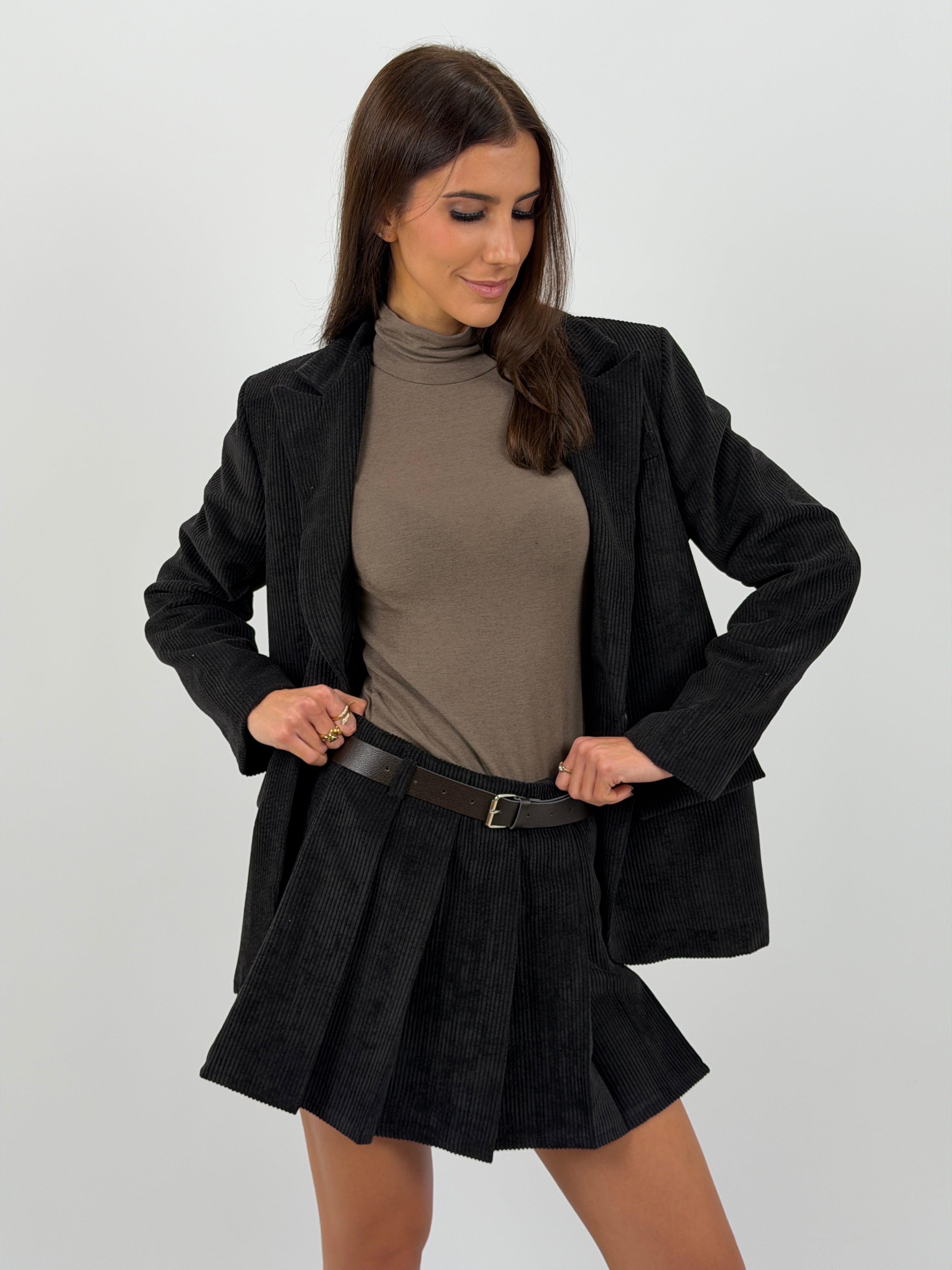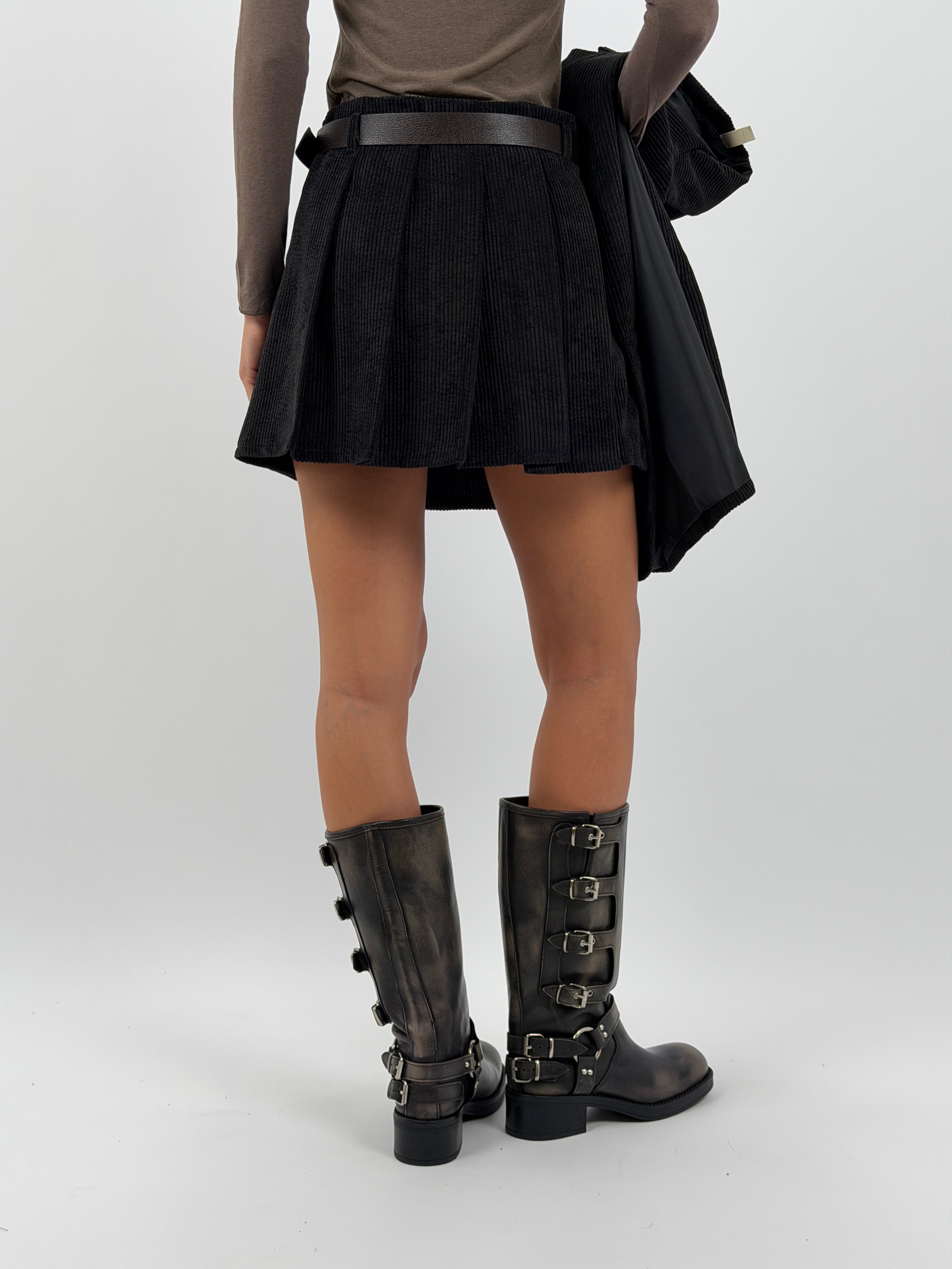 Gonna corta a pieghe nera in velluto a coste con cintura coordinata e chiusura laterale con zip.