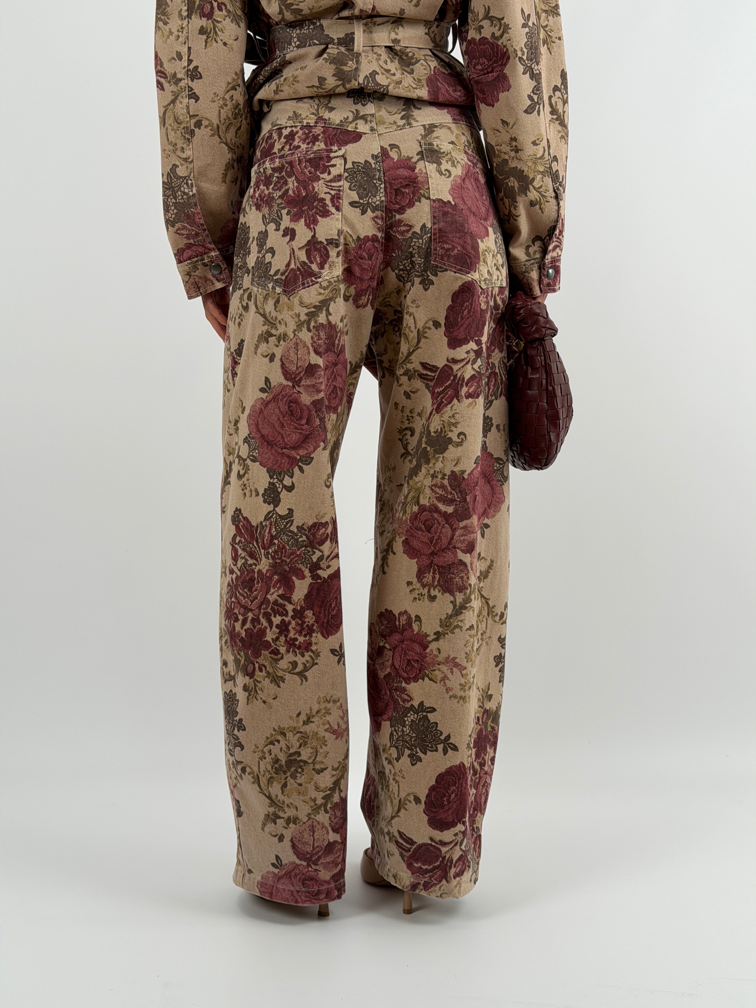 Jeans Lumina modello wide leg color rosa antico in fantasia floreale, con chiusura frontale incrociata con zip e bottone e cinque tasche