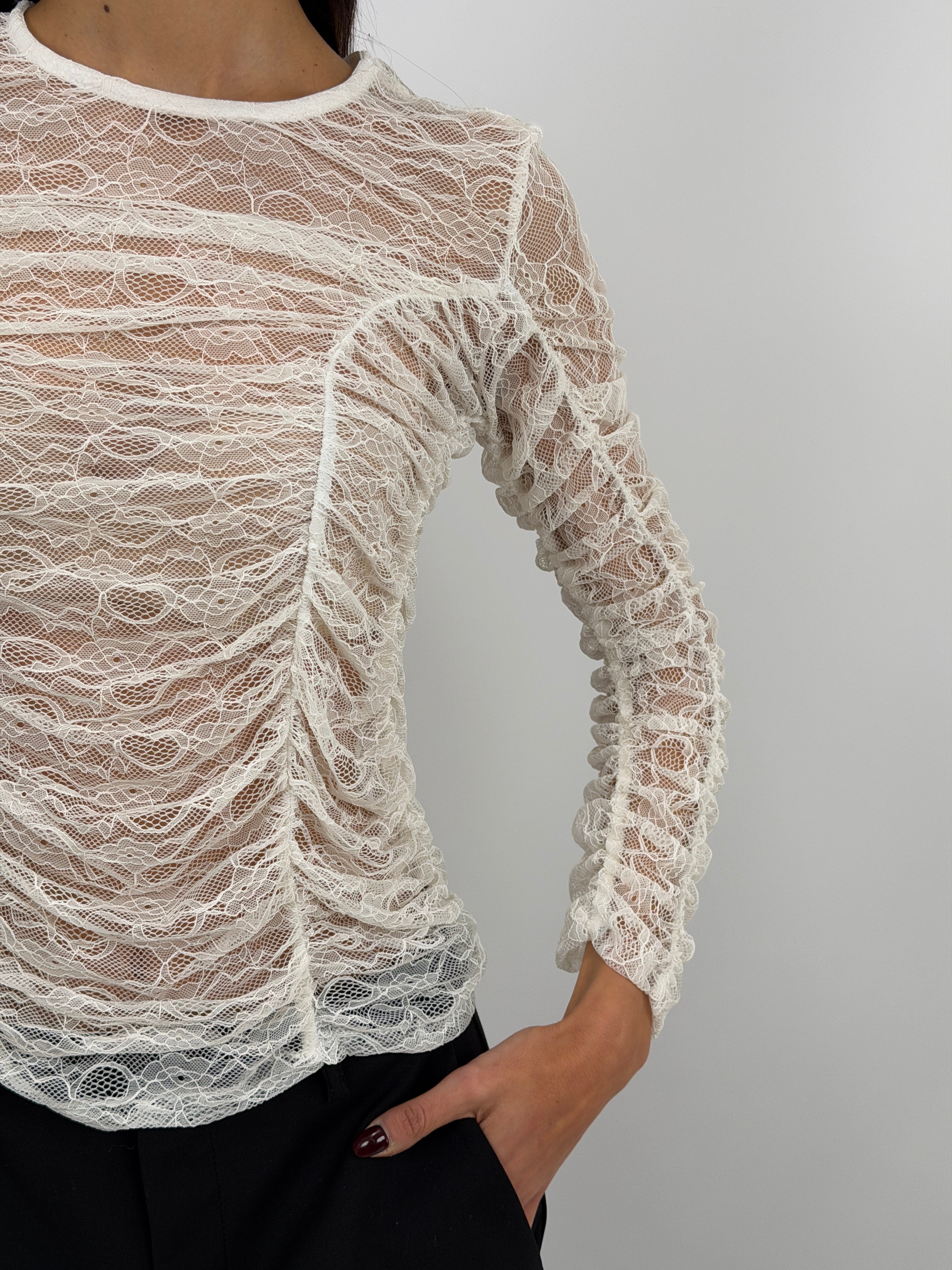 Maglia bianca in pizzo con girocollo, maniche a tre quarti e arricciature su maniche e fianchi