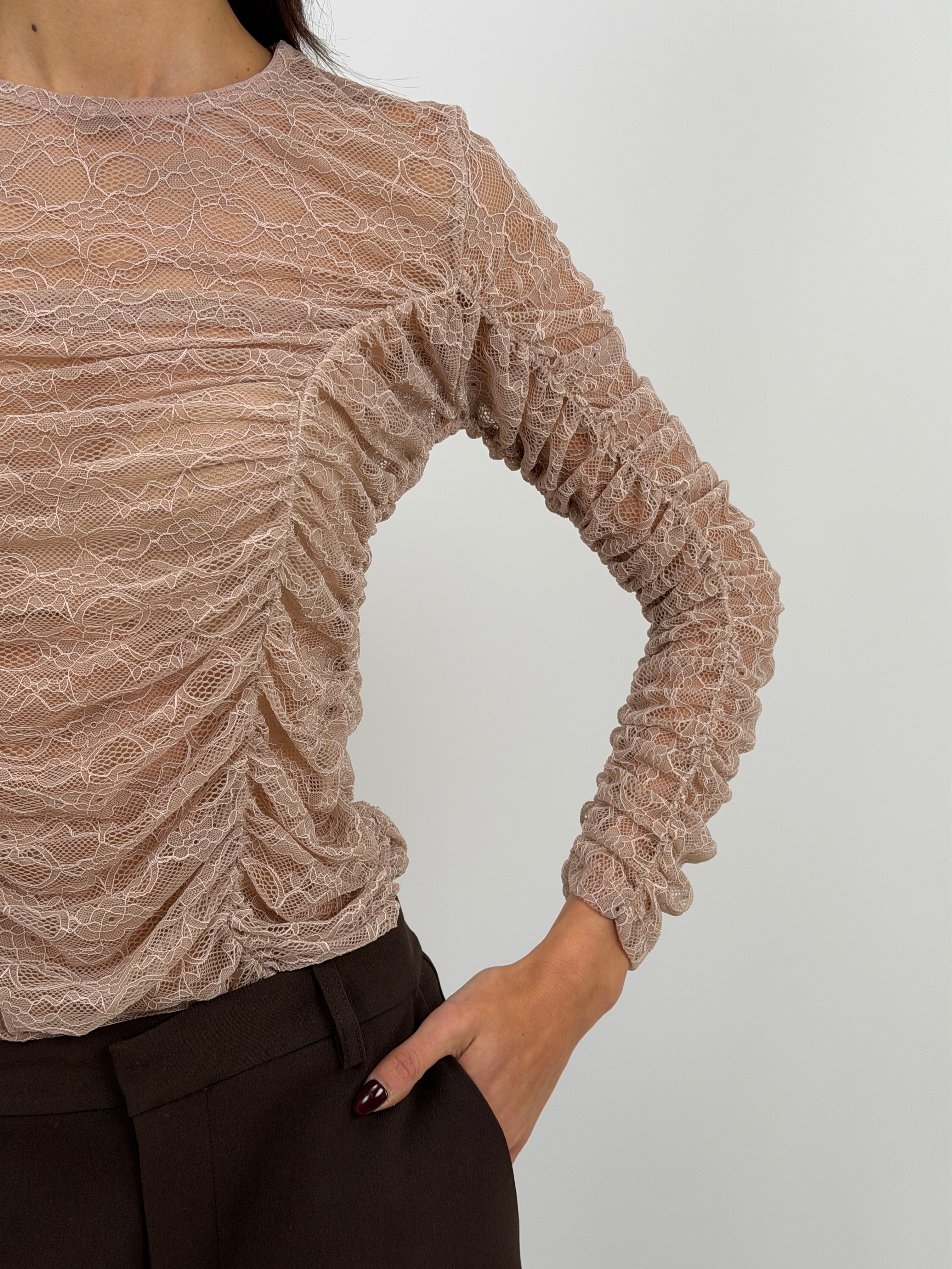 Maglia rosa cipria in pizzo con girocollo, maniche a tre quarti e arricciature su maniche e fianchi