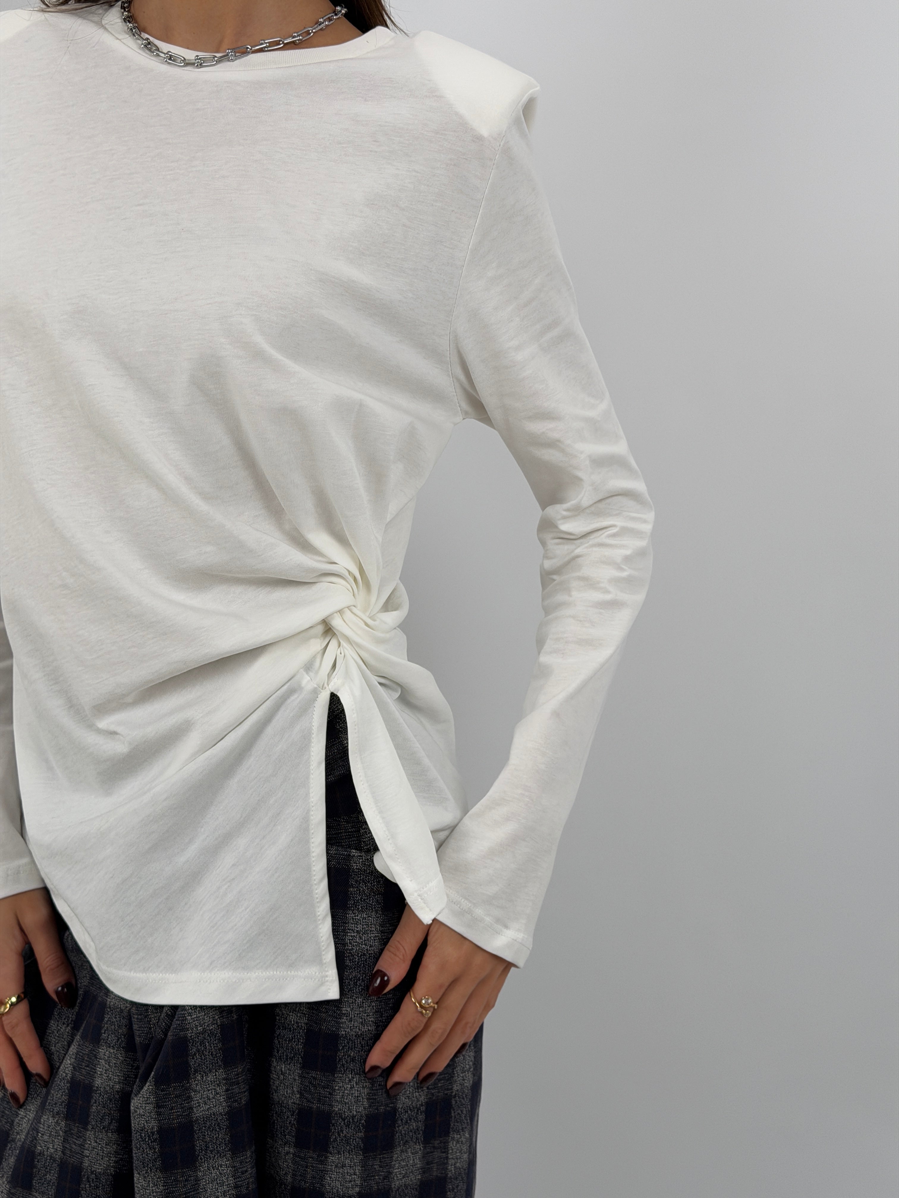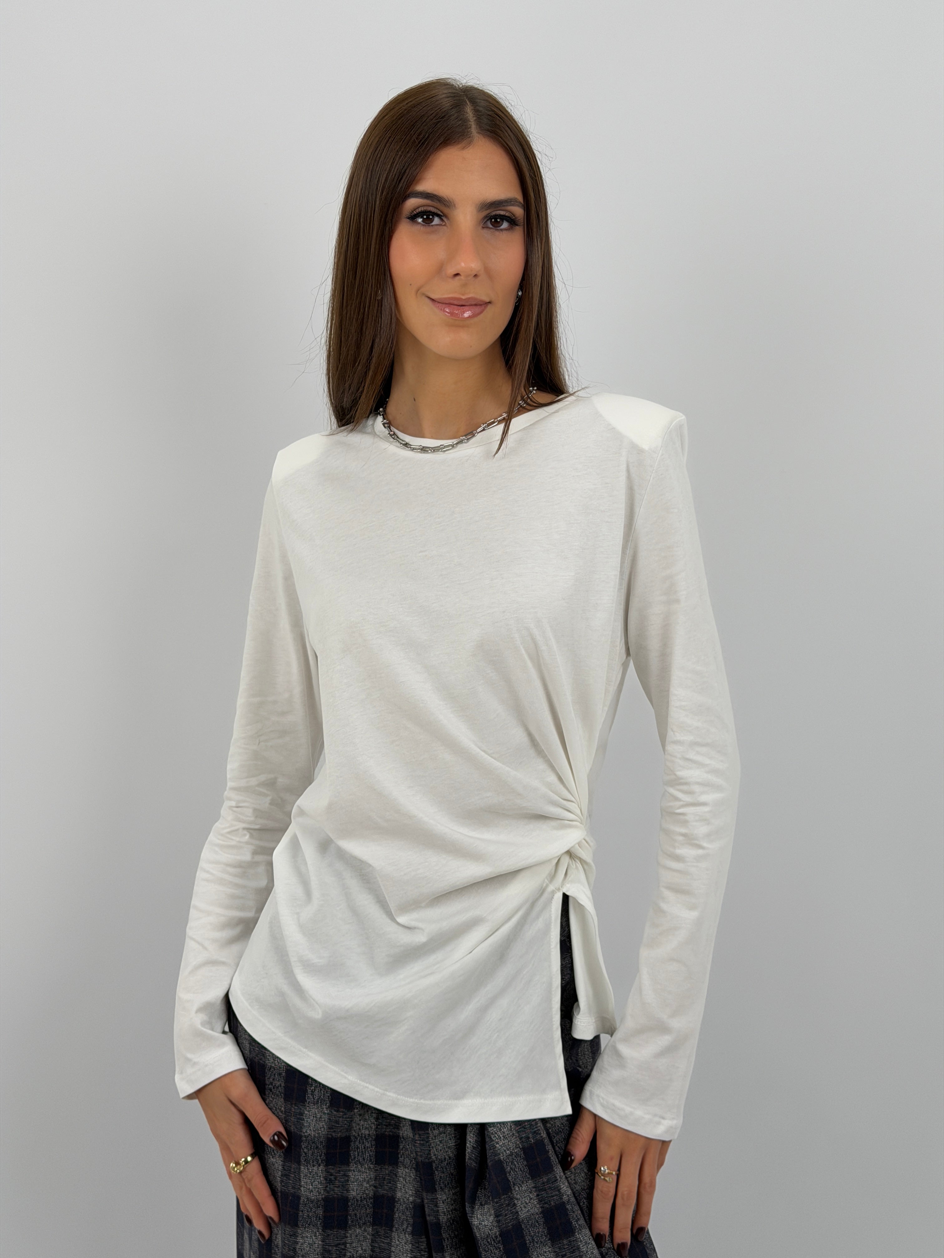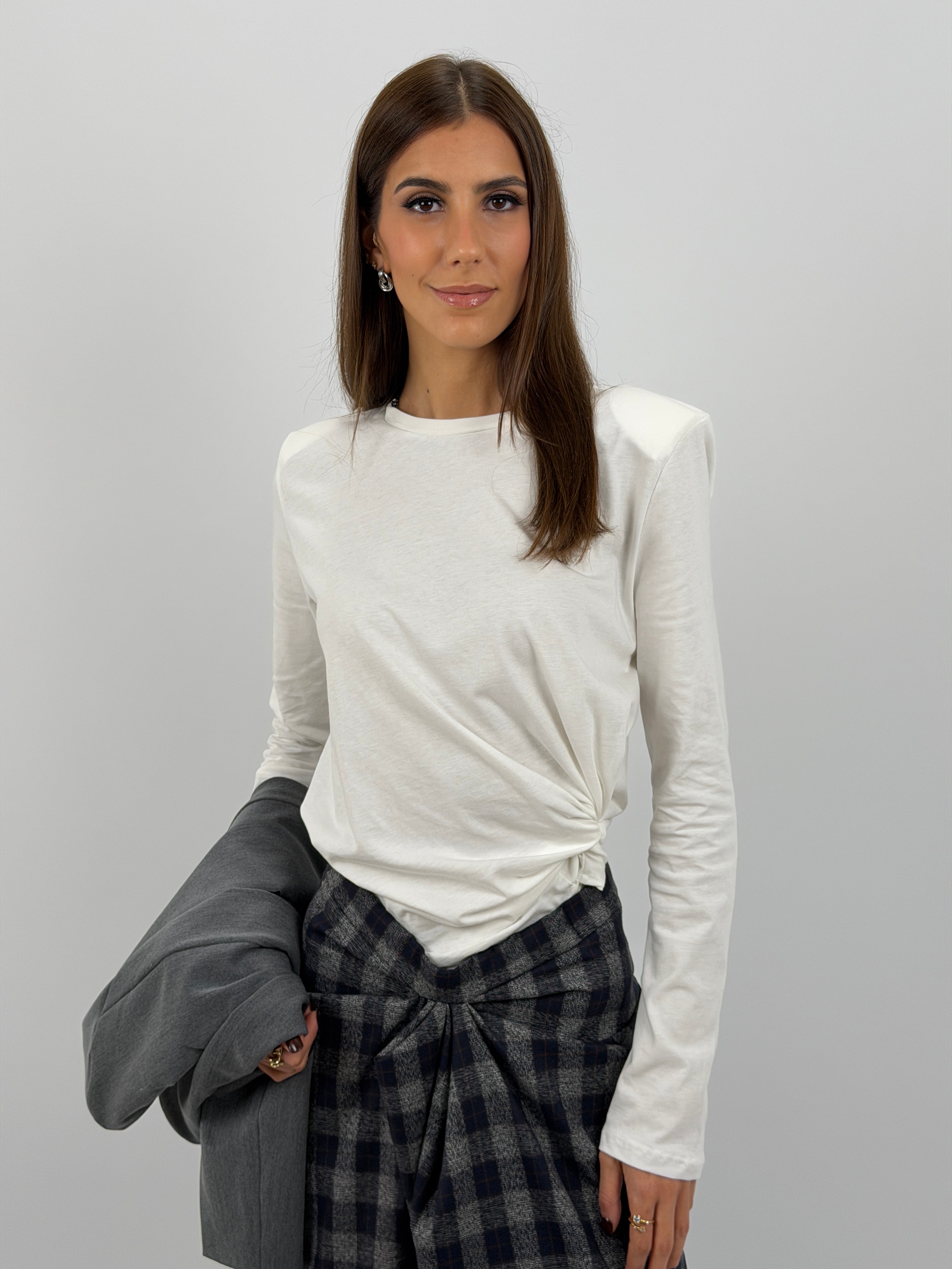 Maglia bianca Lumina in cotone a maniche lunghe con girocollo, spalline imbottite e arricciatura frontale.