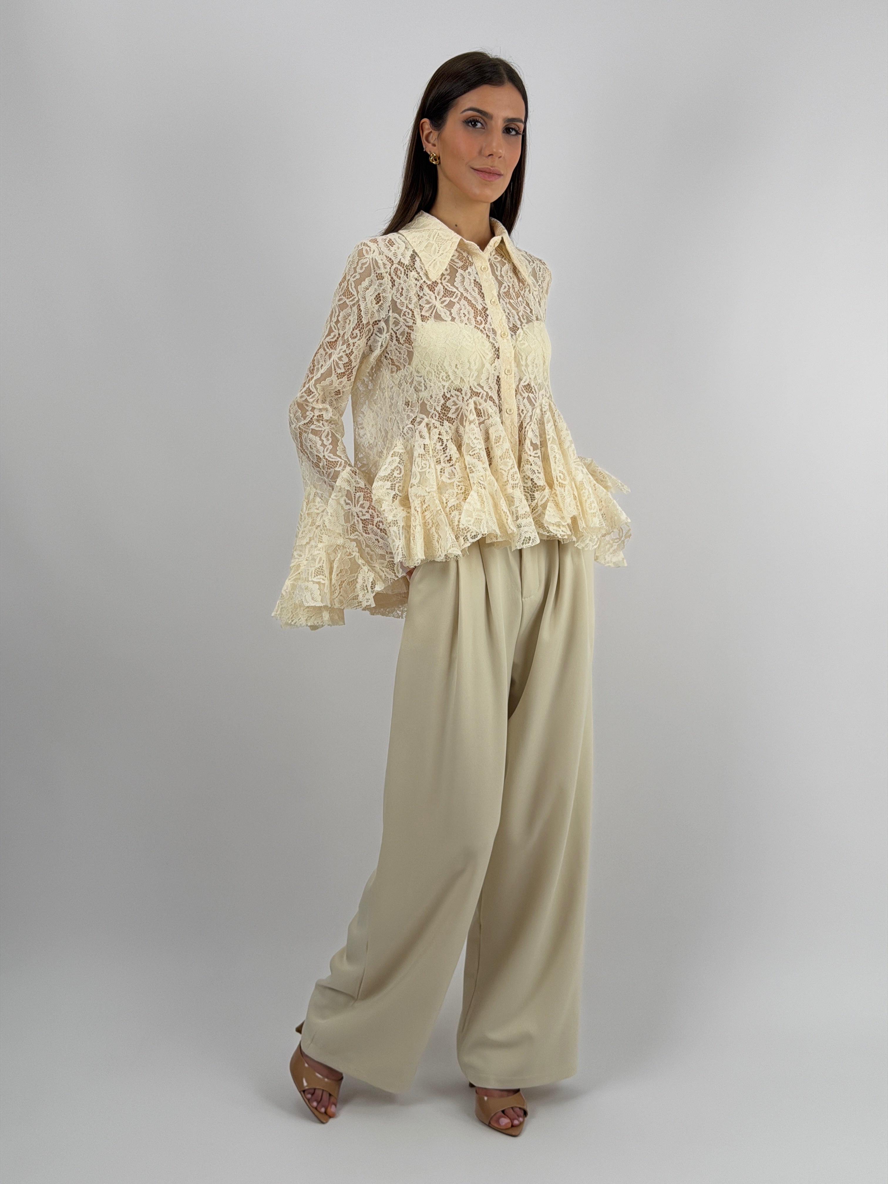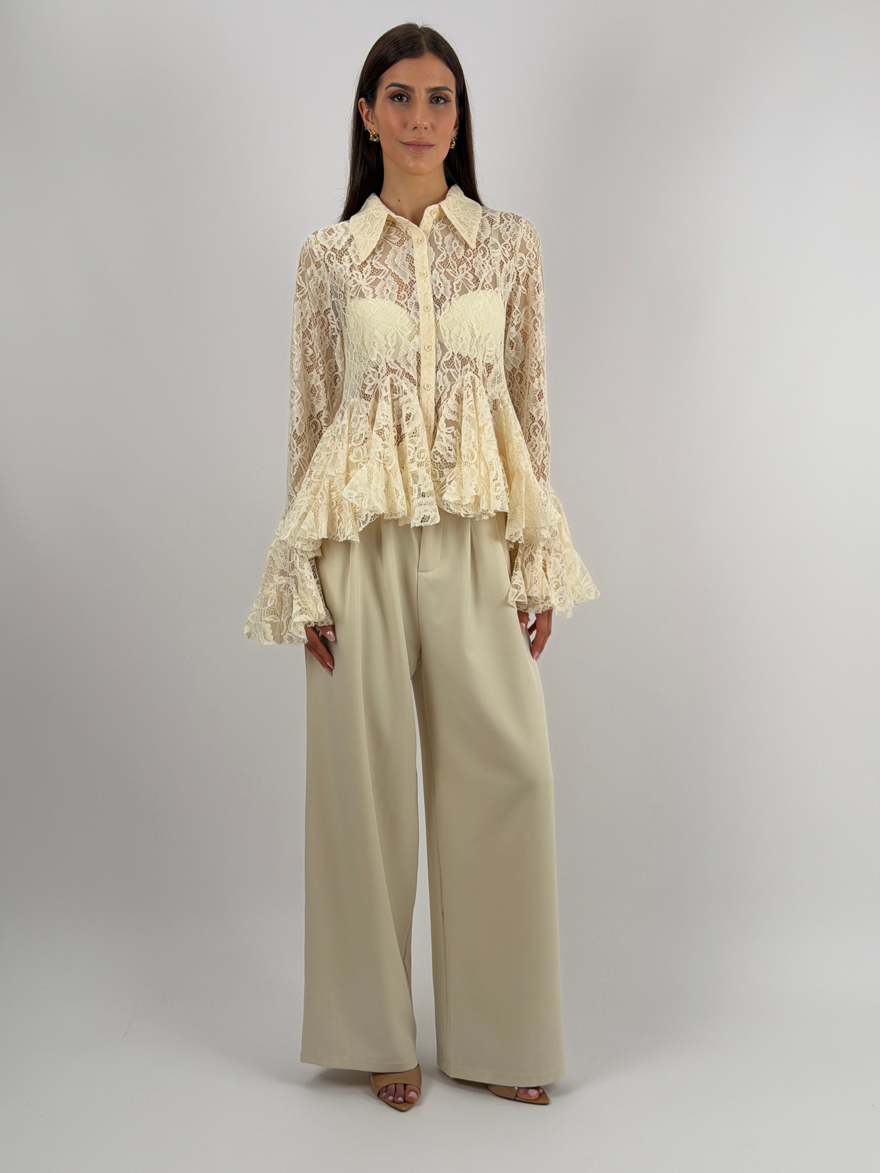 Pantalone a palazzo color panna con tasche laterali, passanti in vita ed elastico sul retro, chiusura con zip e bottone