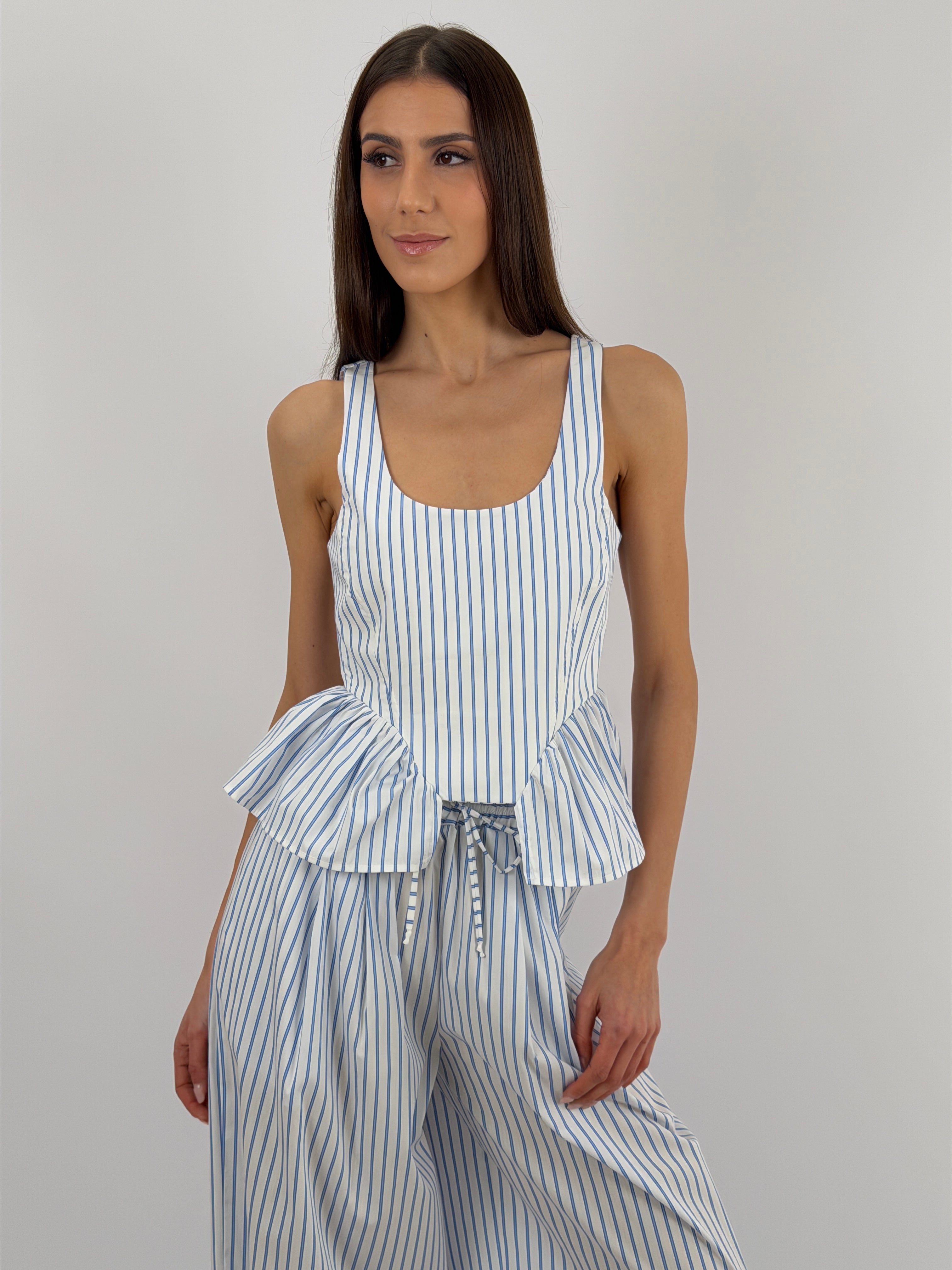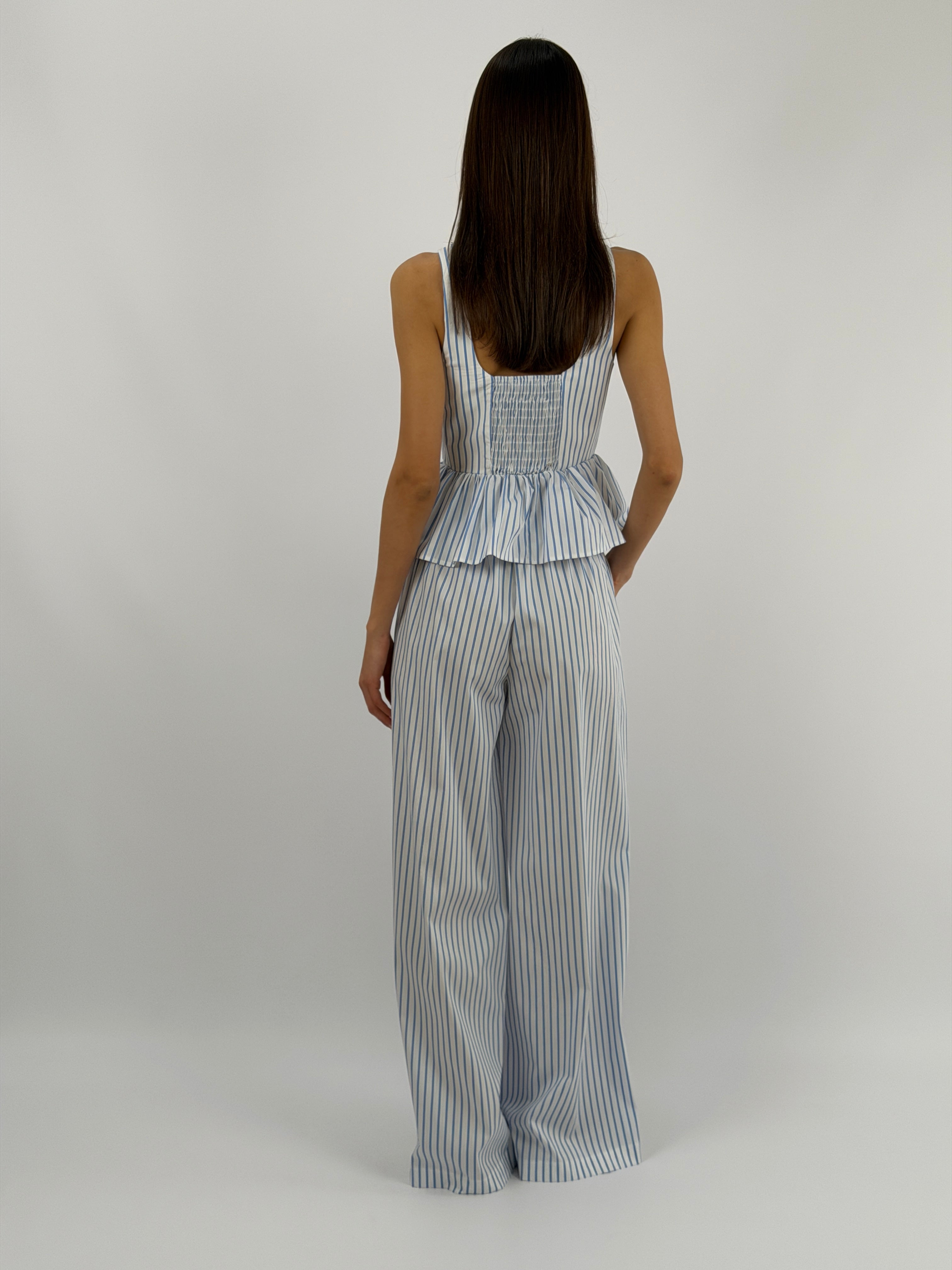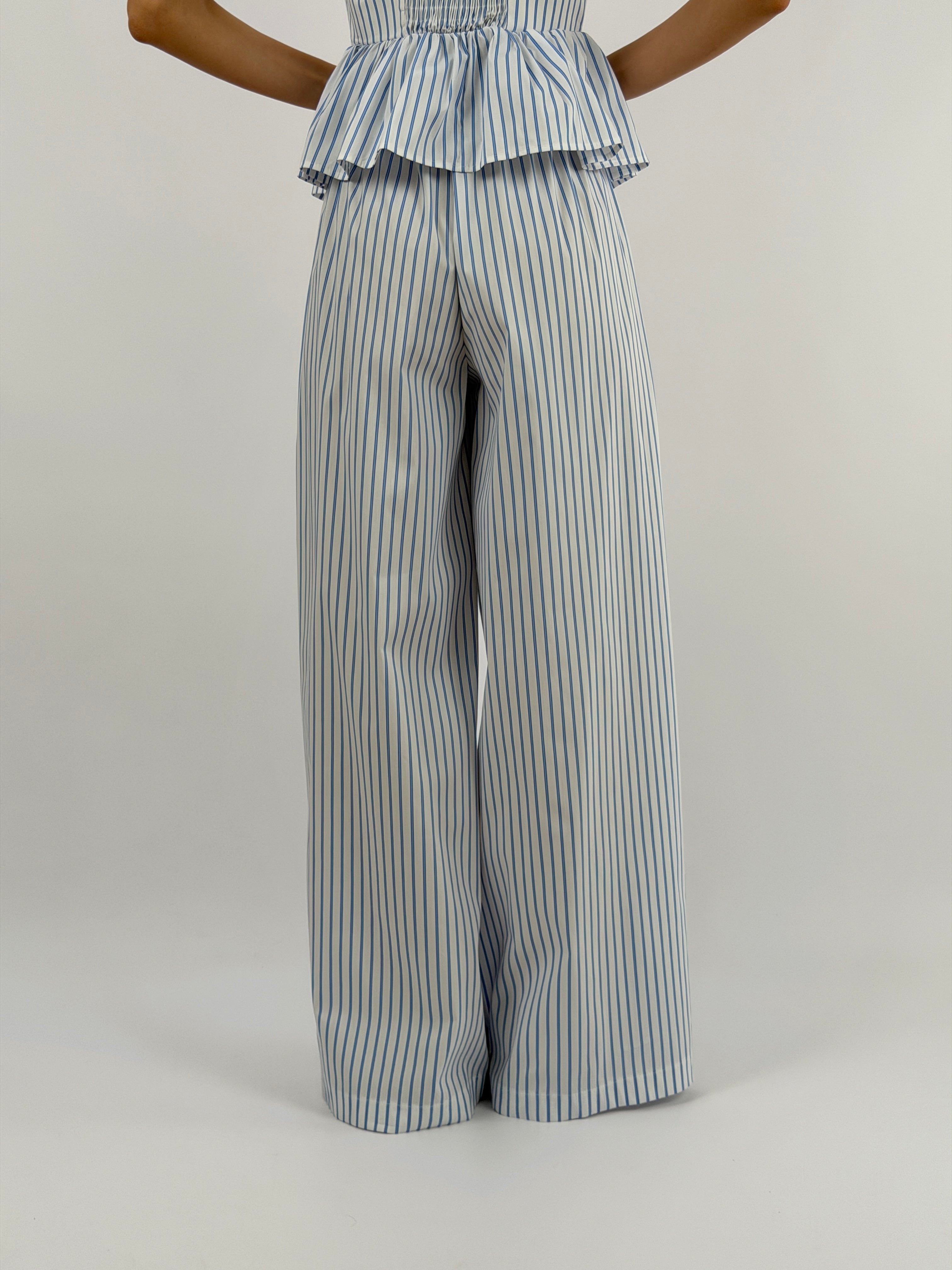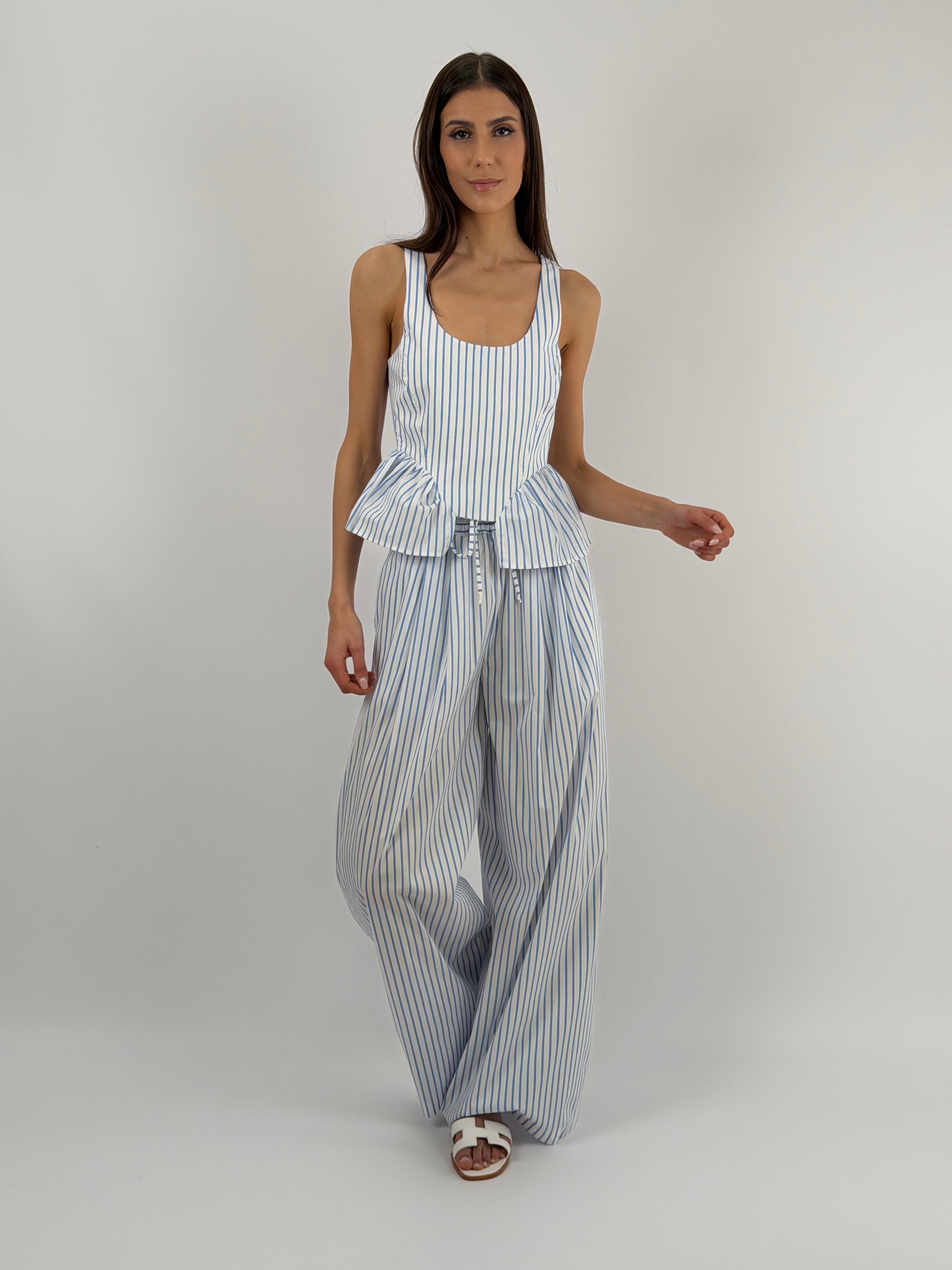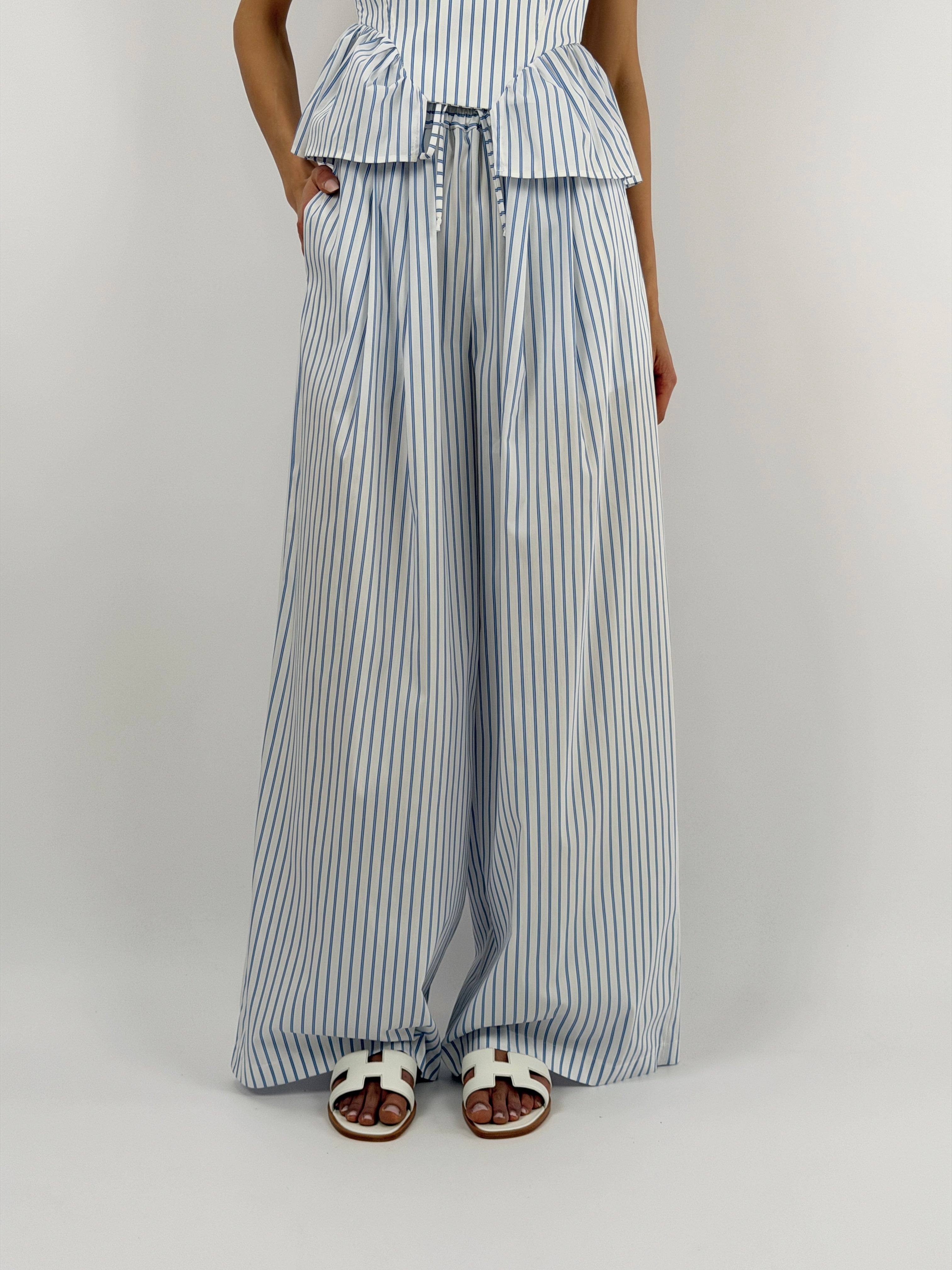 Pantalone wide leg in cotone a righe azzurre e bianche con elastico in vita e laccetto per regolare
