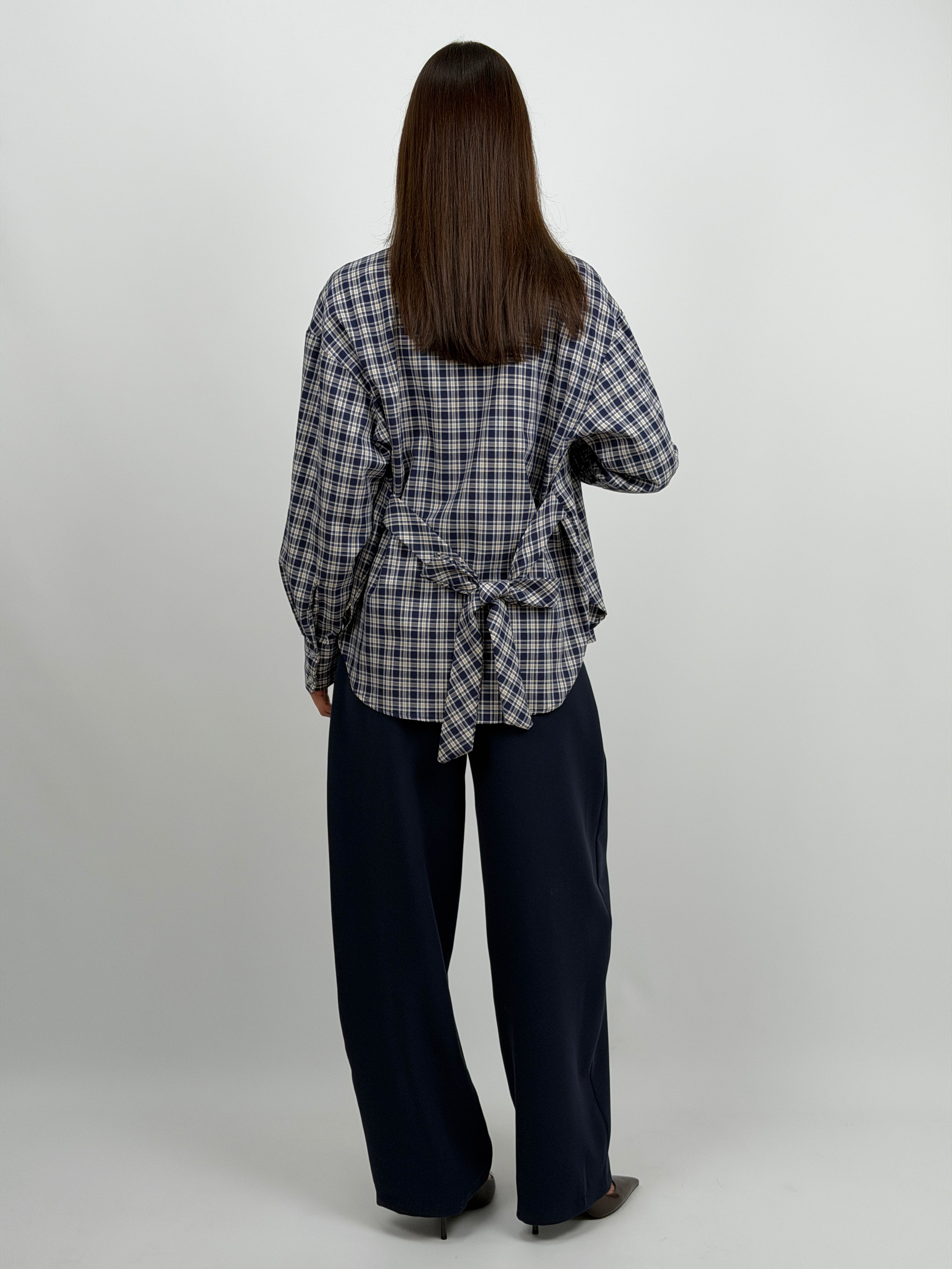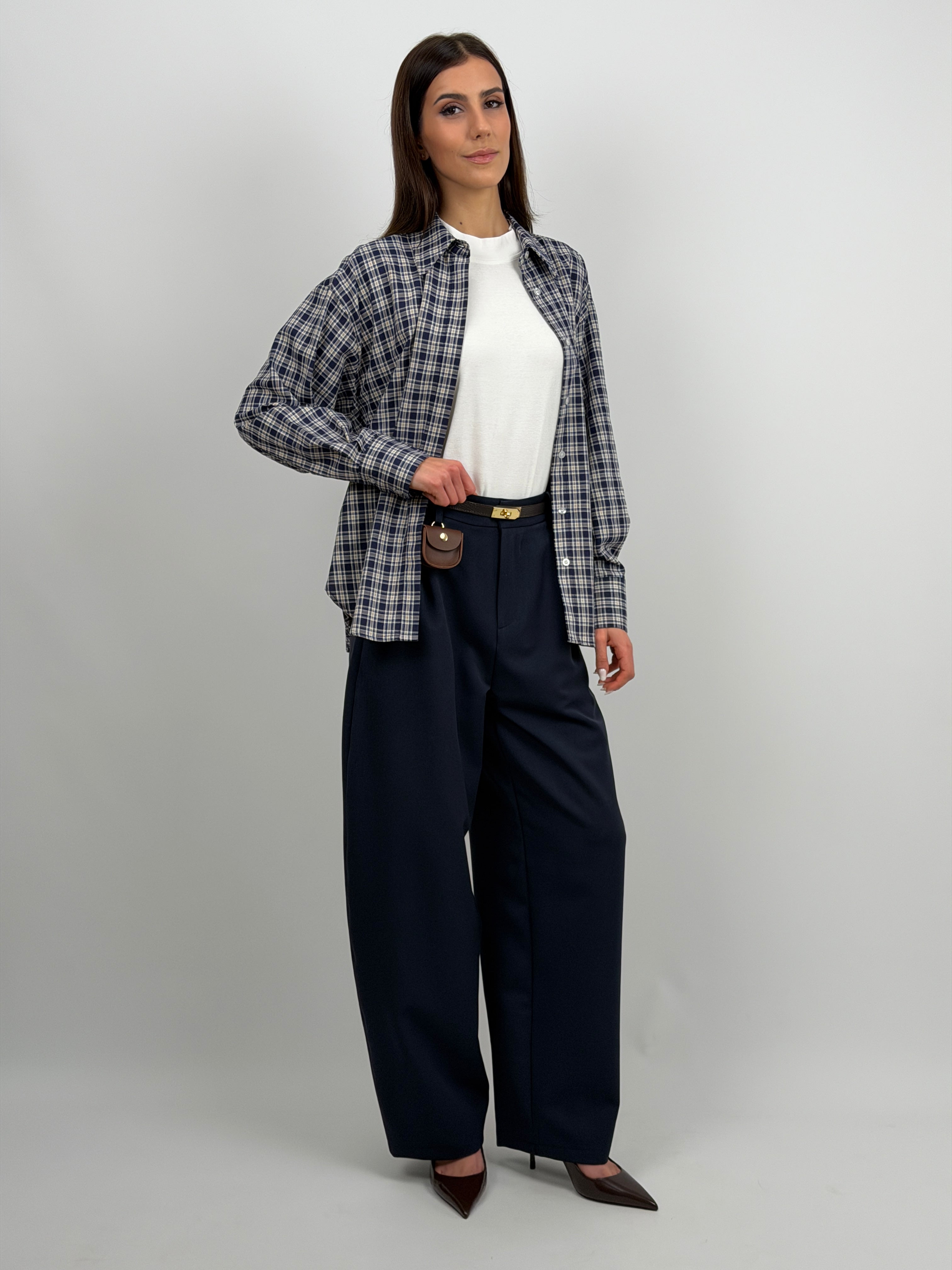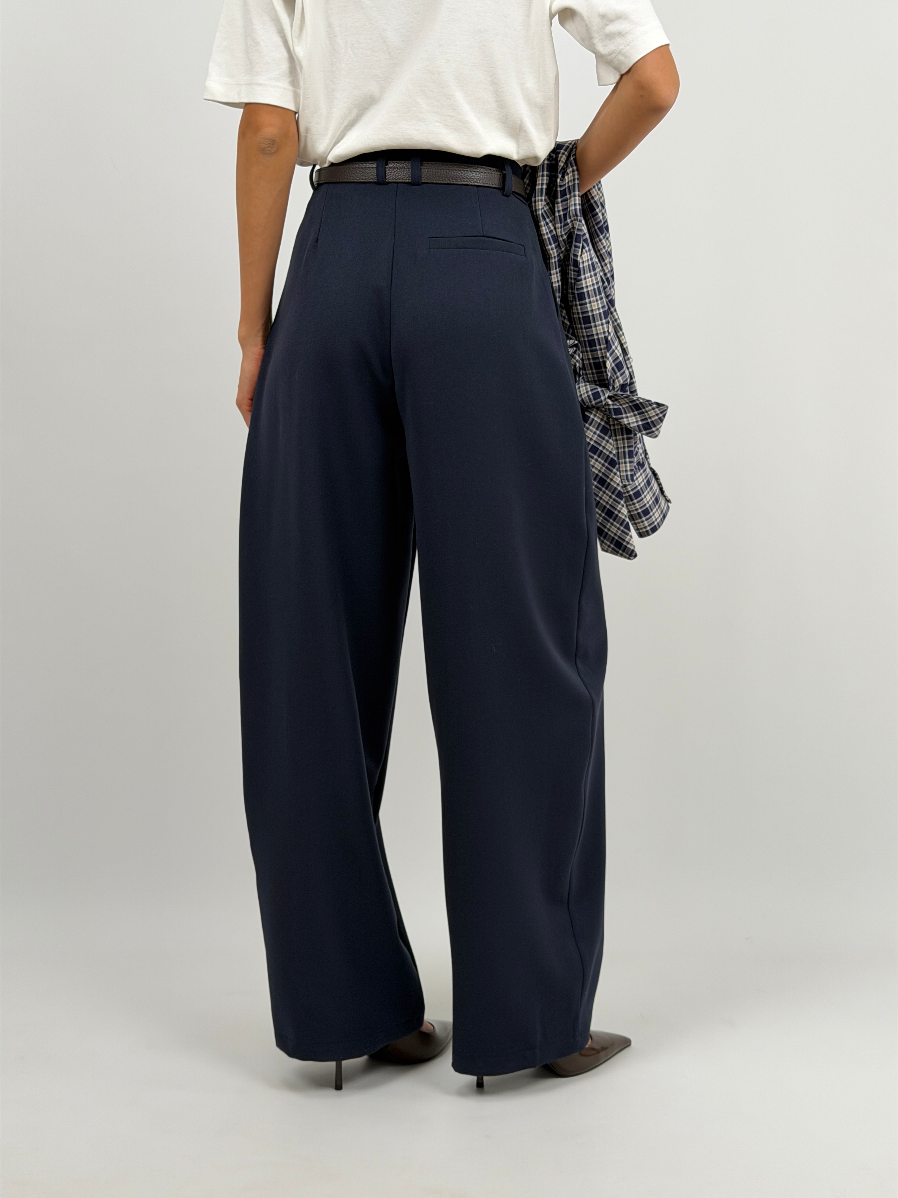 Pantalone Lumina blu modello barrel con tasche laterali, passanti per cintura e charm a borsetta incluso e rimovibile