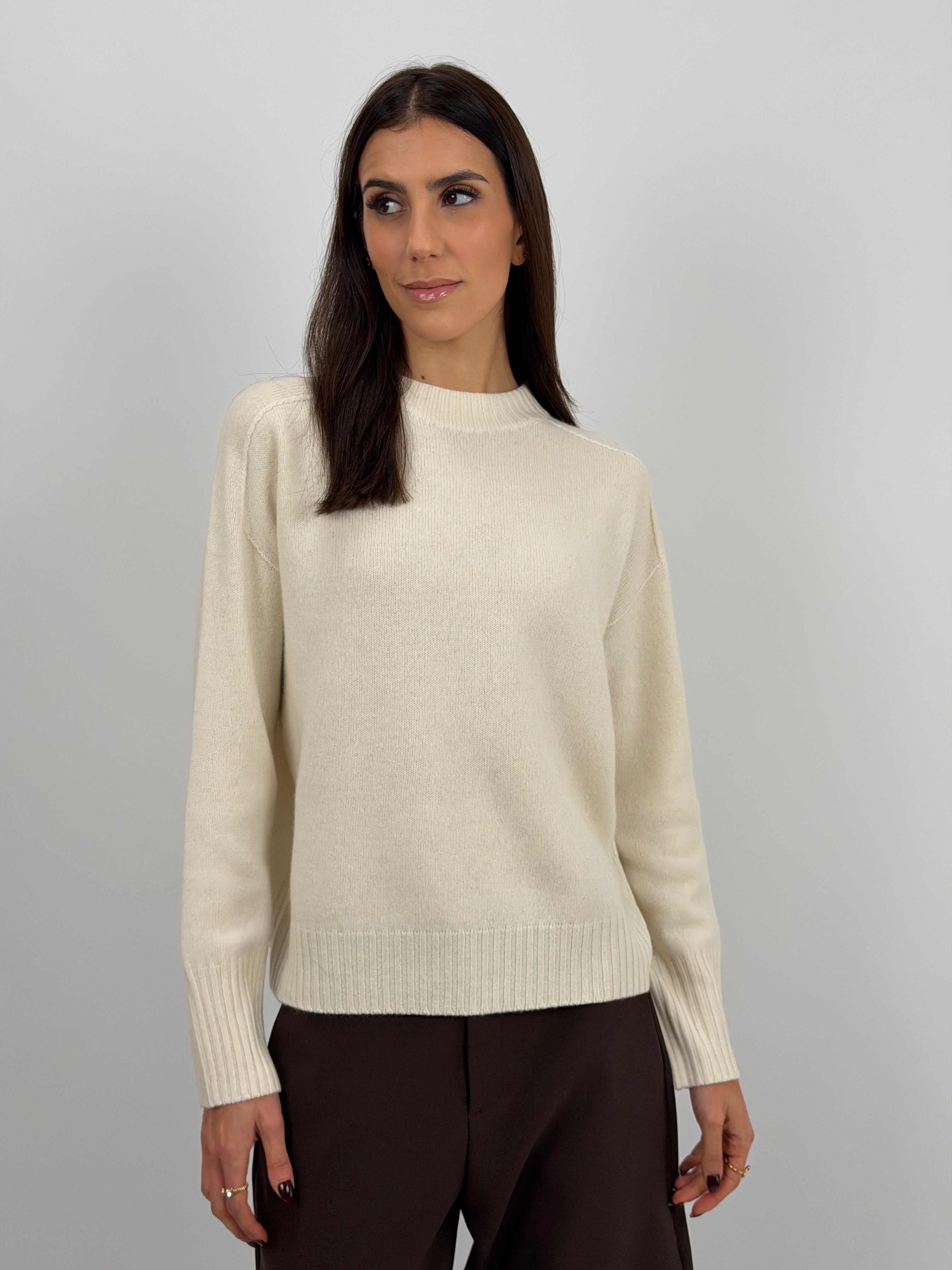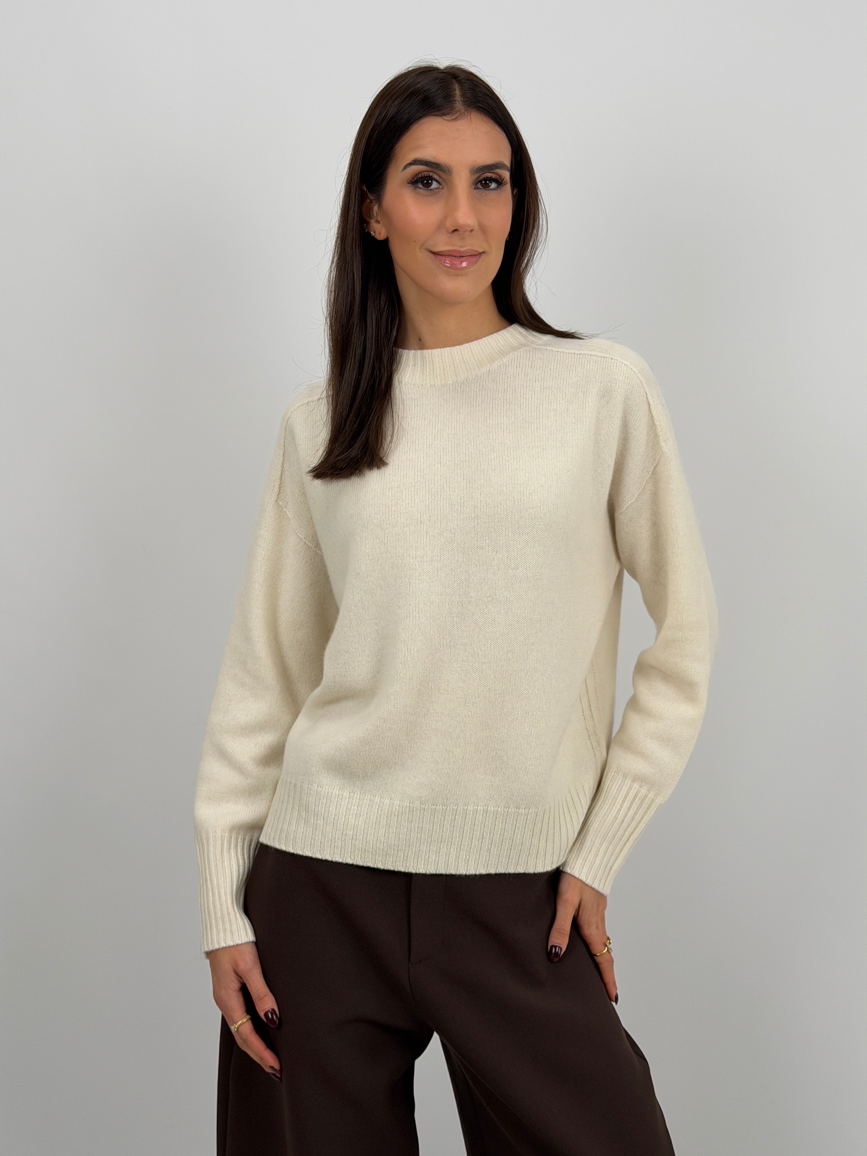 Maglione crema morbido in 100% lana, con finiture a costine, girocollo stretto e maniche lunghe. Caldo e confortevole, non punge.