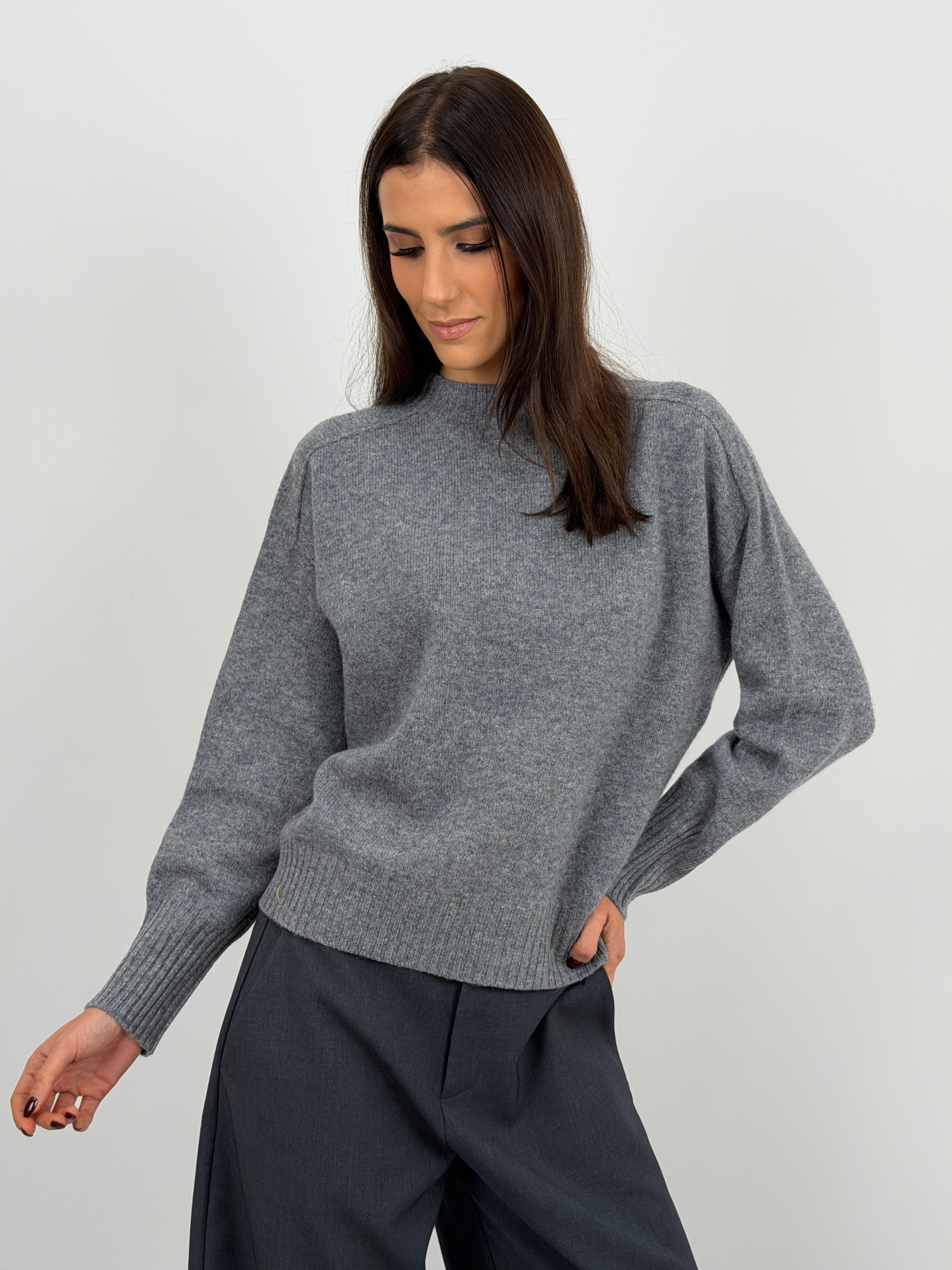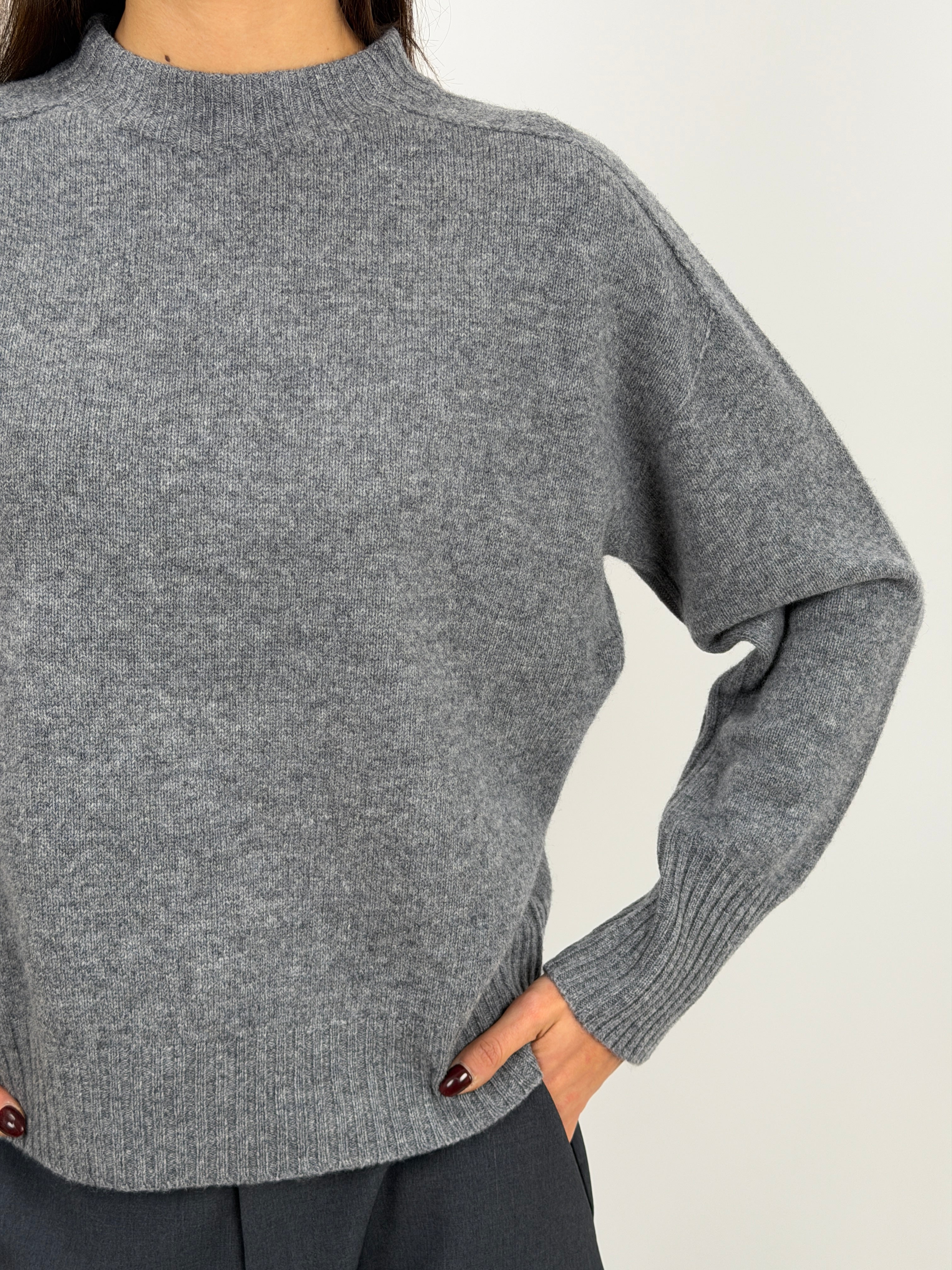 Maglione grigio morbido in 100% lana, con finiture a costine, girocollo stretto e maniche lunghe. Caldo e confortevole, non punge.