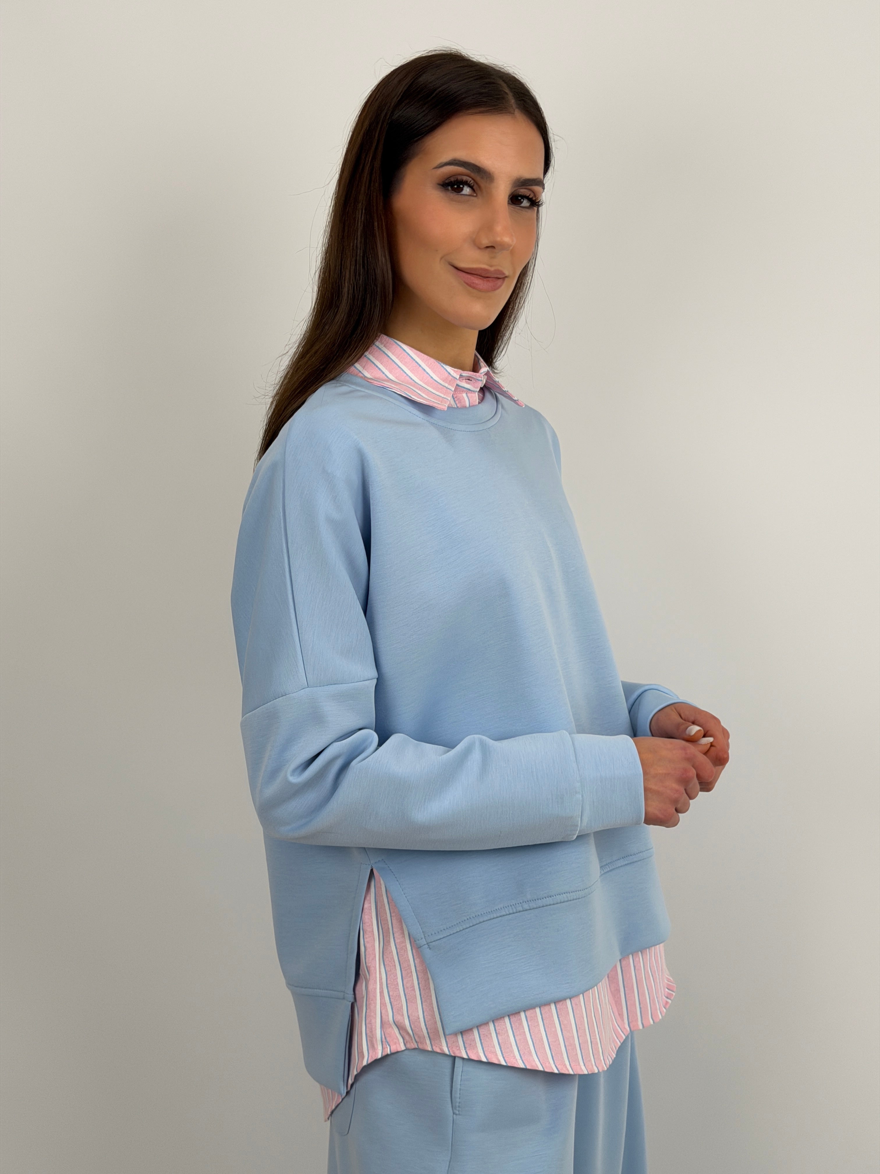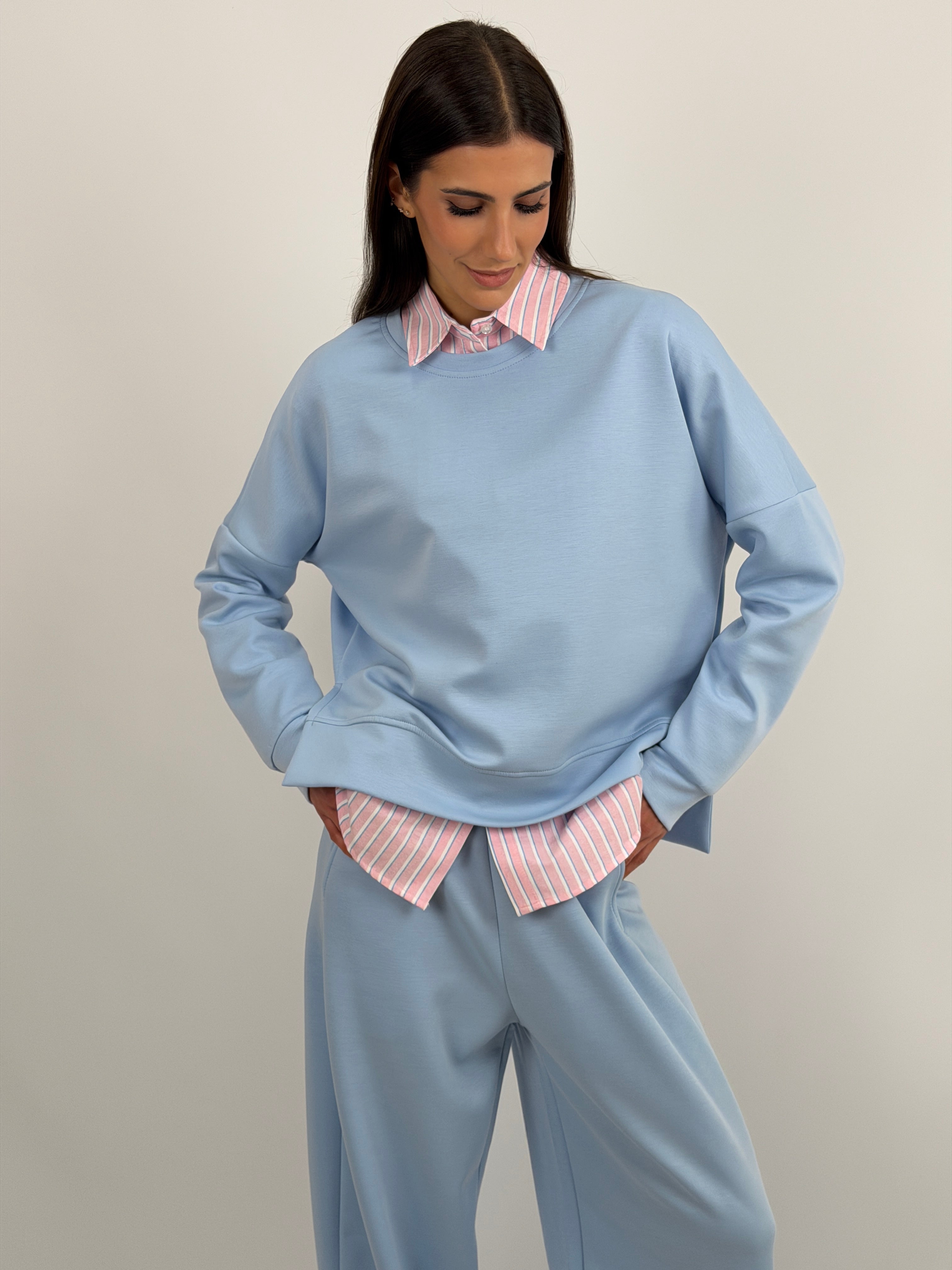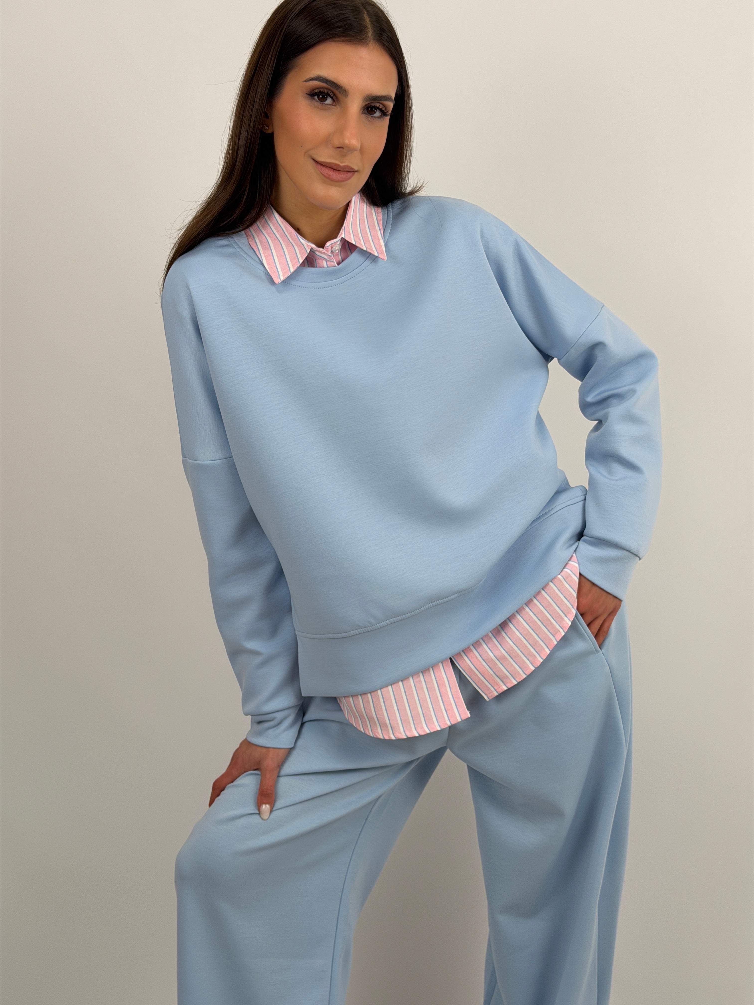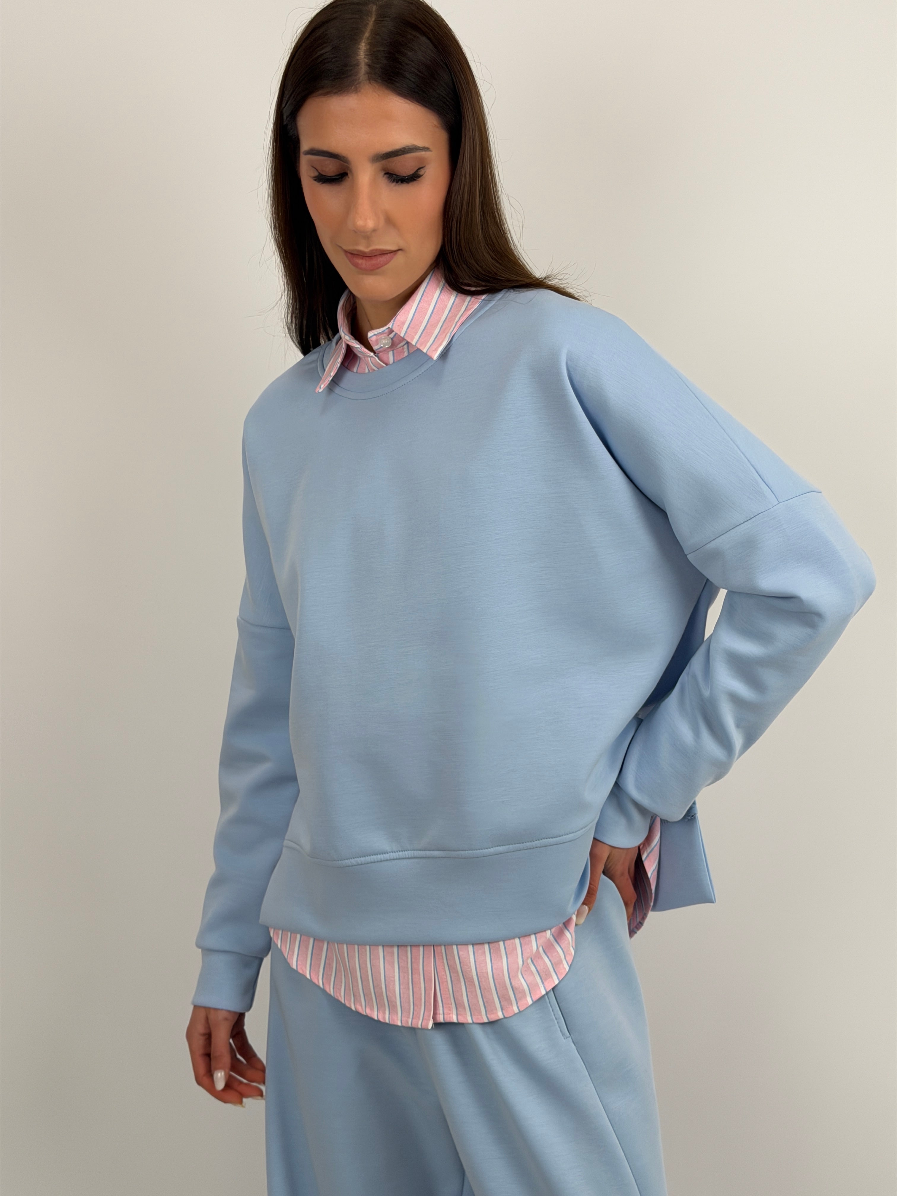 Completo tuta azzurra in tessuto morbido, composto da felpa più lunga sul retro e pantalone con elastico in vita e tasche laterali