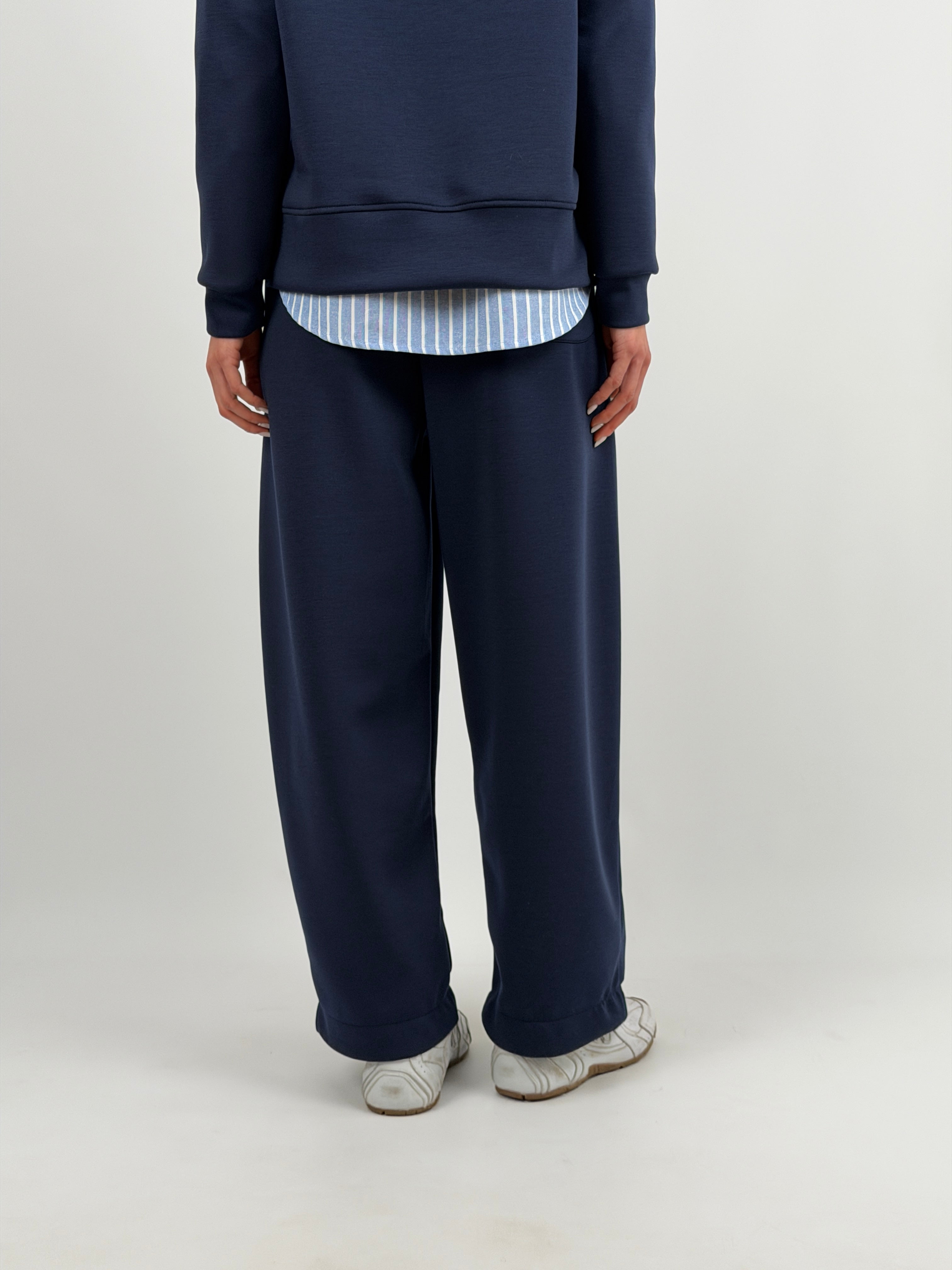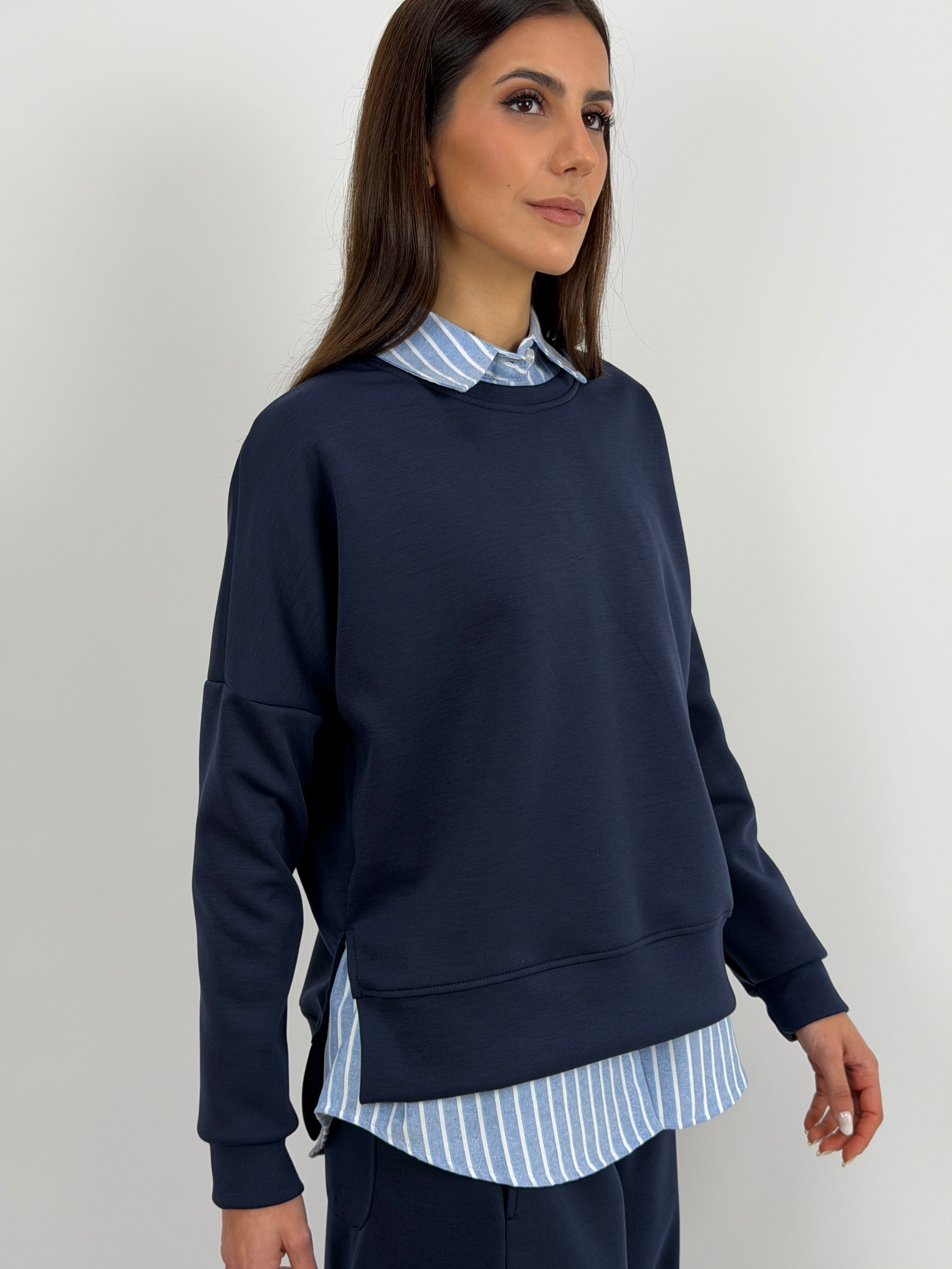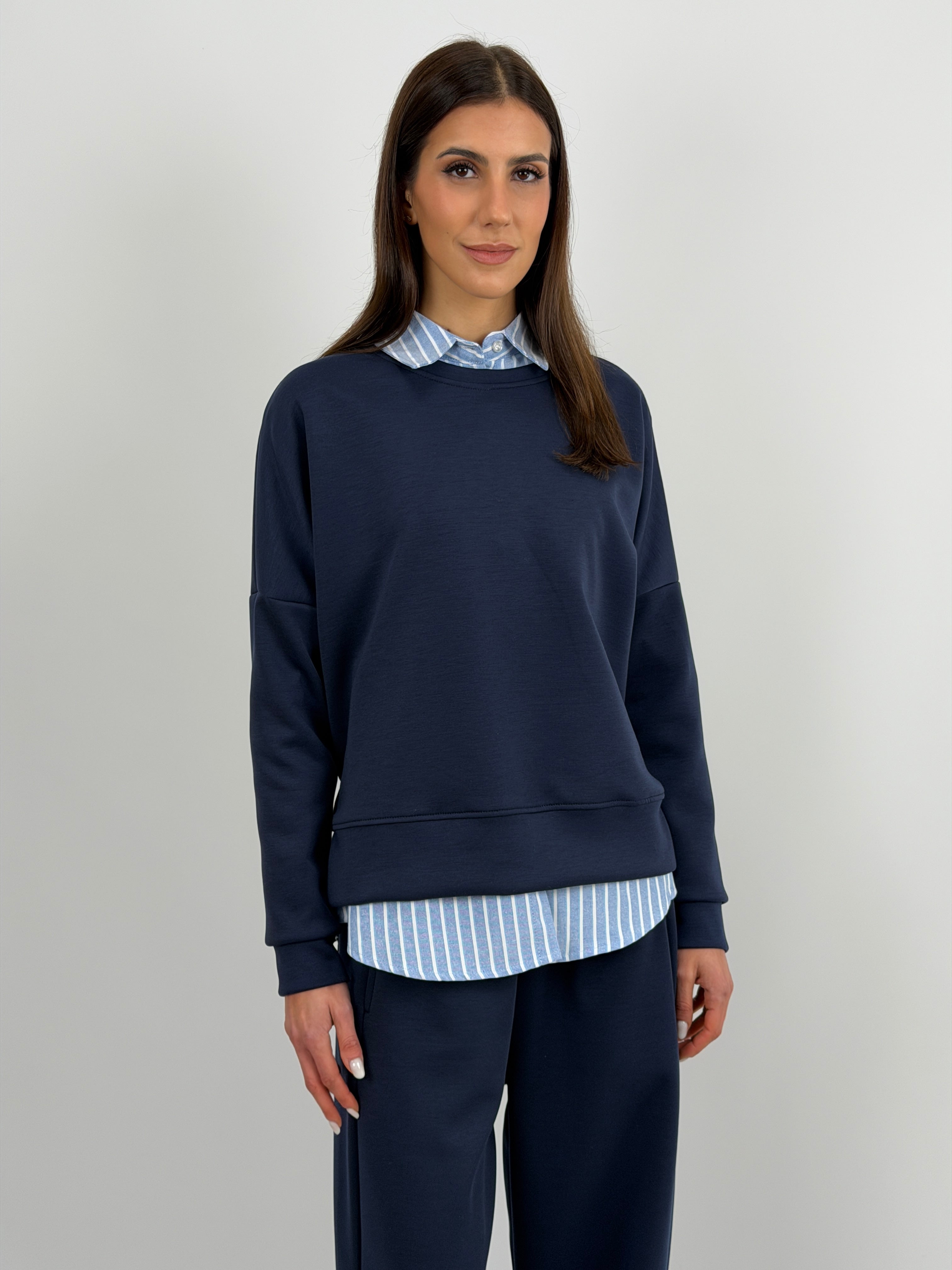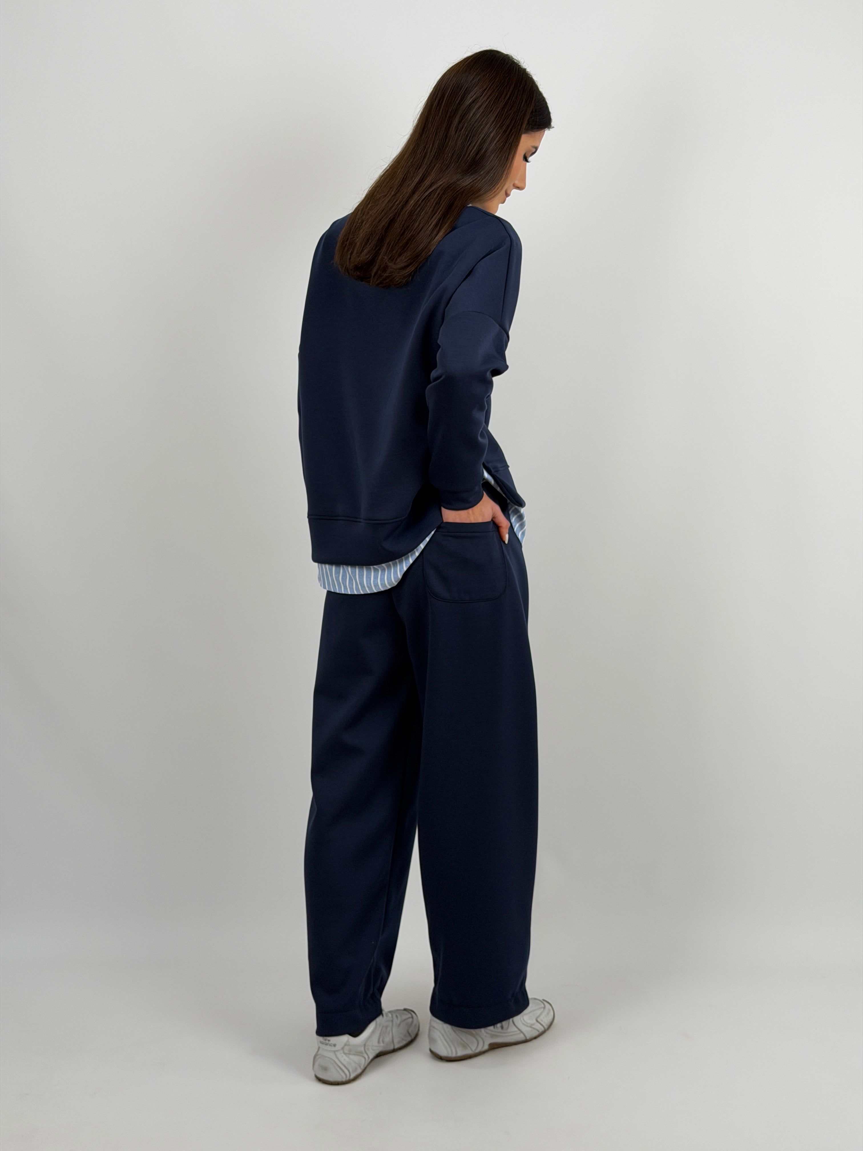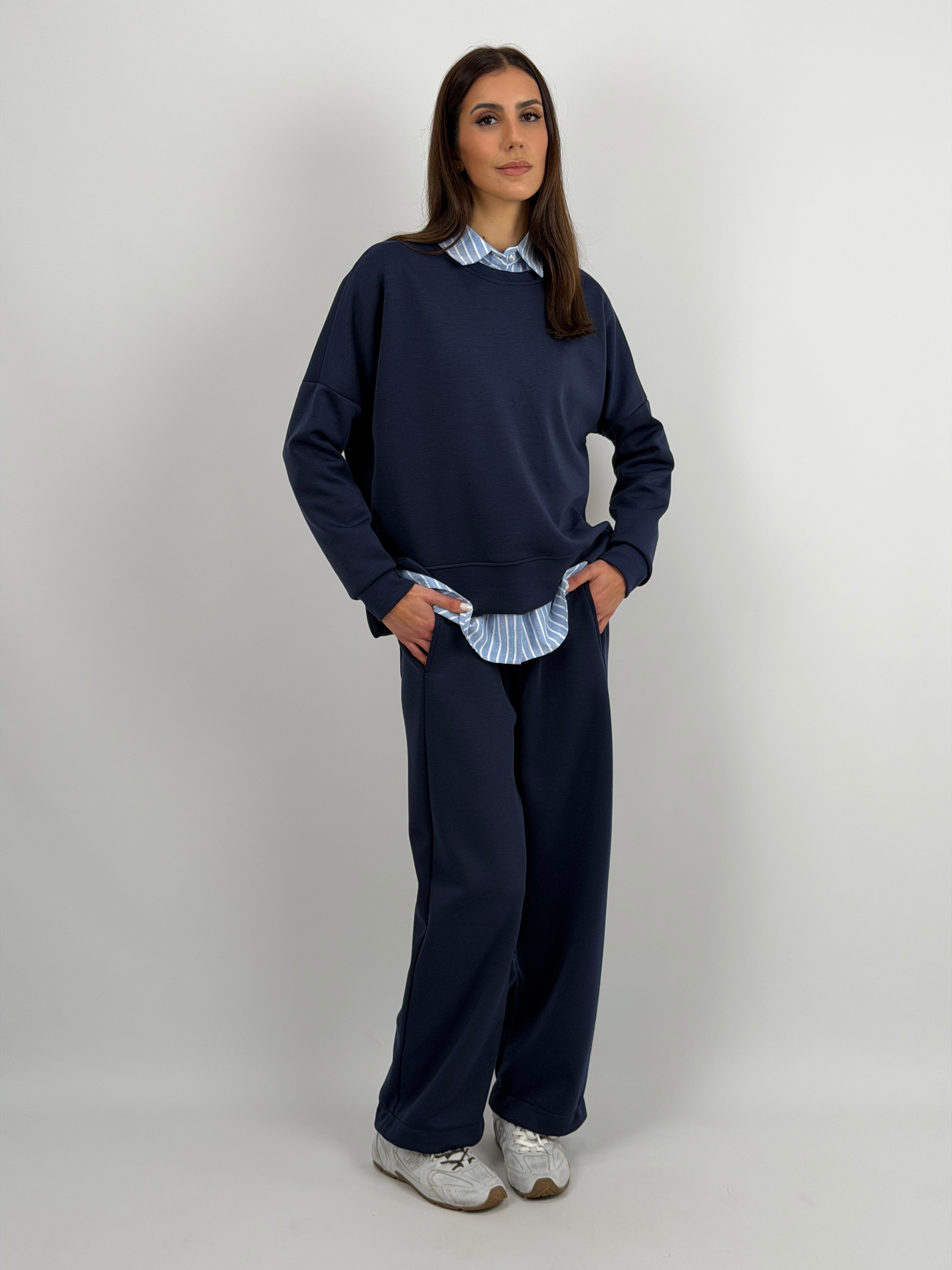 Completo tuta blu in tessuto morbido, composto da felpa più lunga sul retro e pantalone con elastico in vita e tasche laterali