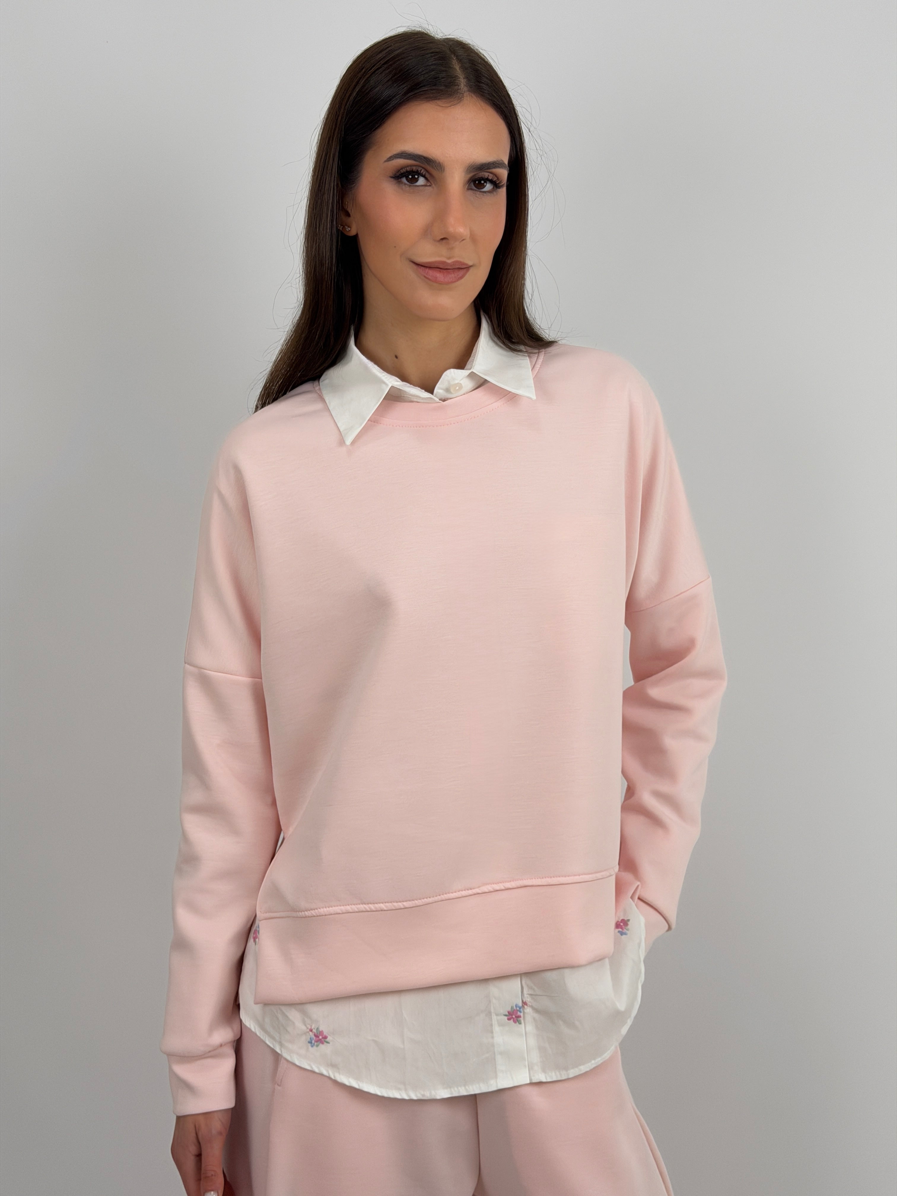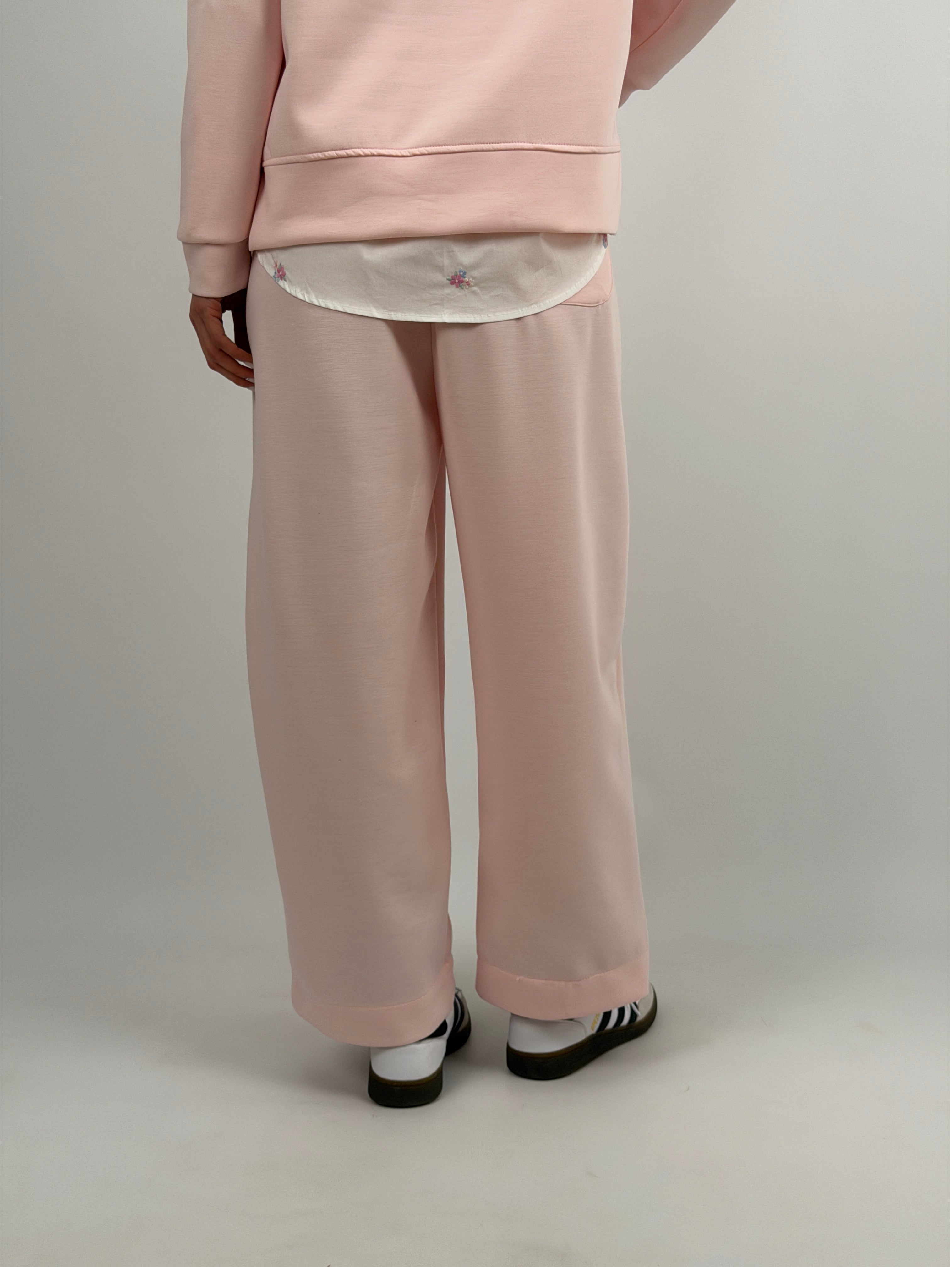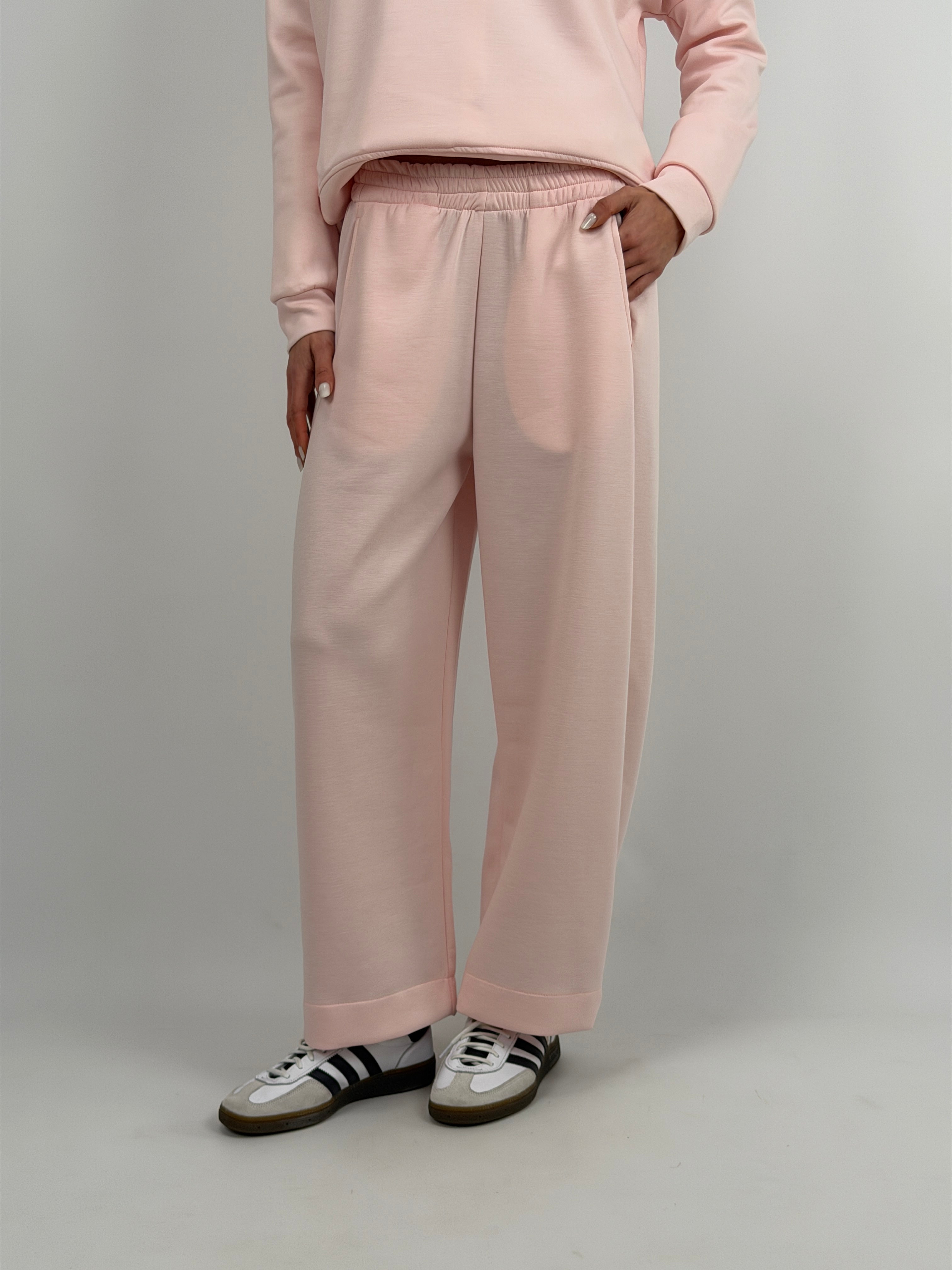 Completo tuta rosa in tessuto morbido, composto da felpa più lunga sul retro e pantalone con elastico in vita e tasche laterali