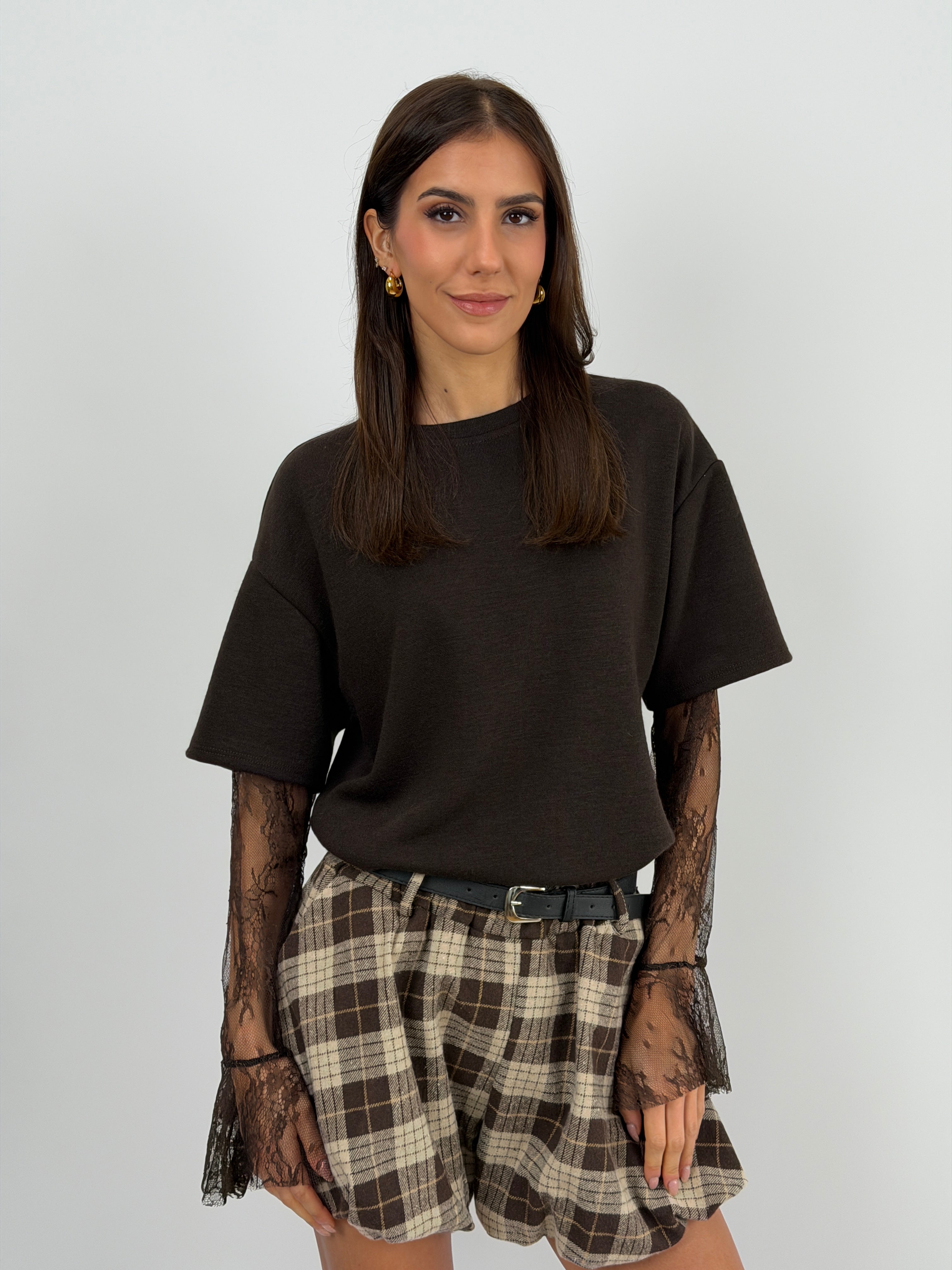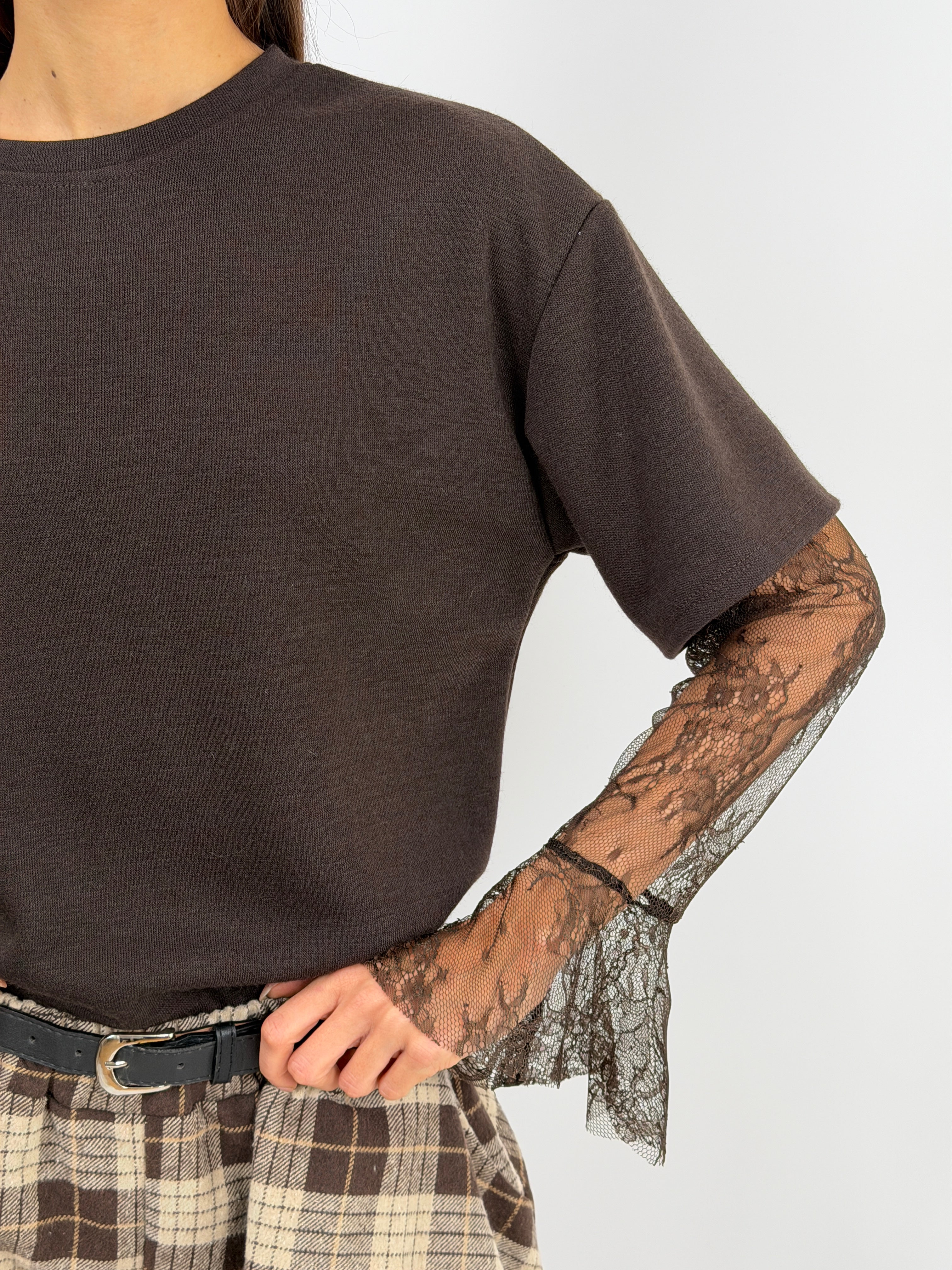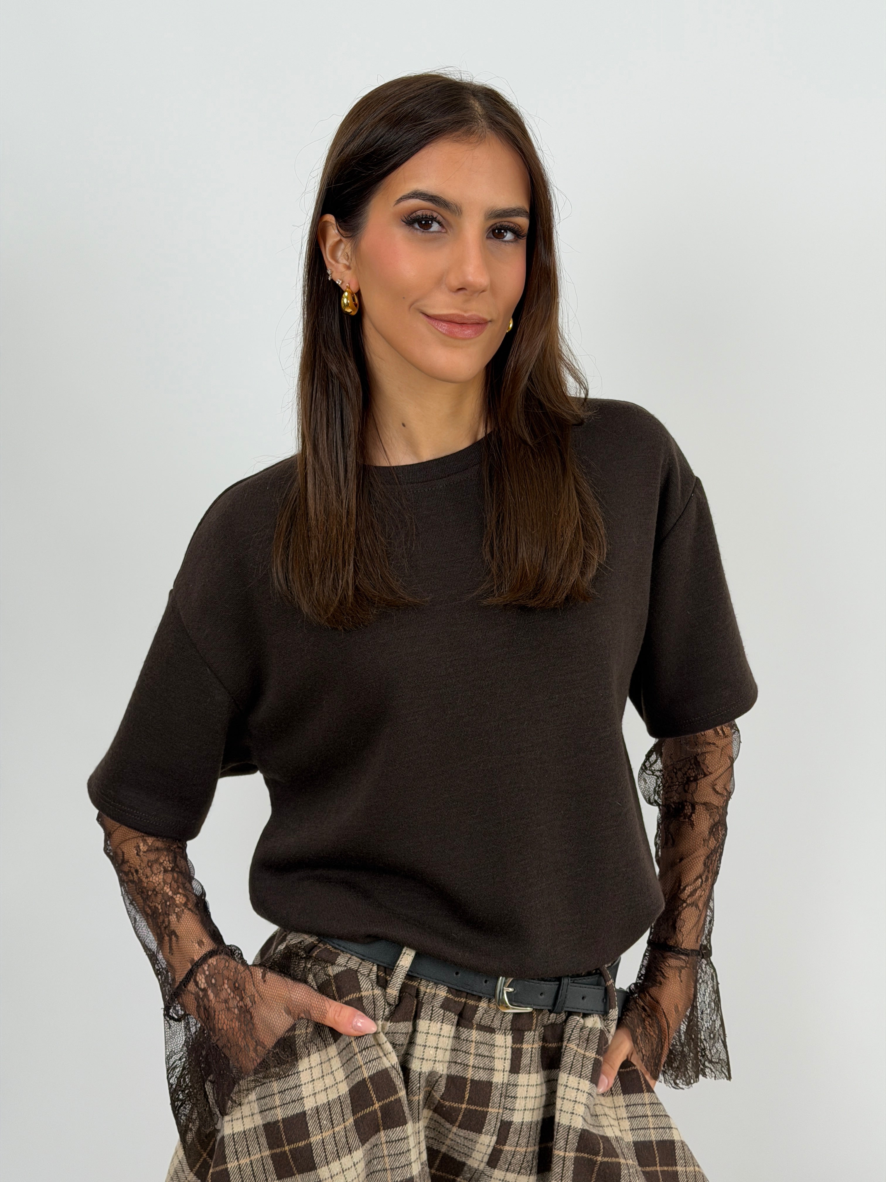 Maglia marrone a maniche corte in tessuto spesso con girocollo e maniche in pizzo tono su tono