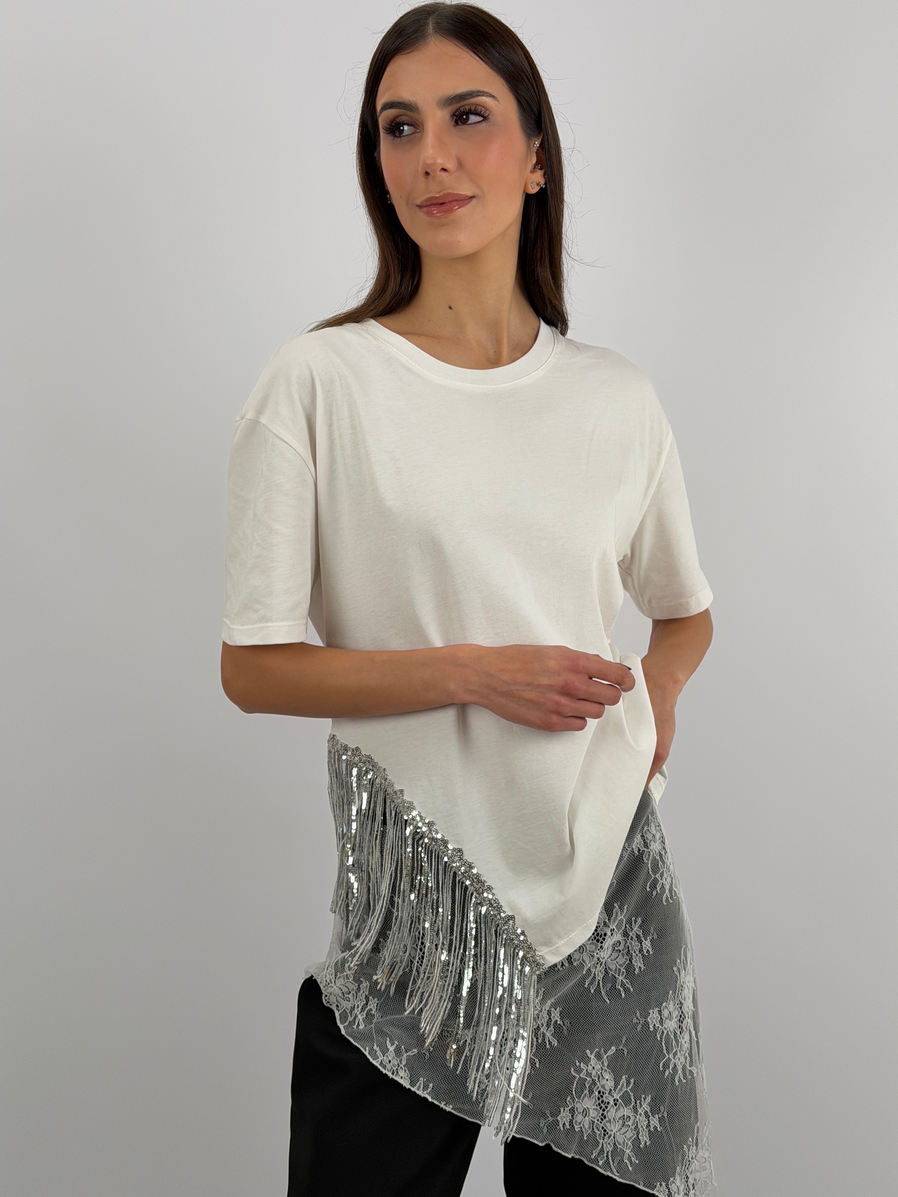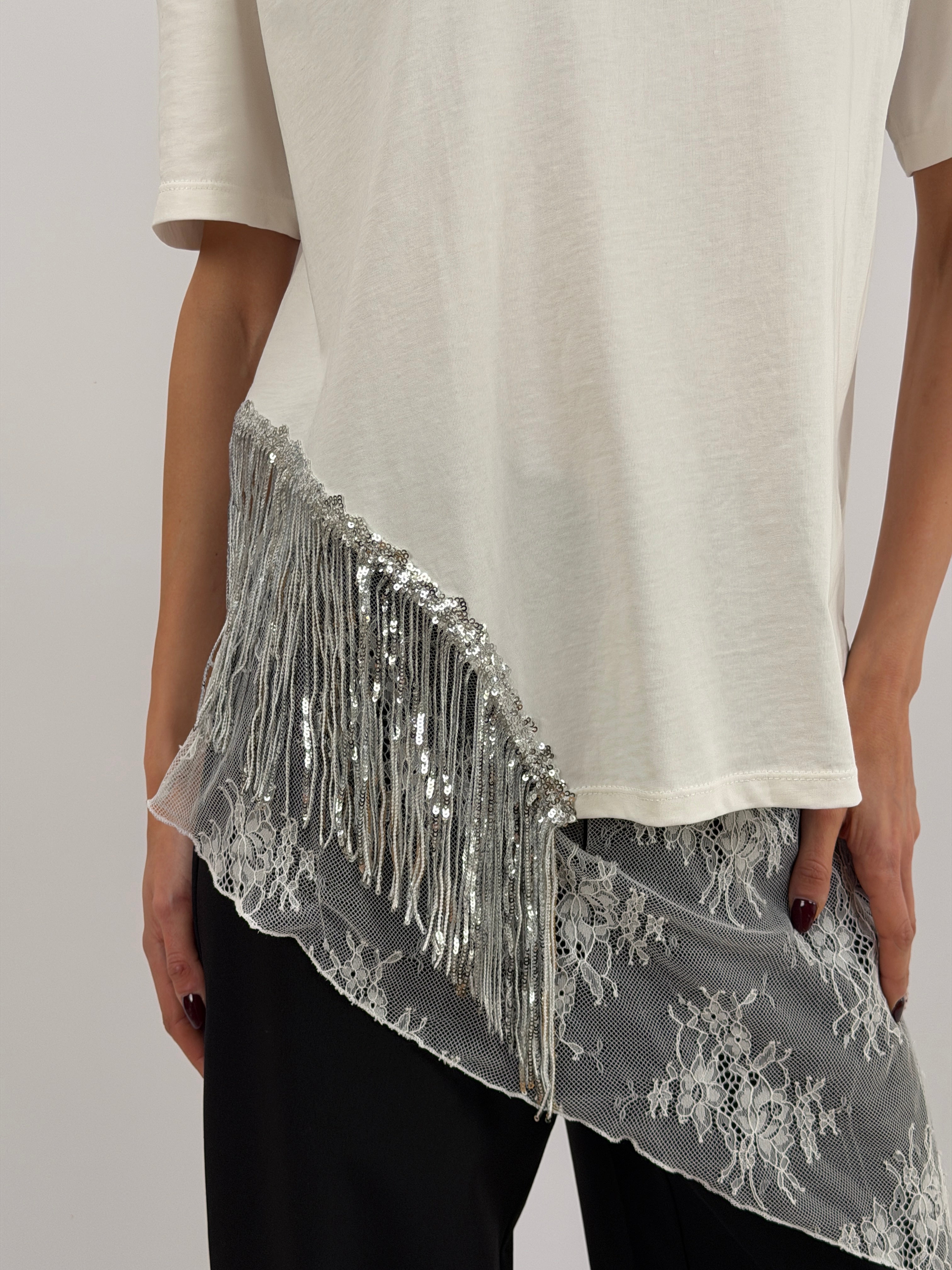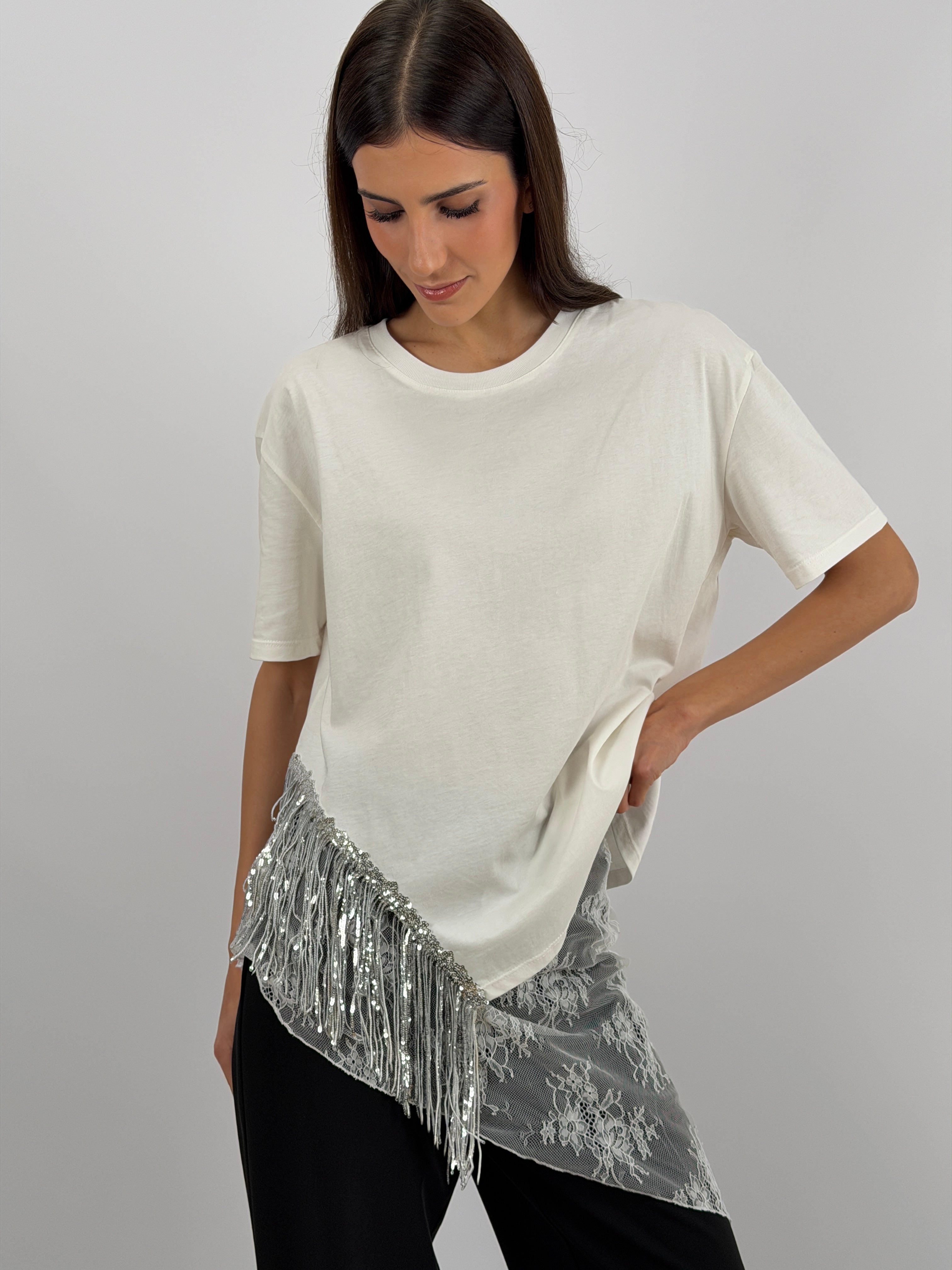Maglia Lumina bianca in cotone a girocollo con maniche corte e applicazioni laterali di frange con paillettes argento