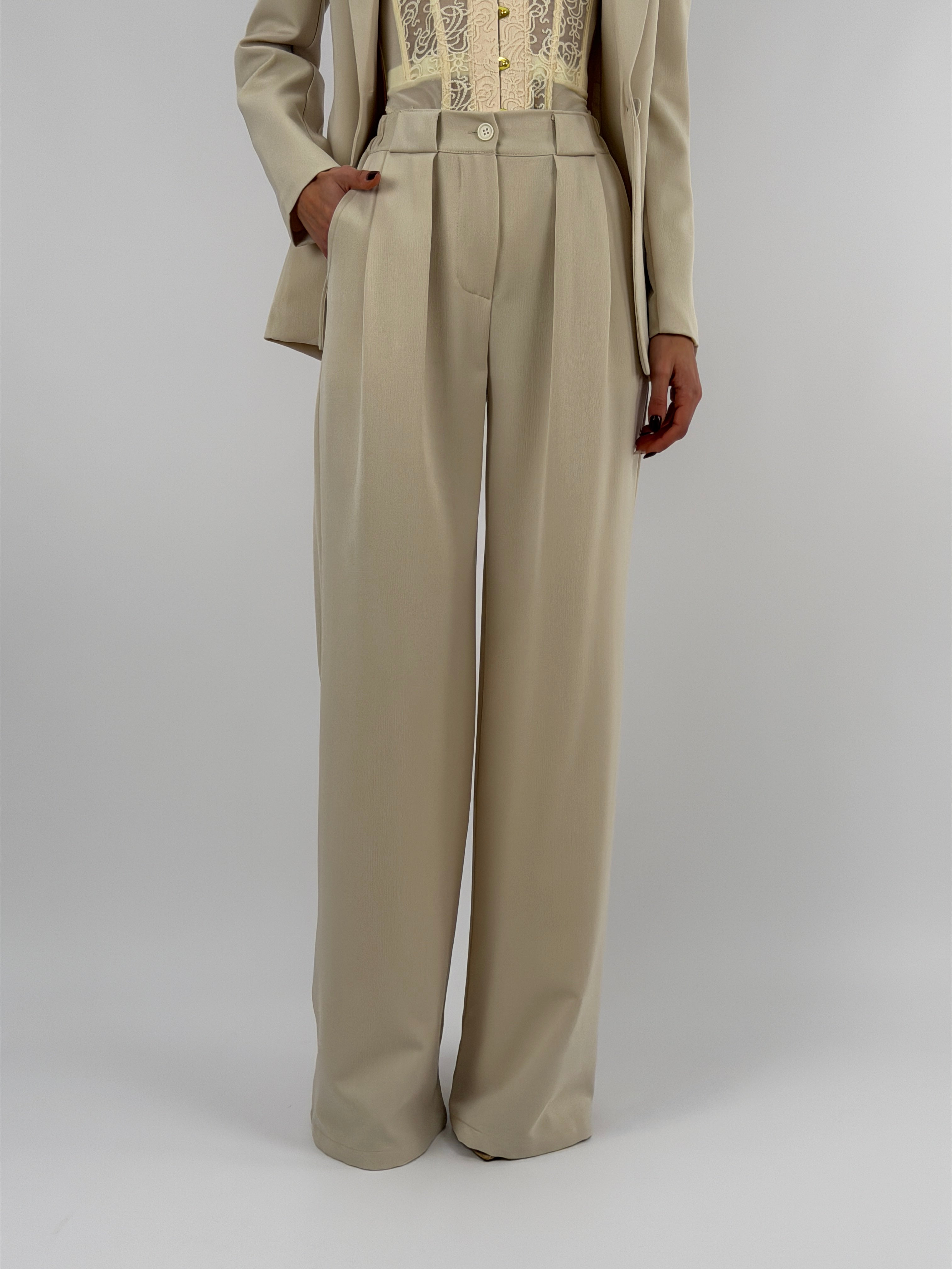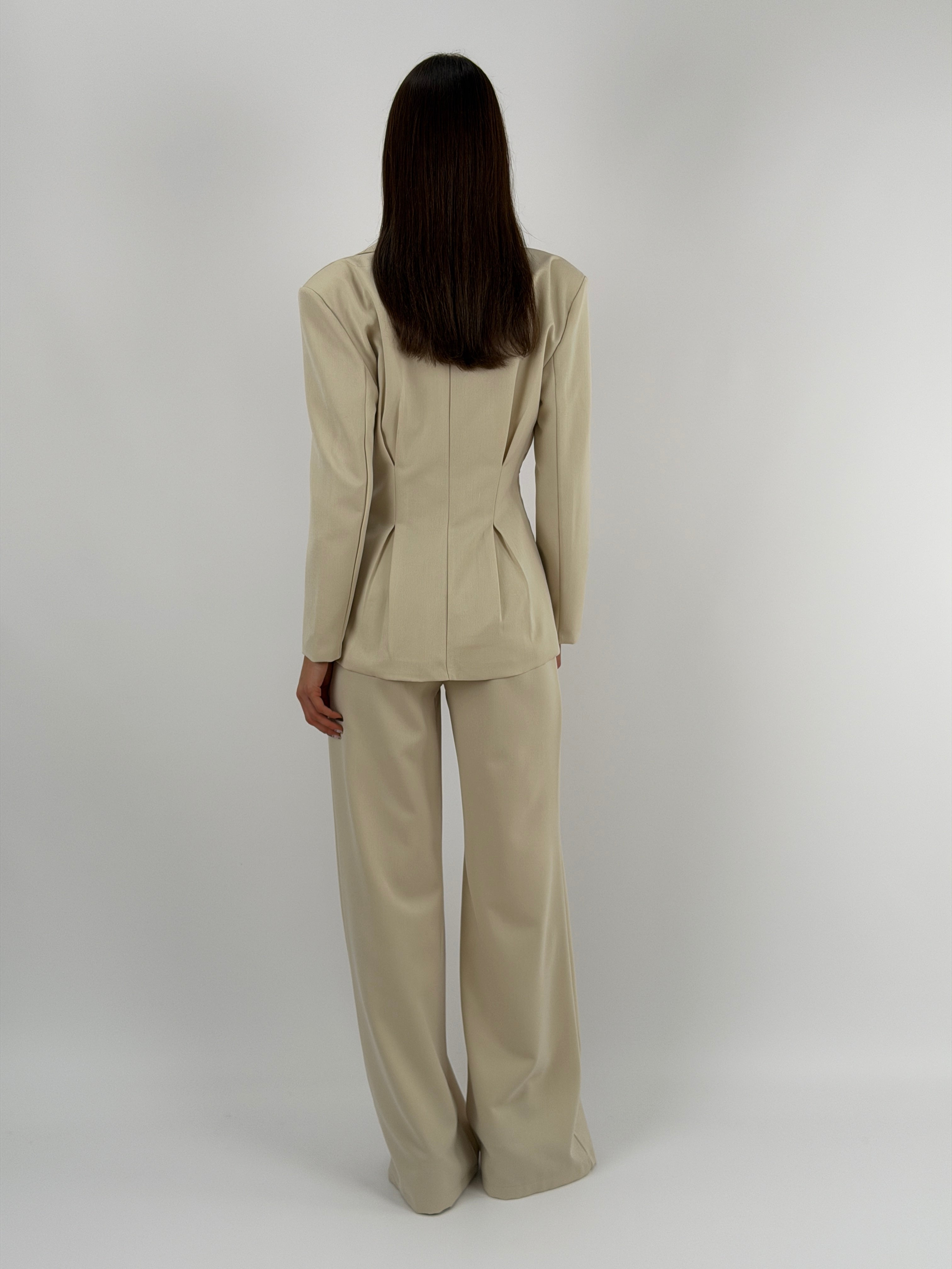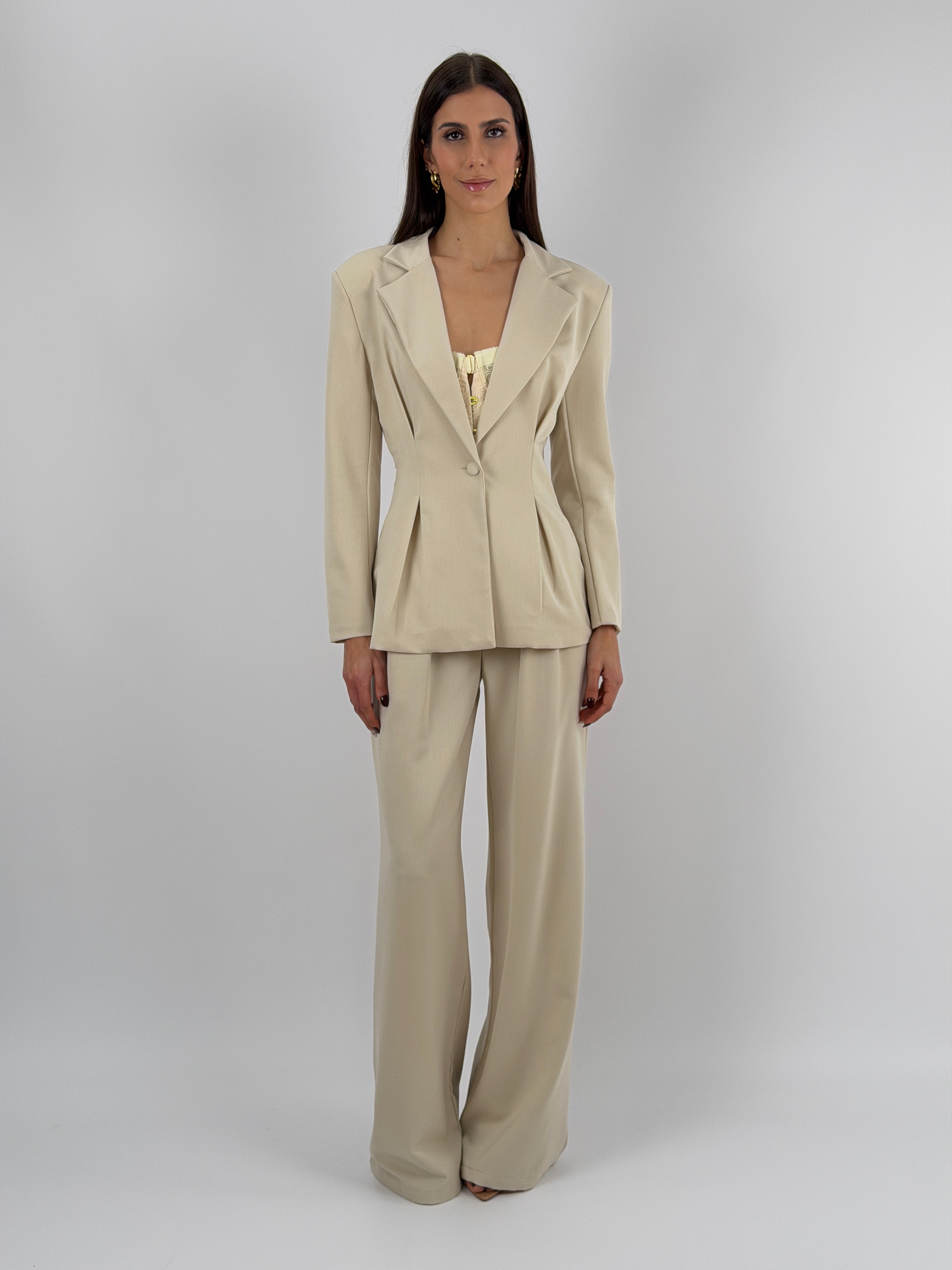 Set beige composto da giacca monopetto avvitata con fodera interna e pantalone a palazzo con zip, bottone ed elastico in vita. Elegante e versatile.