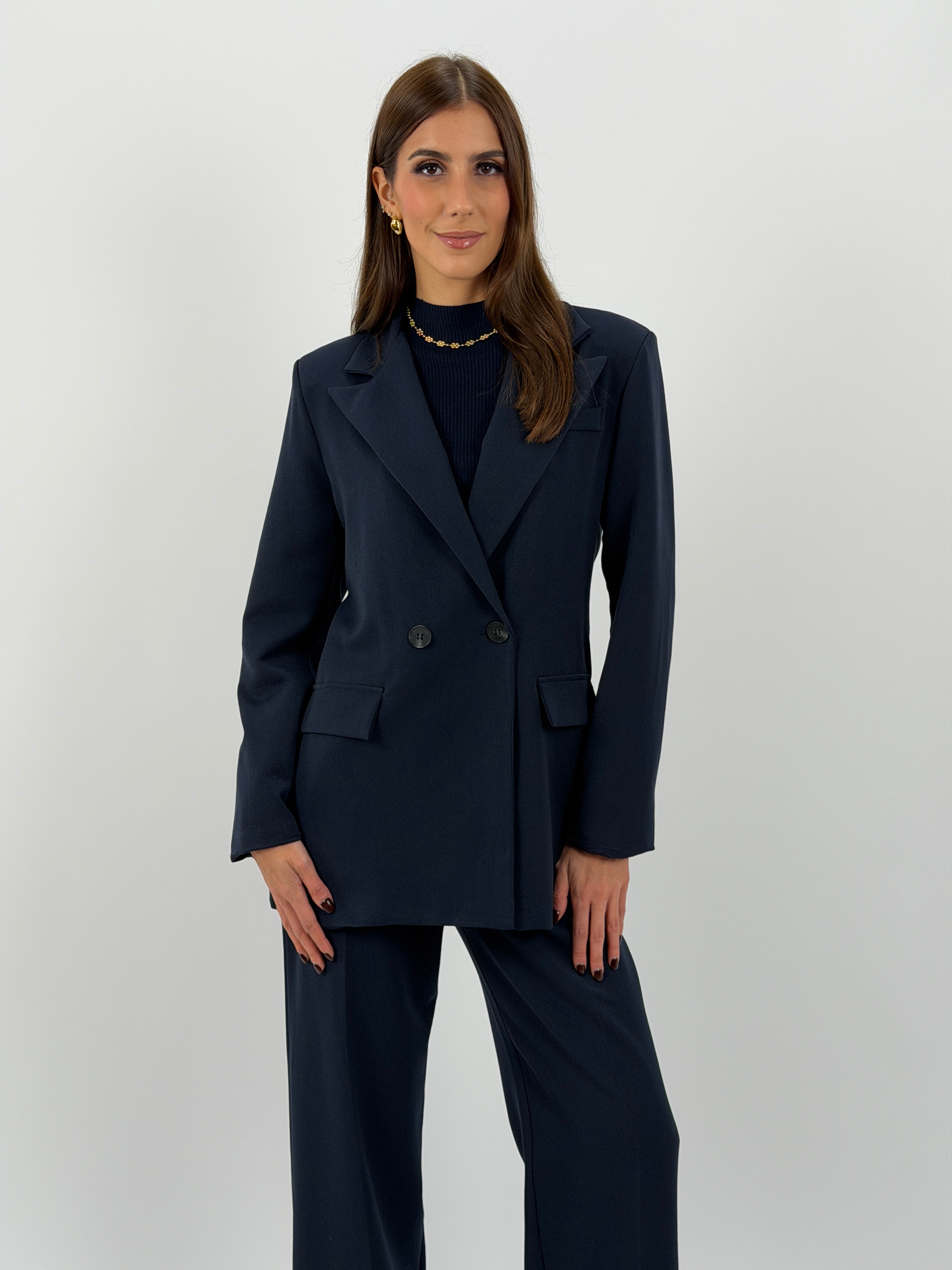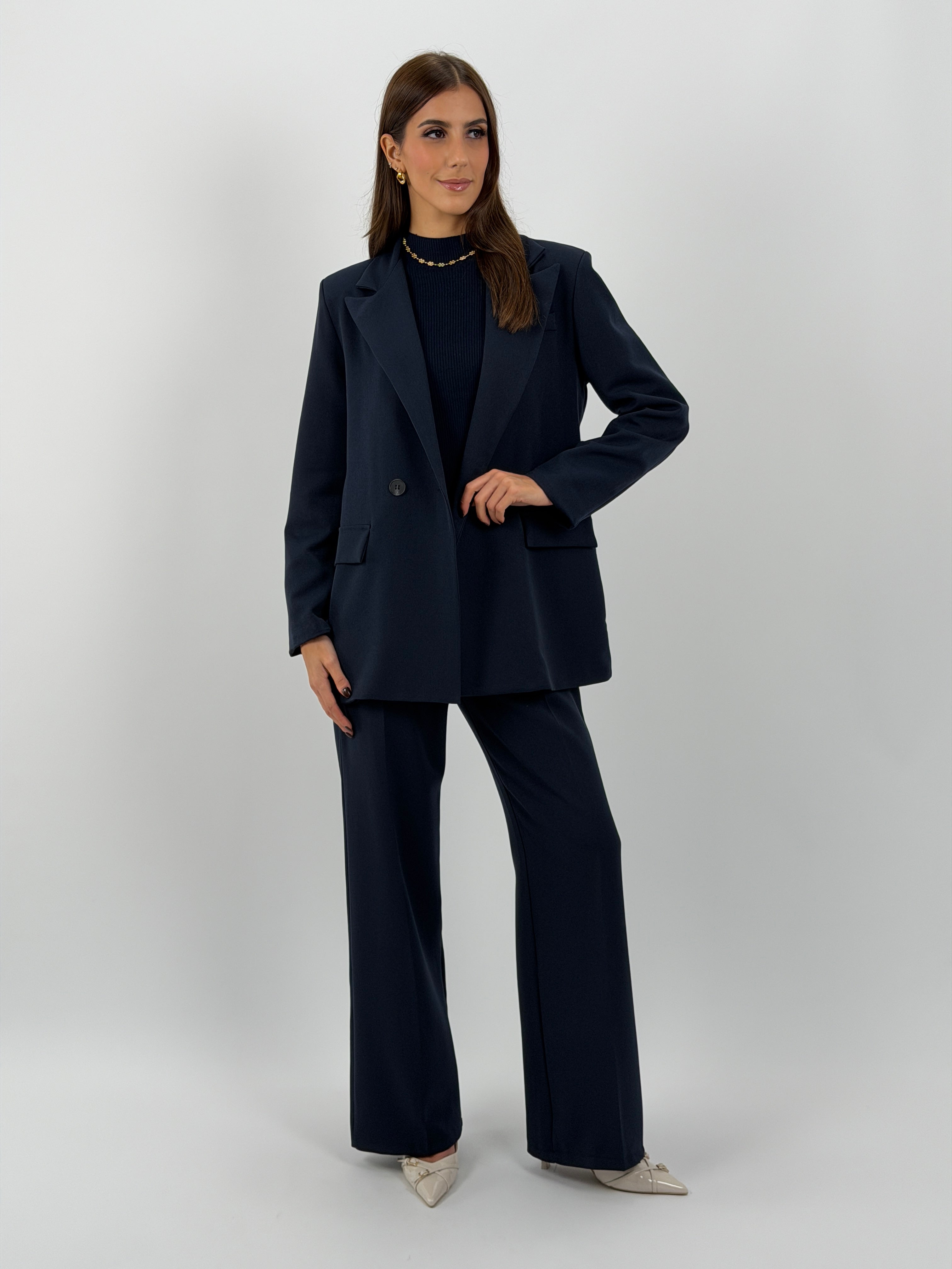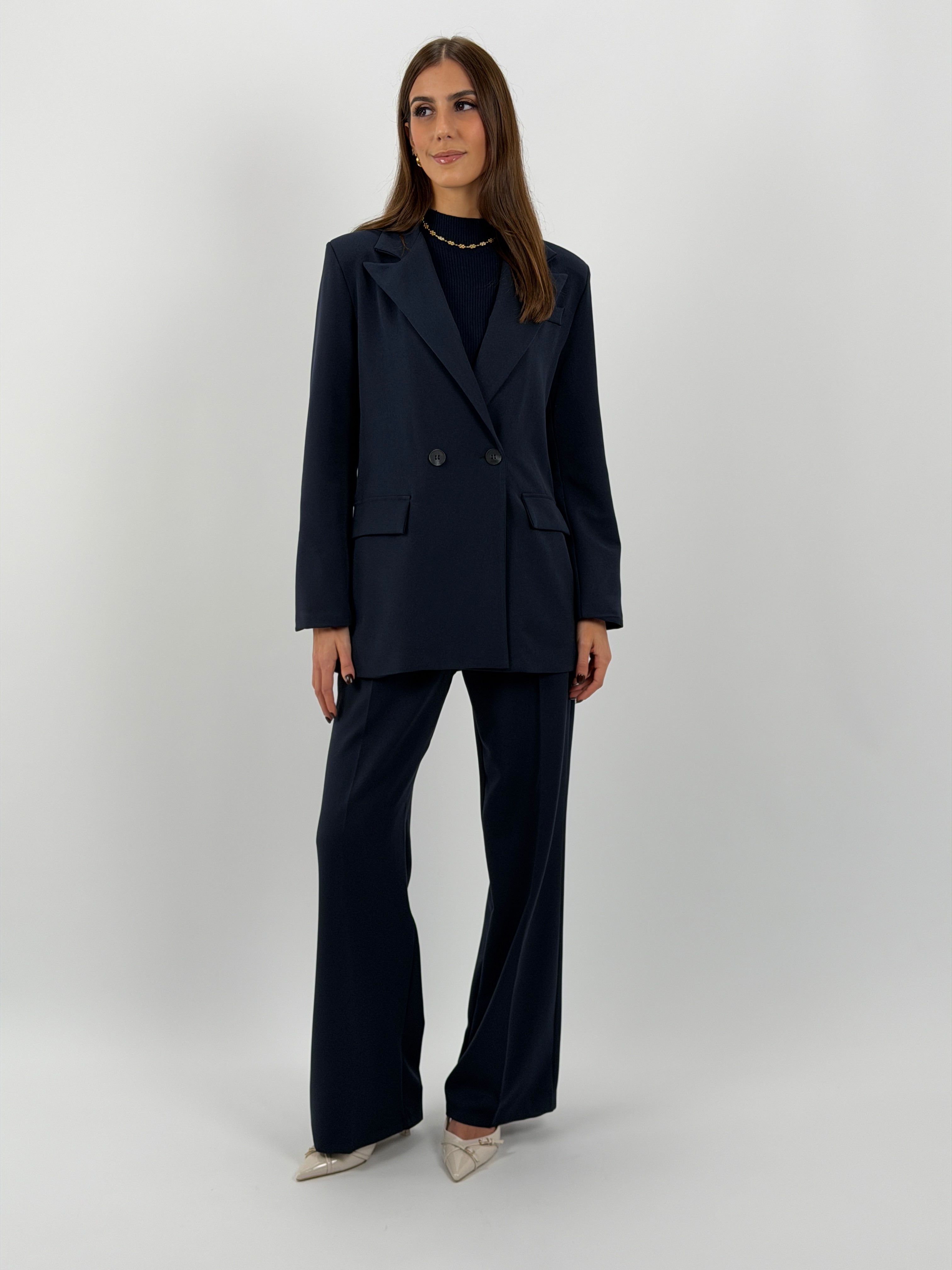 Completo blu in morbido tessuto con giacca doppiopetto foderata, abbinata a pantalone lungo a palazzo con tasche laterali, chiusura con zip e bottone ed elastico in vita.