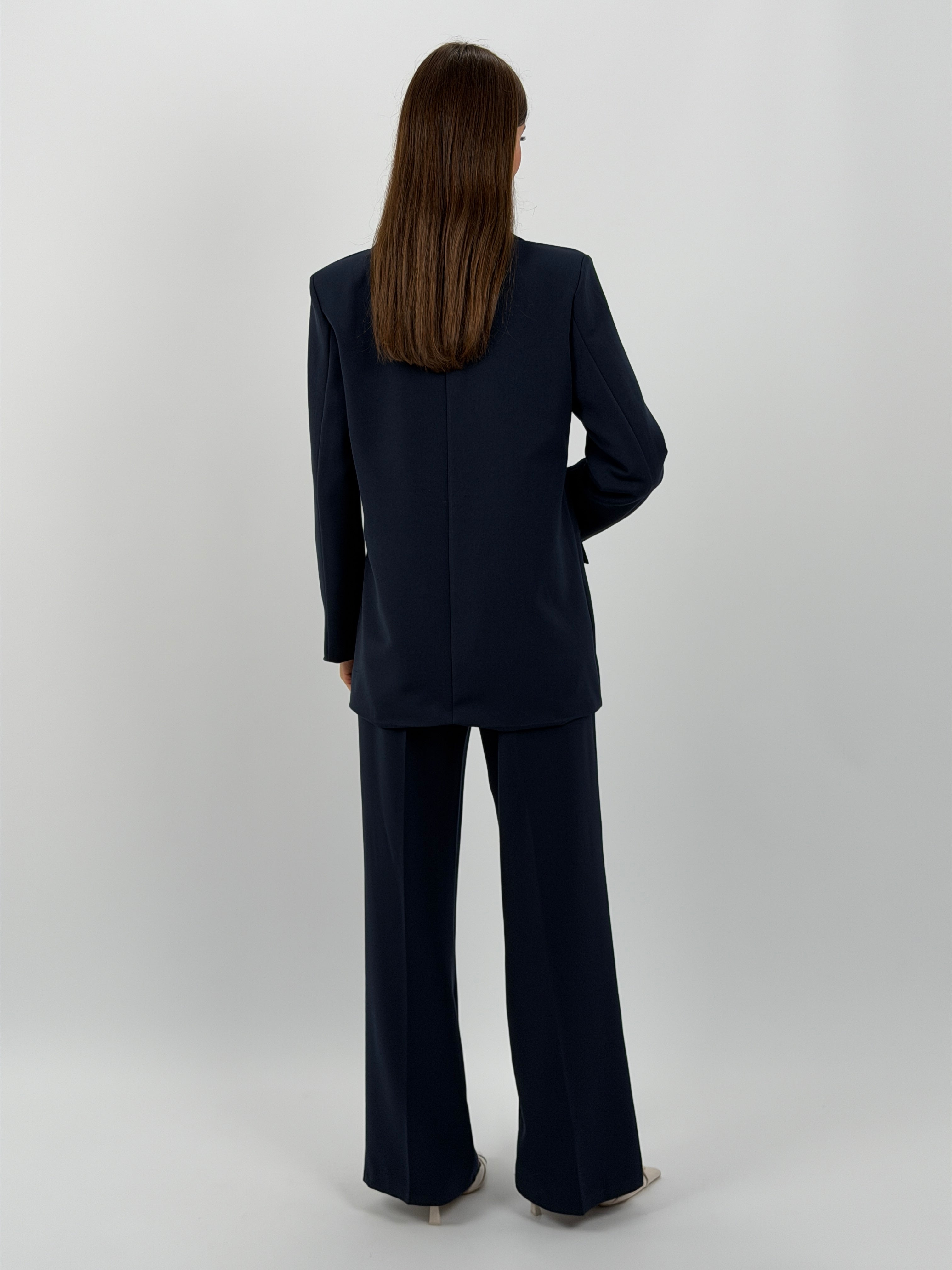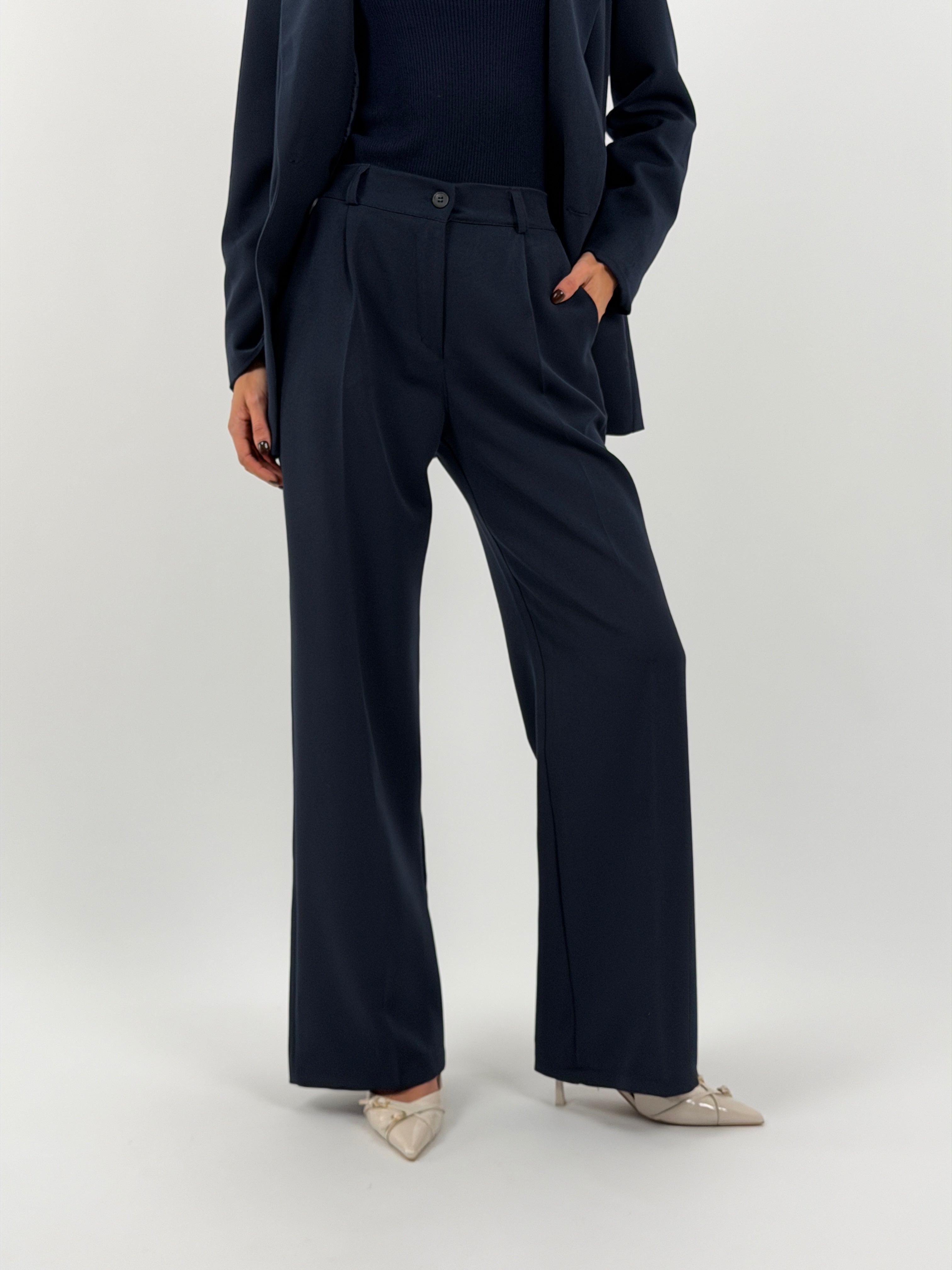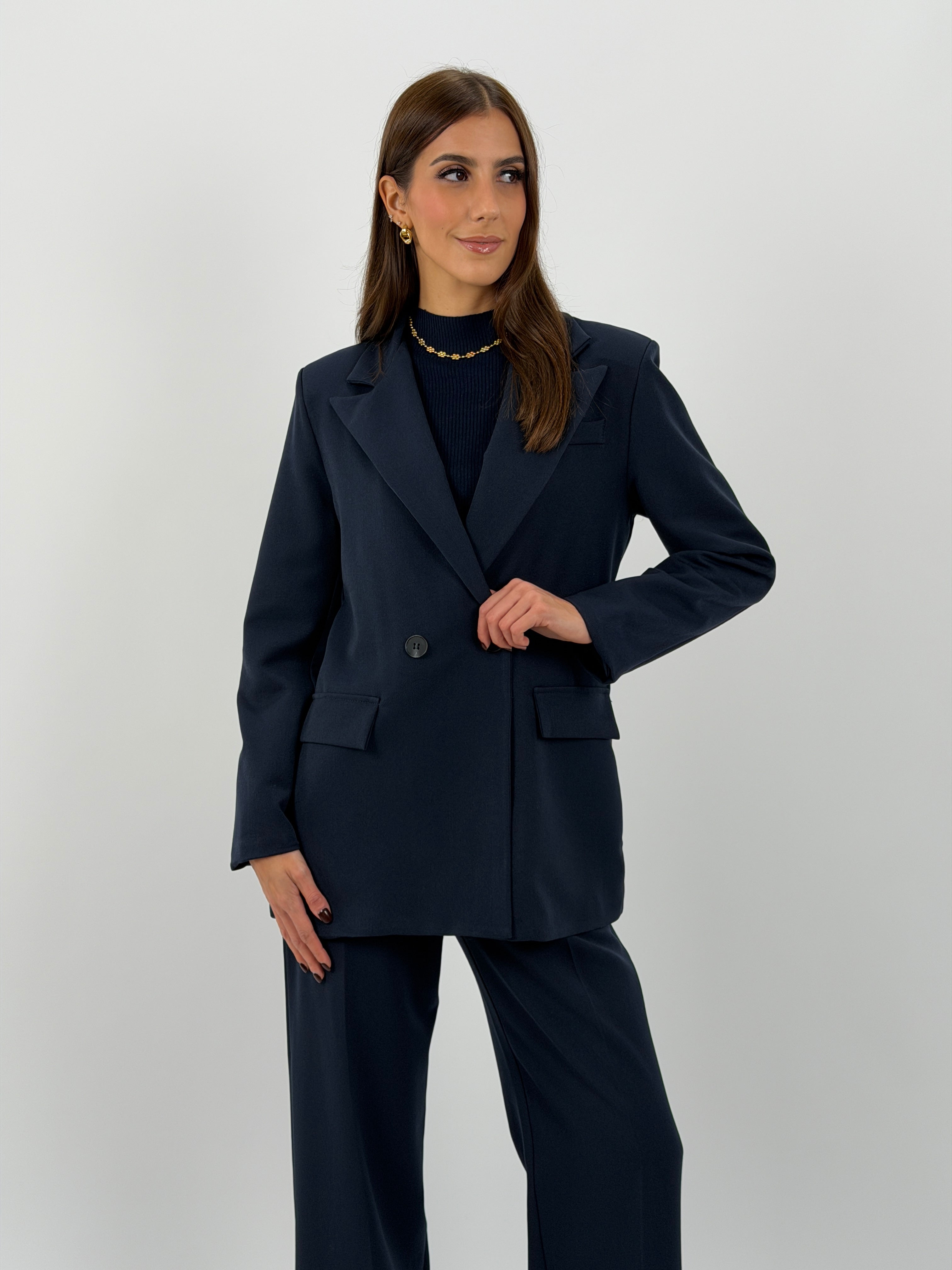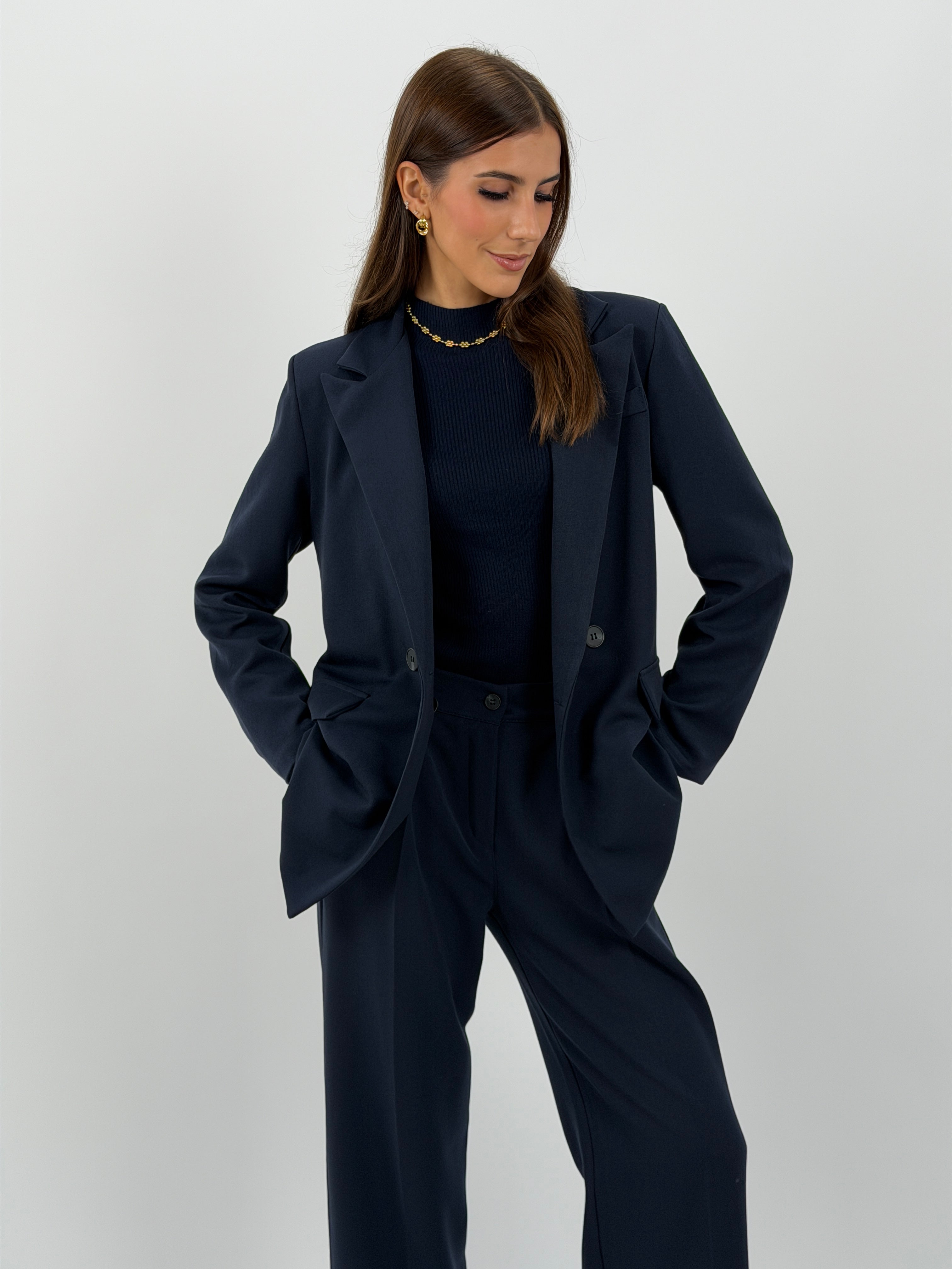 Completo blu in morbido tessuto con giacca doppiopetto foderata, abbinata a pantalone lungo a palazzo con tasche laterali, chiusura con zip e bottone ed elastico in vita.