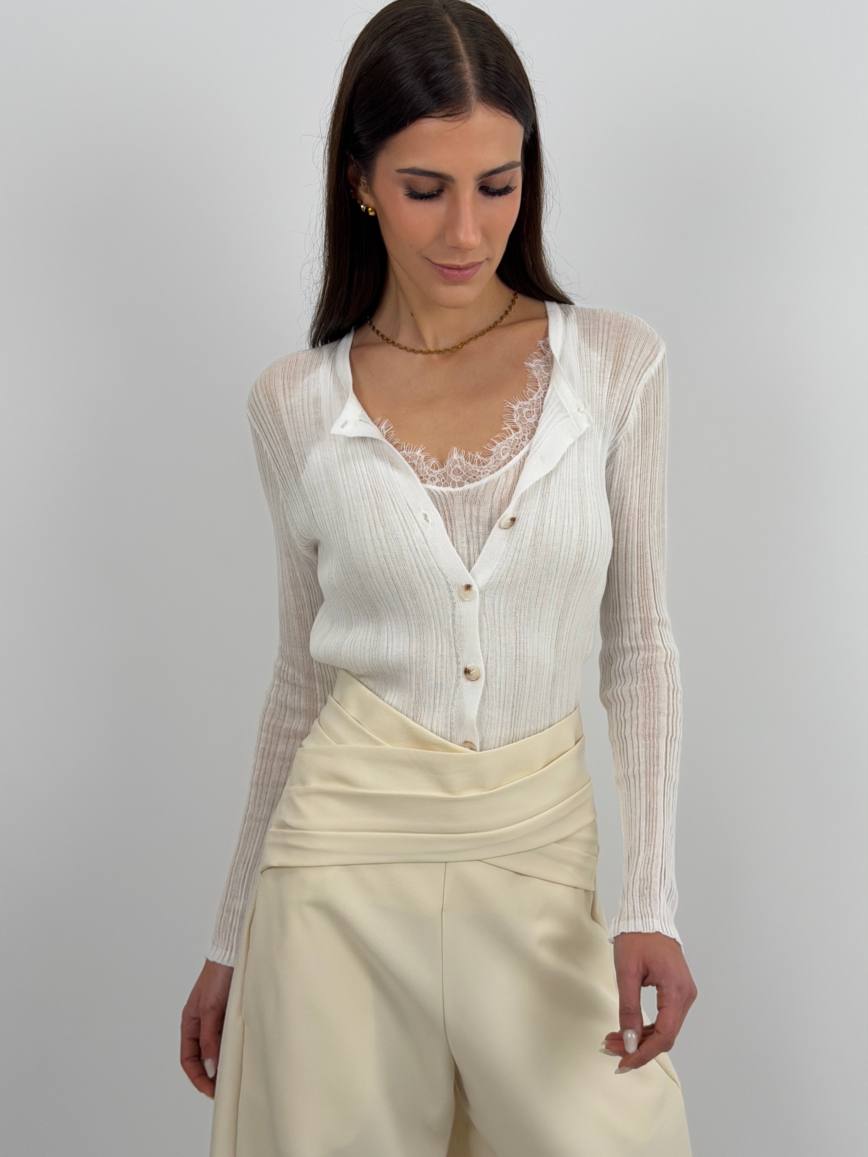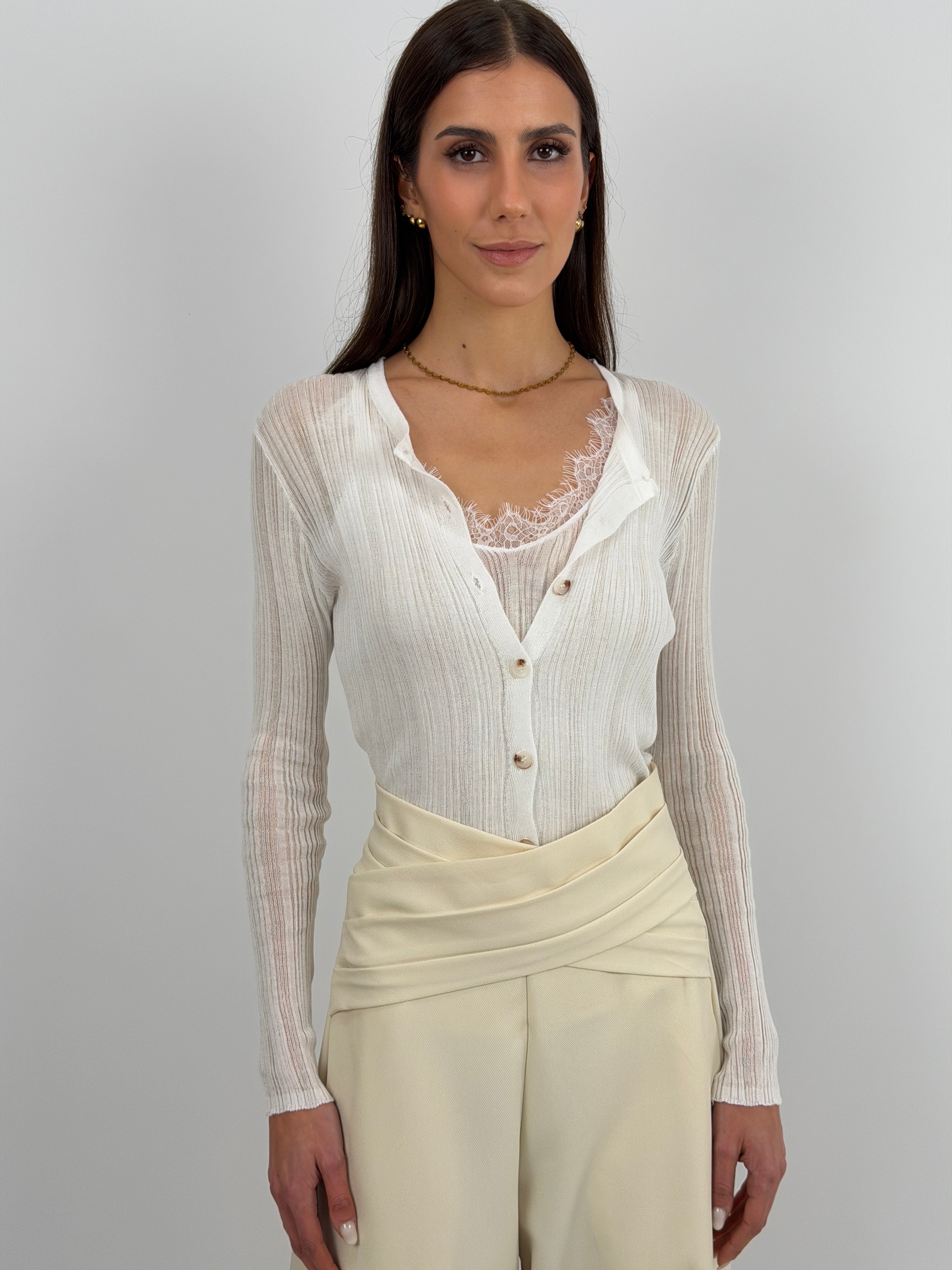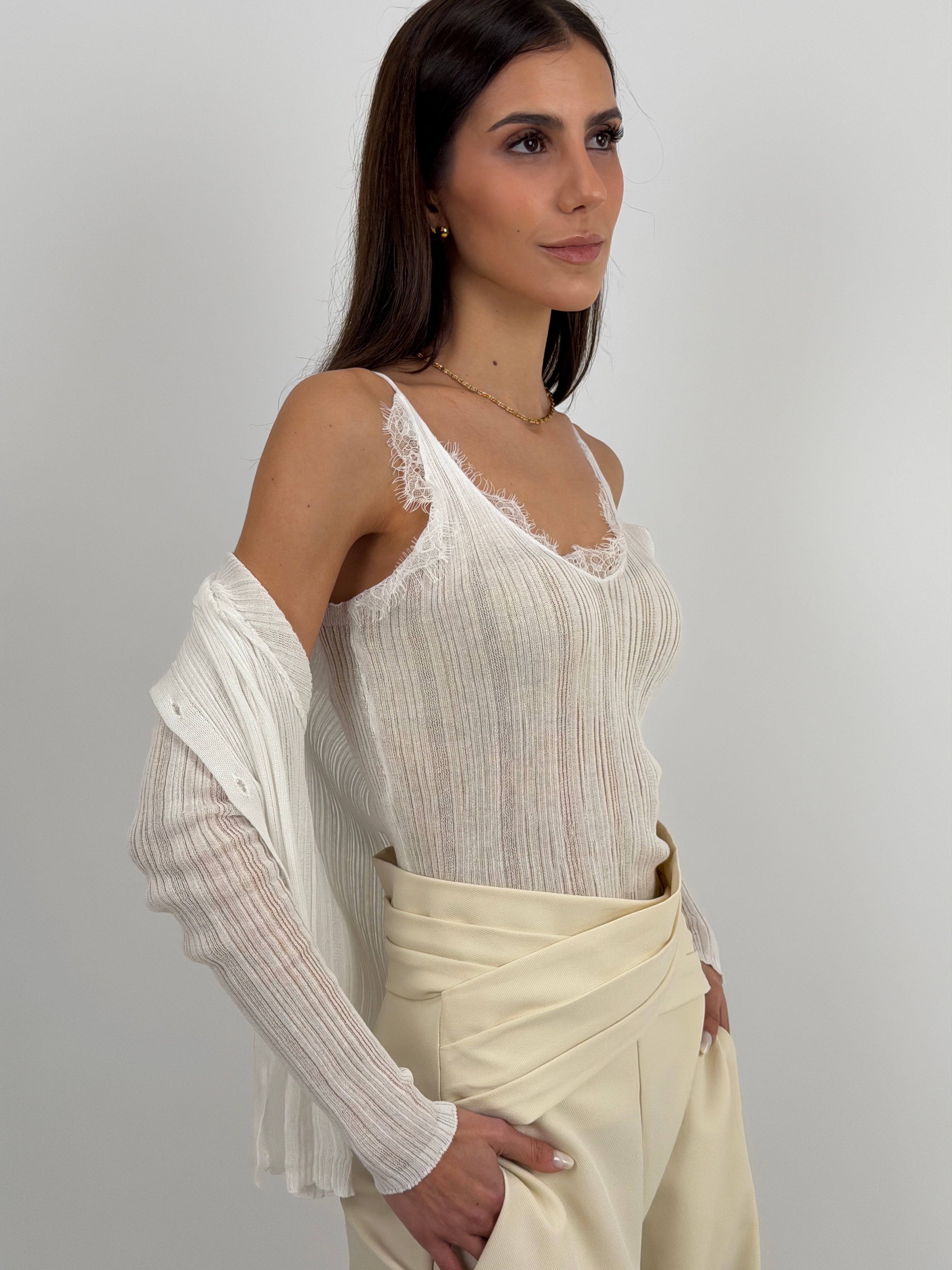 Coordinato bianco in maglia leggera traforata composto da cardigan a maniche lunghe con bottoni e top a canotta con spalline sottili e inserti in pizzo.