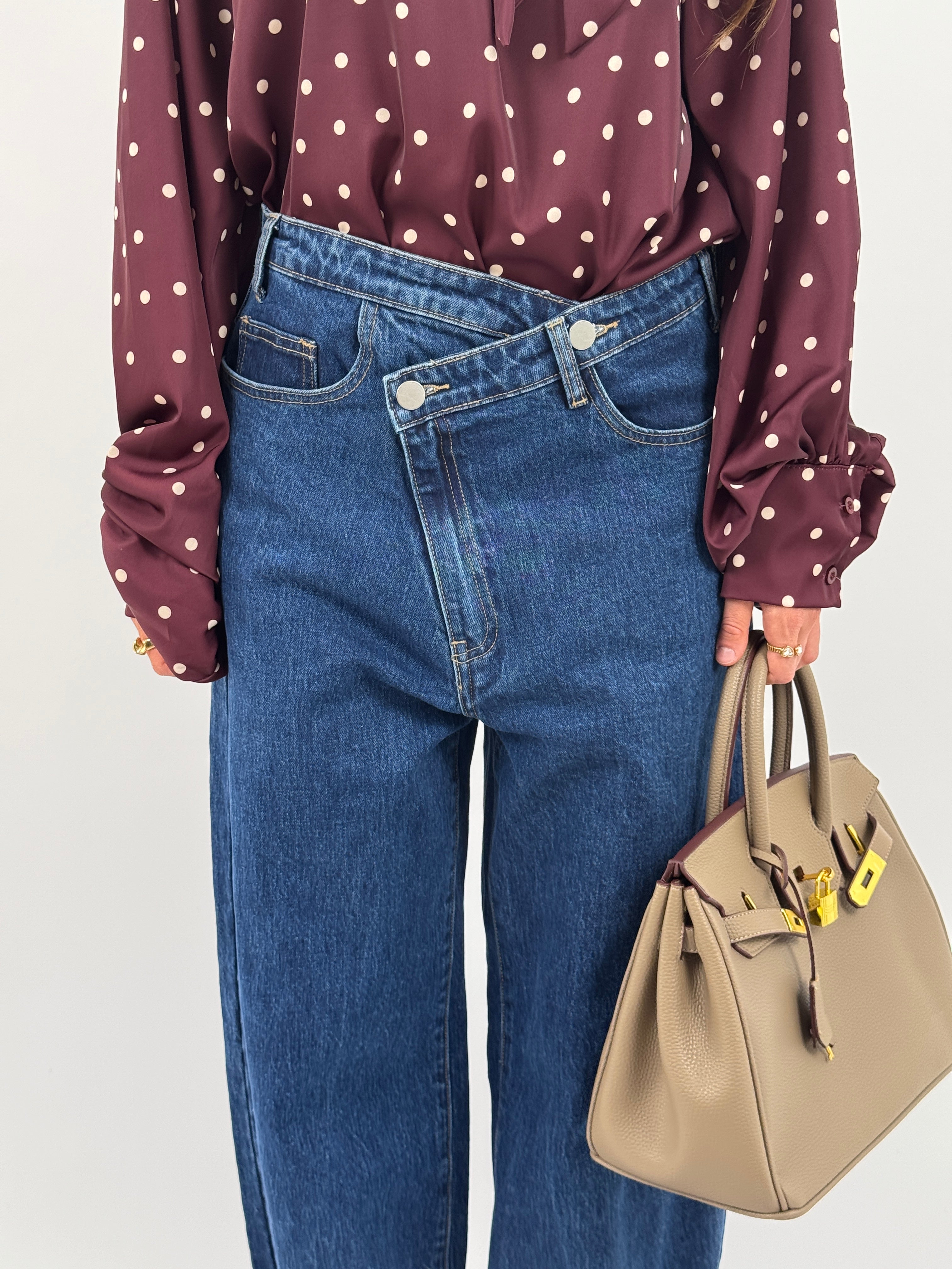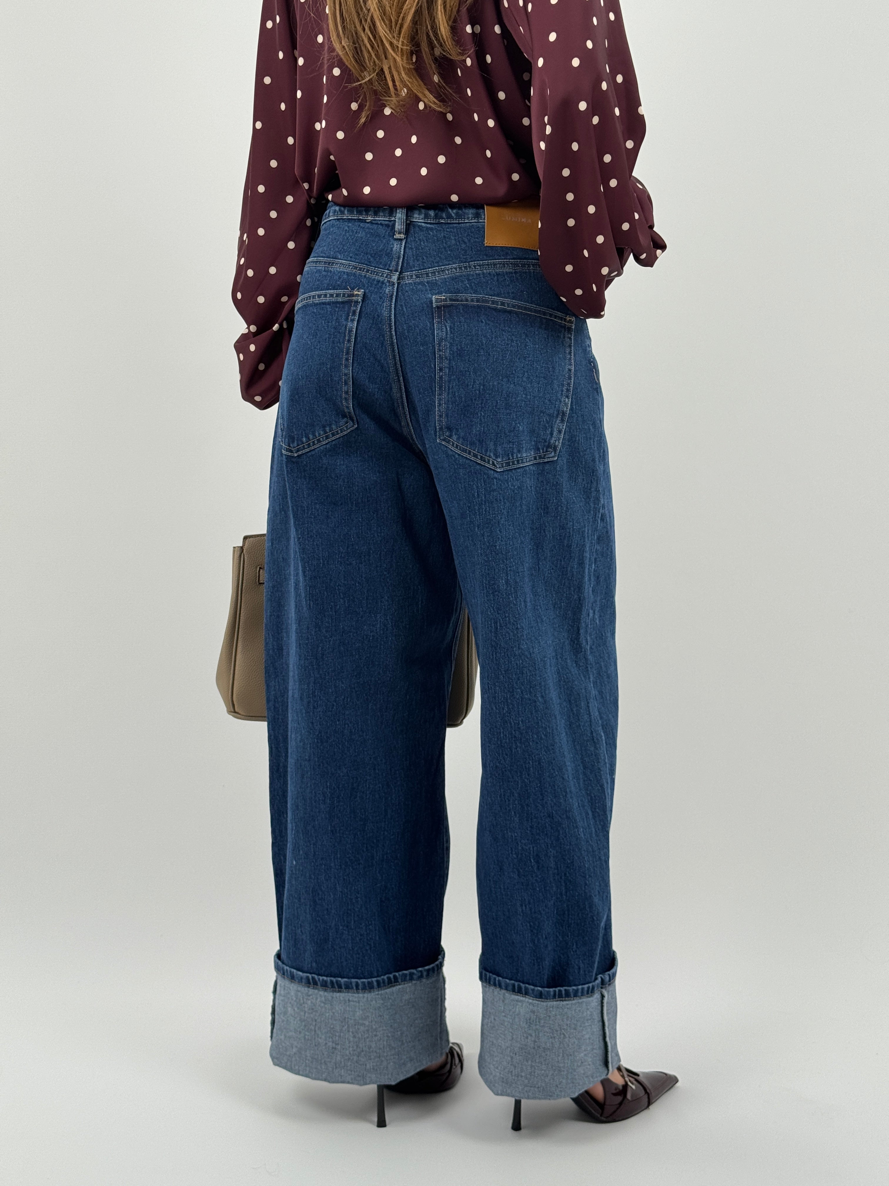 Jeans wide leg in lavaggio blu scuro con chiusura asimmetrica e vestibilità over. La piega sul fondo è puramente indicativa e fatta da noi.
