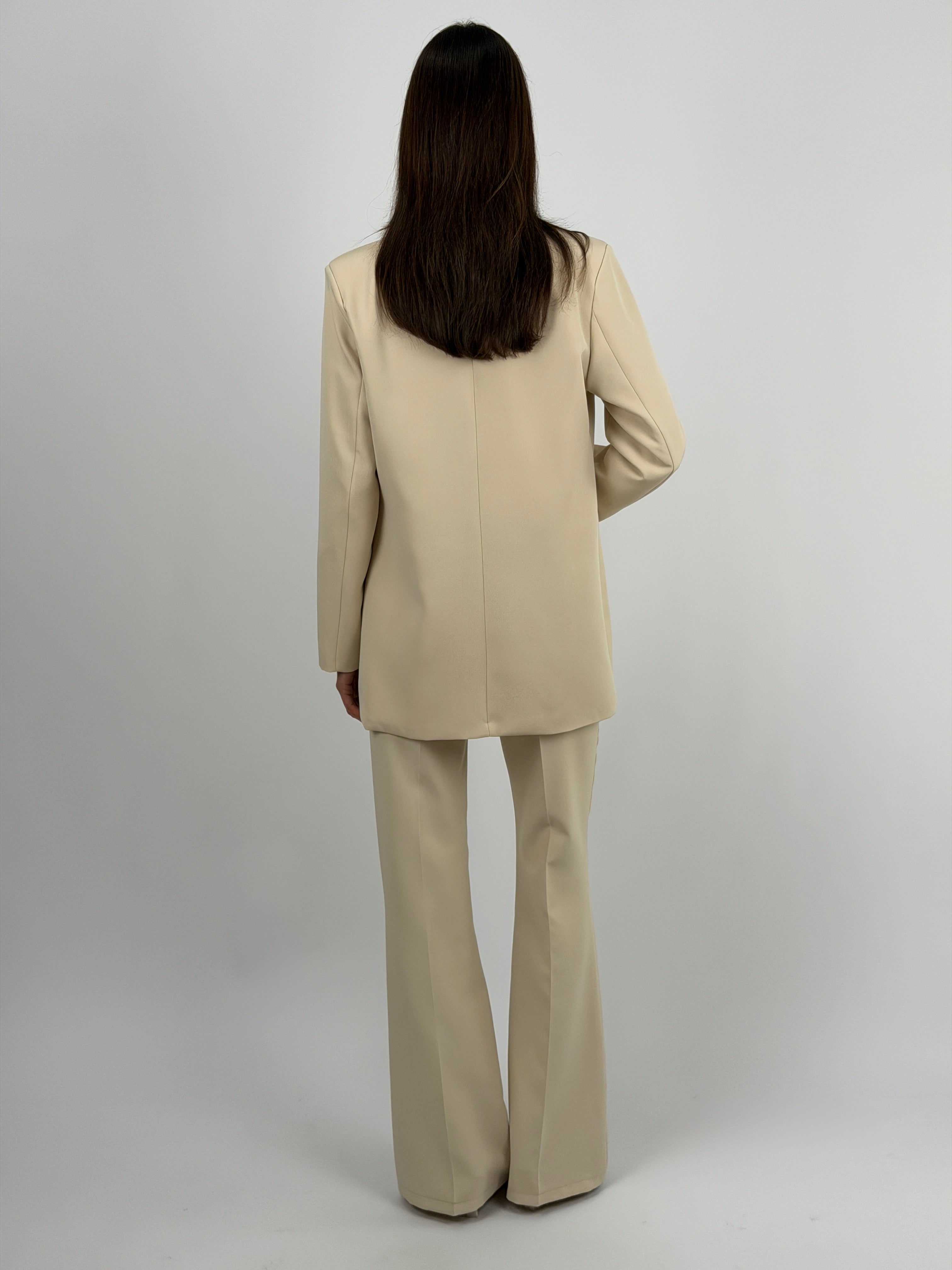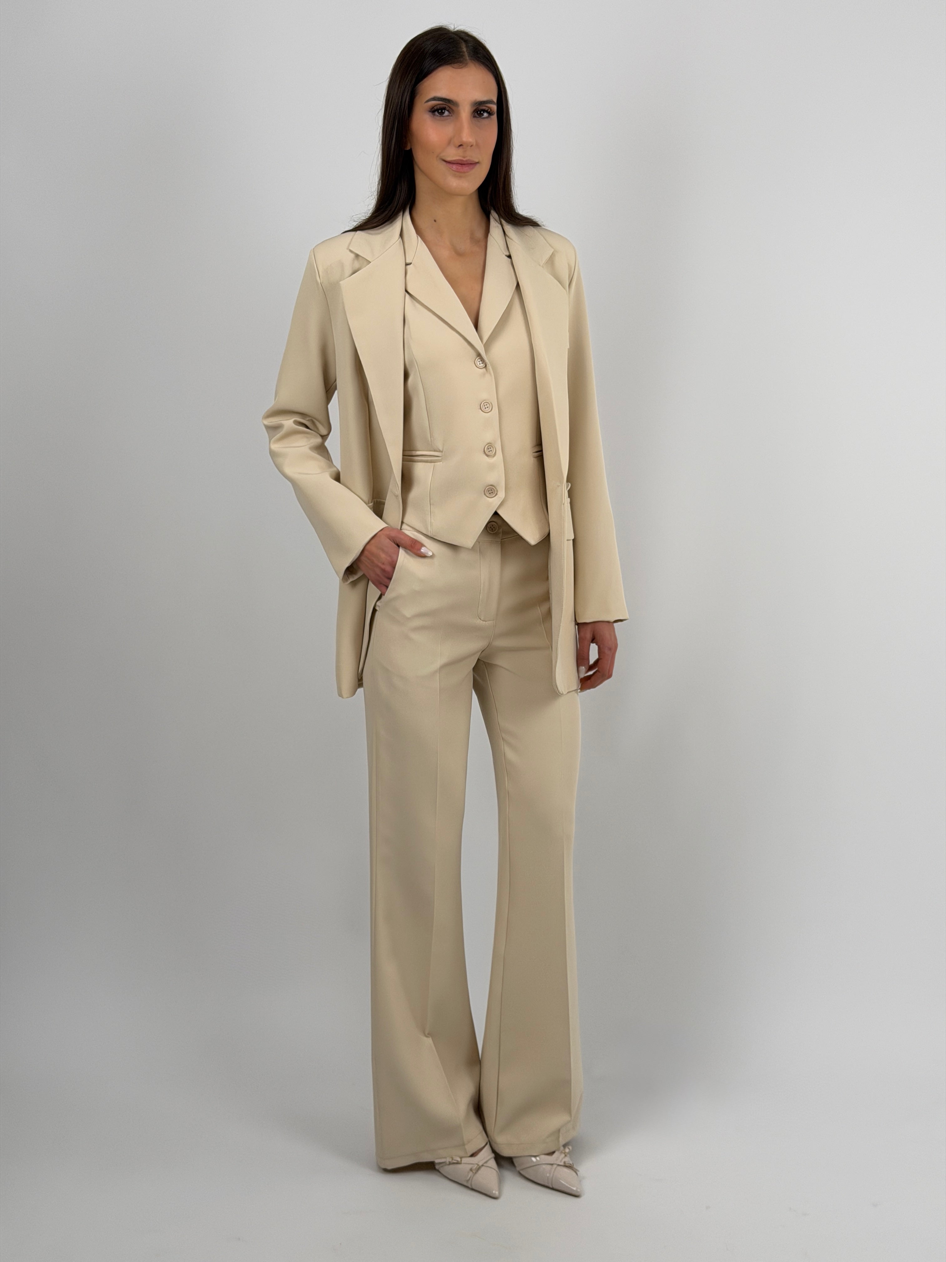 Pantalone beige da completo modello flare con chiusura con zip e bottone, passanti per cintura e tasche laterali.