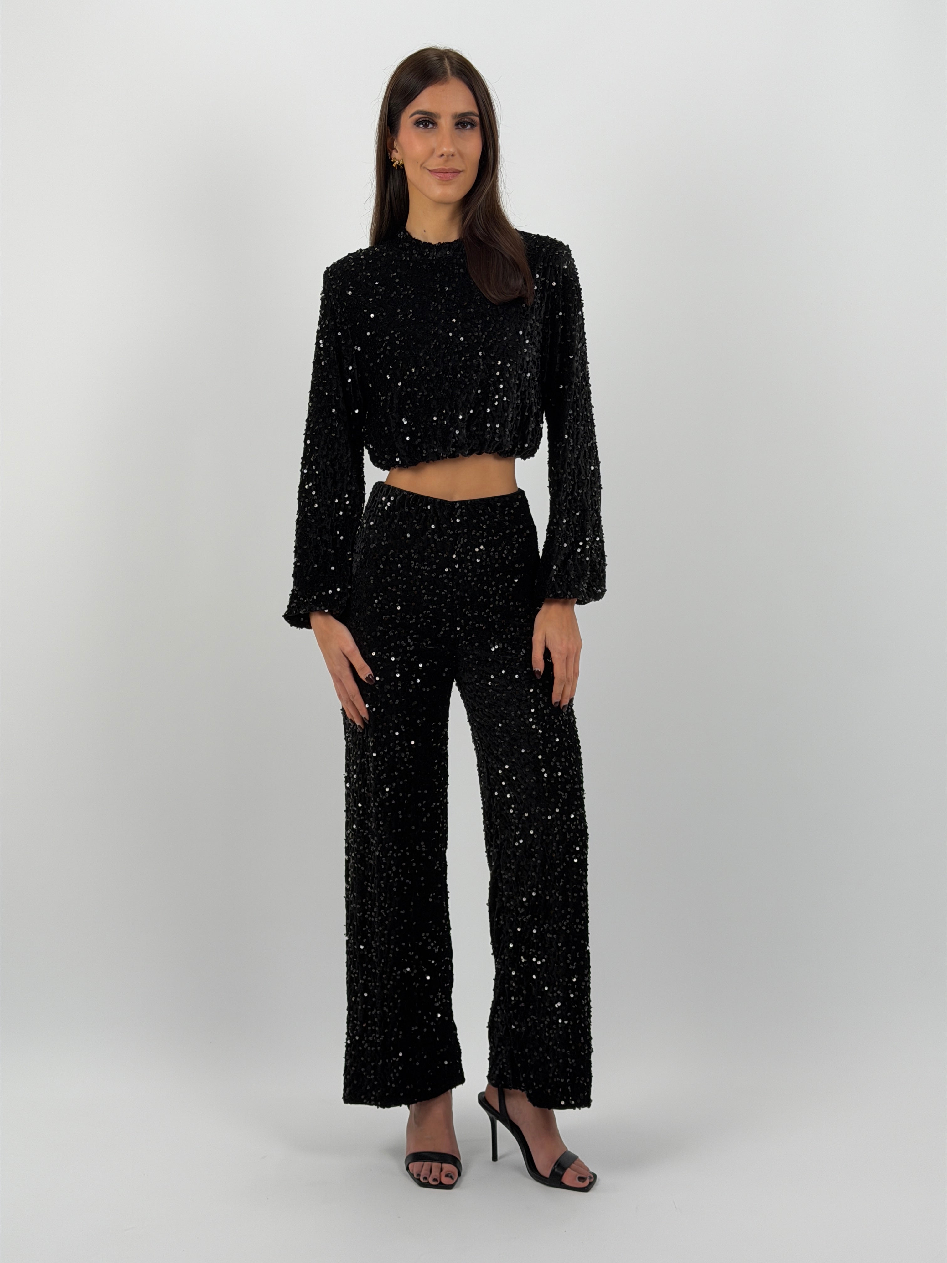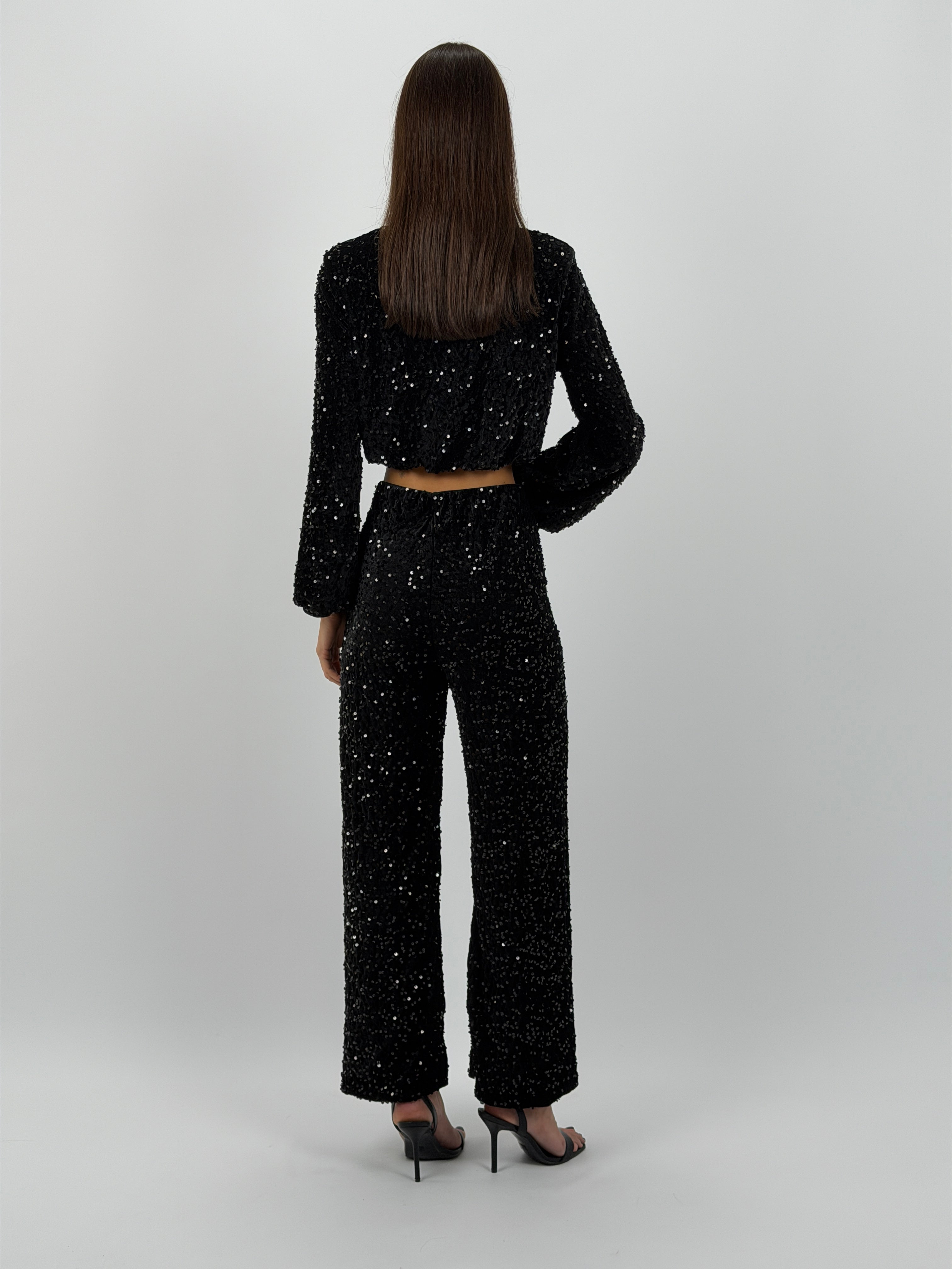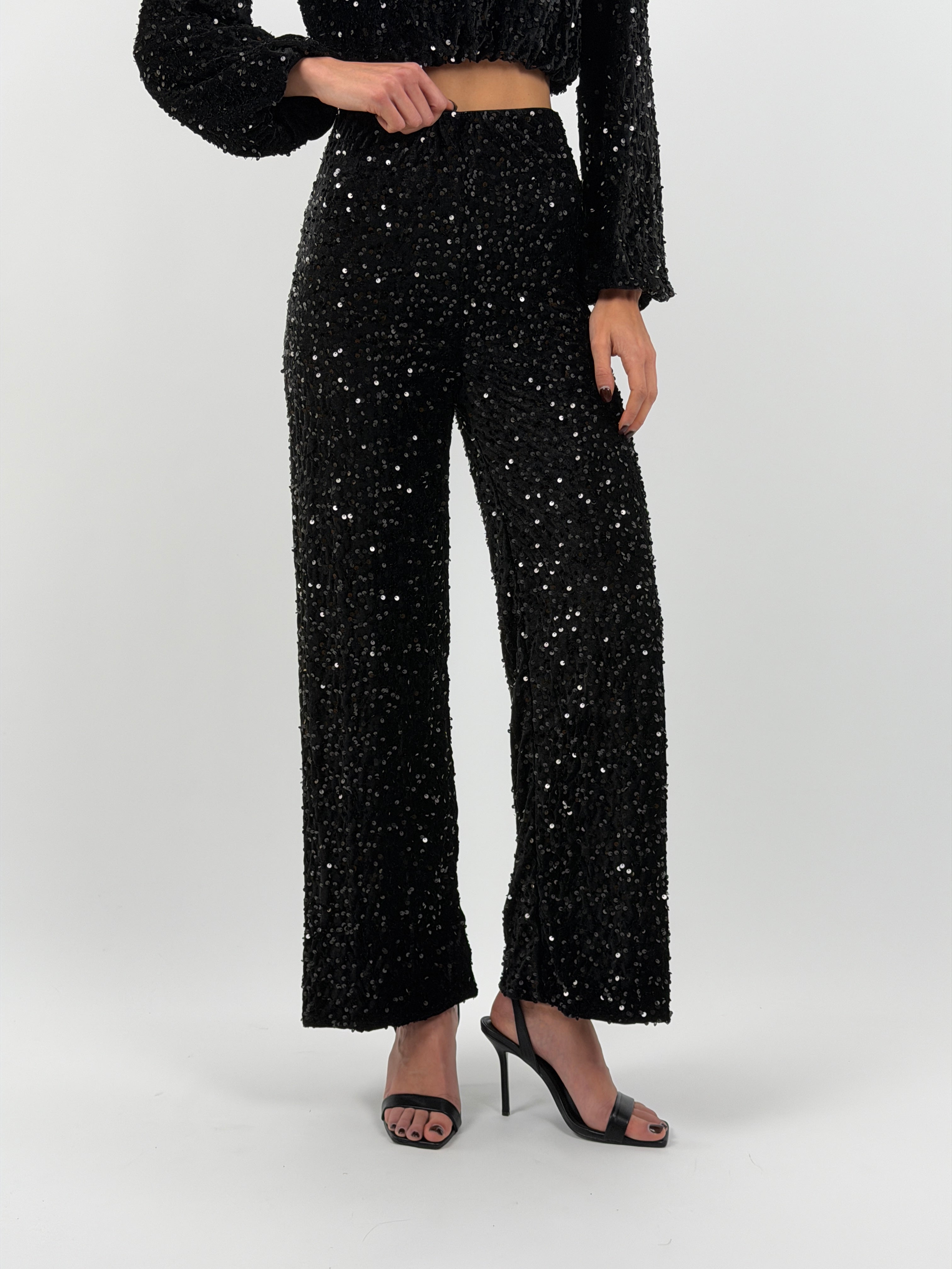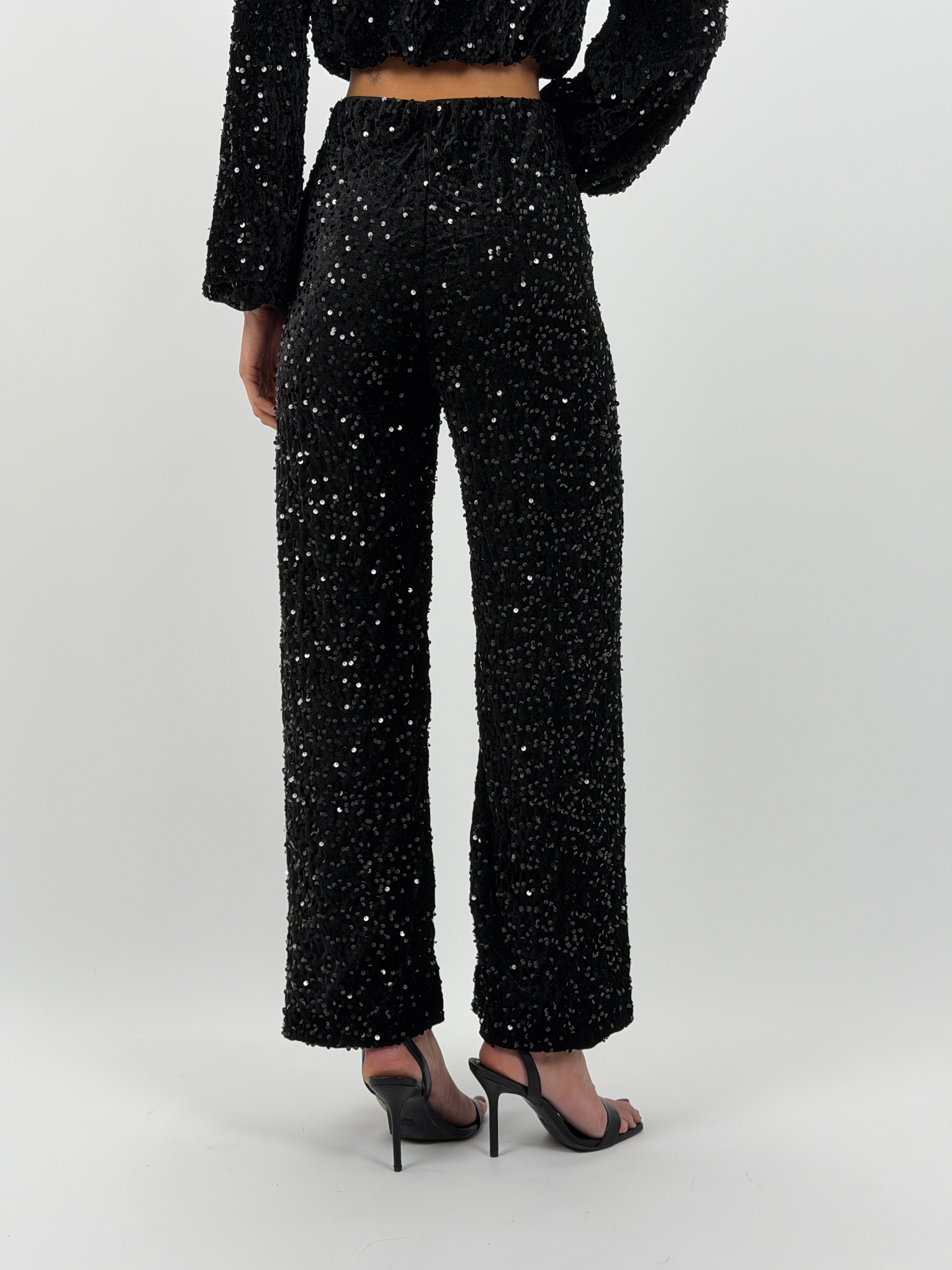 Pantalone nero a palazzo in velluto con applicazione di paillettes tono su tono ed elastico in vita.