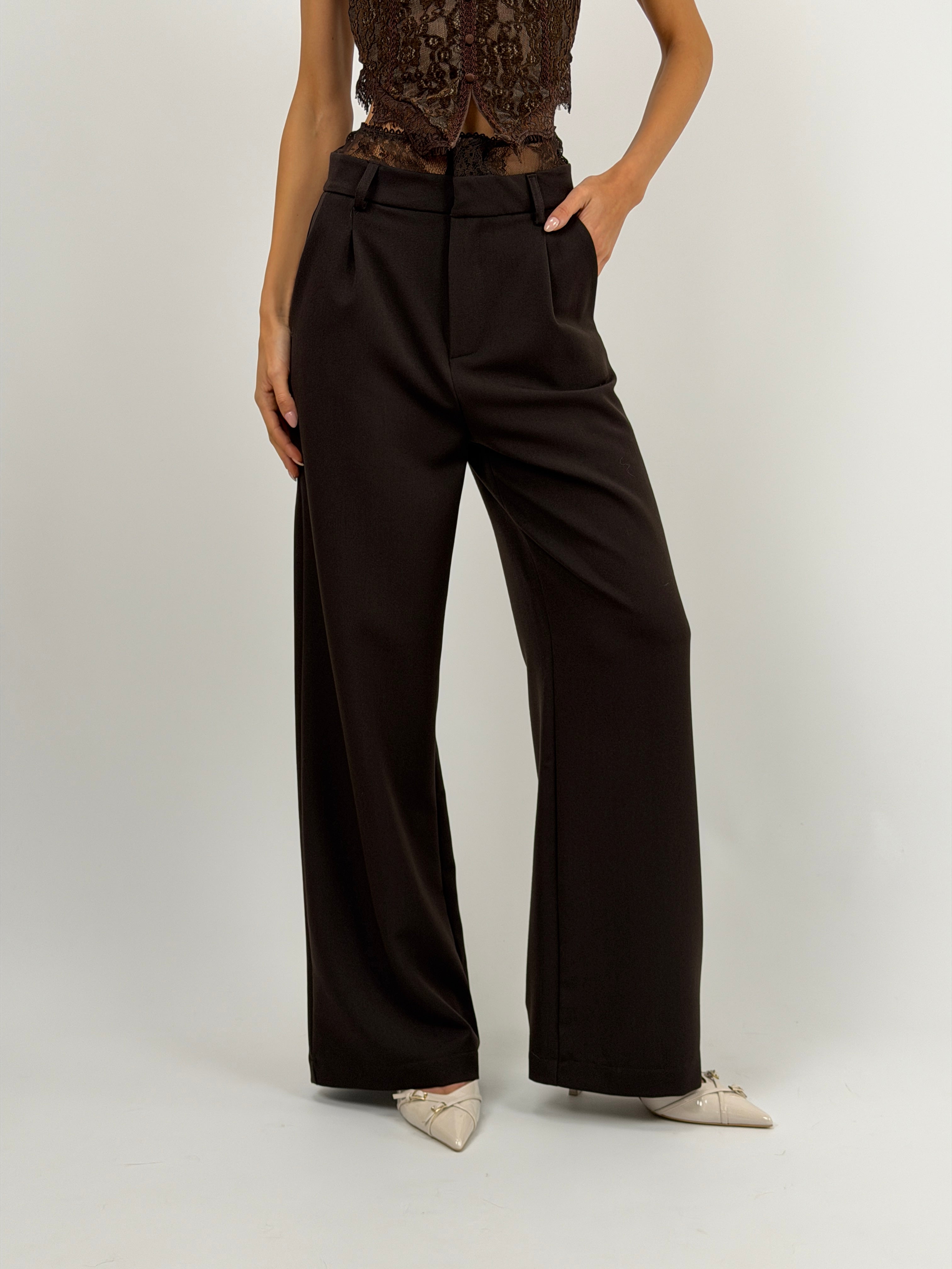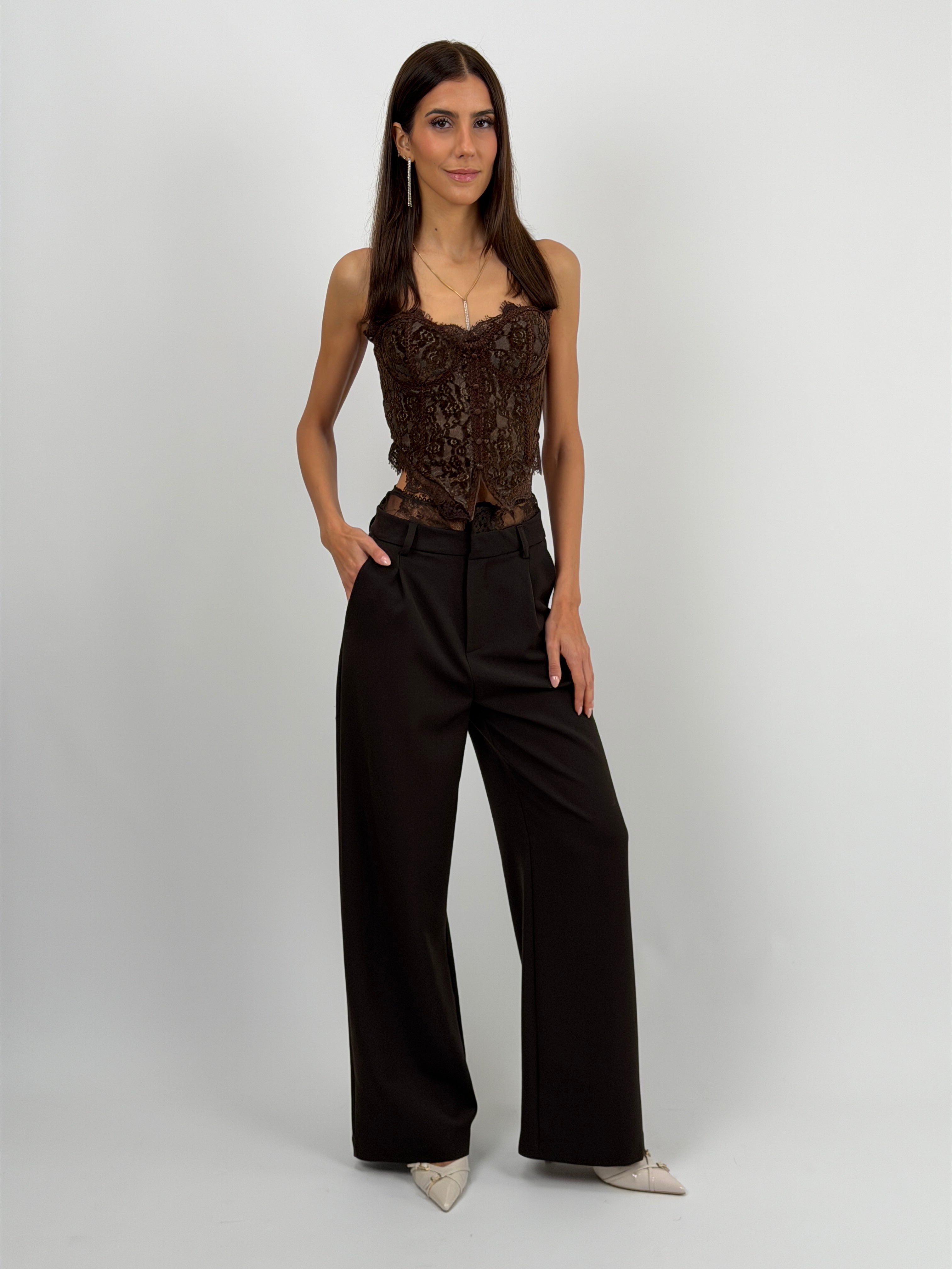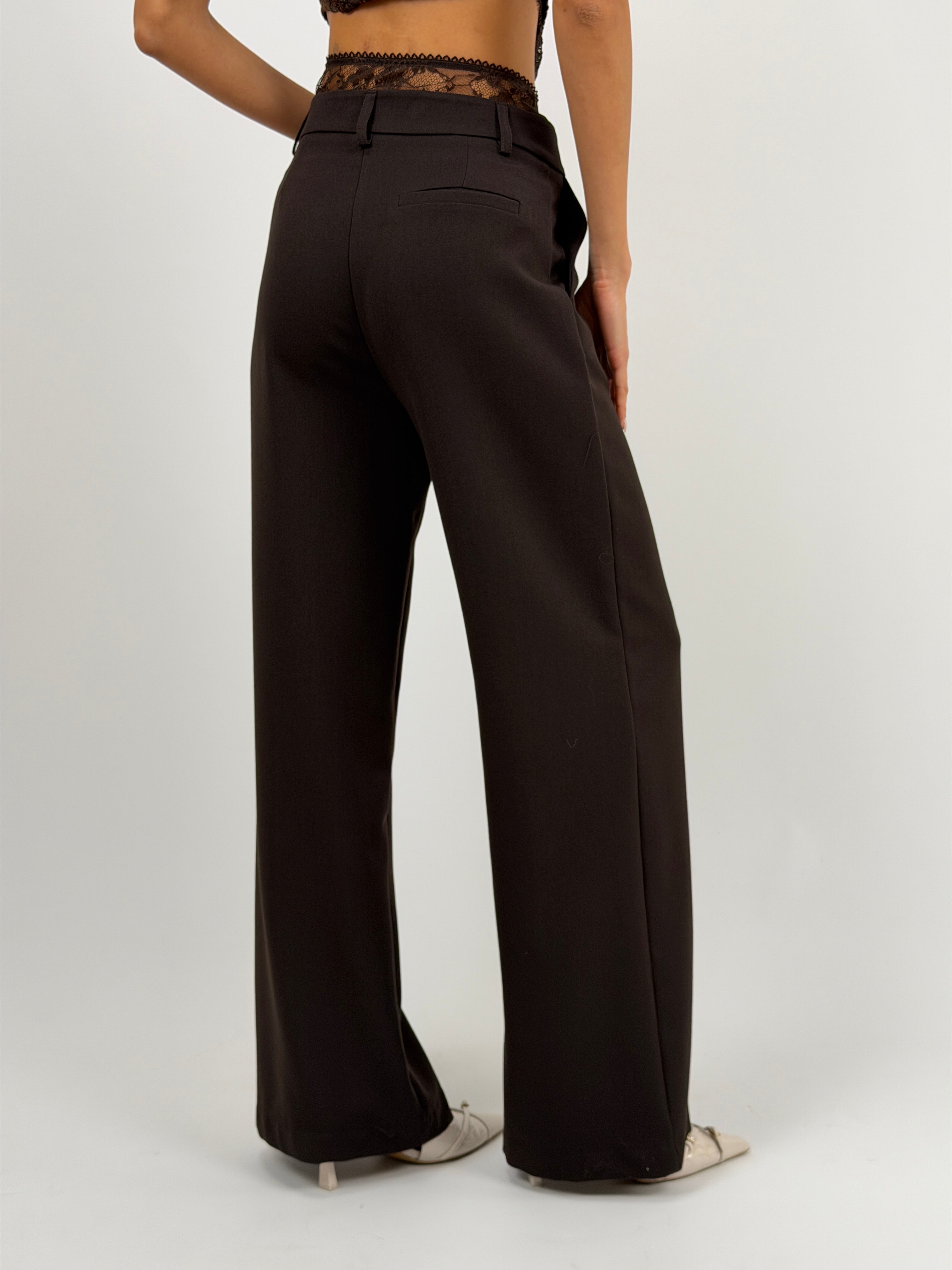 Pantalone marrone lungo a palazzo dal taglio sartoriale con vita in pizzo tono su tono, tasche laterali, passanti per cintura e chiusura con zip, bottone e gancetti.