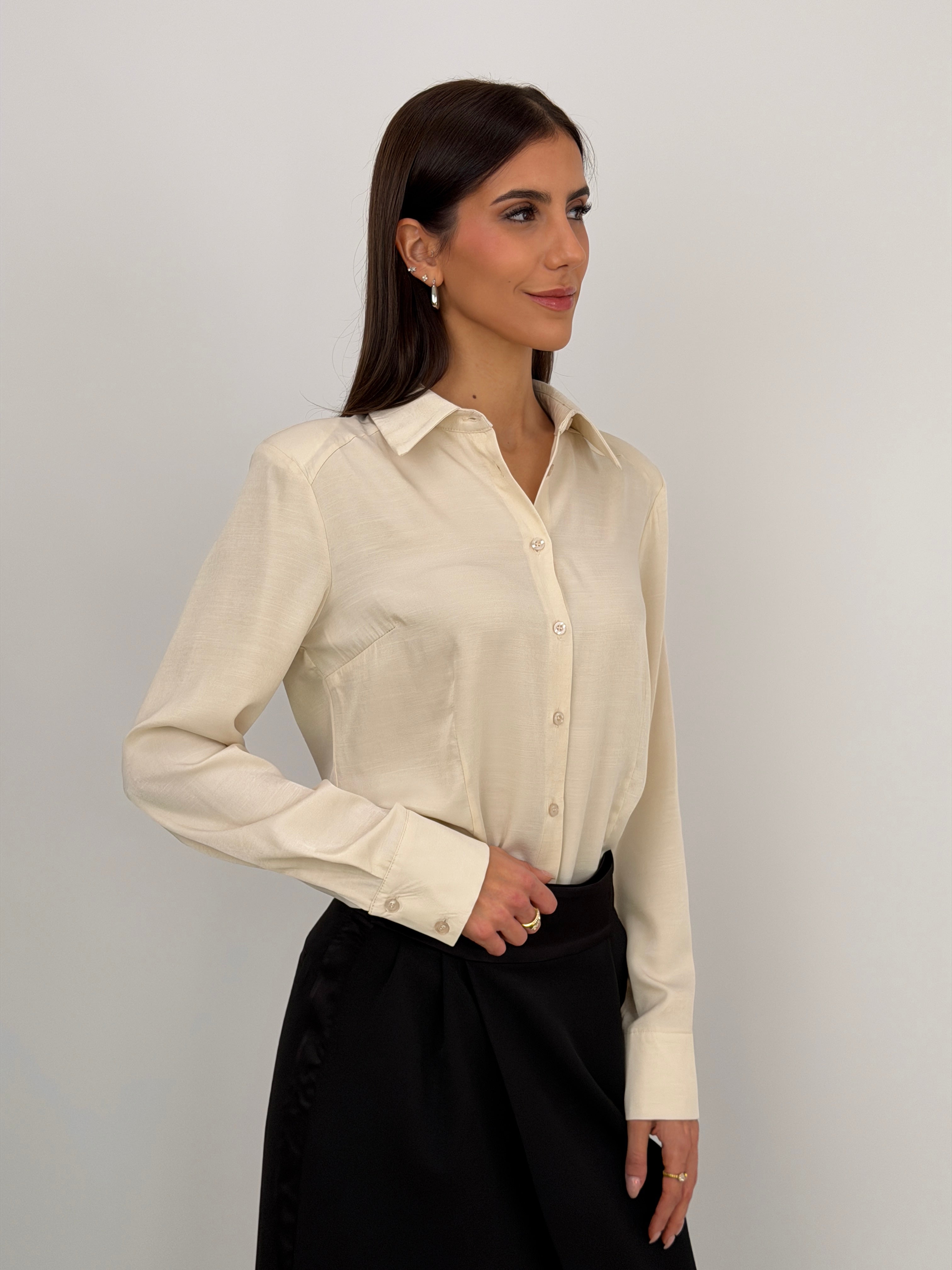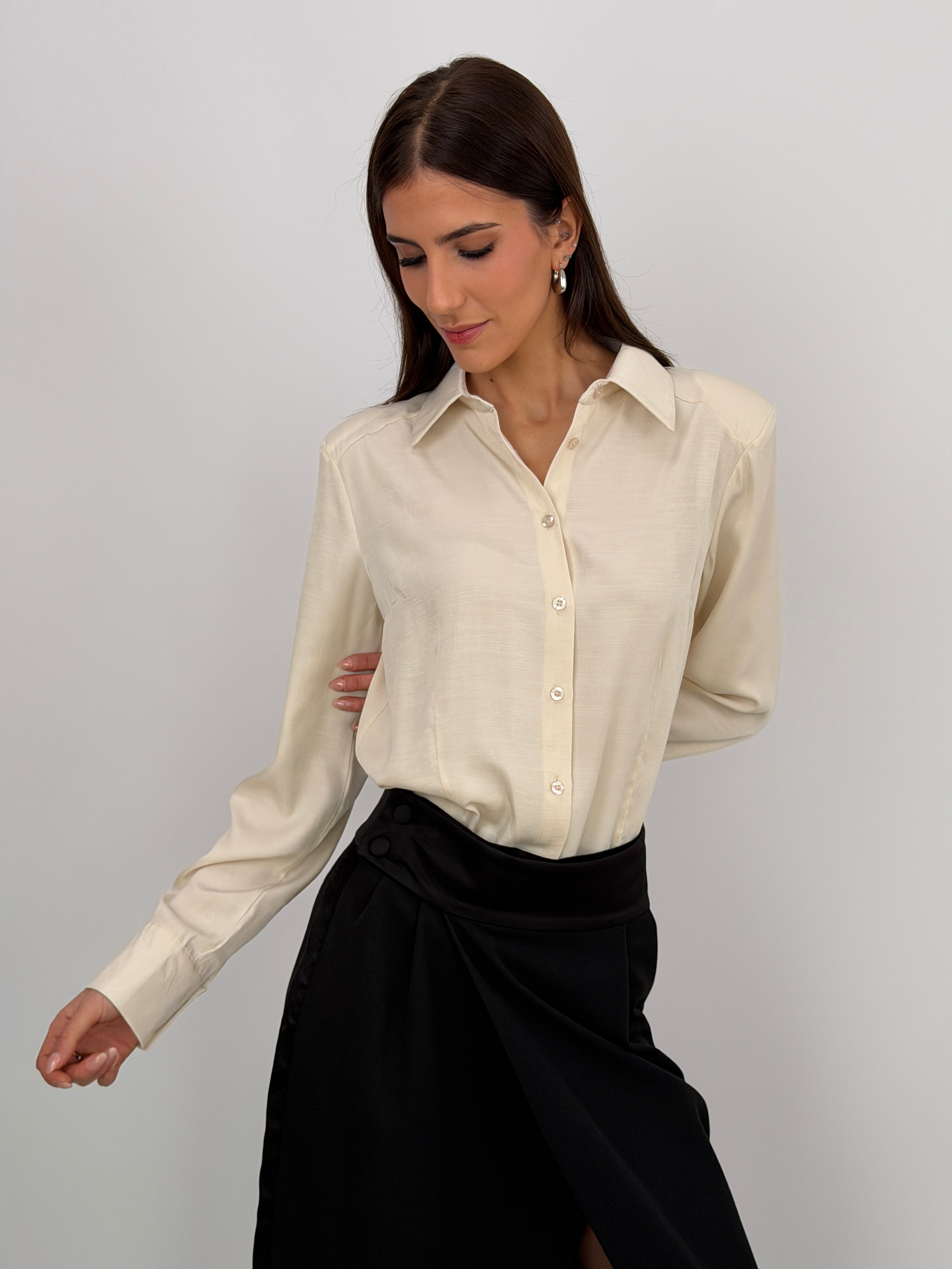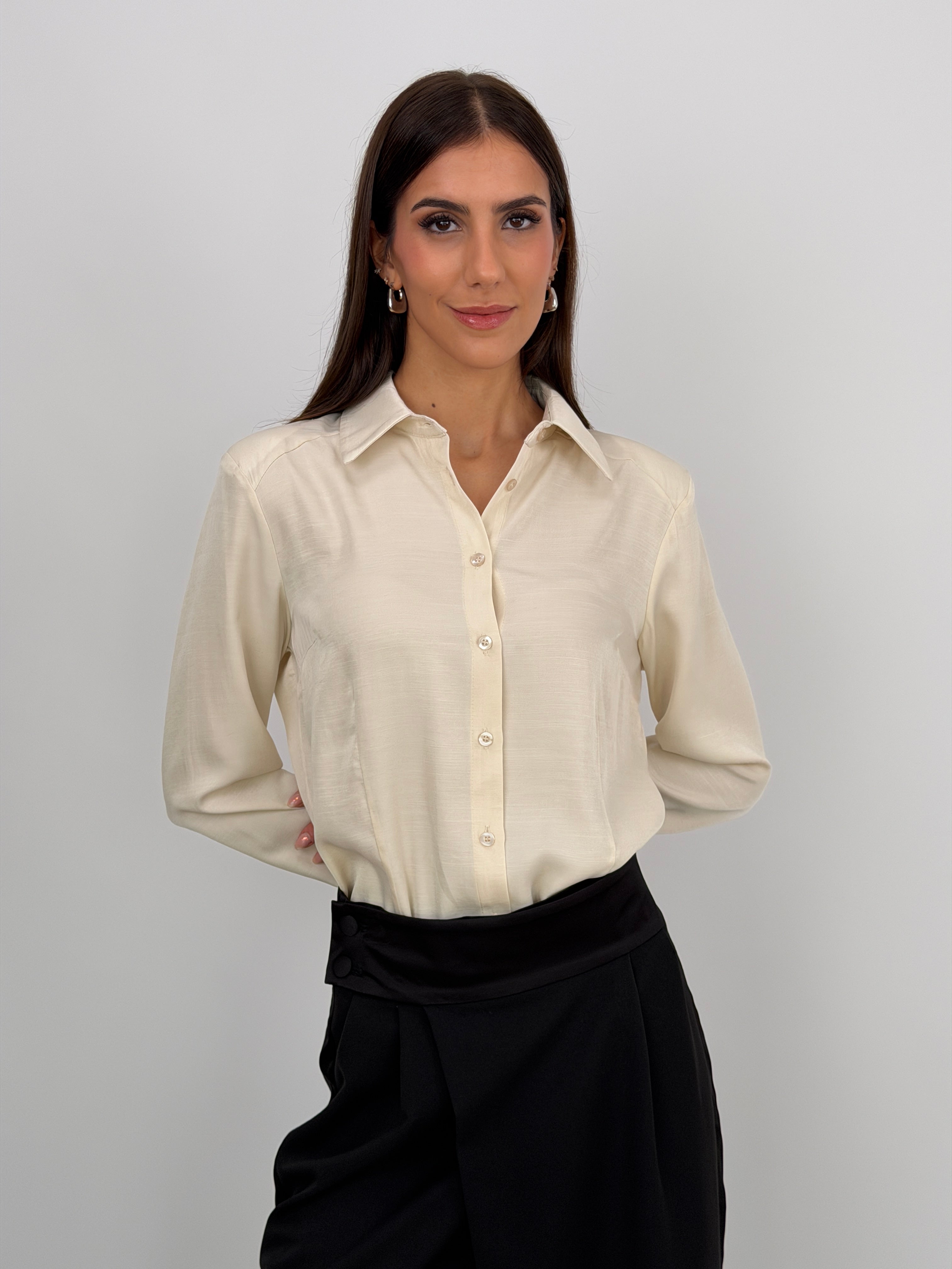 Camicia-body in tessuto satinato crema con spalline imbottite, colletto classico e chiusura con bottoncini